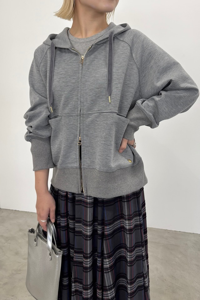 【COMMENT】 きれいな表面感とストレッチ性の高いダンボール素材を使用したジップパーカーです。気楽に羽織れるショート丈で、比較的コンパクトなサイズ感なので、上からコートなど羽織ってレイヤードスタイルを楽しむこともできます。同素材のフレアSKの展開もあります。 ------------------------------------------------ 【MATERIAL】 (本体)レーヨン70% ポリエステル24% ポリウレタン6% (リブ)綿95% ポリウレタン5% ------------------------------------------------ 【SIZE】 着丈:54cm バスト:115cm 裄丈:83cm 着用モデル col.A:153cm/col.B,C:162cm 生地の厚さ/中厚 裏地/無し ポケット/有り 光沢/無し 透け感/無し 伸縮性/有り 洗濯お手入れ/可能(手洗い洗濯) *商品について 画像の商品はサンプル品にて撮影を行っております。実際の商品と仕様・加工・サイズが若干異なる場合がございます。予めご了承下さい。 *カラーについて お使いのデバイスの設定、撮影時のライティング、商品をご覧になっている際の照明等閲覧環境により実際の色味と異なって見える場合がございます。 *商品の包装について 細心の注意を払って包装しておりますが、通販の特性上、商品到着時に畳みシワがついている場合がございます。予めご了承下さい。 ------------------------------------------------