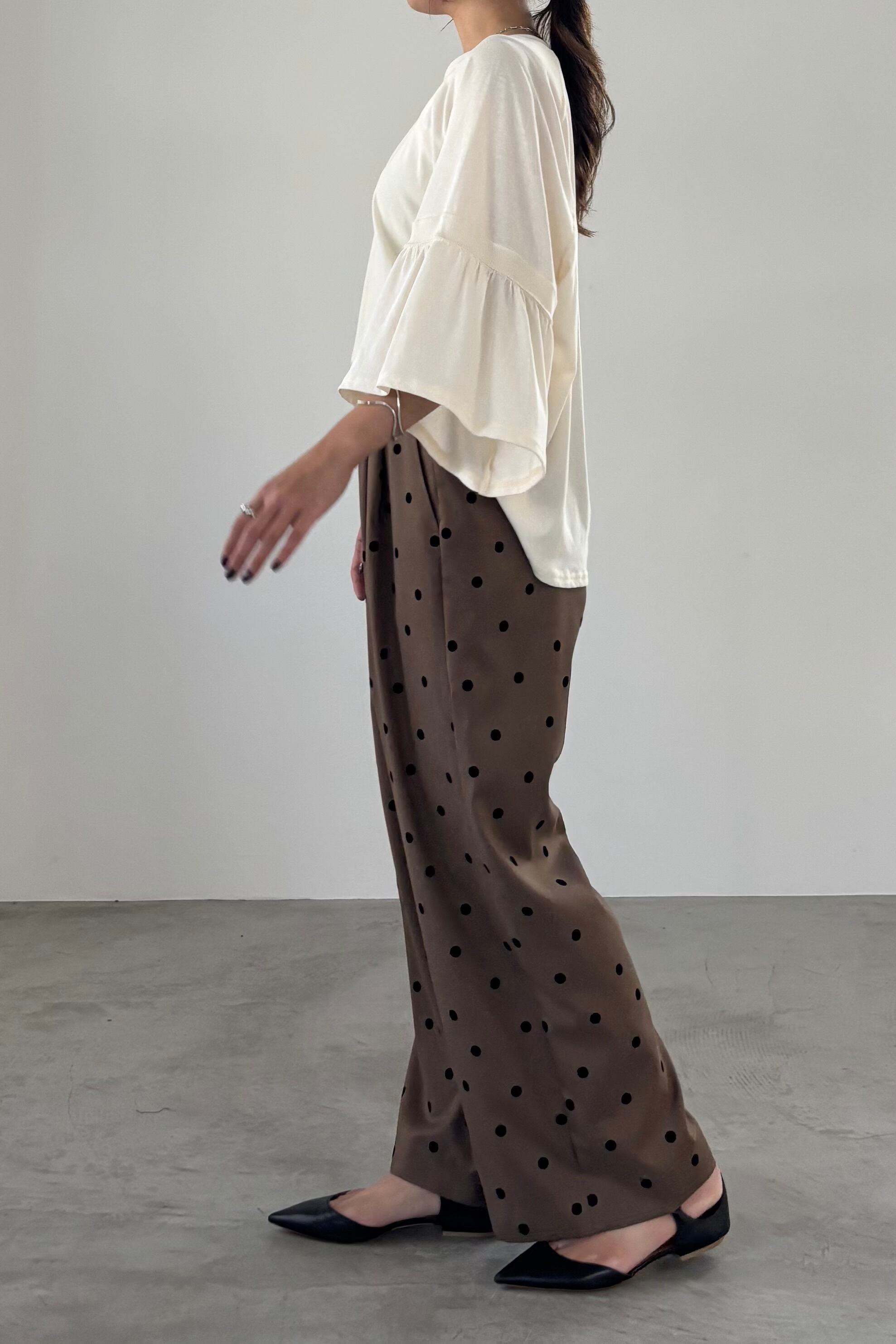 リブを組み合わせた変形スリーブが目を惹くギャザースリーブトップス。従来のカットソーより圧倒的に毛羽の少ない、特殊な構造で紡績された着心地の良いドライタッチジャージを使用しています。