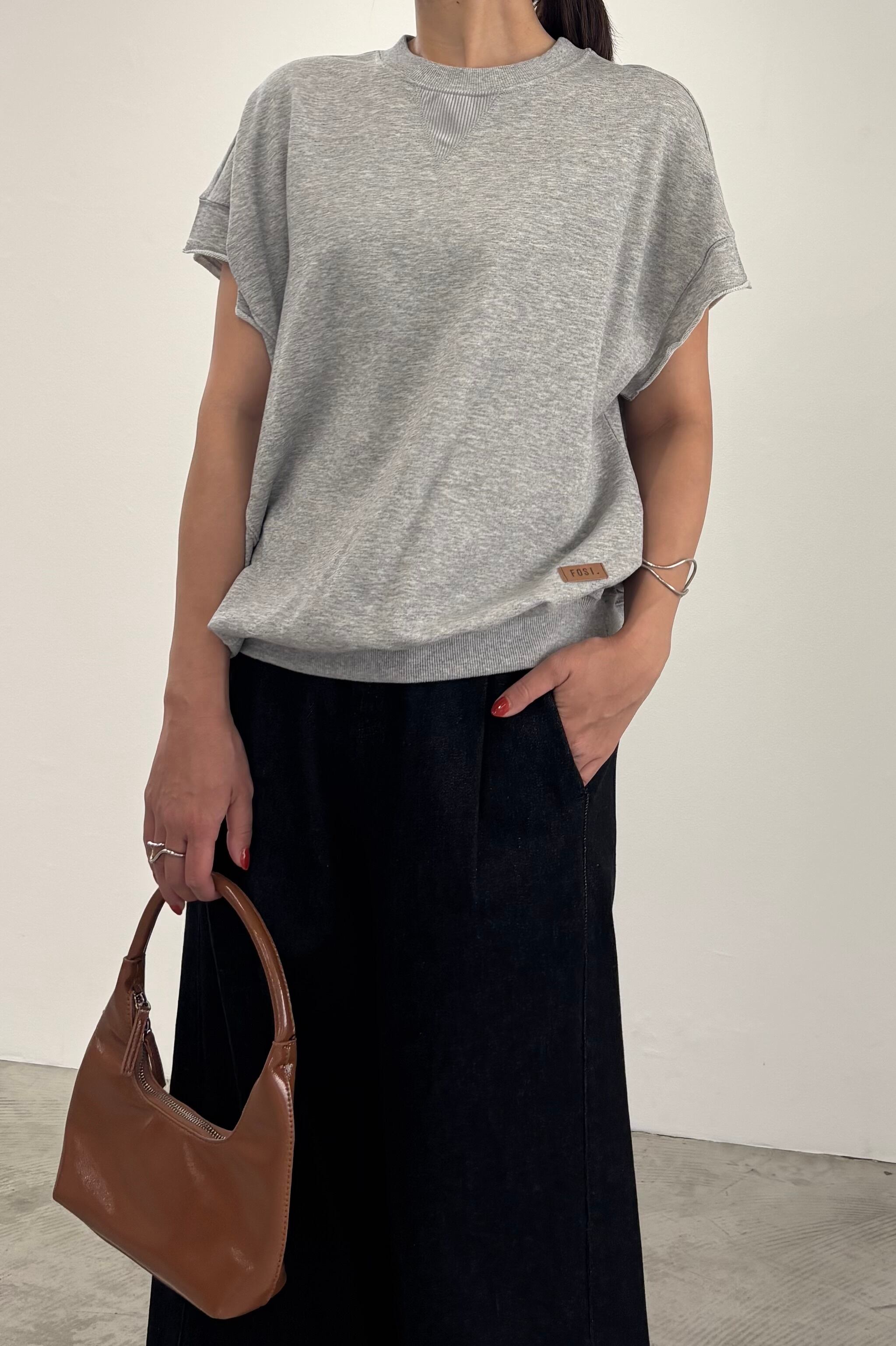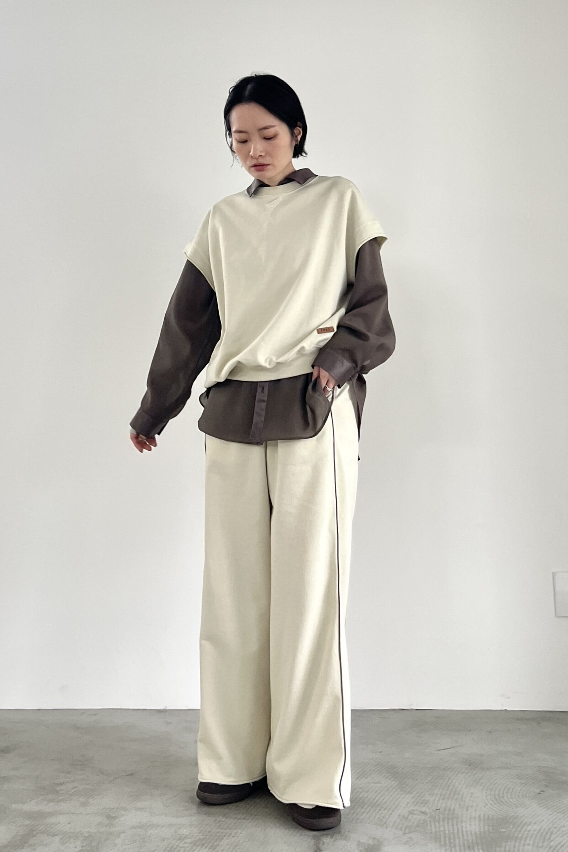 ベーシックな国産ミニ裏毛を使用したスリーブレスのスウェットプルオーバー。残暑の厳しい時期は1枚で、秋めいて来たらベストとしてレイヤードスタイルが楽しめます。アシンメトリーに仕上げた裾、リブ風のベロアを使用したガゼット切り替えがポイント。同素材のスウェットパンツとのセットアップもおすすめ。