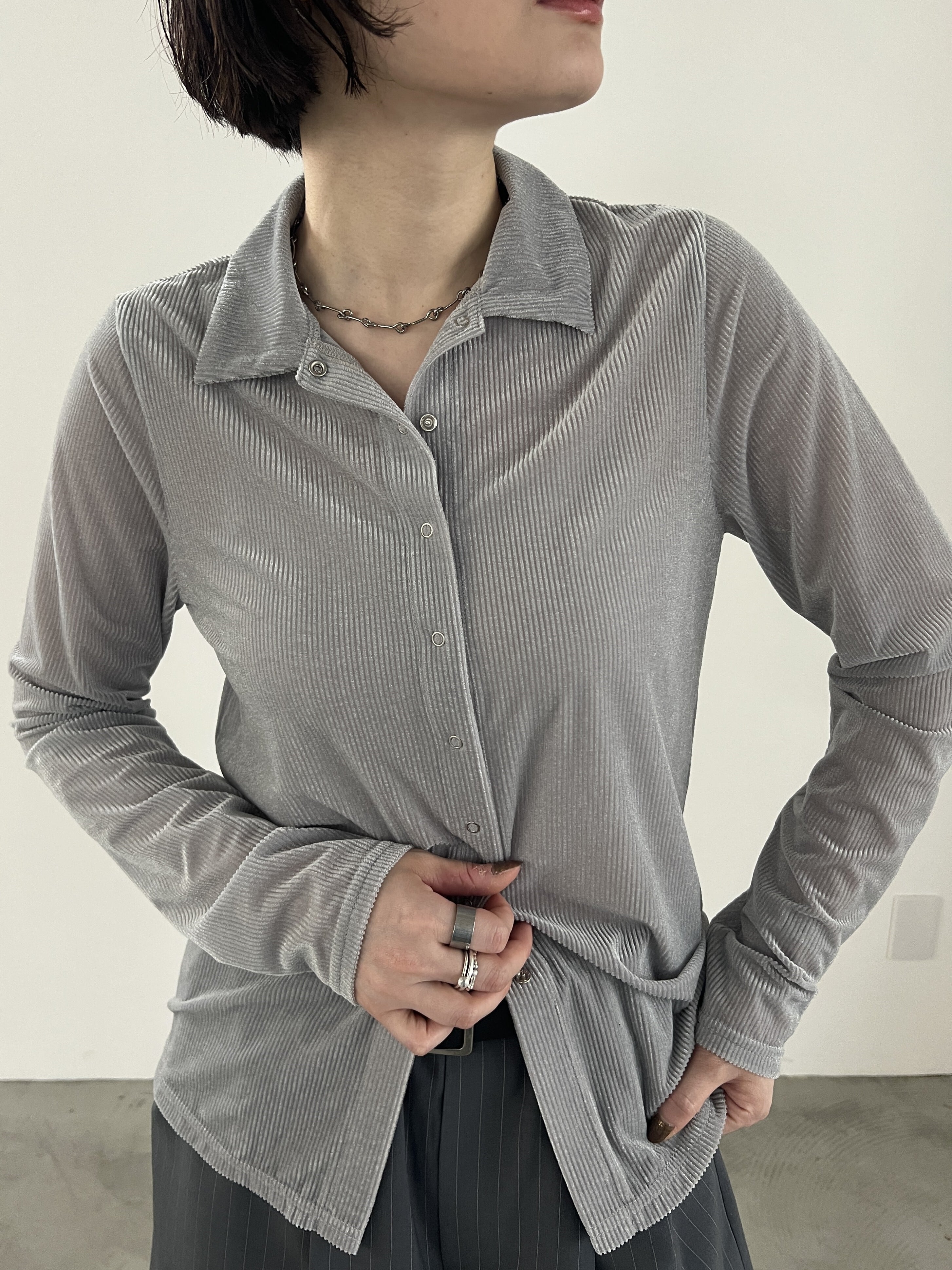 リブのような表面感が特徴のシアーベロア素材を使用したカットソーシャツ。程良い透け感とベロア特有の光沢感があり、衿付きなので綺麗めにもカジュアルにも合わせやすいトレンド感のあるシャツです。