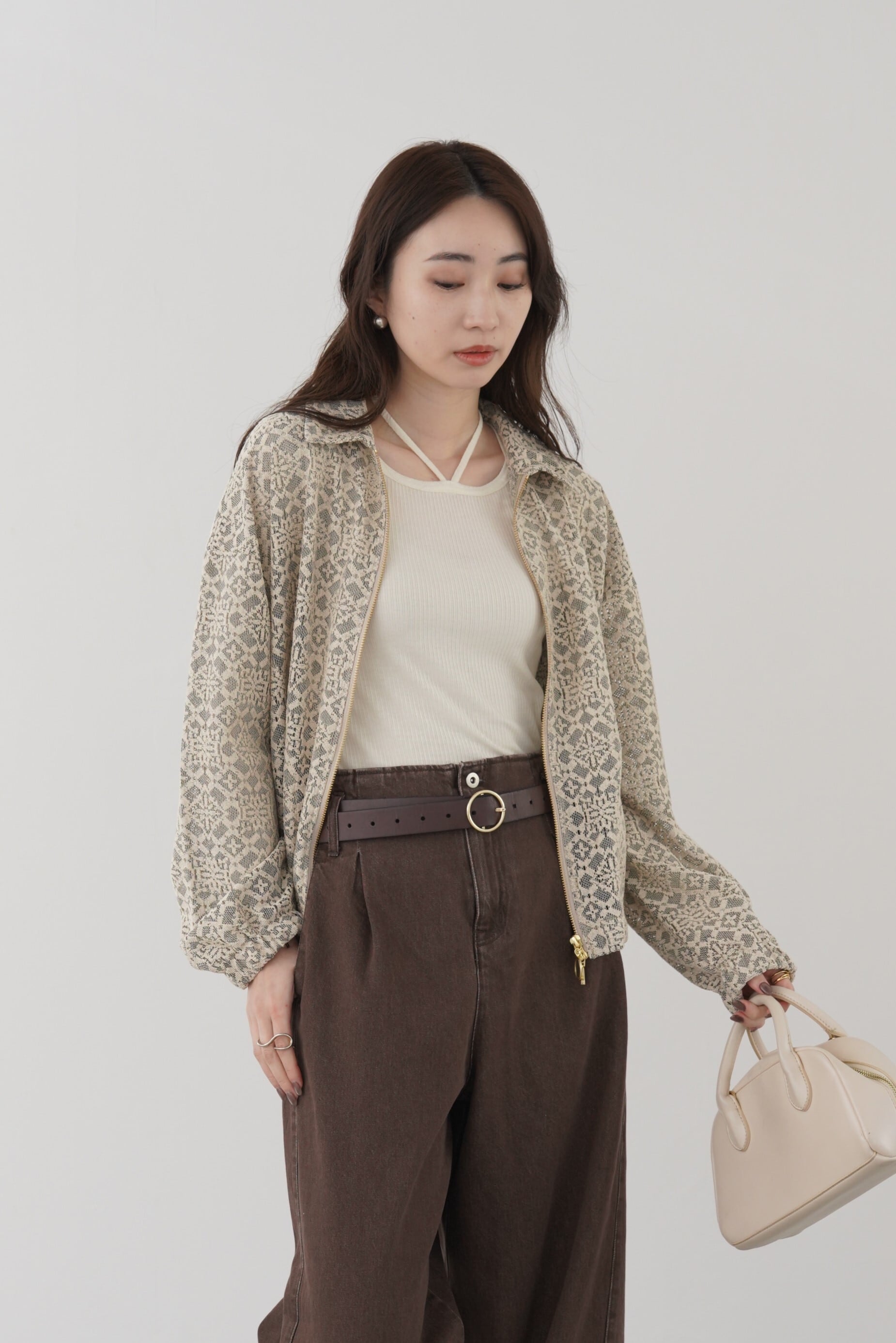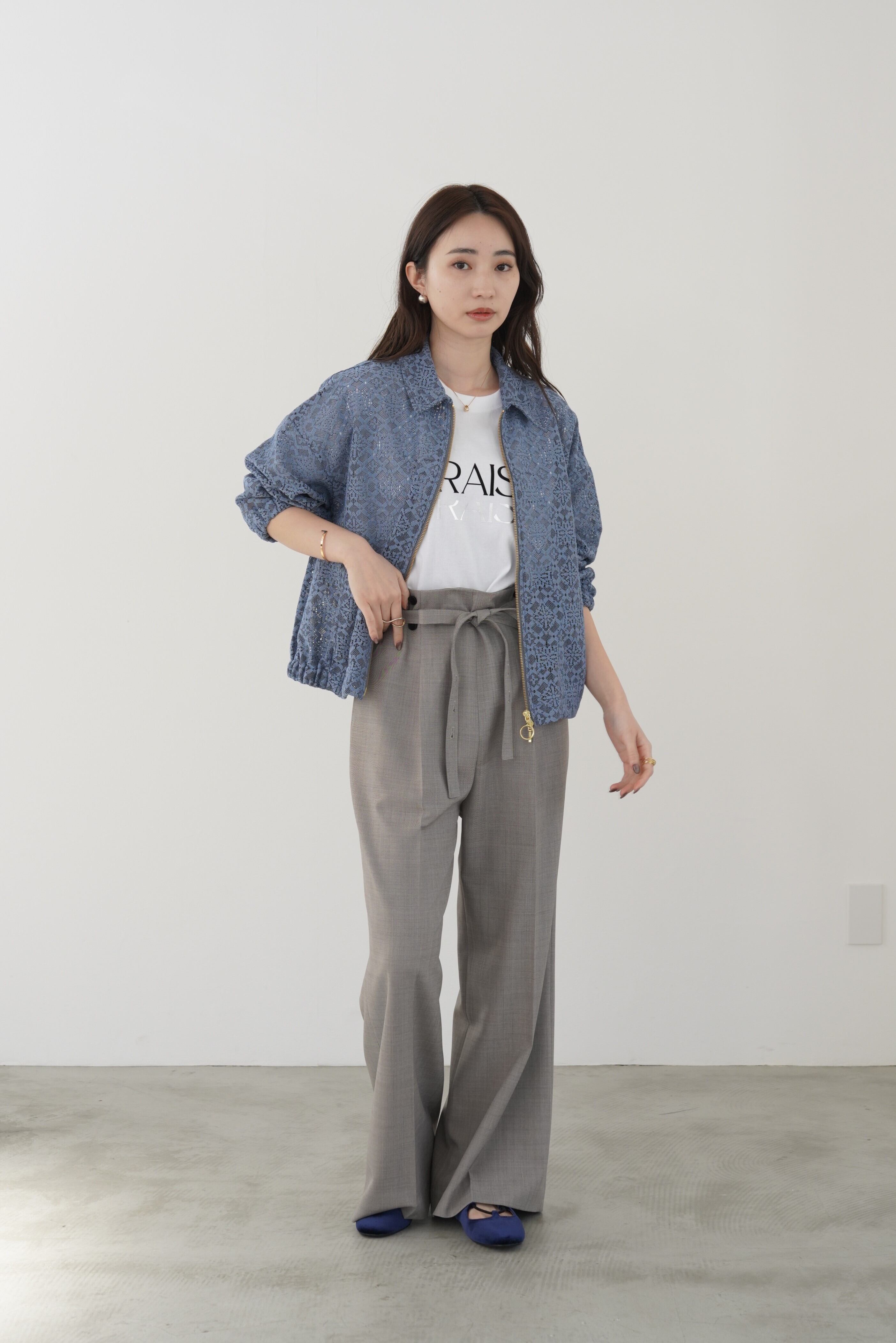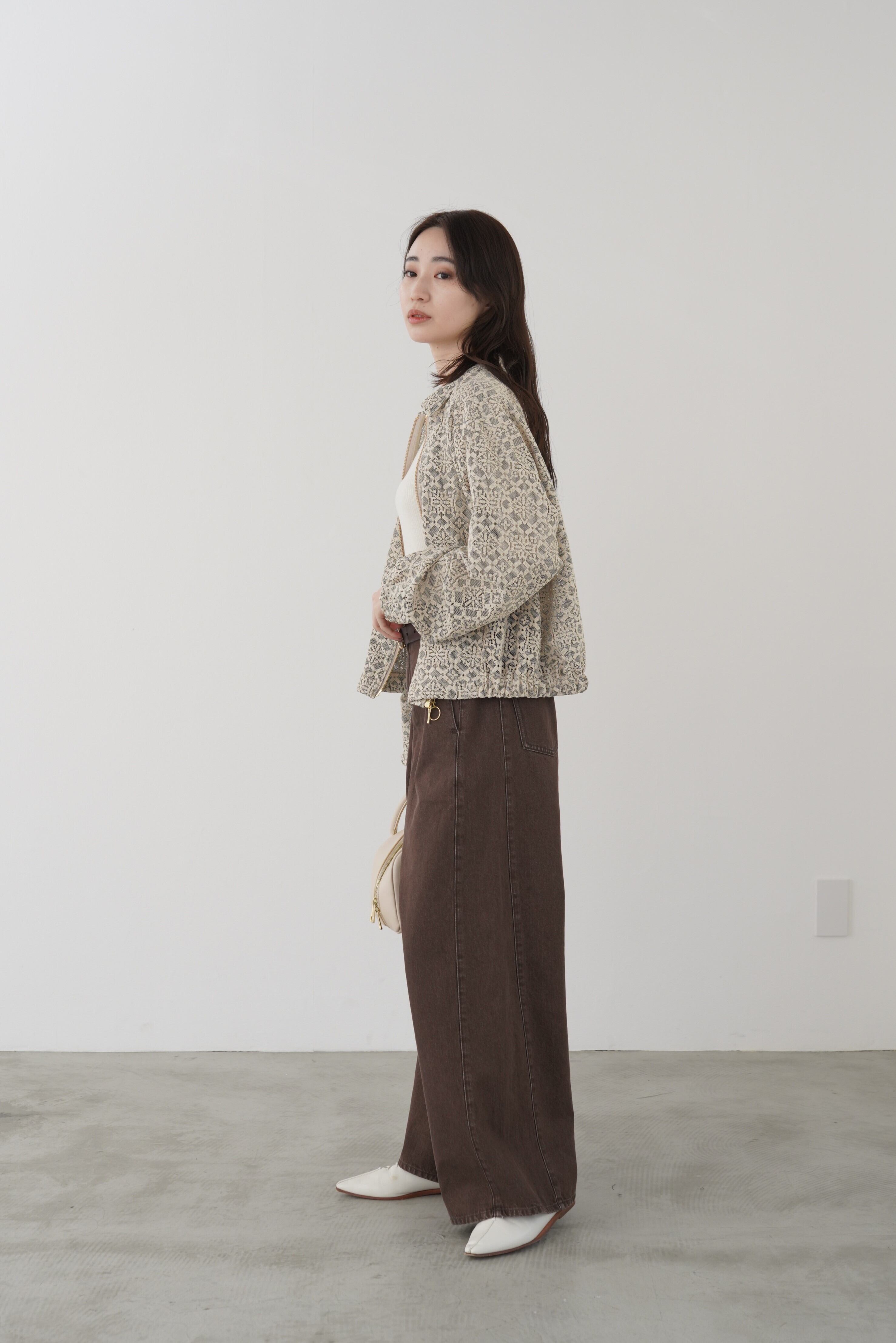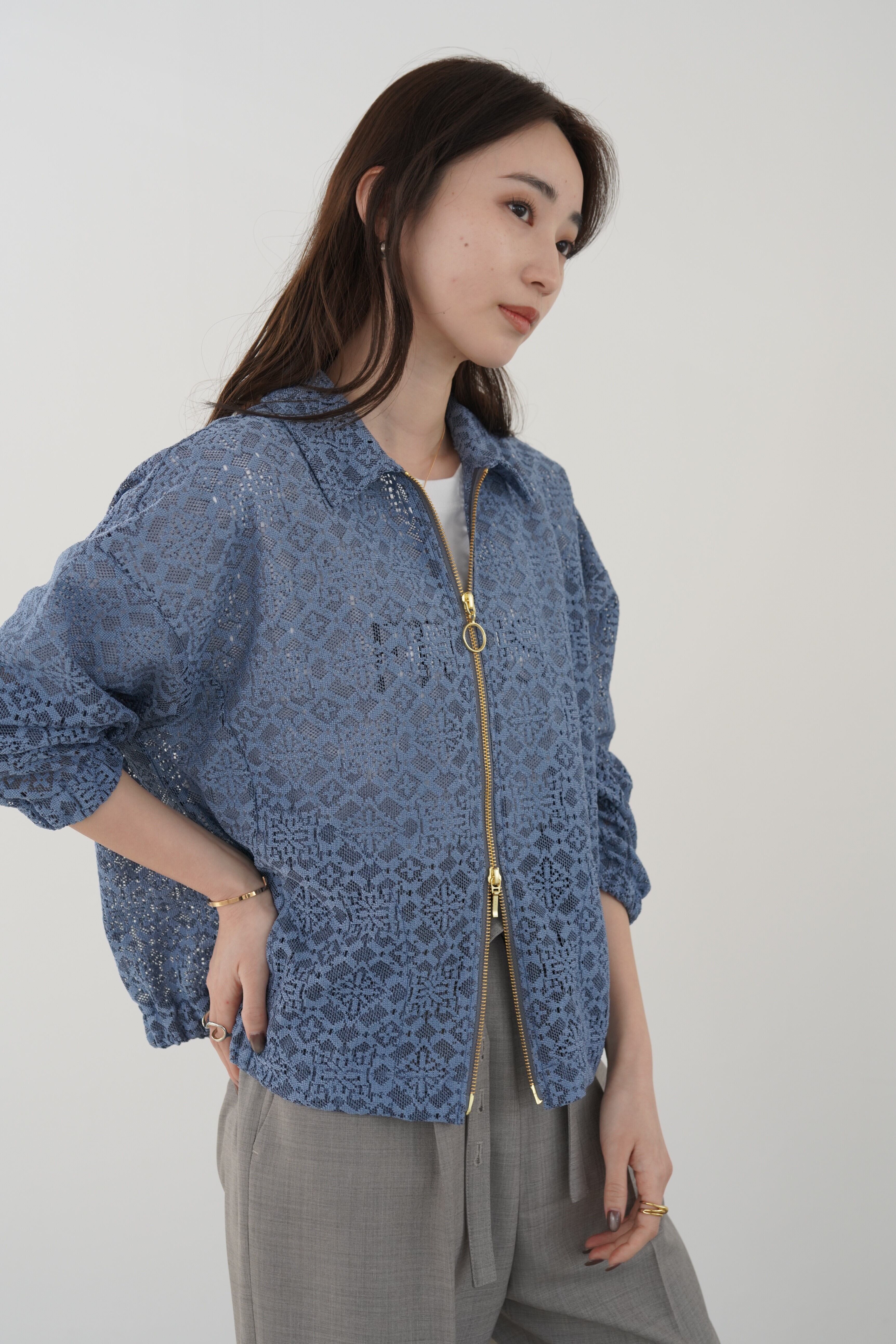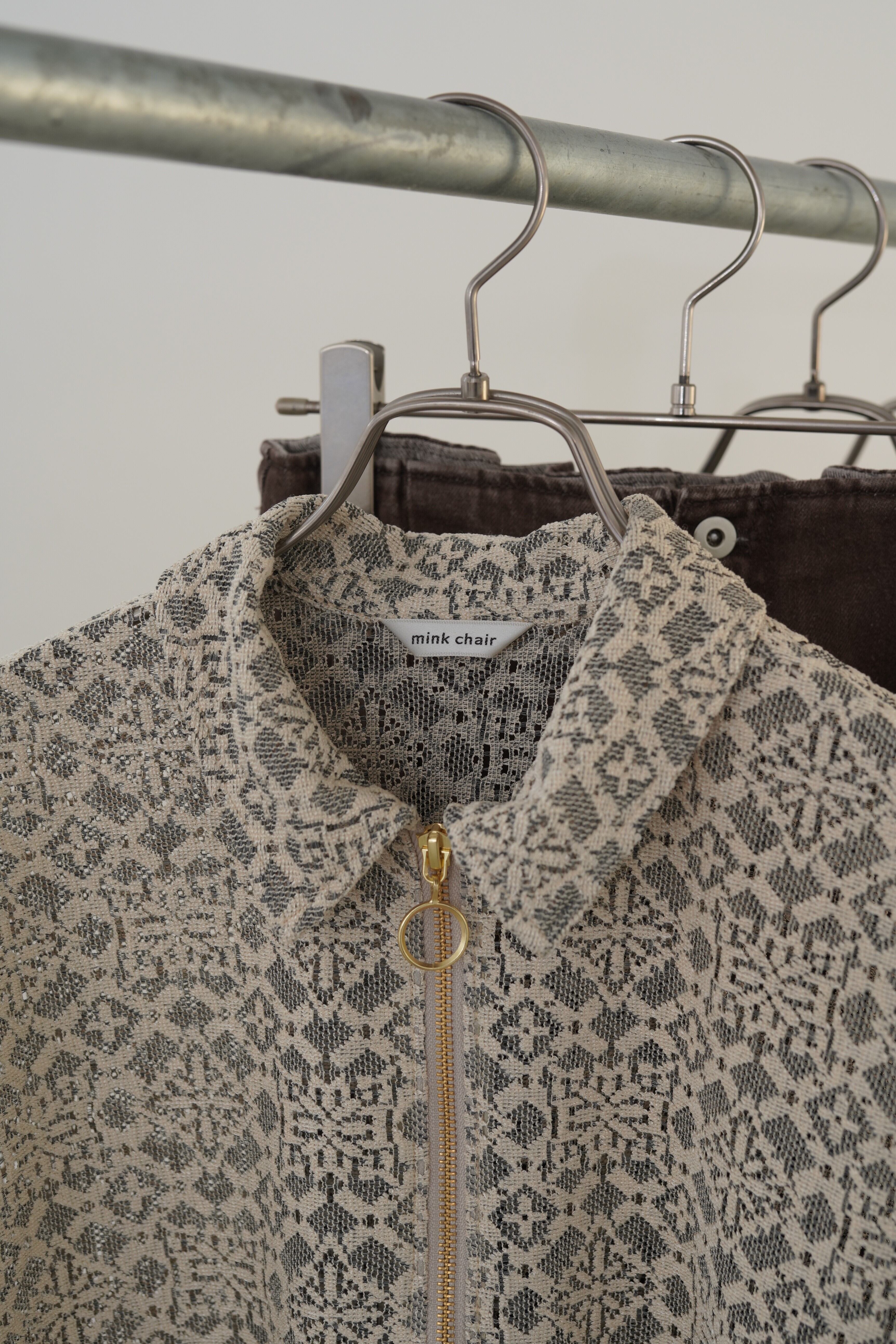 ソフトな風合いのジオメトリックレースを、クラシックなスウィングトップ型に落とし込んだブルゾン。襟の芯地や裏地を付けずに、あえて軽く仕立ててレースの透け感を楽しんで頂けるように仕上げました。