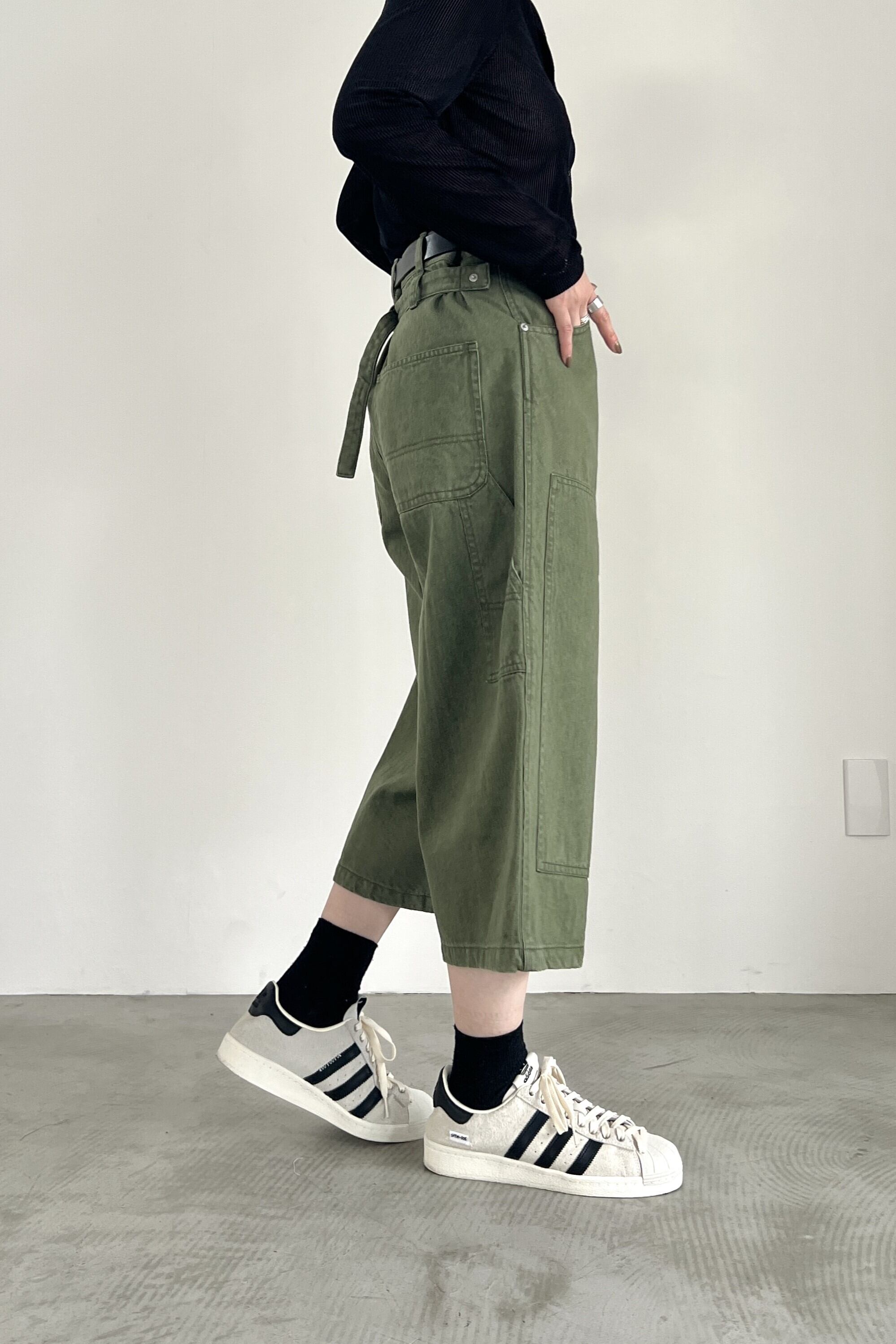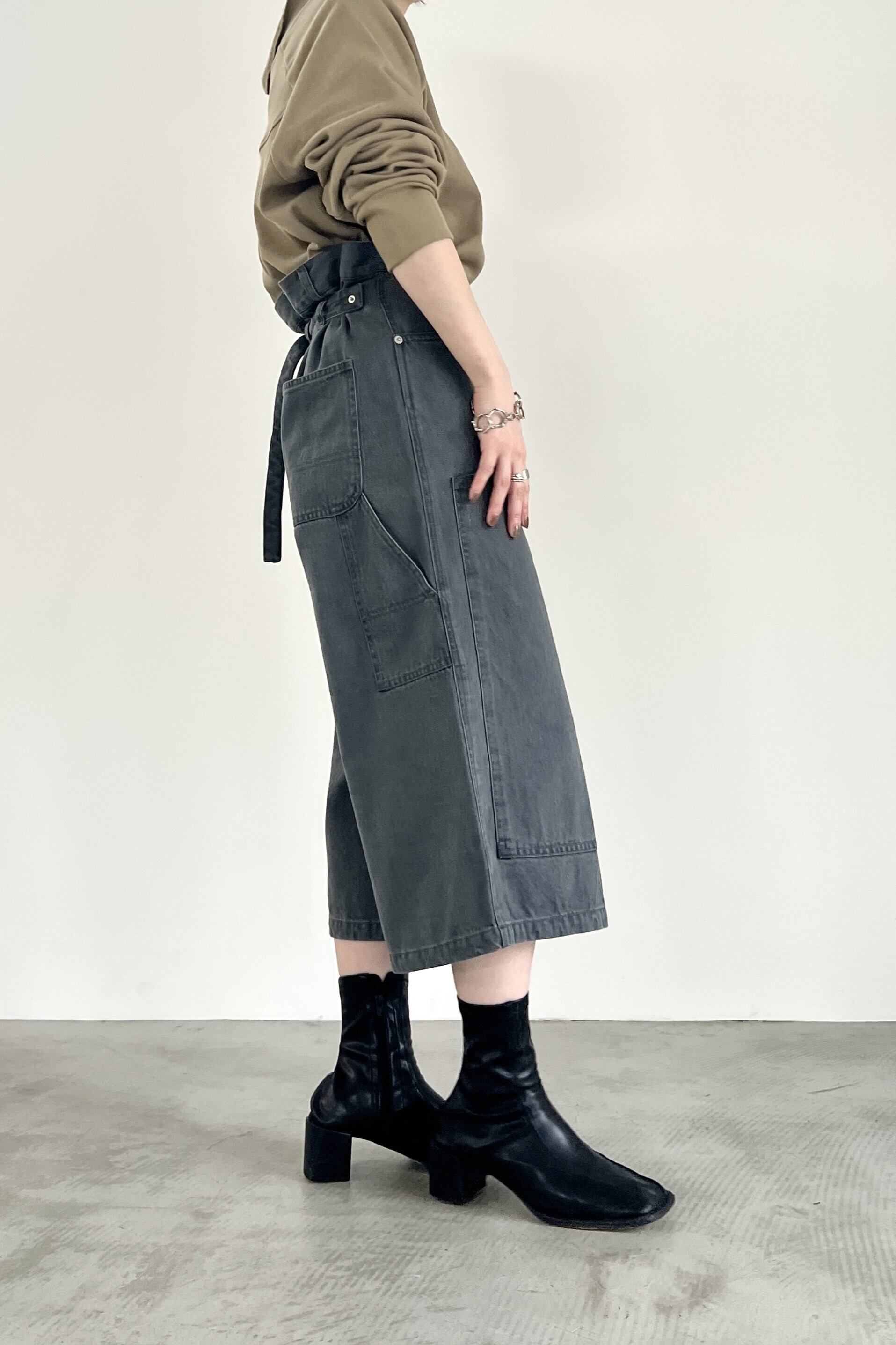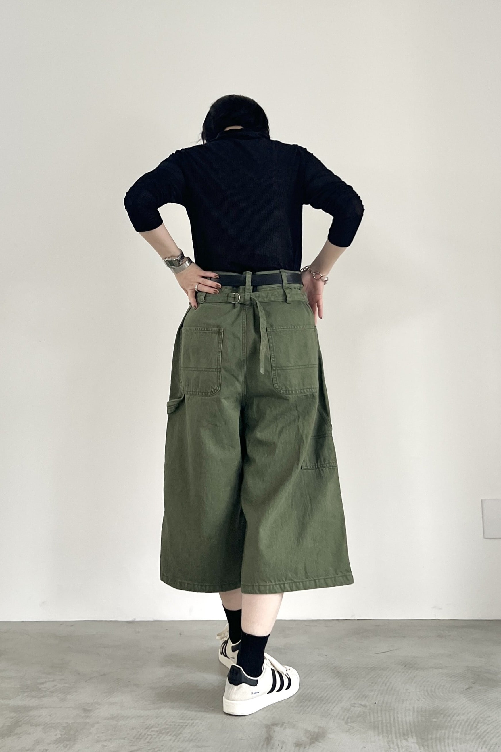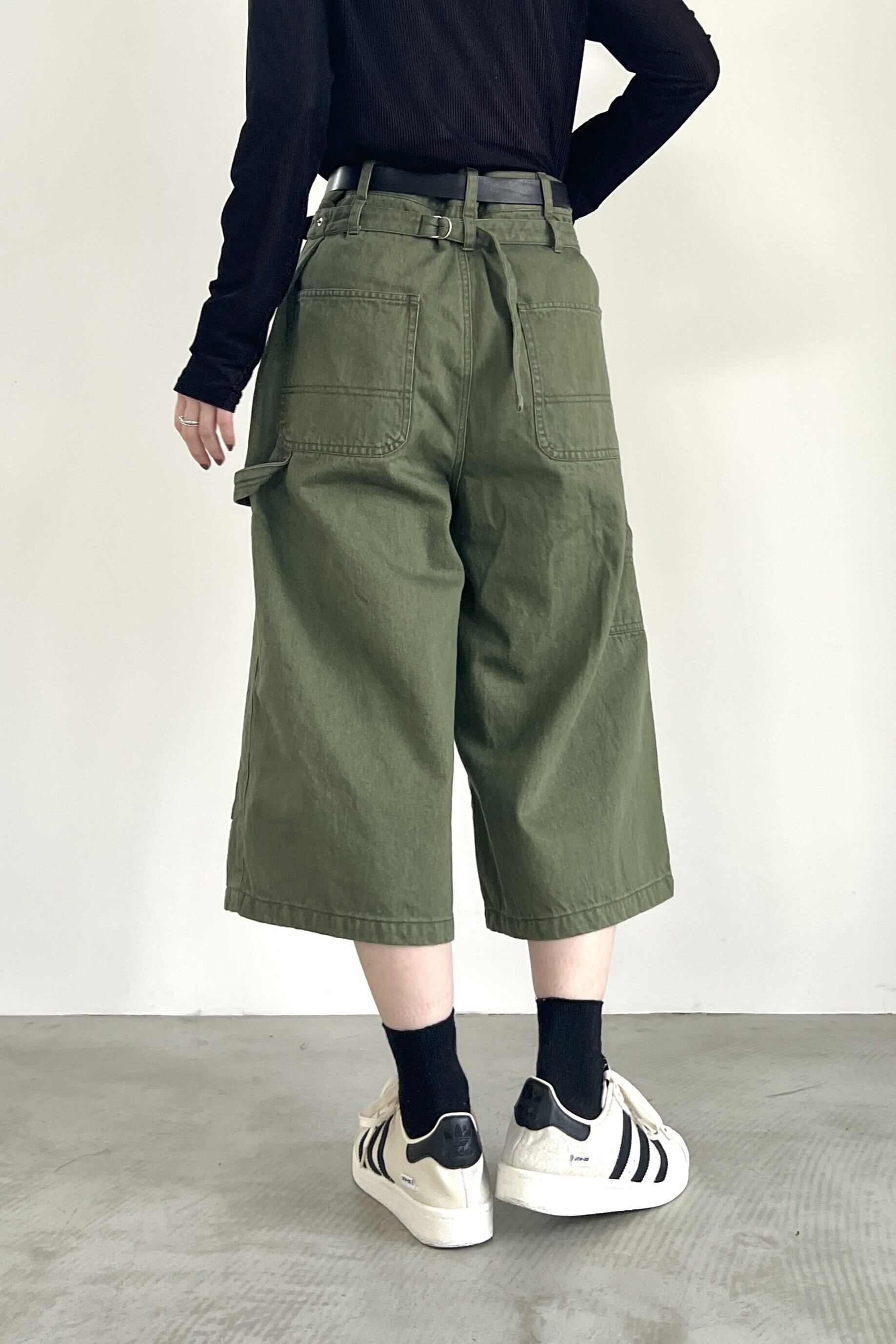 9.8オンスデニムを使用したトレンドのバミューダパンツ。ペインターパンツをベースに、大人が履ける丈感に落とし込みました。ジャケットやシャツ、ブーツなど綺麗めなアイテムと組み合わせることでエッジの効いたスタイリングを楽しめます。バックウエストを大きく作り、ベルトで締めて着用するデザインなので、幅広い方に着用いただけます。