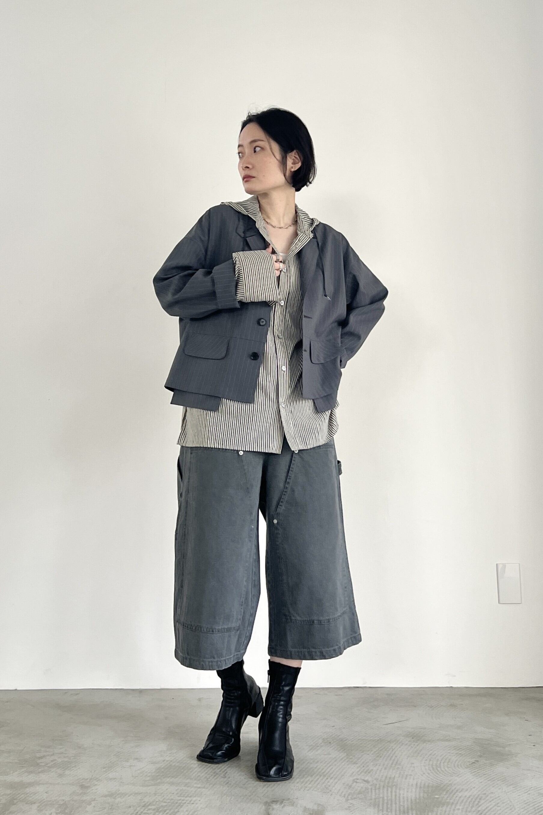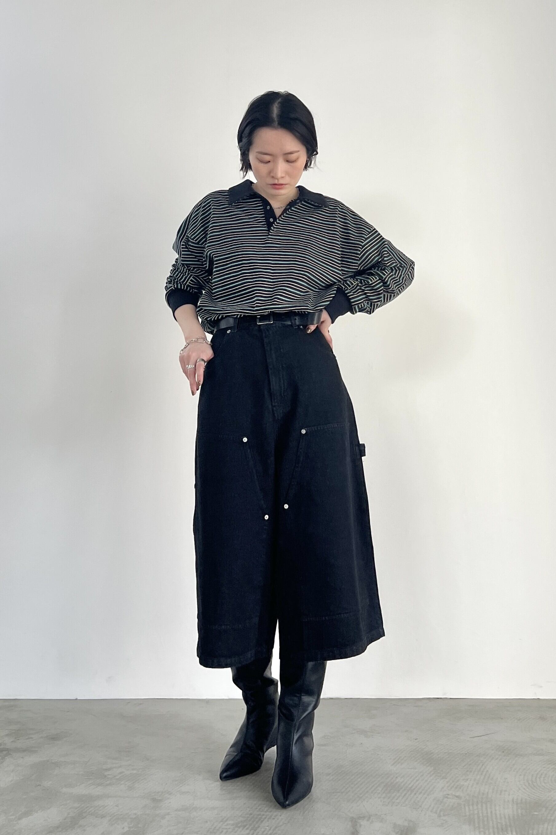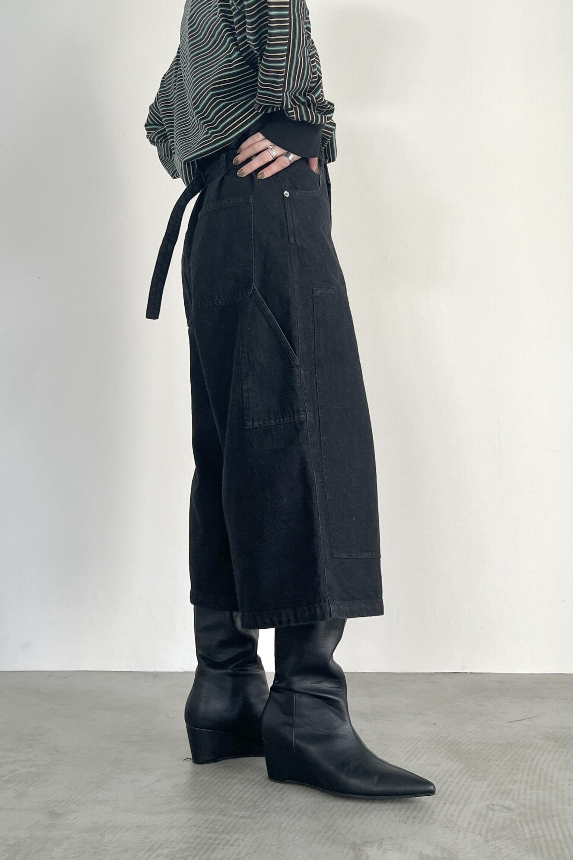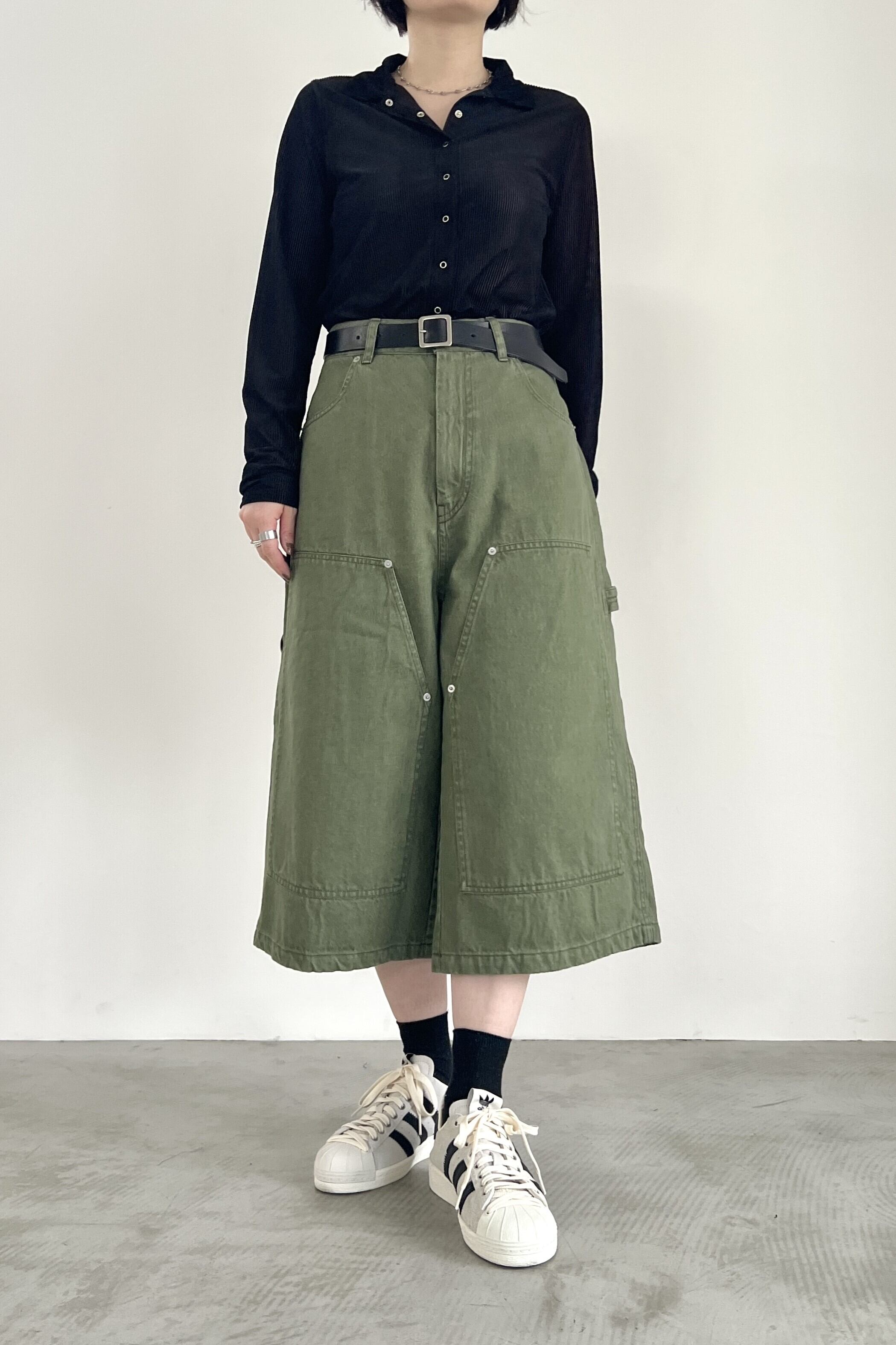 9.8オンスデニムを使用したトレンドのバミューダパンツ。ペインターパンツをベースに、大人が履ける丈感に落とし込みました。ジャケットやシャツ、ブーツなど綺麗めなアイテムと組み合わせることでエッジの効いたスタイリングを楽しめます。バックウエストを大きく作り、ベルトで締めて着用するデザインなので、幅広い方に着用いただけます。