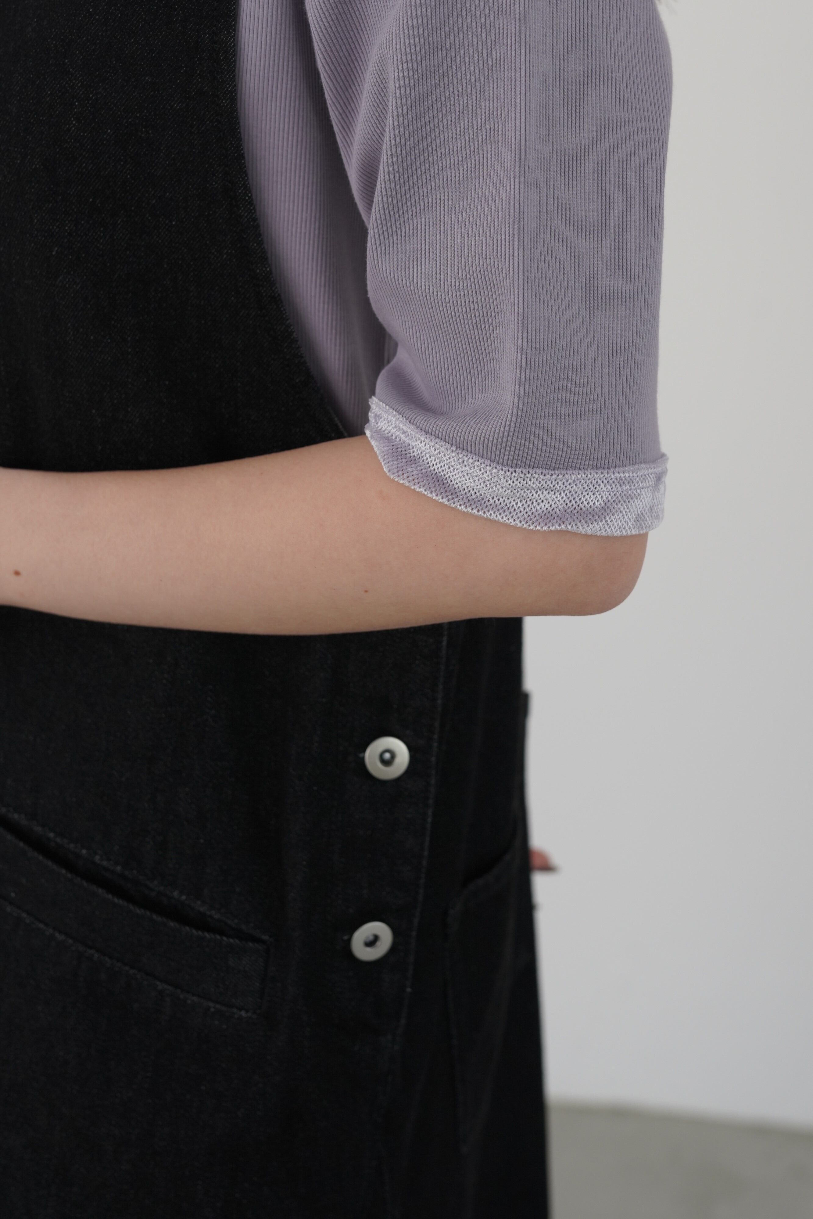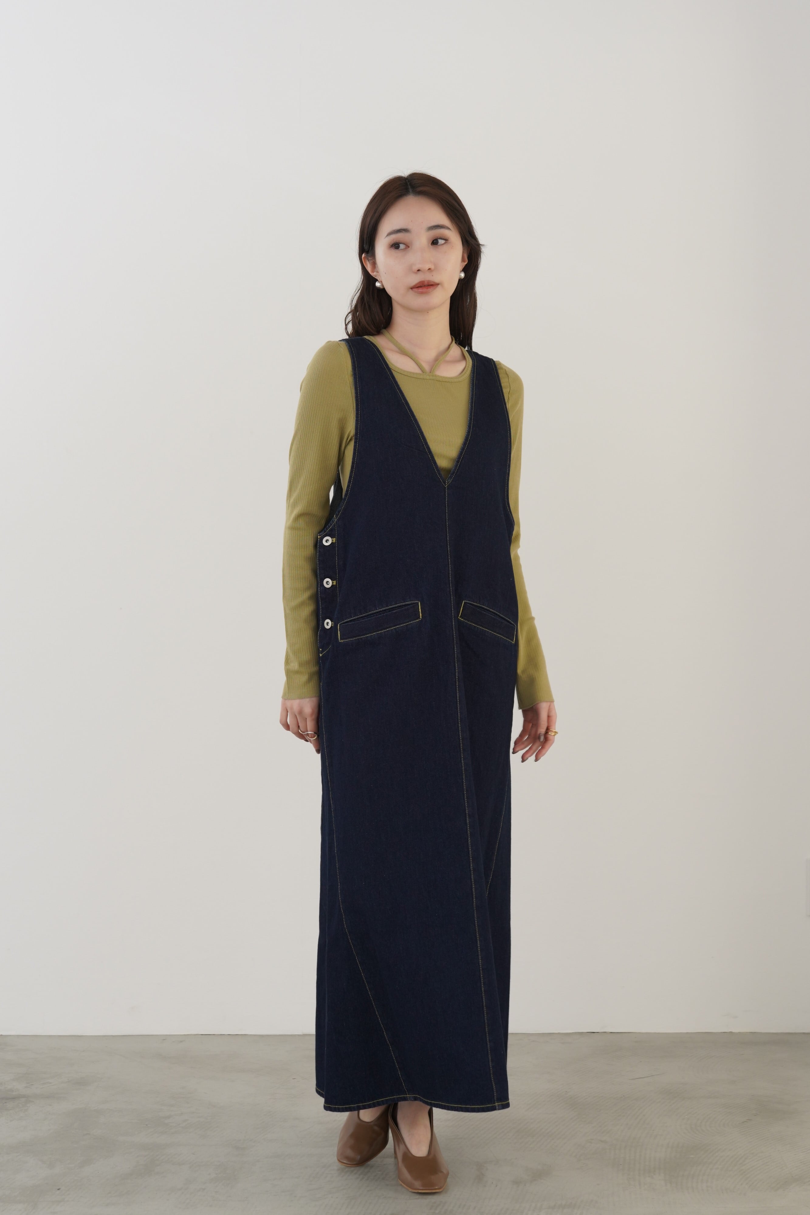 カジュアルに偏りがちなデニムジャンスカをすっきりVネック、フレアシルエットで女性らしく仕上げました。ベンツスリットで足捌きも抜群です。肩のストラップボタンで着用の調節が可能です。