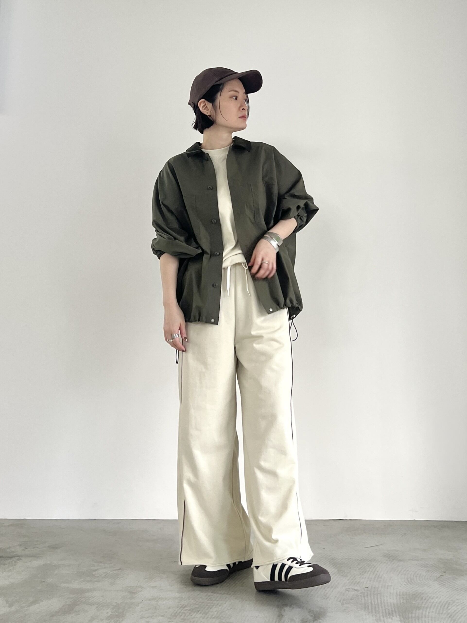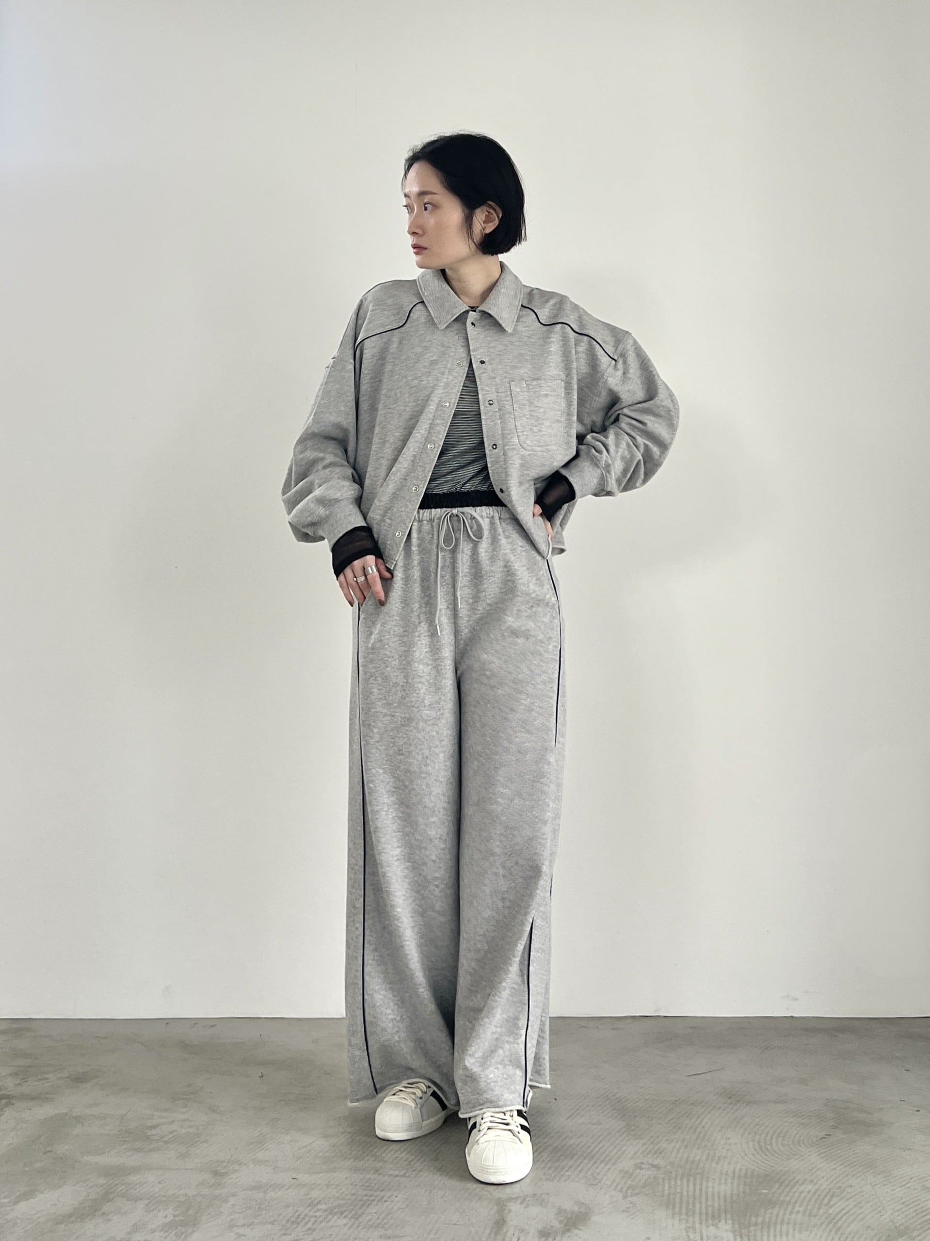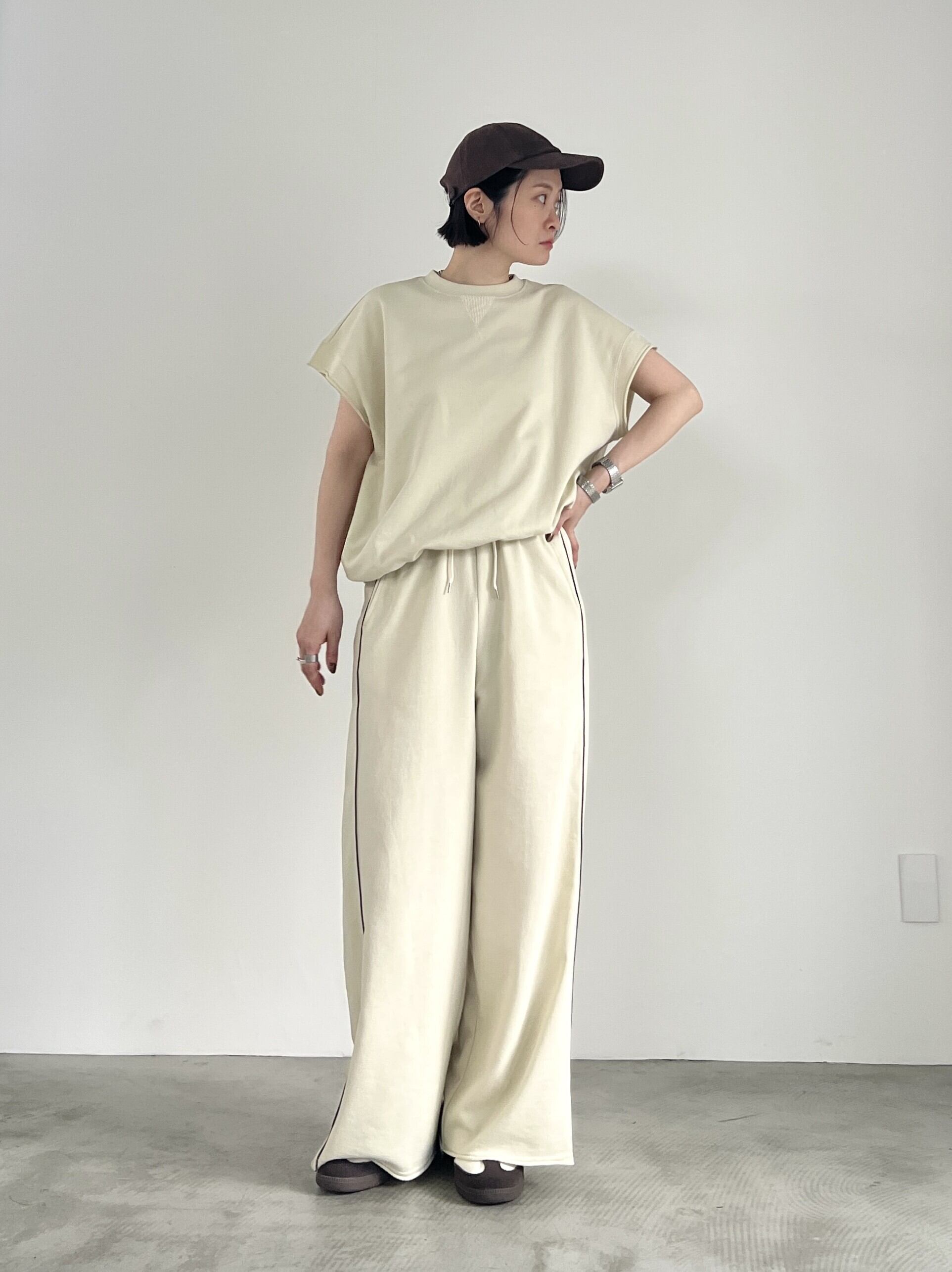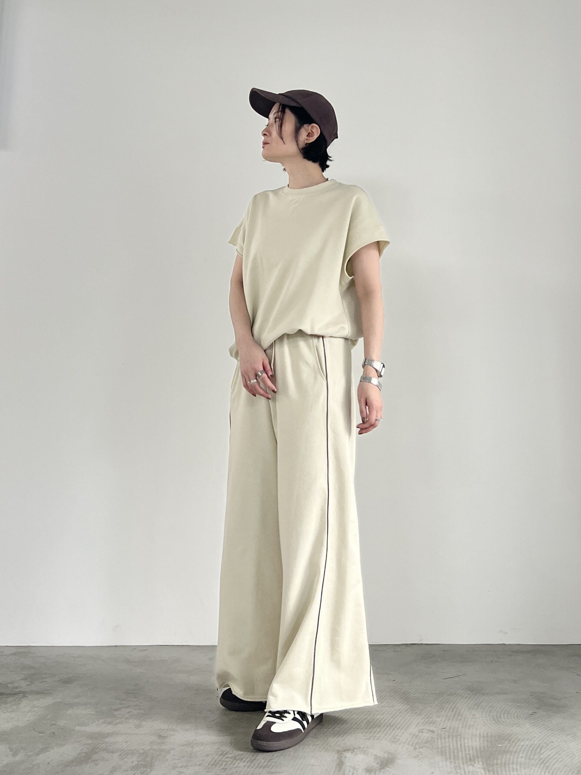 べーシックな国産ミニ裏毛を使用したワイドシルエットのスウェットパンツ。ウエストにレザー調素材を使用し、シーズンムードをプラス。細見え効果のある配色のパイピングライン、切りっぱなしの裾もポイント。同素材のプルオーバー、シャツとのセットアップもおすすめ。
