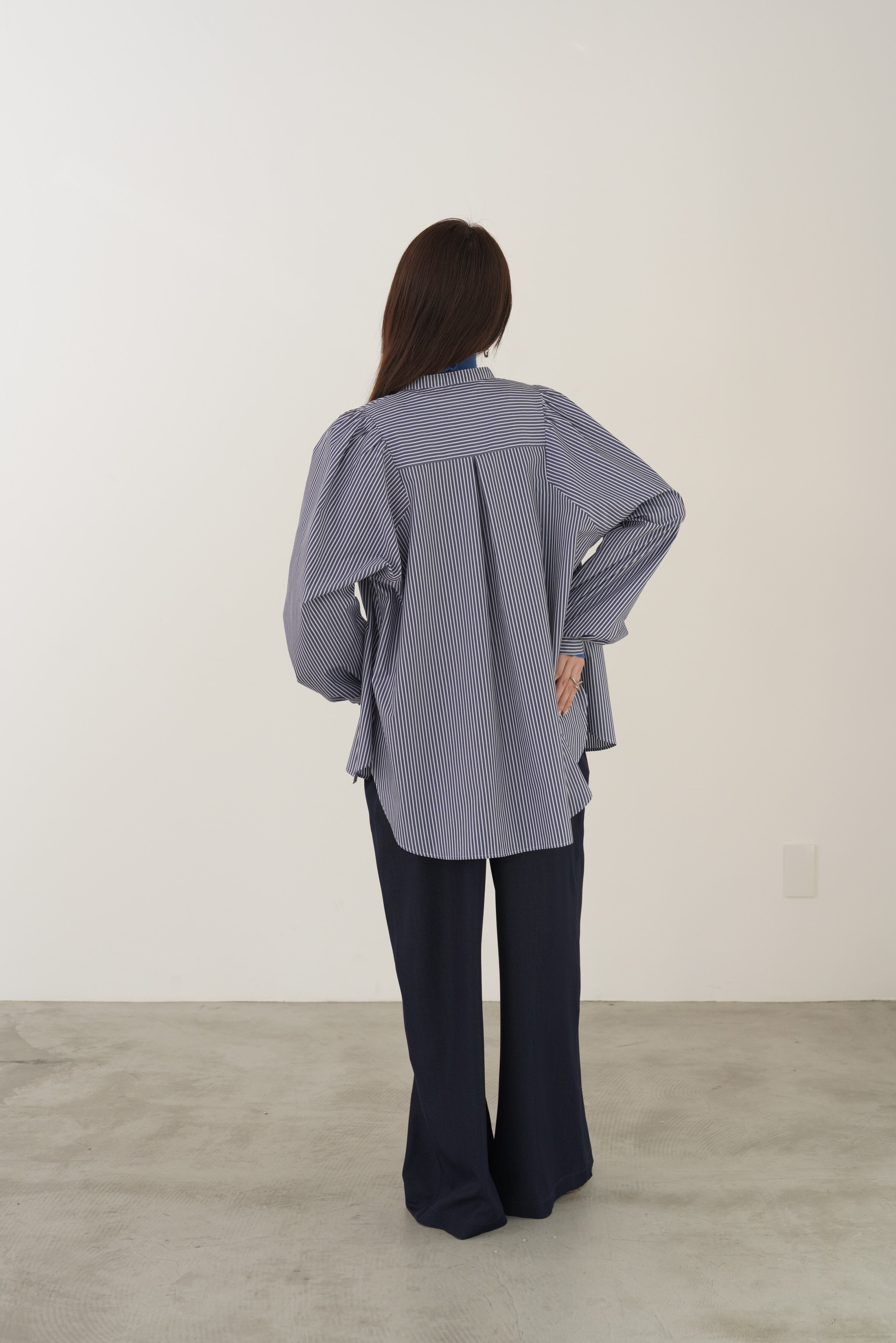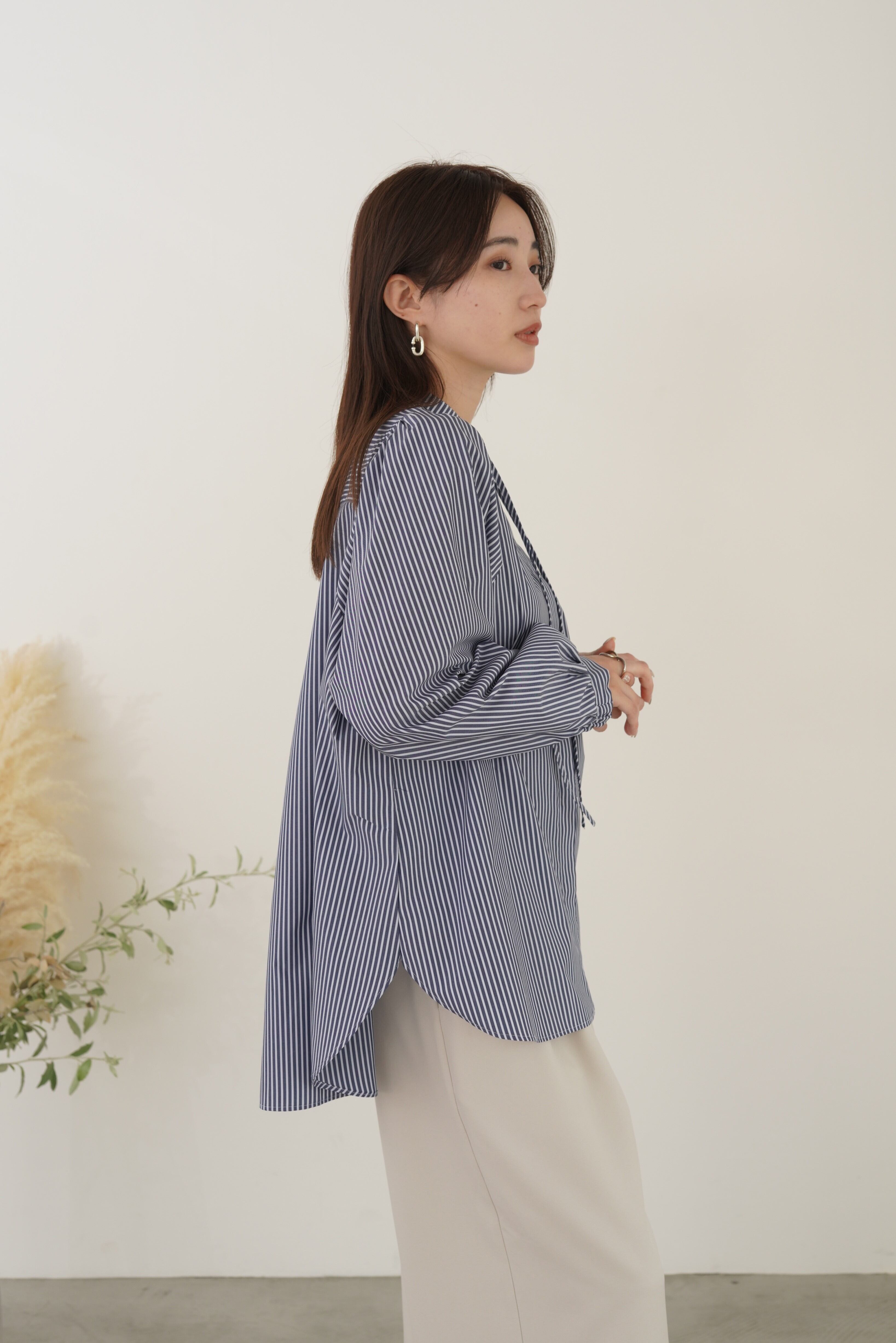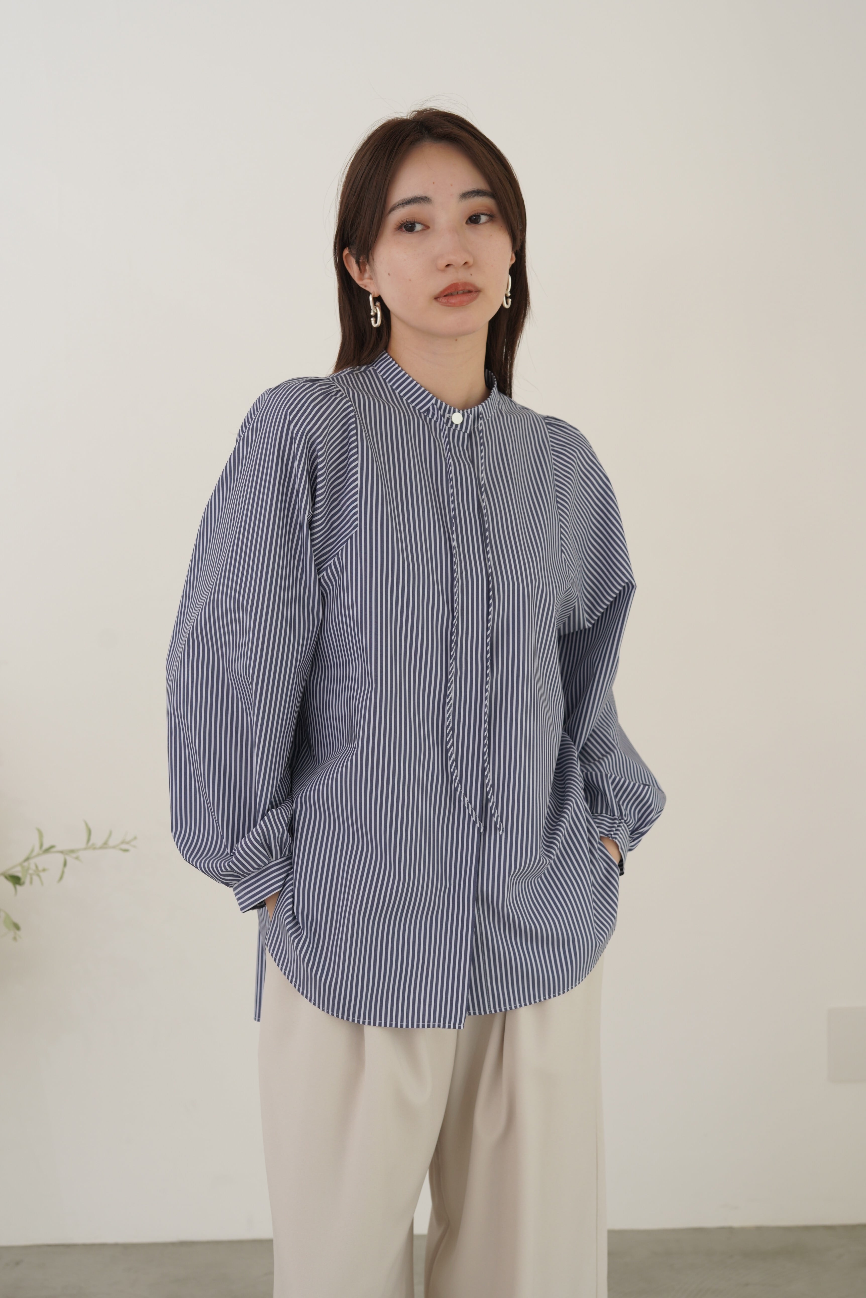 肩を華奢に見せてくれるギャザーショルダーブラウス。比翼仕立てでドレス要素をプラス。襟のリボンとシルバーのボタンがminkchairらしいアクセント。袖口下にゴムが入っており、たくし上げやすい袖口の仕上げに。コットンライクなポリエステル素材でシワになりにくく、さらっとしたタッチのシャツ地を使用しています。