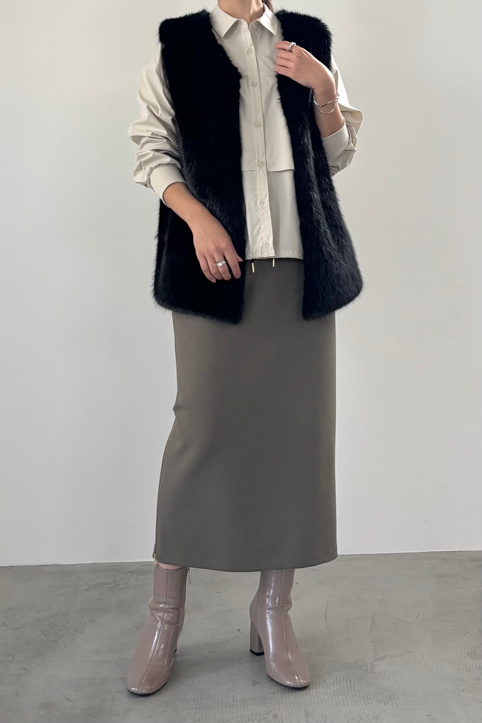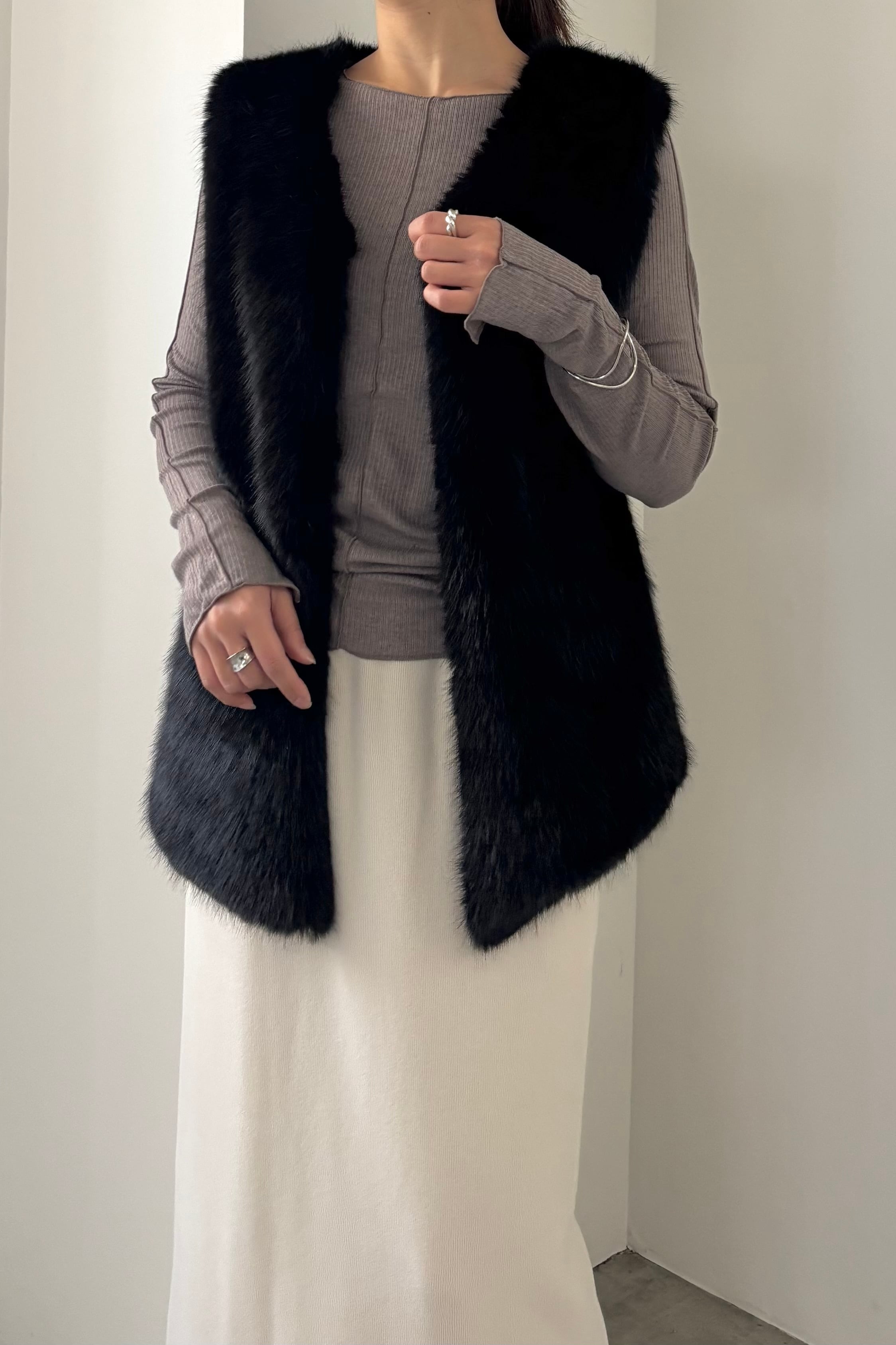 毛並みのきれいな、シーズンムードたっぷりの着回しやすいファーベスト。ニットと合わせてももたつかない様に広めのアームホールに設定しています。