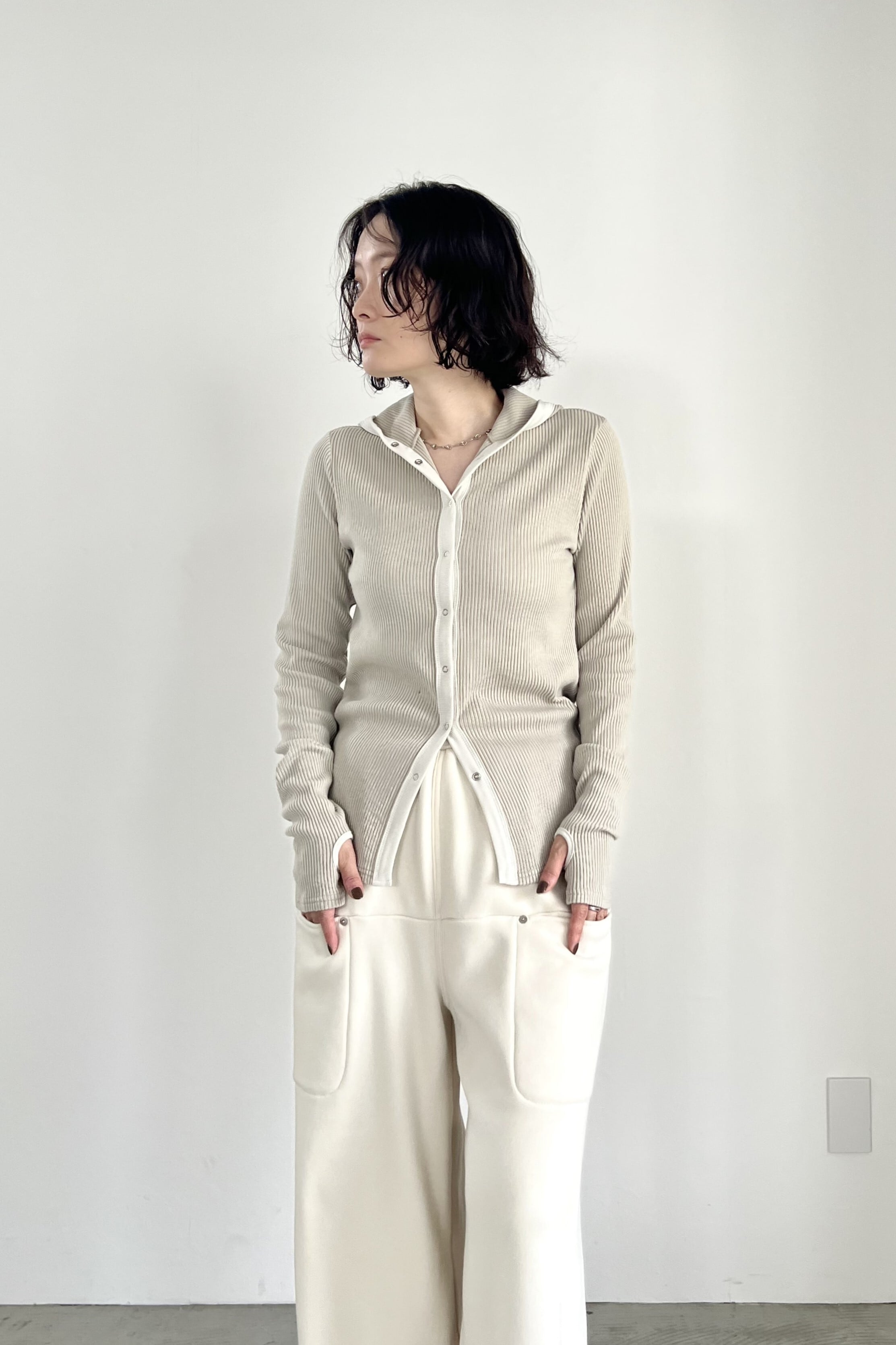 高機能素材のラグウォームリブを使用したフーディー付きカットソー。湿気や汗を熱に変えて保温してくれるので温かさが続き、抜群のストレッチ性があるのにもかかわらず型崩れしにくいという冬のラグジュアリーな素材です。バイカラーのパイピングやフィンガーホールがポイントの、冬の代わり種のインナーとして1枚あると便利なカットソーです。
