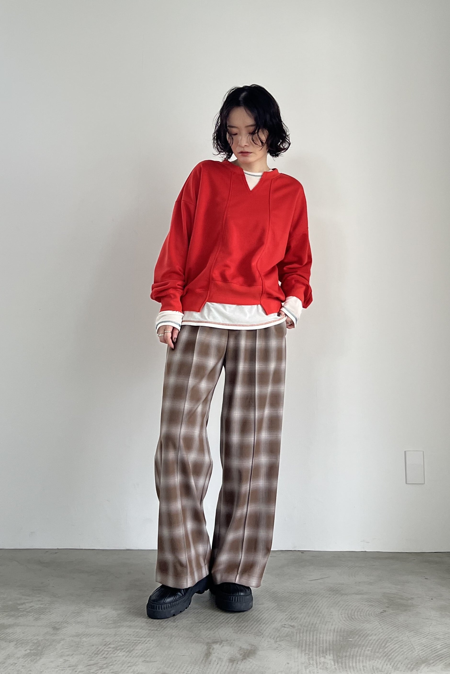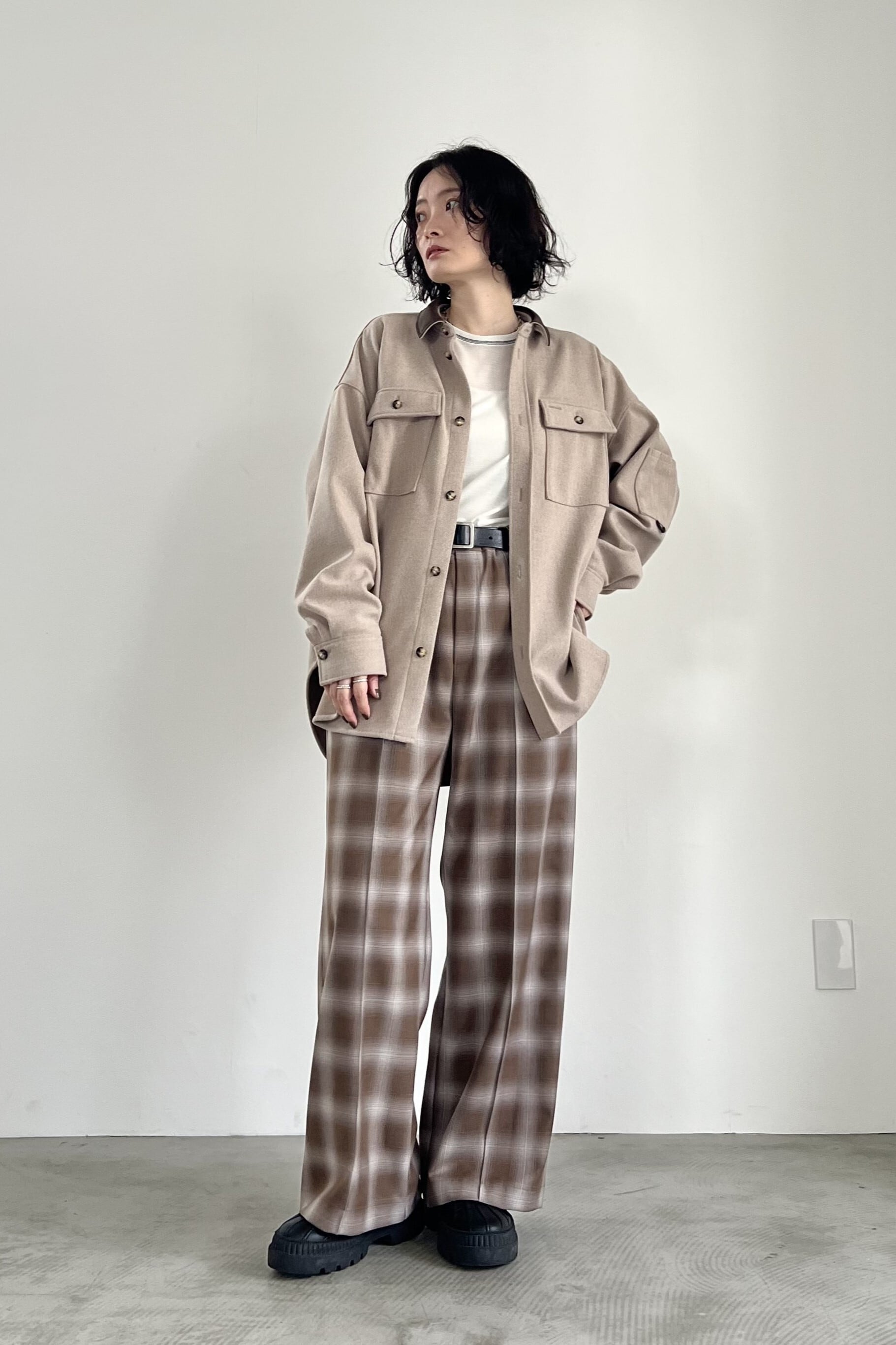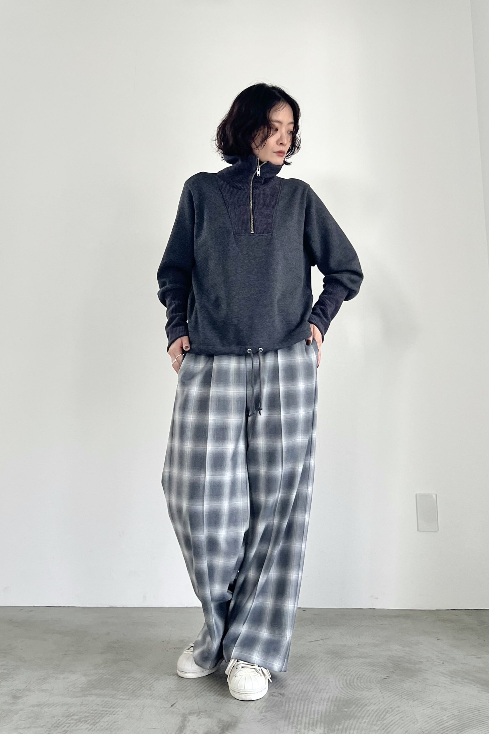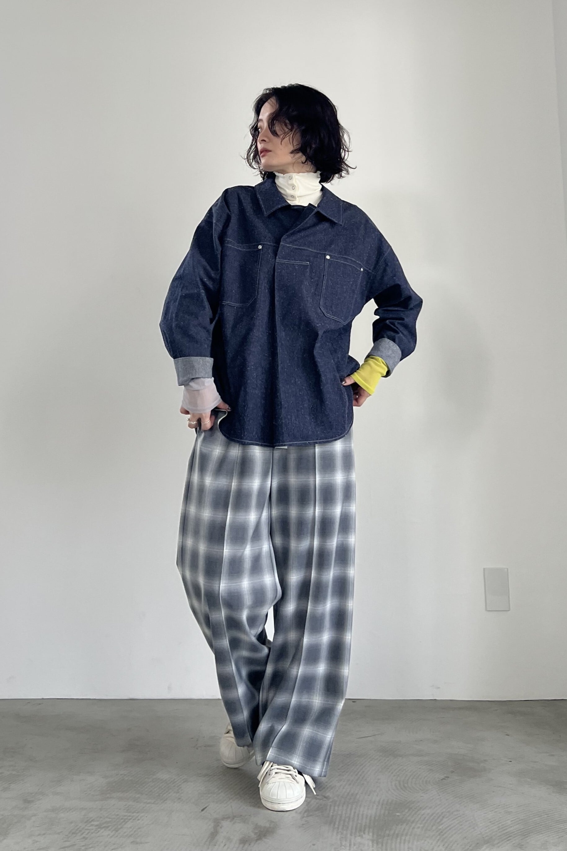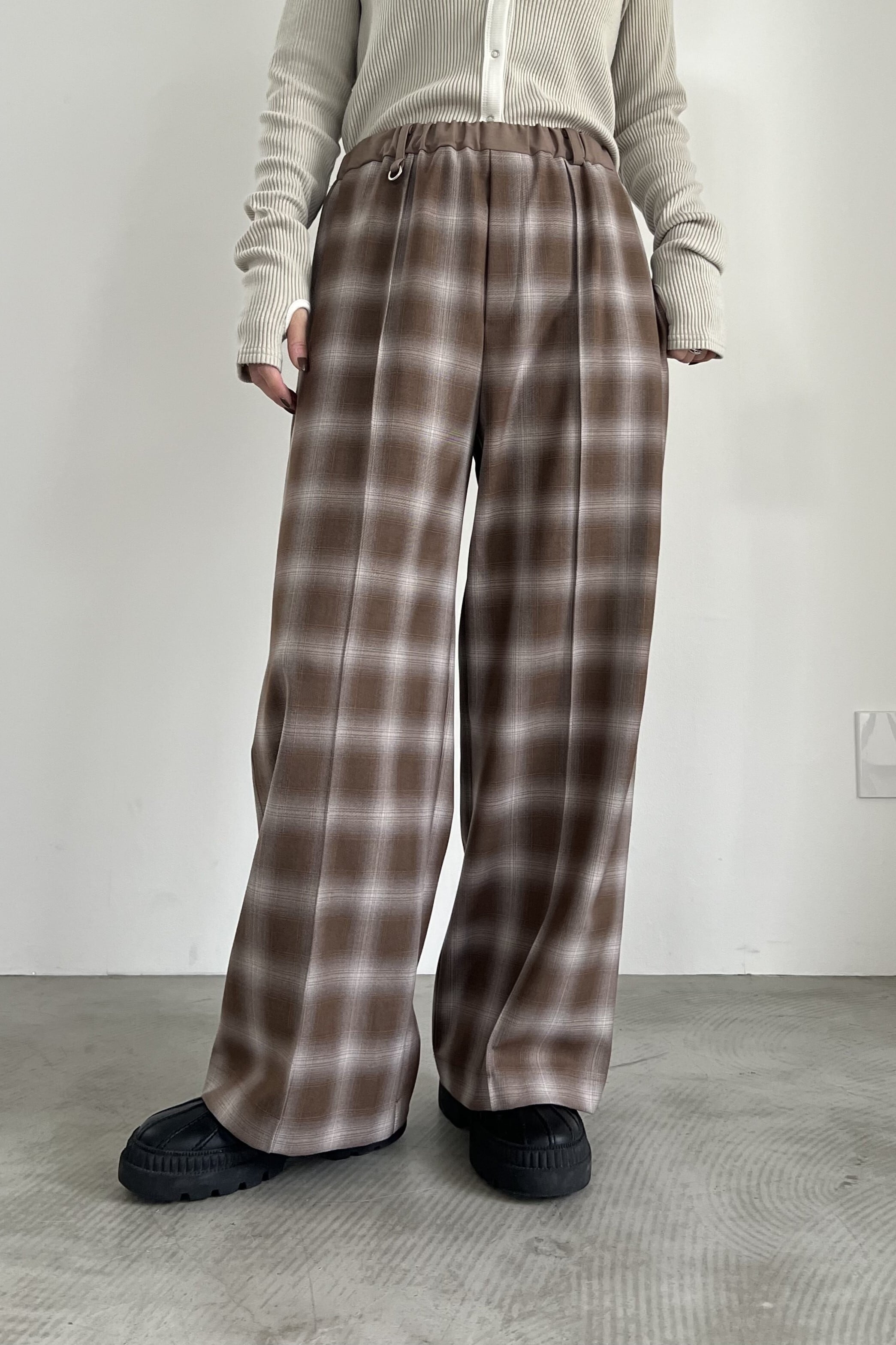 オンブレチェックの裏微起毛ツイルを使用したピンタック入りのワイドパンツ。きれいな表面感の素材なのでオンブレでチェックでもカジュアルになり過ぎないのがポイントです。ウエストは総ゴム仕様でリラックス感がありながらも、ベルトループ付きなのでお手持ちのベルトでウエストマークして着用していただくことも可能です。