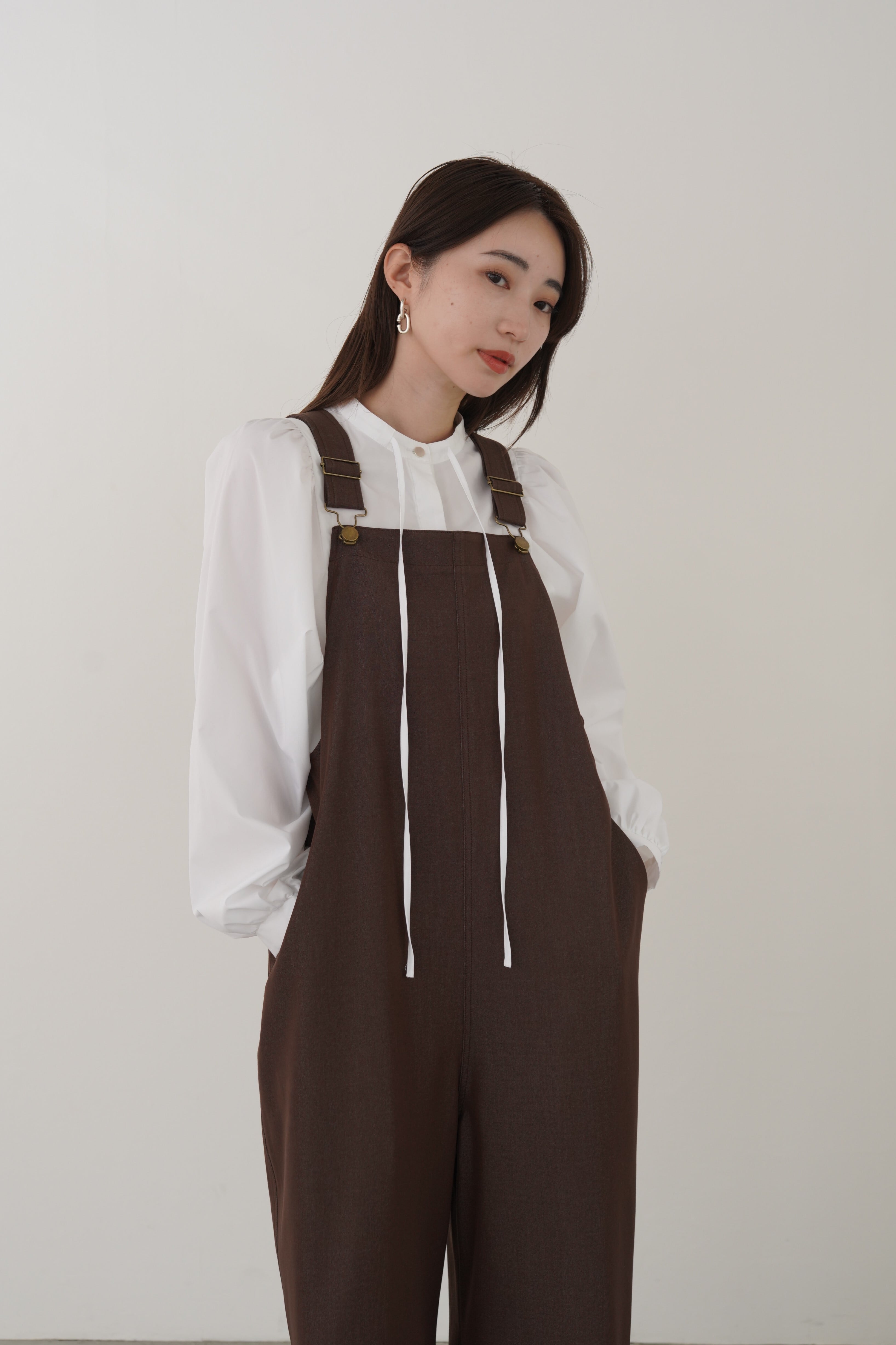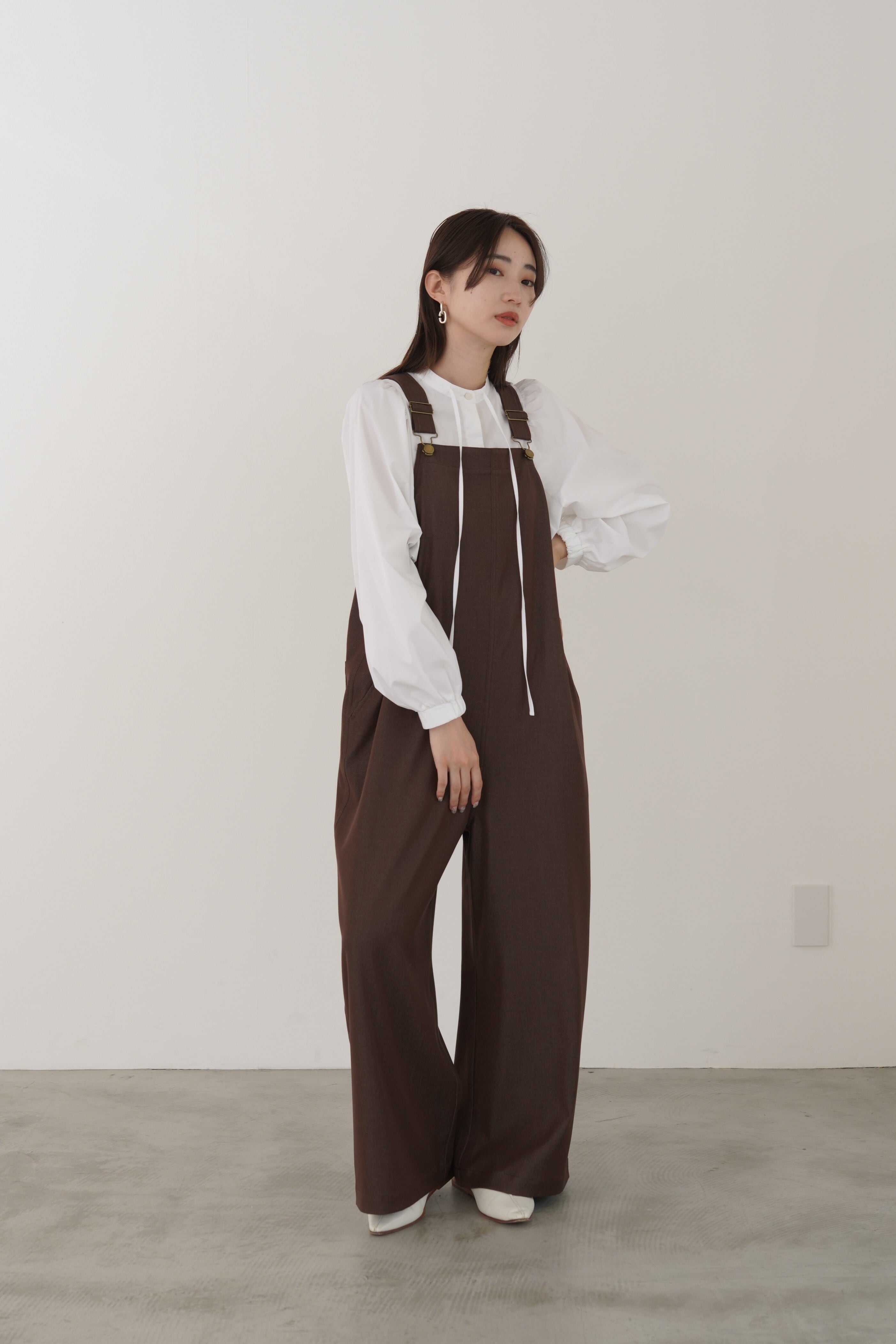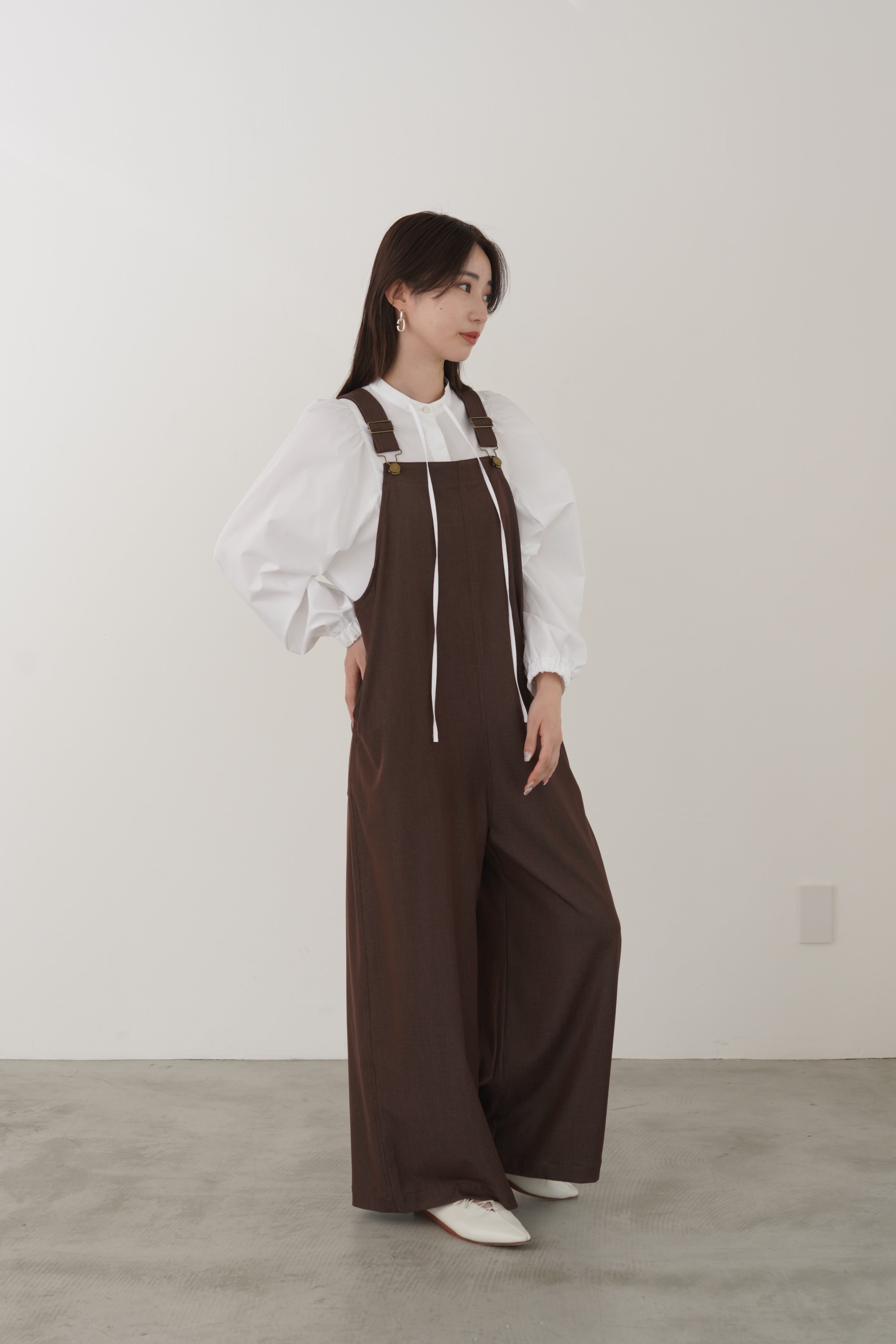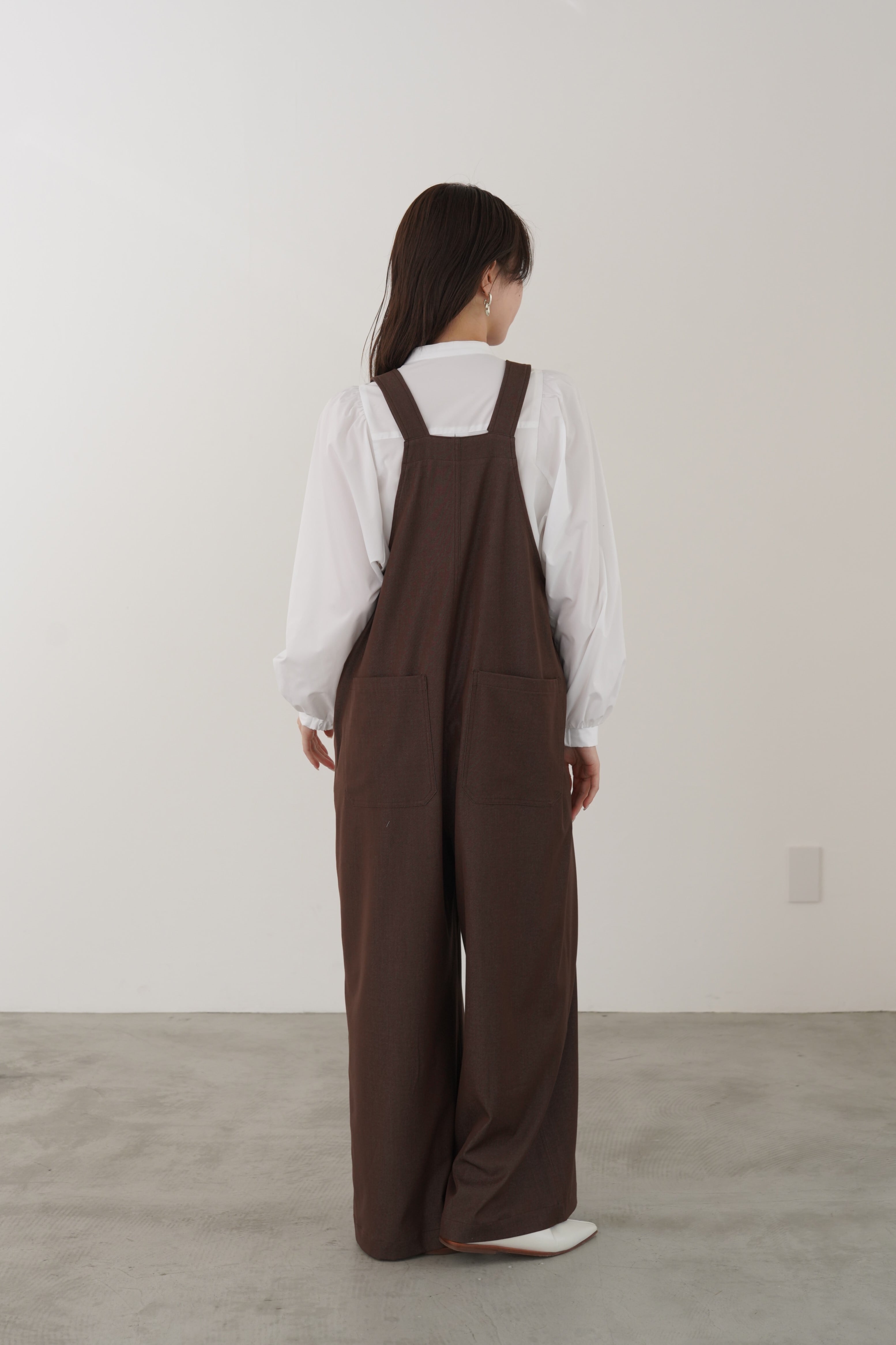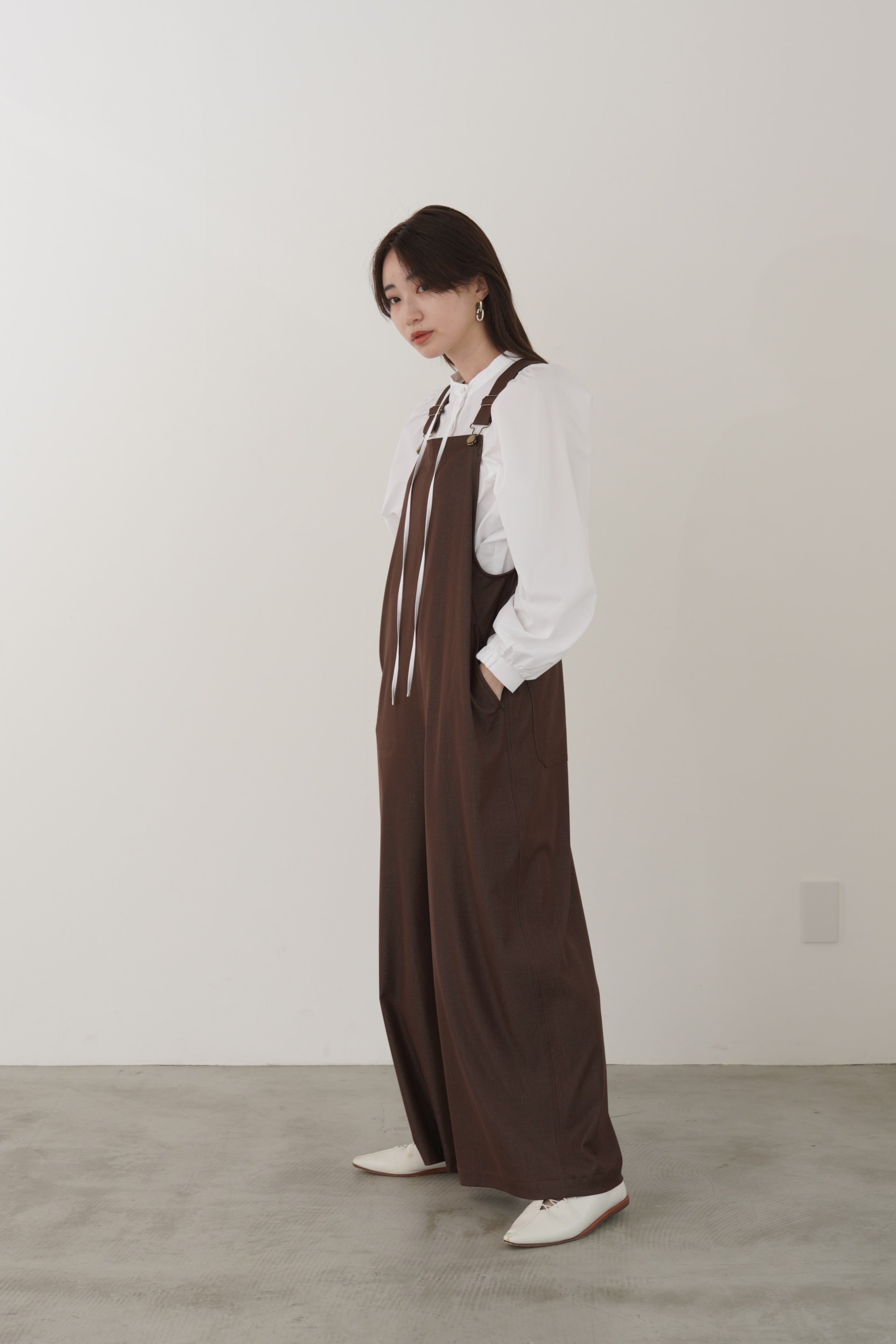 デニムライクで光沢のあるきれいめ素材を使用した大人の為のオーバーオールです。ワイドシルエットですが程よいとろみと落ち感があります。肩のストラップで着丈の調節が可能です。