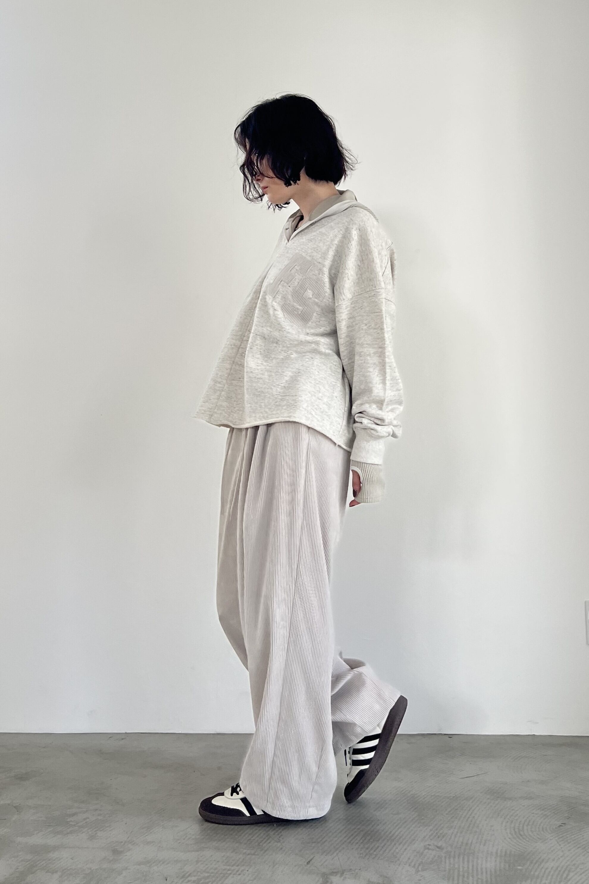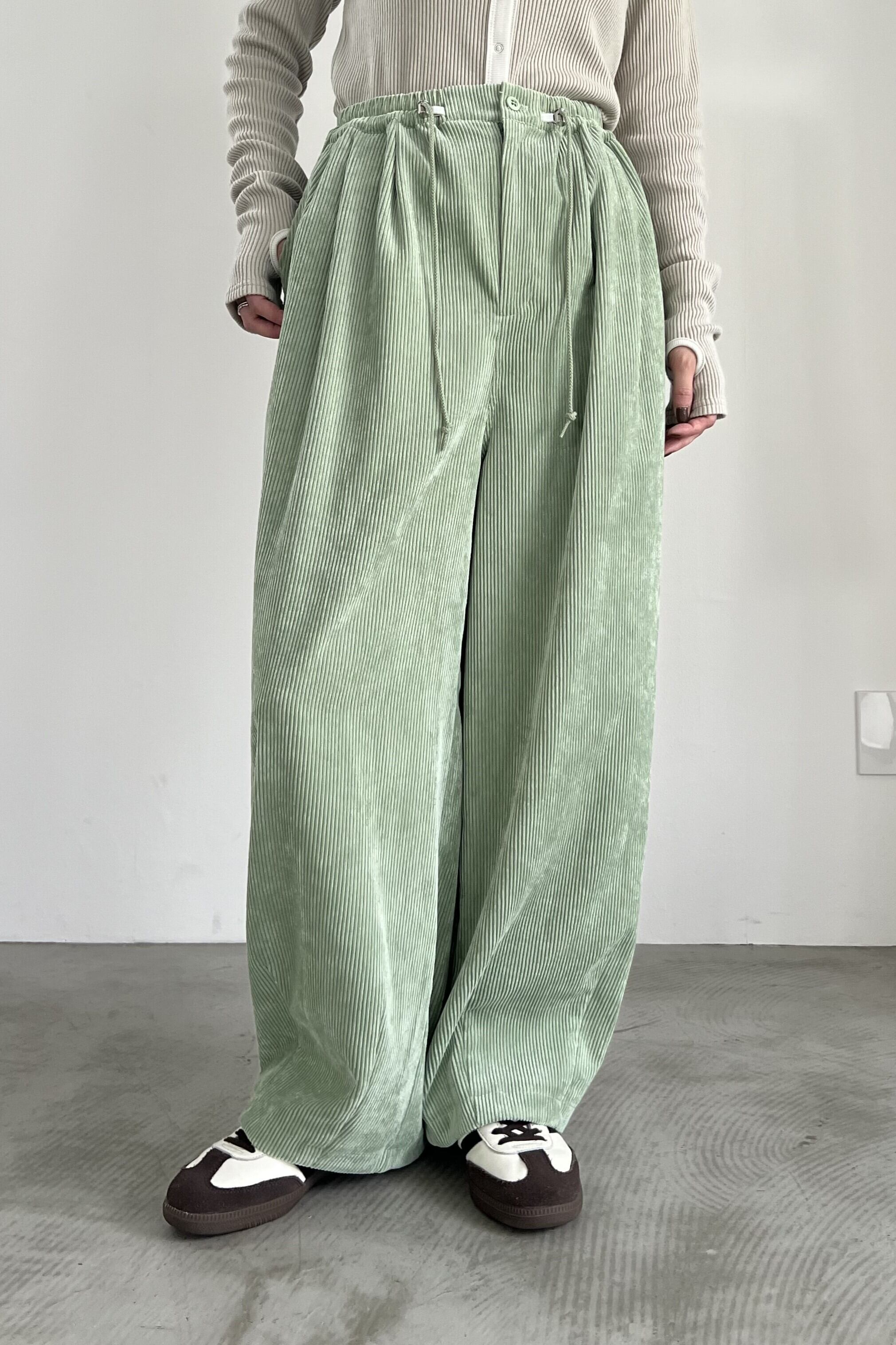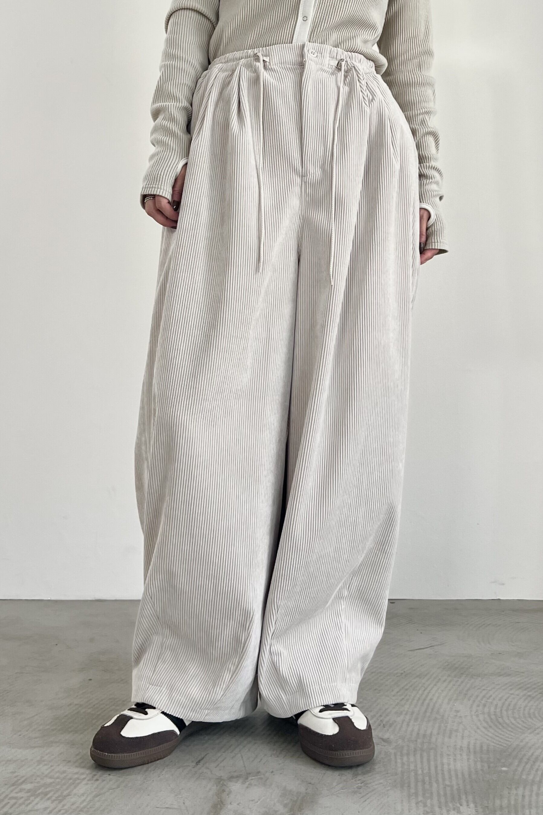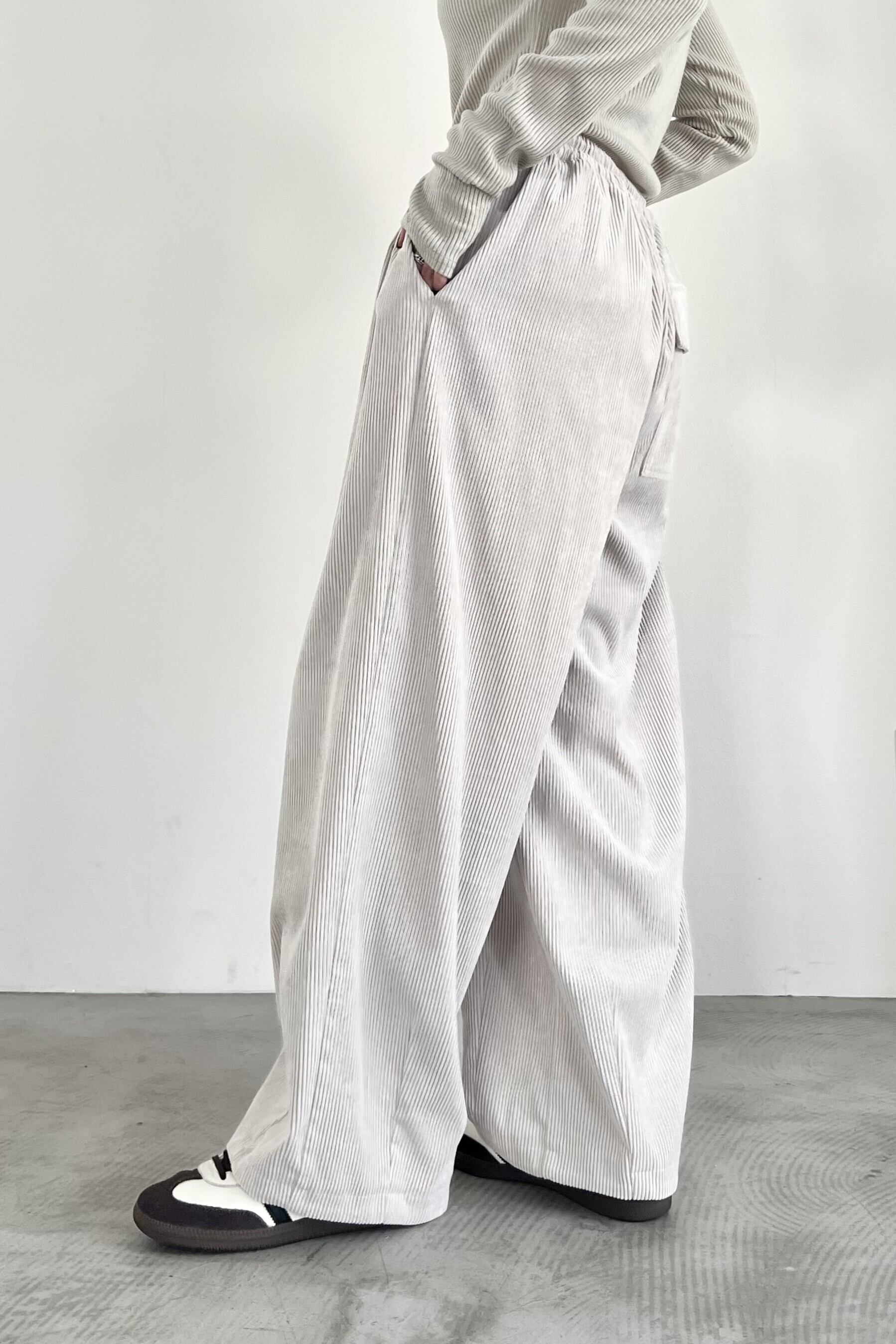 人気のボリュームパンツのコーデュロイバージョンが初登場。コーデュロイといえばシワになりやすい、起毛が潰れてテカリが気になる、などのデメリットがありますが、そのようなデメリットを改善したポリエステルの特殊なコーデュロイを使用しています。もちろんご家庭でのお洗濯はそのままなので、ノンストレスで着用していただけます。