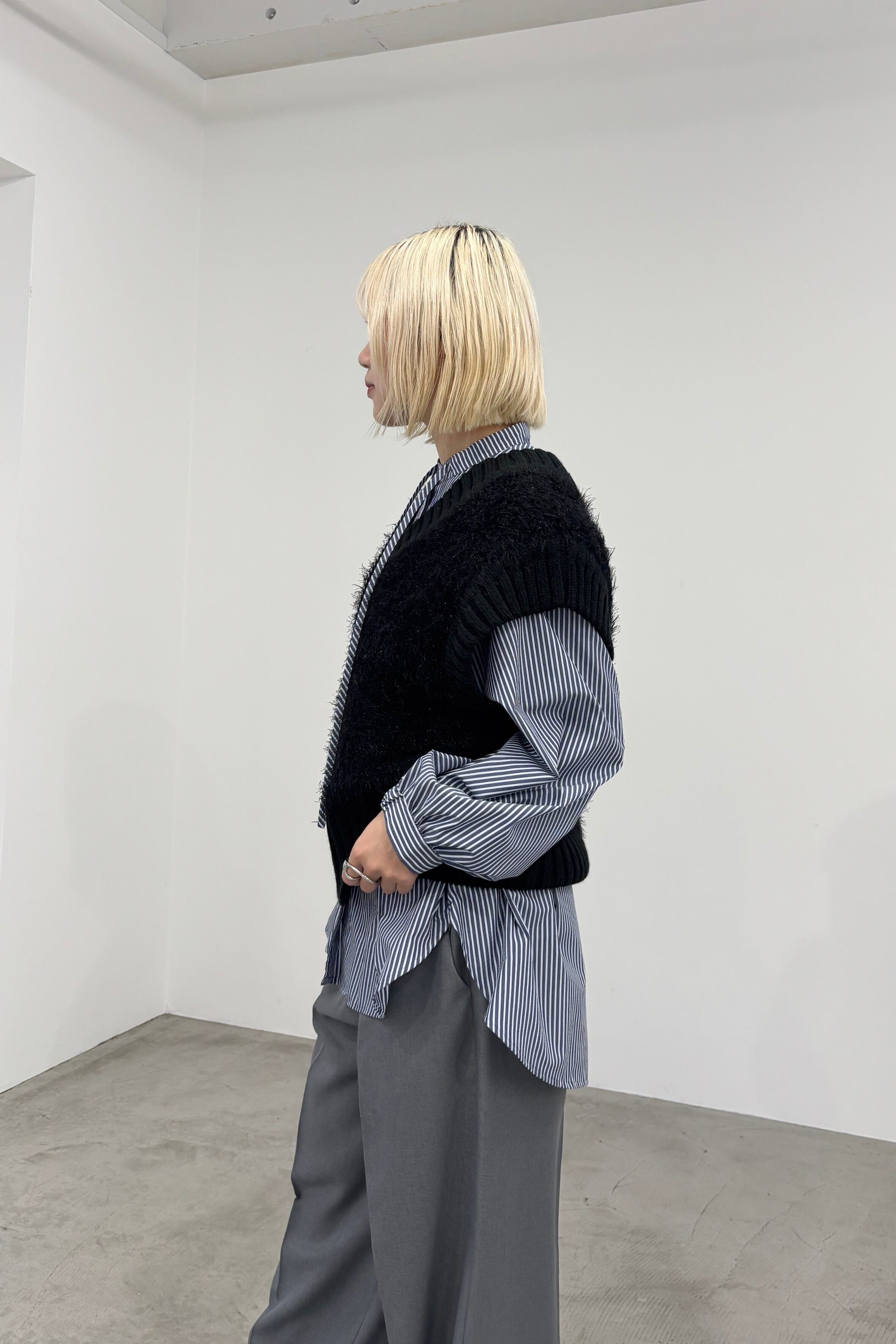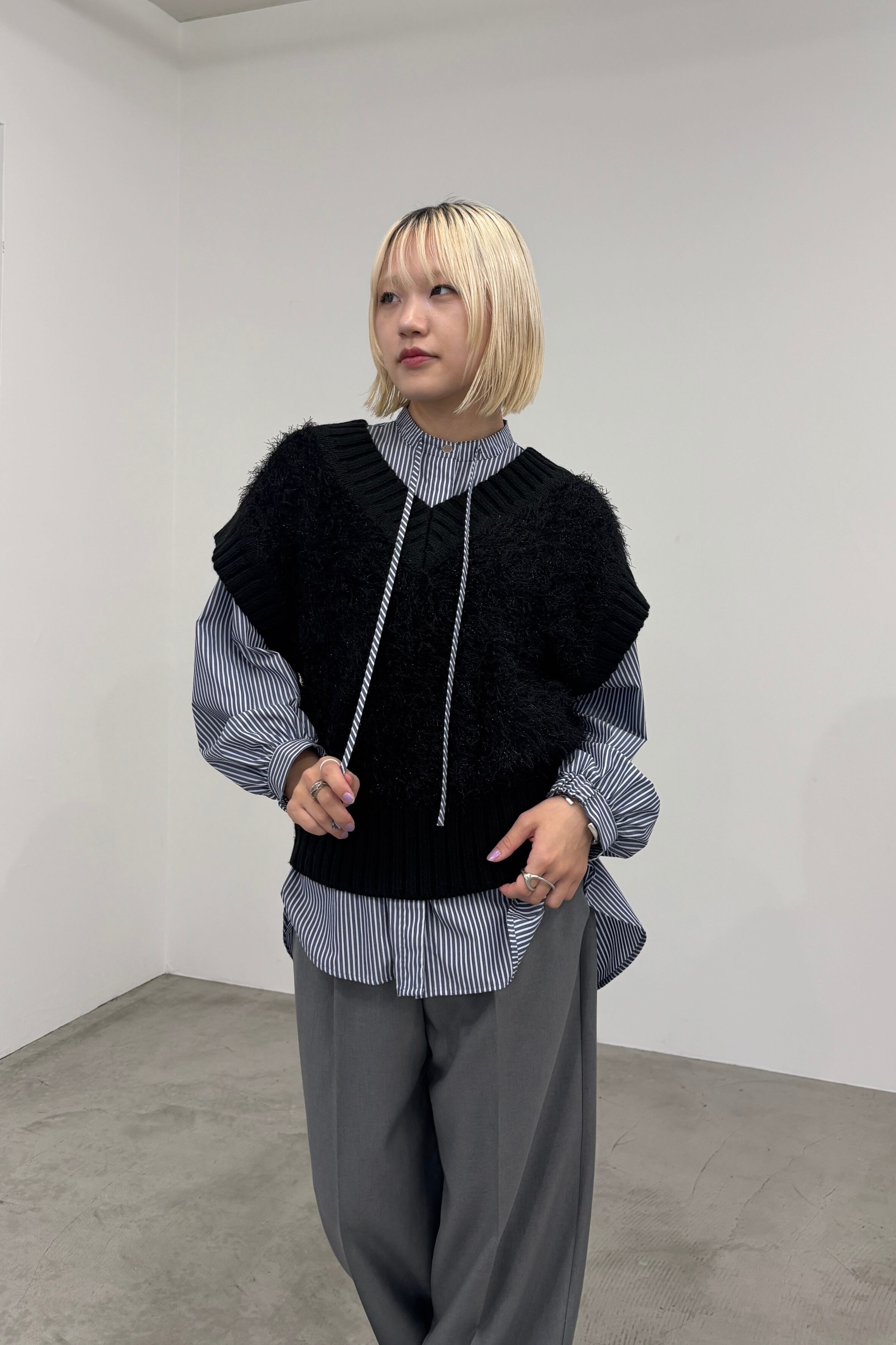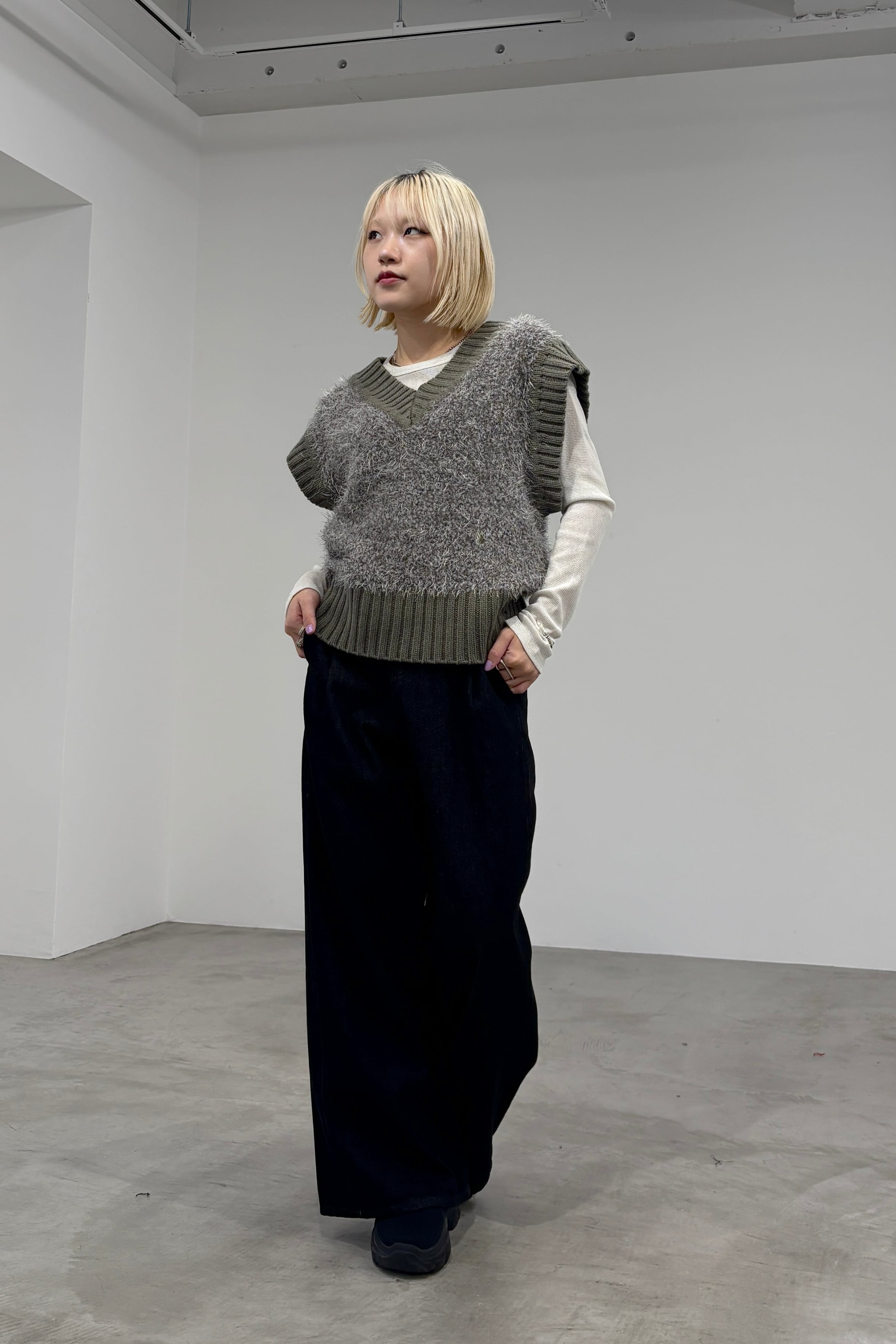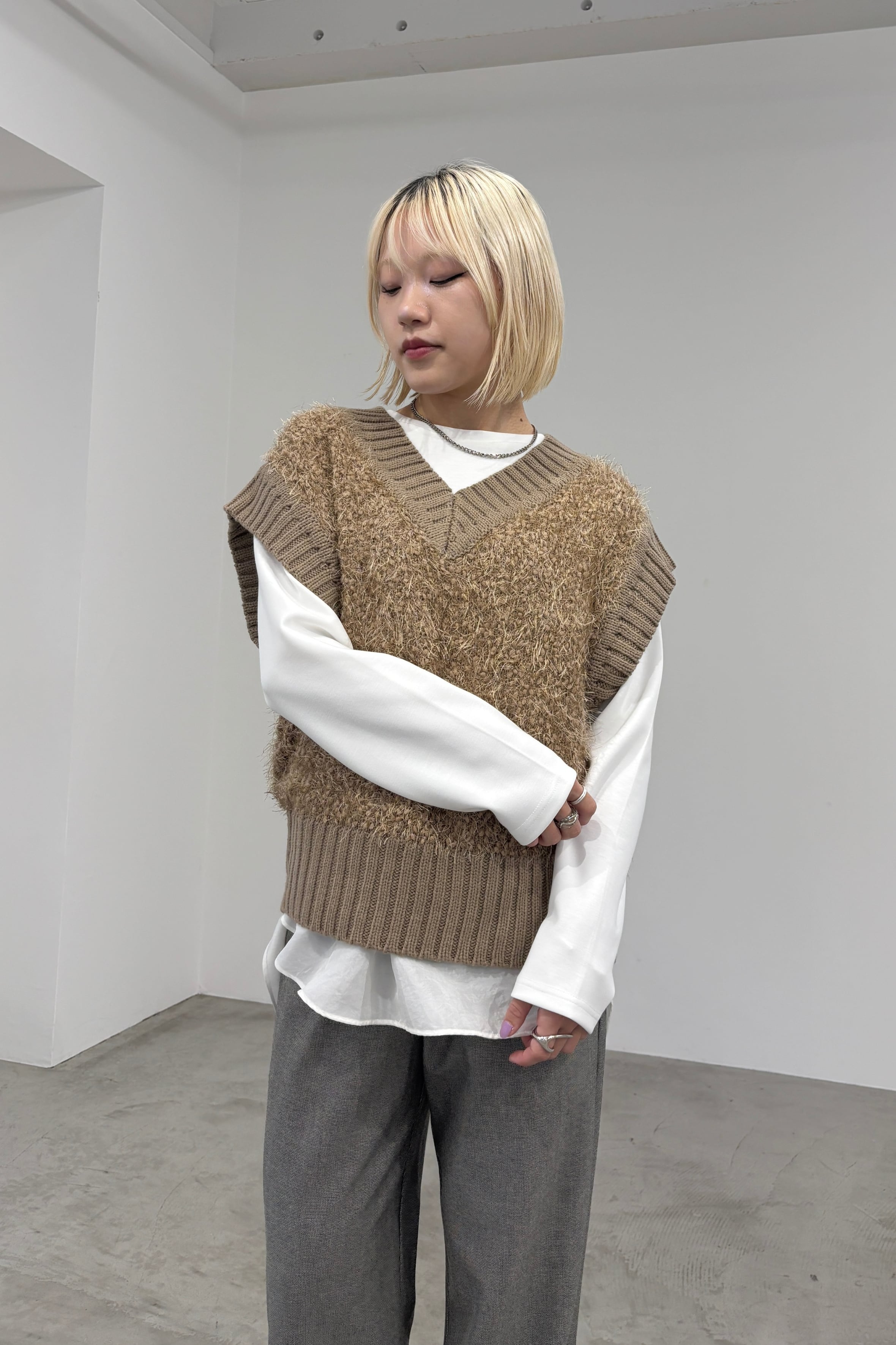 立体的なモール糸がインパクトのあるVネックニットベスト。控えめなラメが上品な印象を与えてくれます。コンパクトな着丈で、シャツレイヤードが楽しめる1枚です。