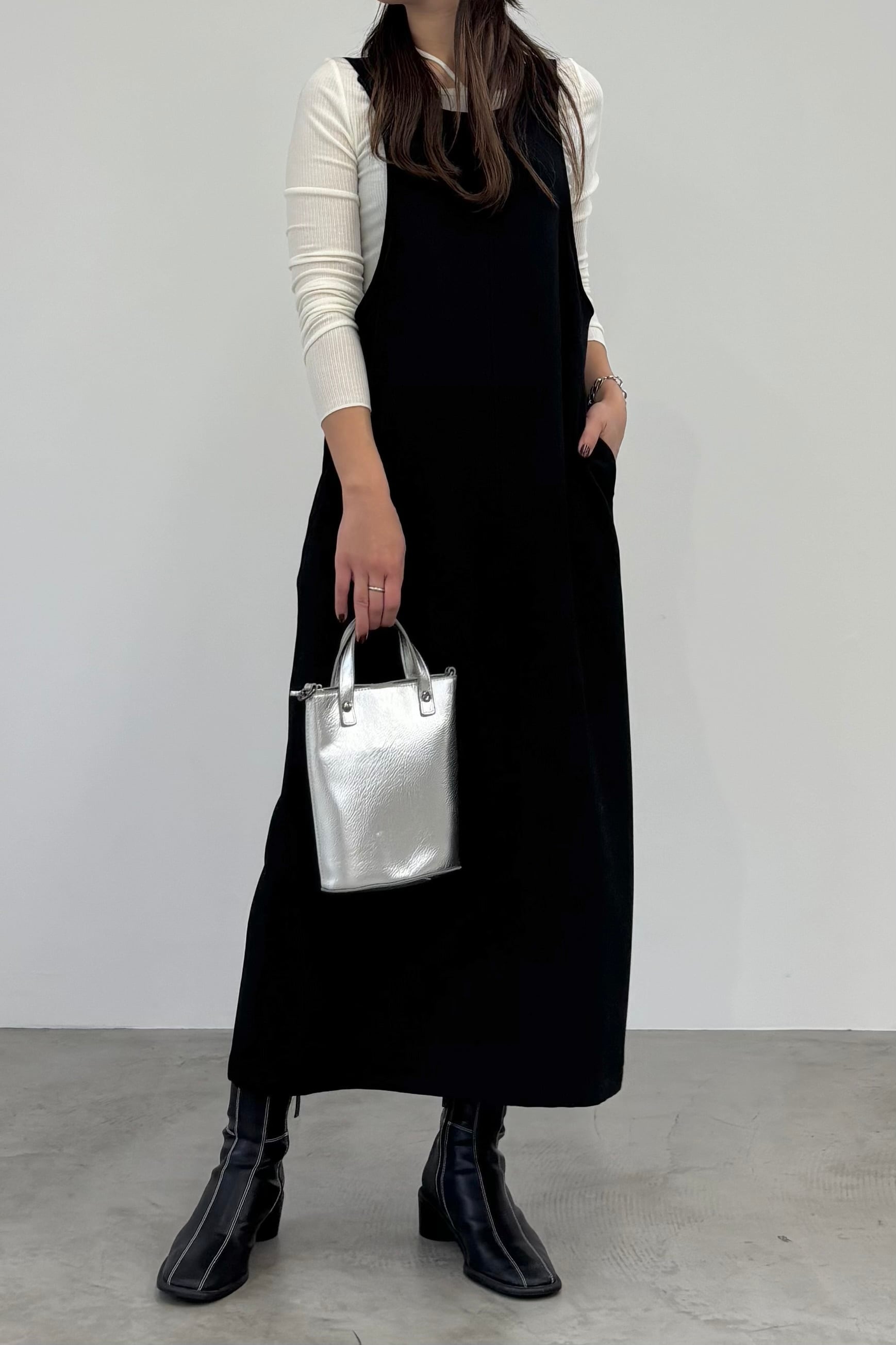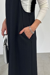 ストレッチの効いたウール調ツイード素材を使用した、ジャンパースカート。Iラインシルエットとアメリカンスリーブが華奢見えを叶えてくれます。異素材で切り替えたバックスタイルもポイント。肩紐で着丈の調節が可能です。