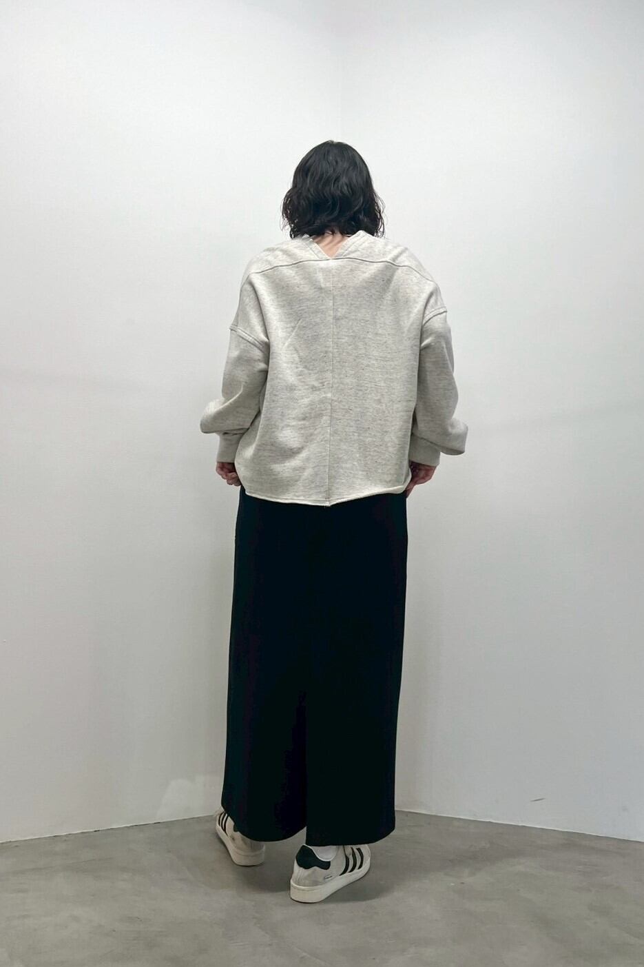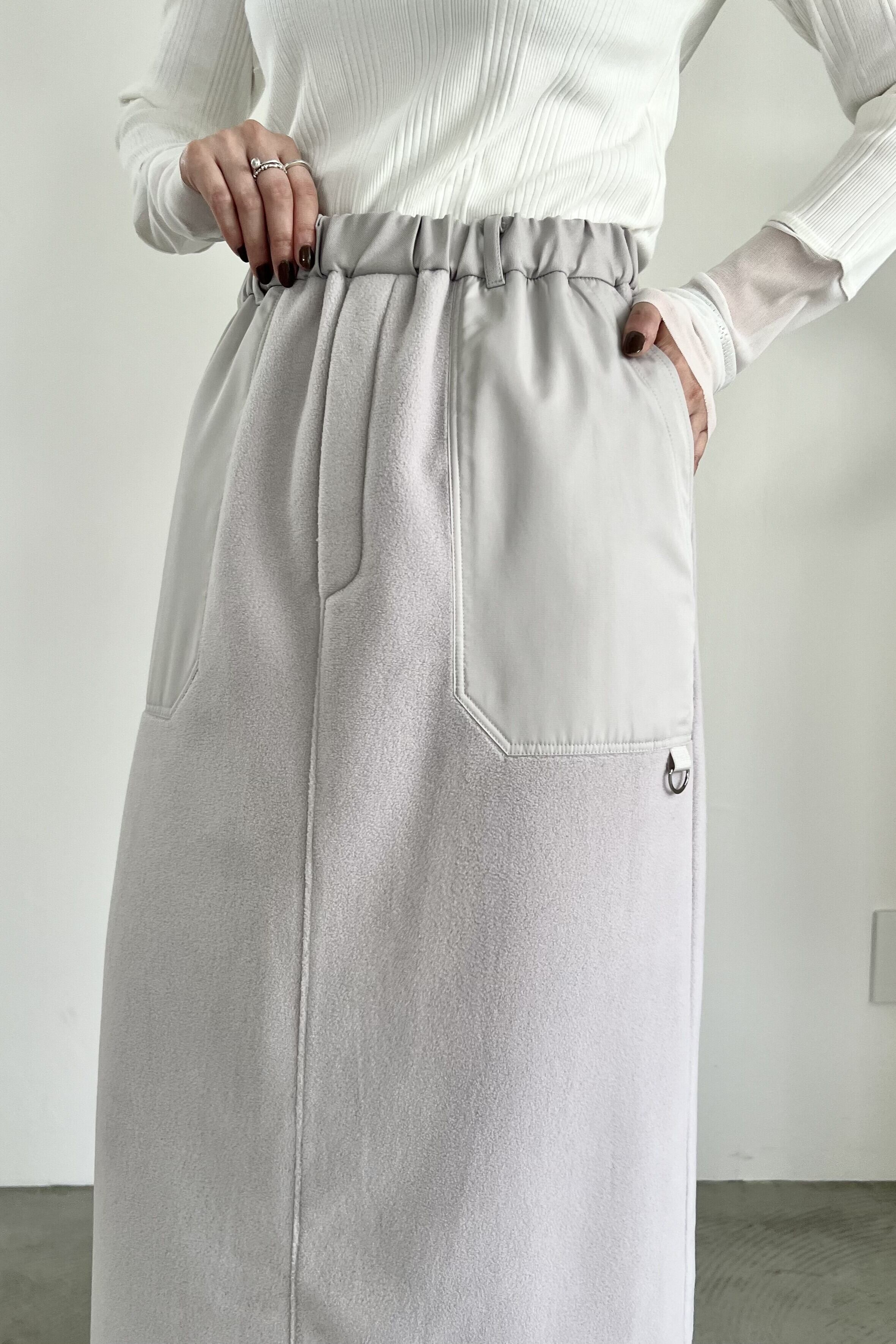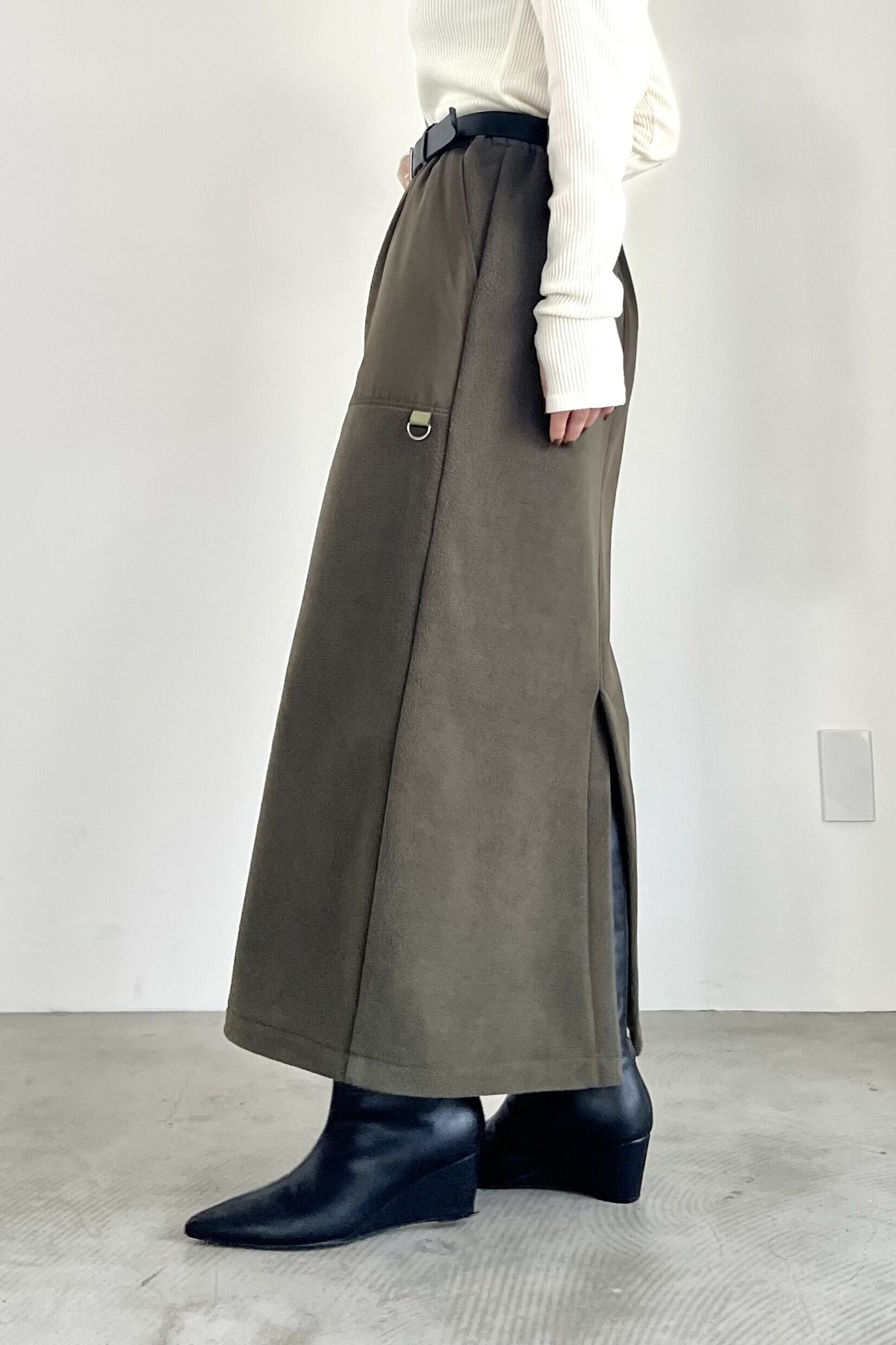 PETボトルから再生された"エコフリース"を使用したアウトドアな雰囲気のFOSI.らしいタイトスカート。ウエストは総ゴム仕様ですが、ベルトループ付きなのでお手持ちのベルトと合わせていただくと、よりタウンユースに着用していただけます。同素材のカーディガンとのセットアップもおすすめです。