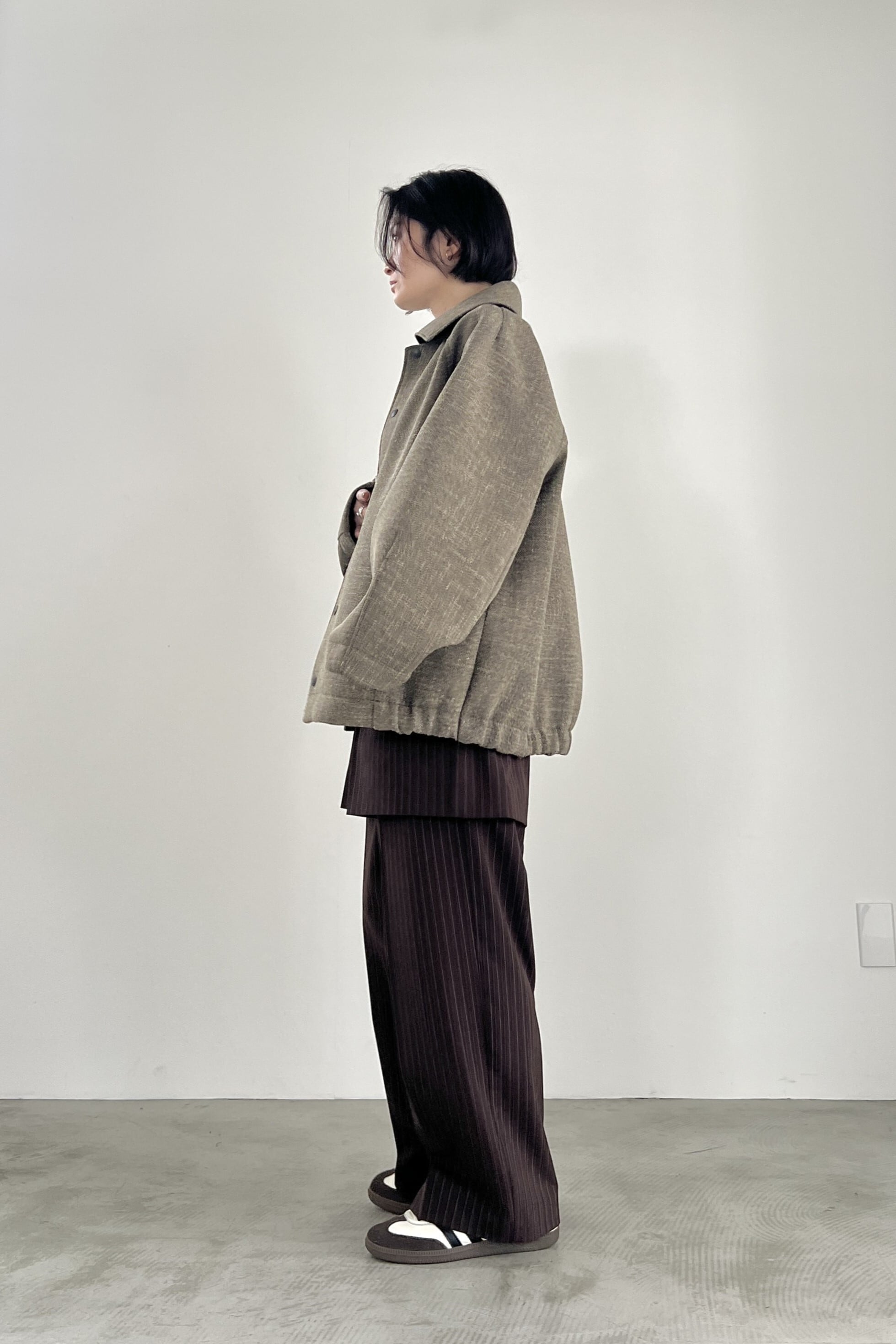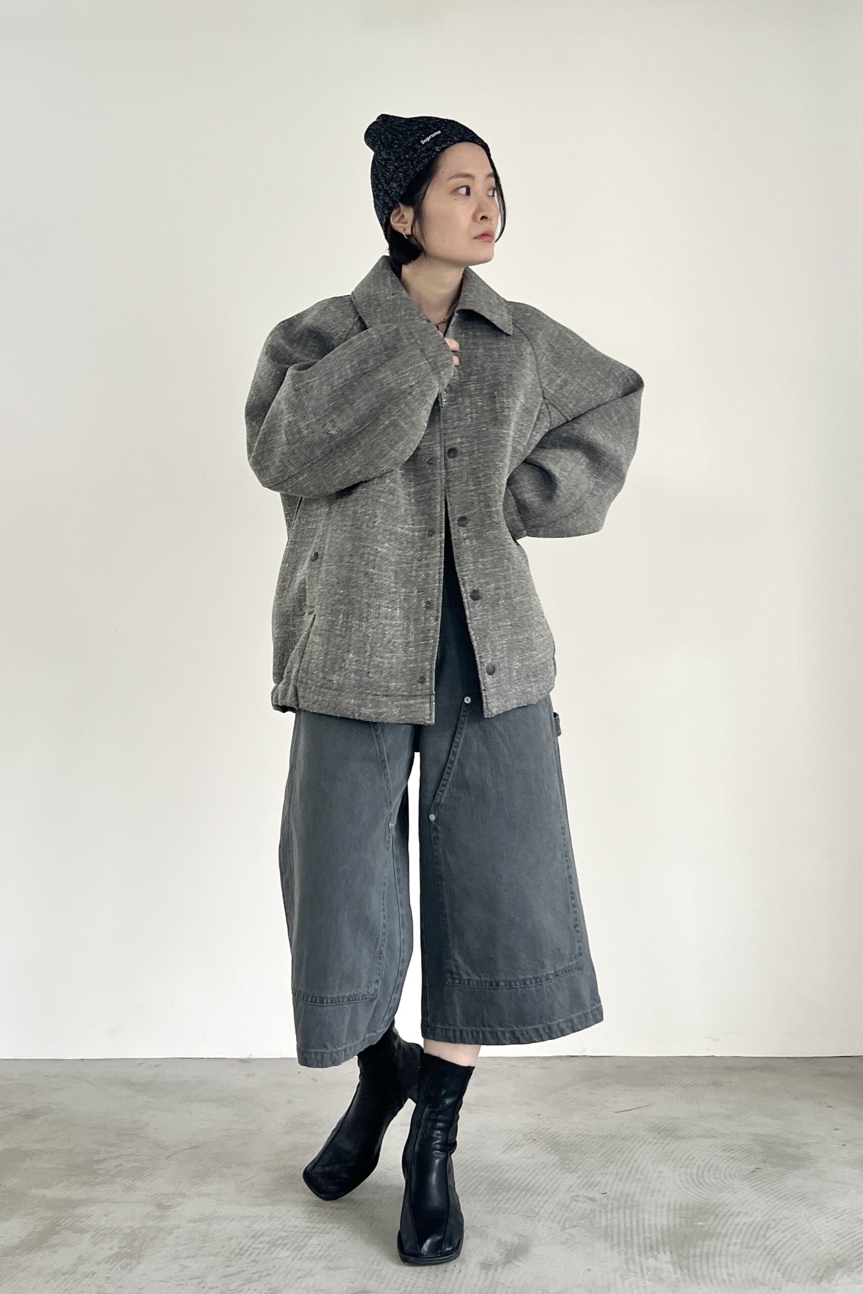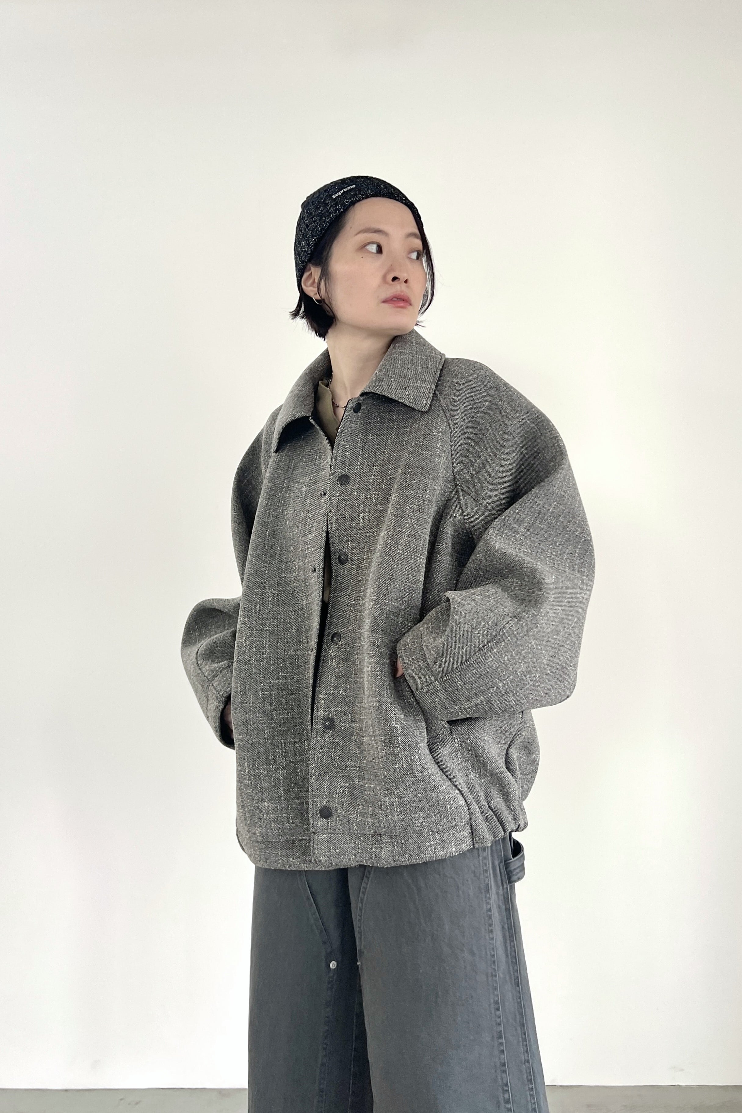 表面にツイード、裏面にポリエステル天竺を使用したスポンジーなボンディング素材を使用したコーチジャケット。ボリュームがありながらも軽さがあり、インナーが着込みやすいユニセックス対応のサイズ感に仕上げています。綺麗めなイメージのあるツイードをカジュアルな形に落とし込むことでオンオフ限らず着用していただけます。