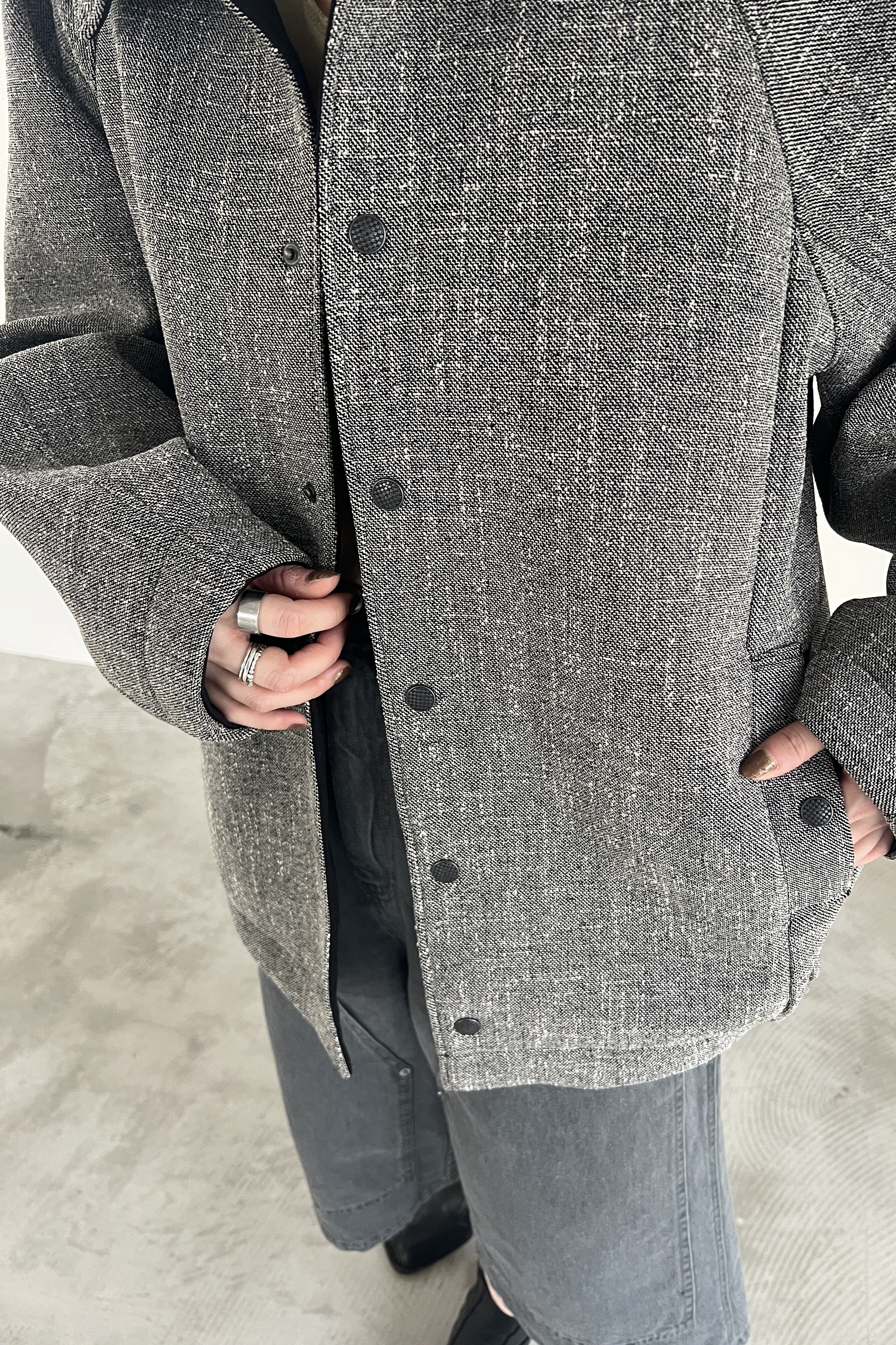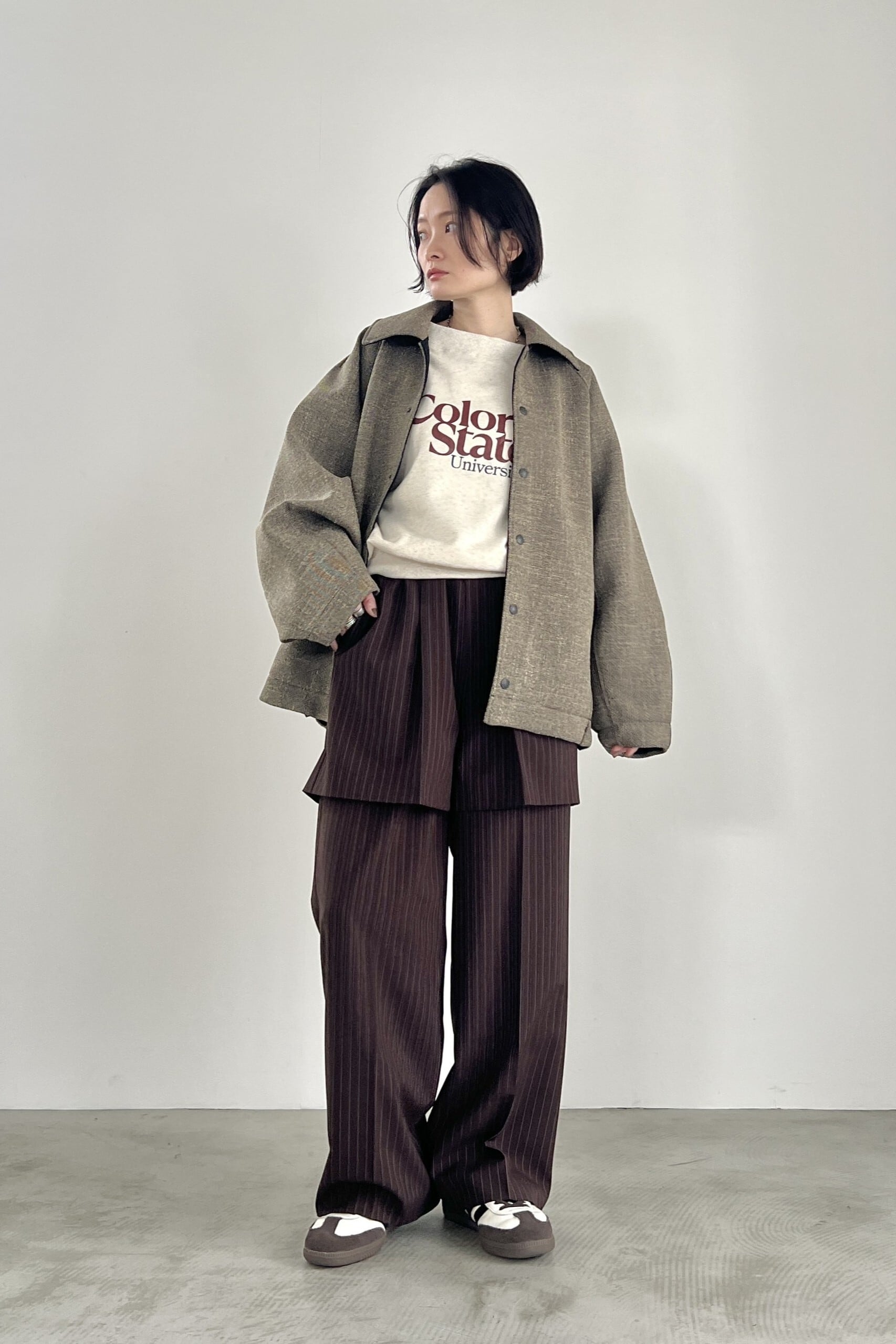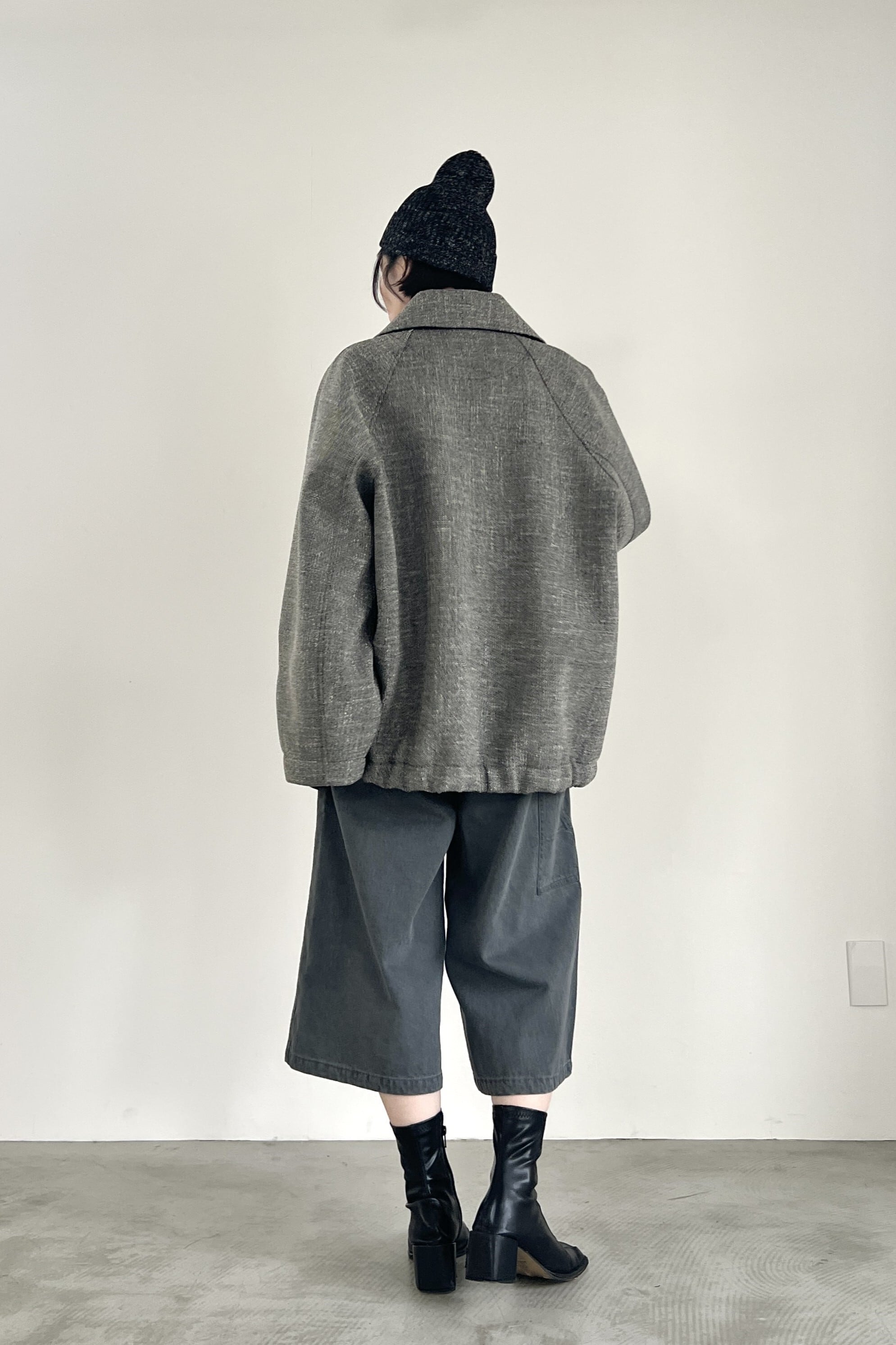 表面にツイード、裏面にポリエステル天竺を使用したスポンジーなボンディング素材を使用したコーチジャケット。ボリュームがありながらも軽さがあり、インナーが着込みやすいユニセックス対応のサイズ感に仕上げています。綺麗めなイメージのあるツイードをカジュアルな形に落とし込むことでオンオフ限らず着用していただけます。