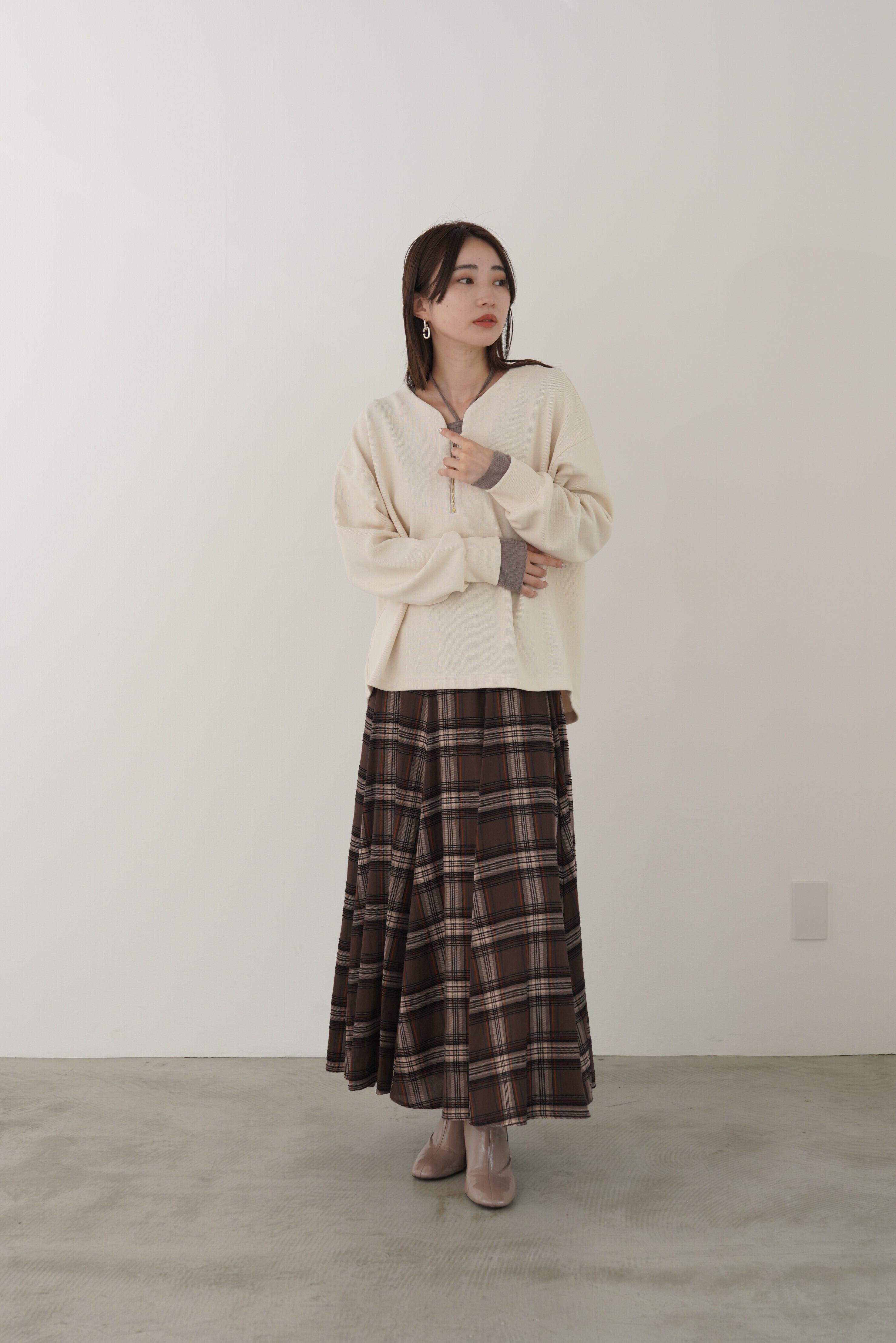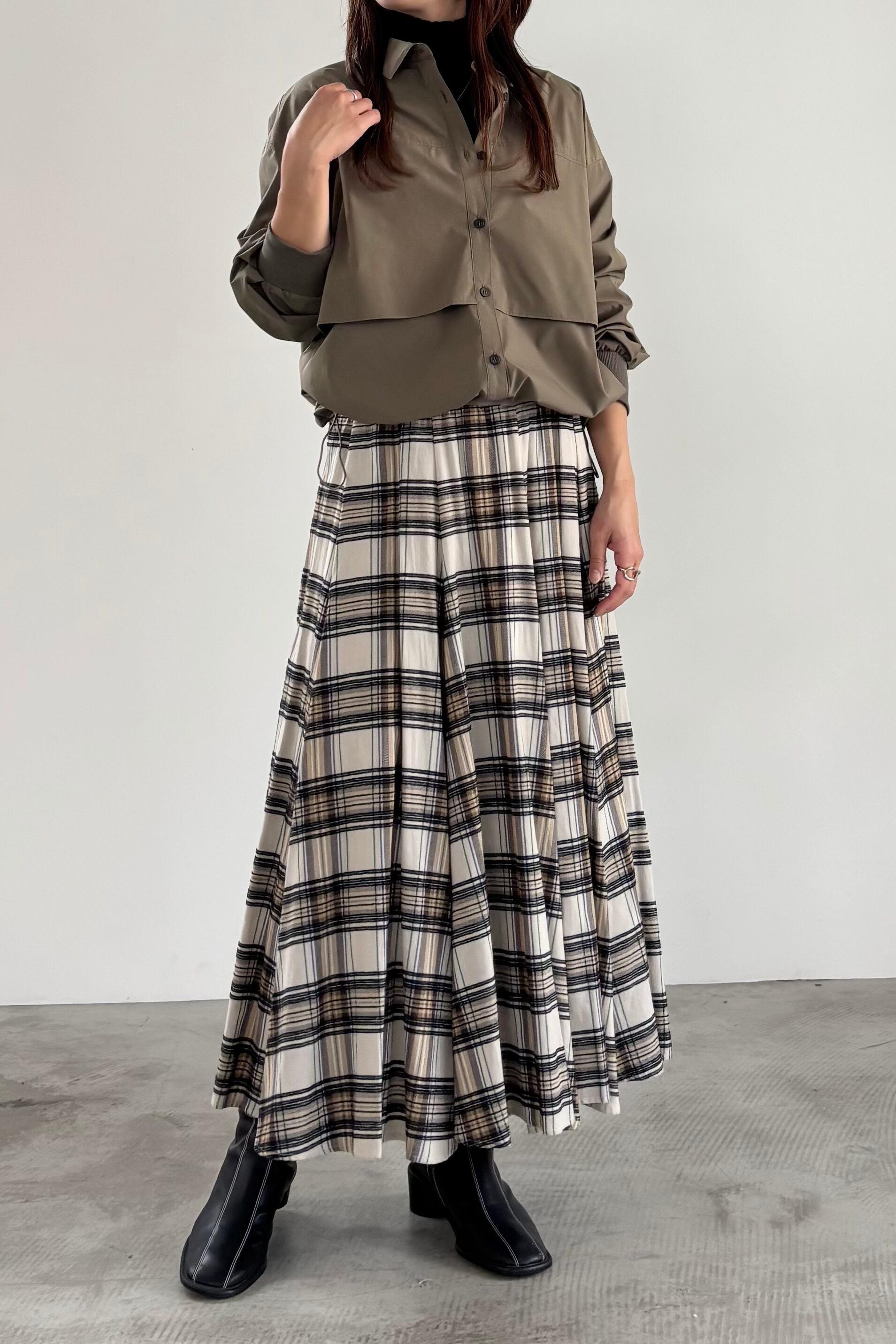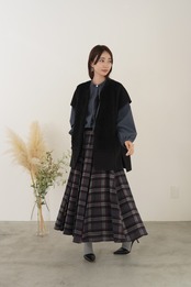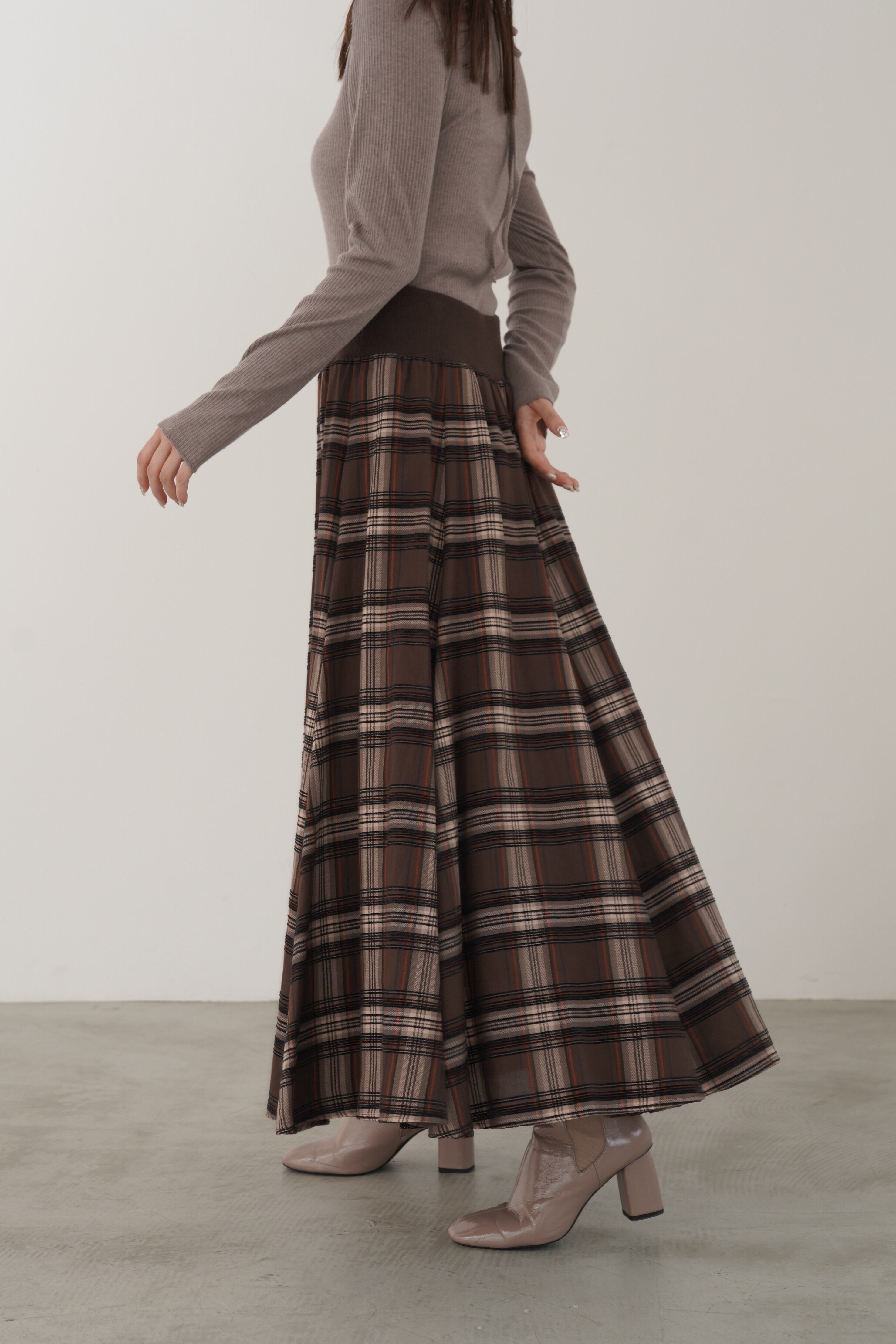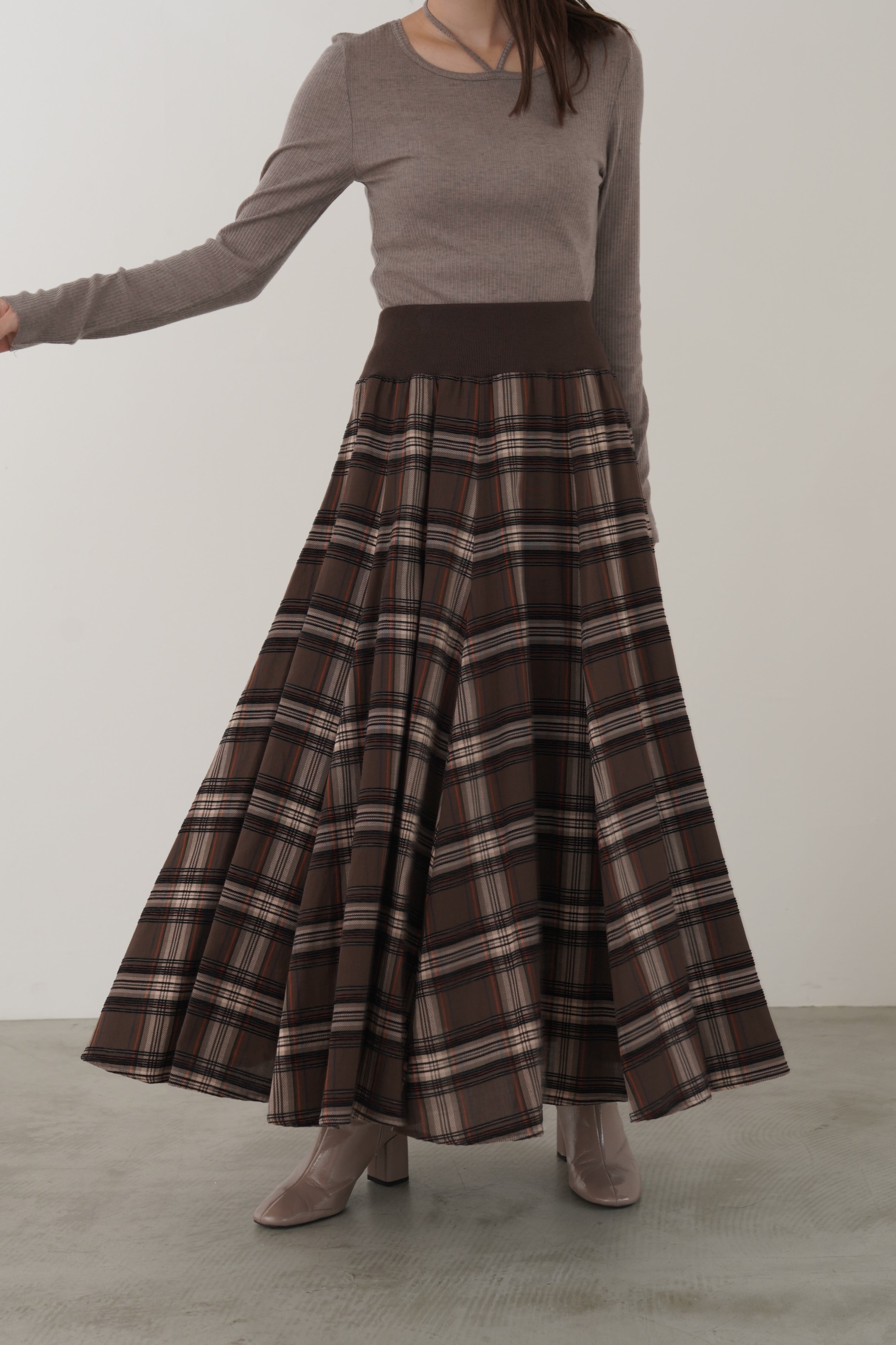 定番人気のモールチェックウエストリブスカート。8枚の布を剥ぐことで、腰回りはすっきりさせながらきれいなフレアシルエットを構築しています。リブを折り返すことで着丈の調節が可能です。
