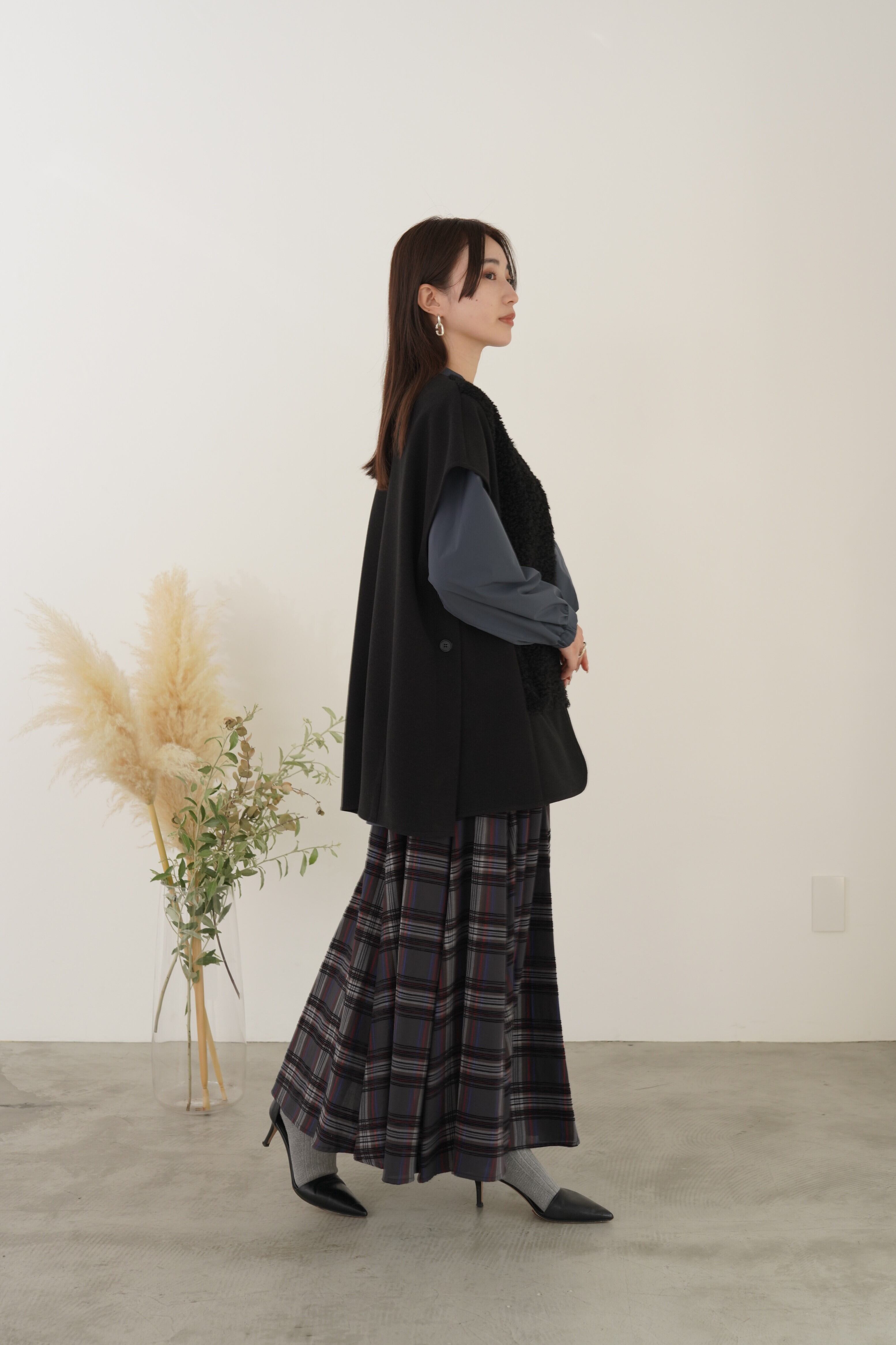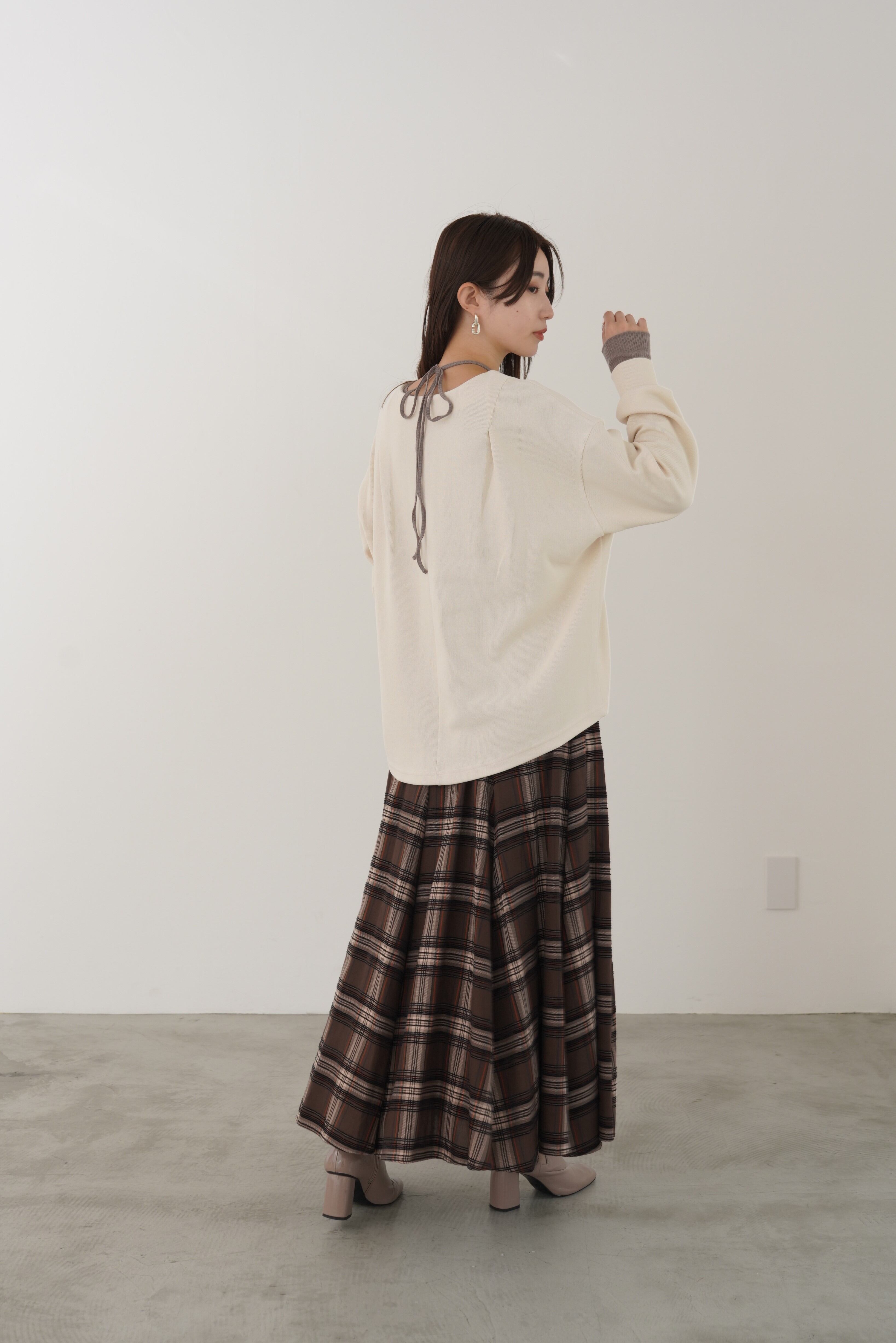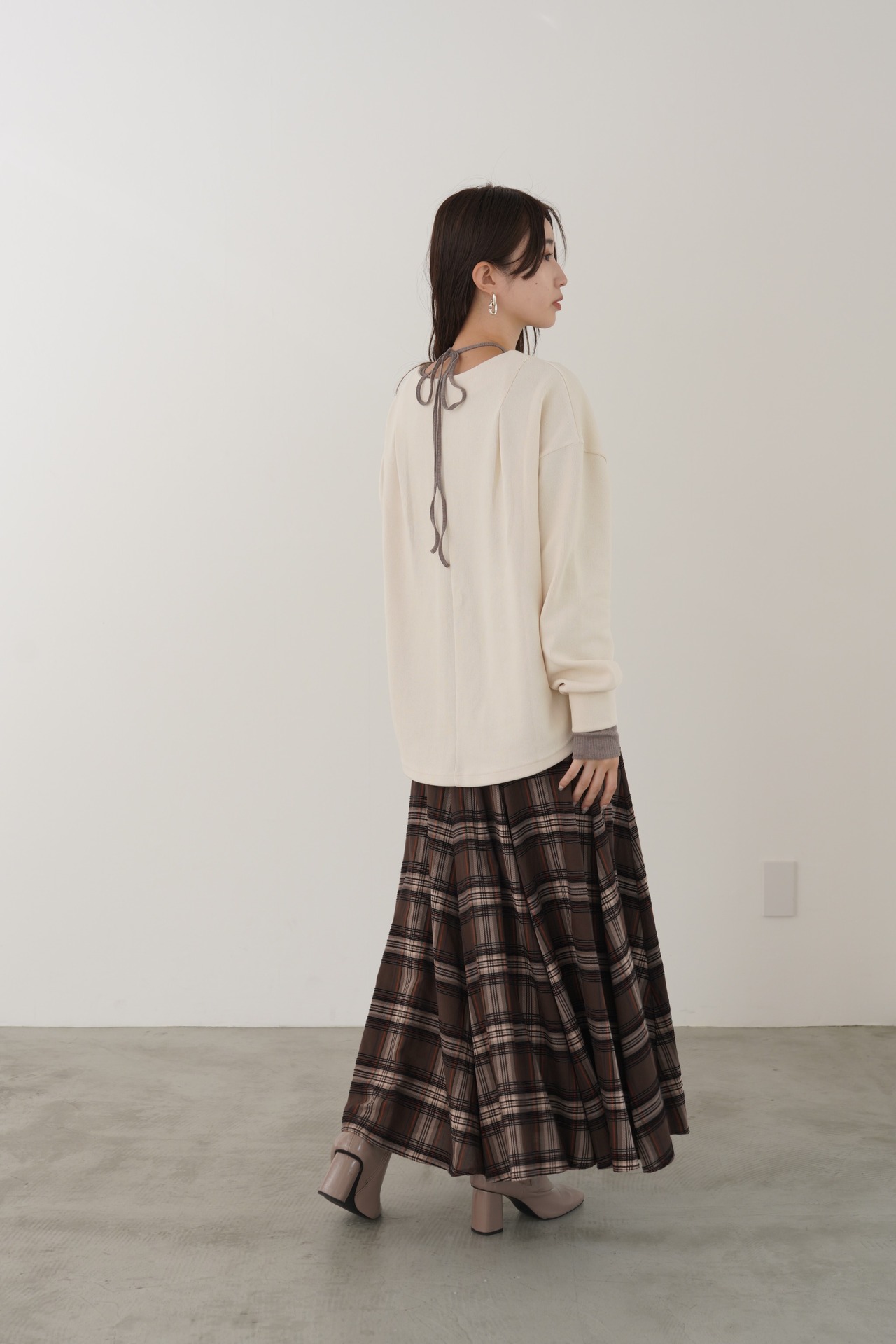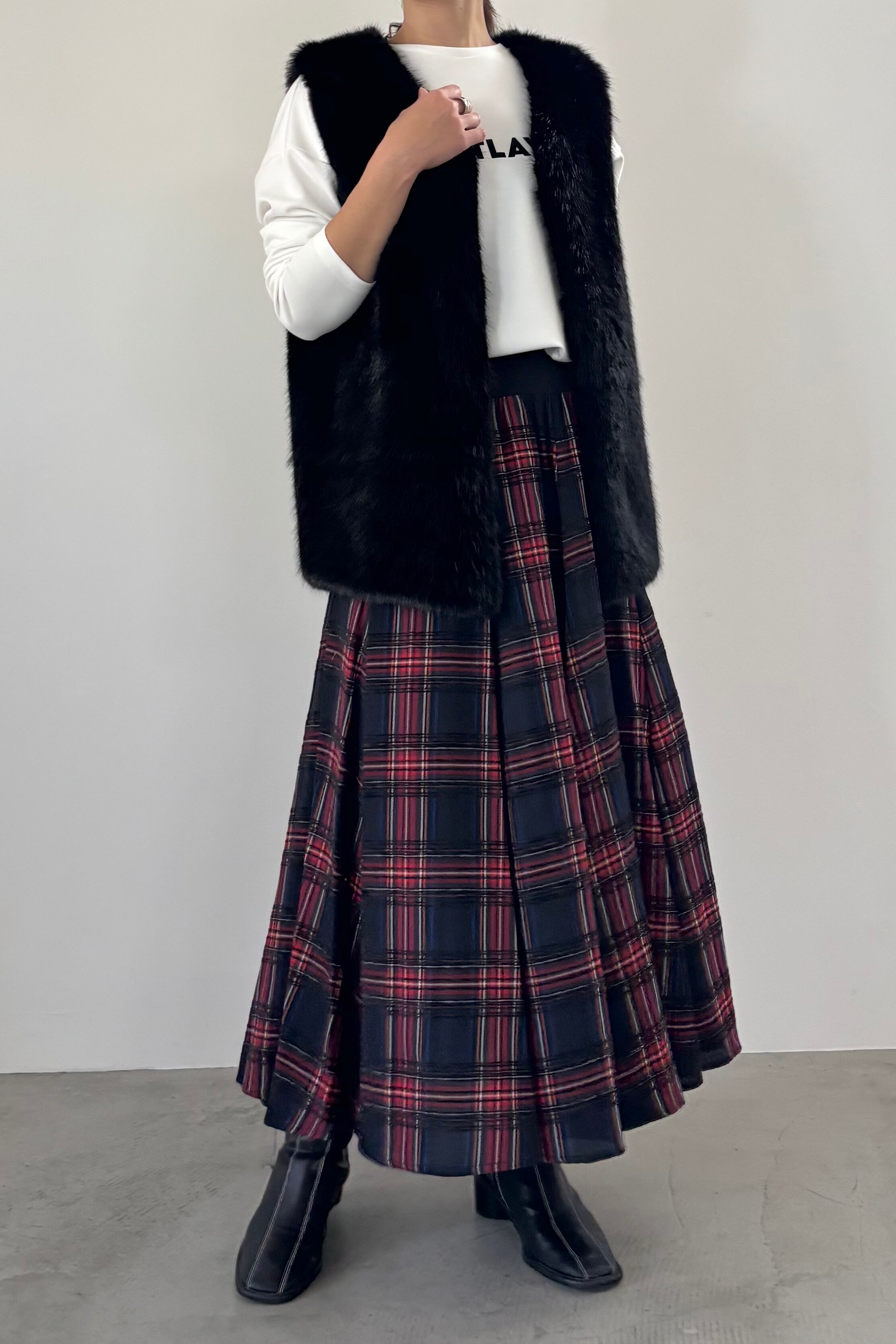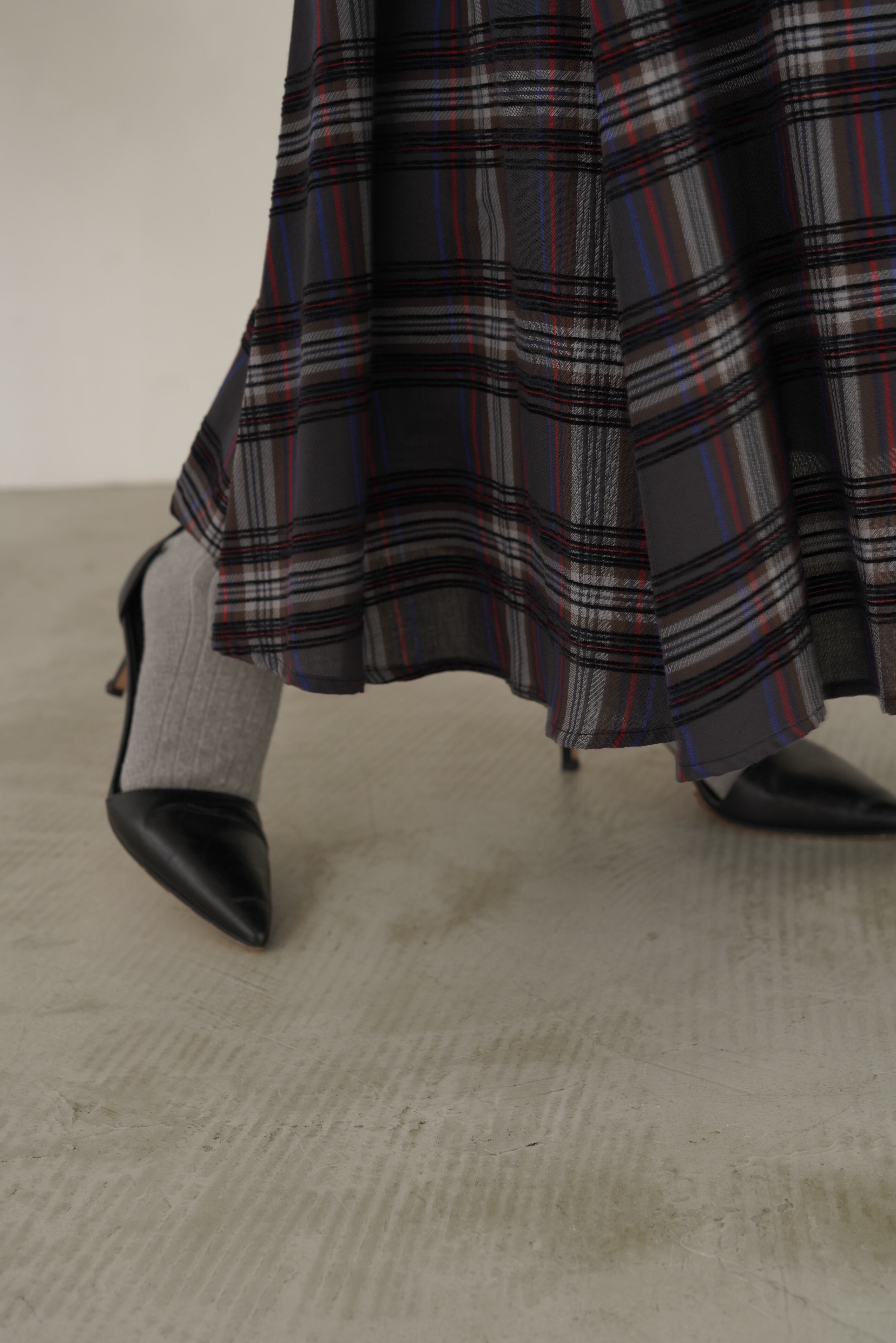 定番人気のモールチェックウエストリブスカート。8枚の布を剥ぐことで、腰回りはすっきりさせながらきれいなフレアシルエットを構築しています。リブを折り返すことで着丈の調節が可能です。