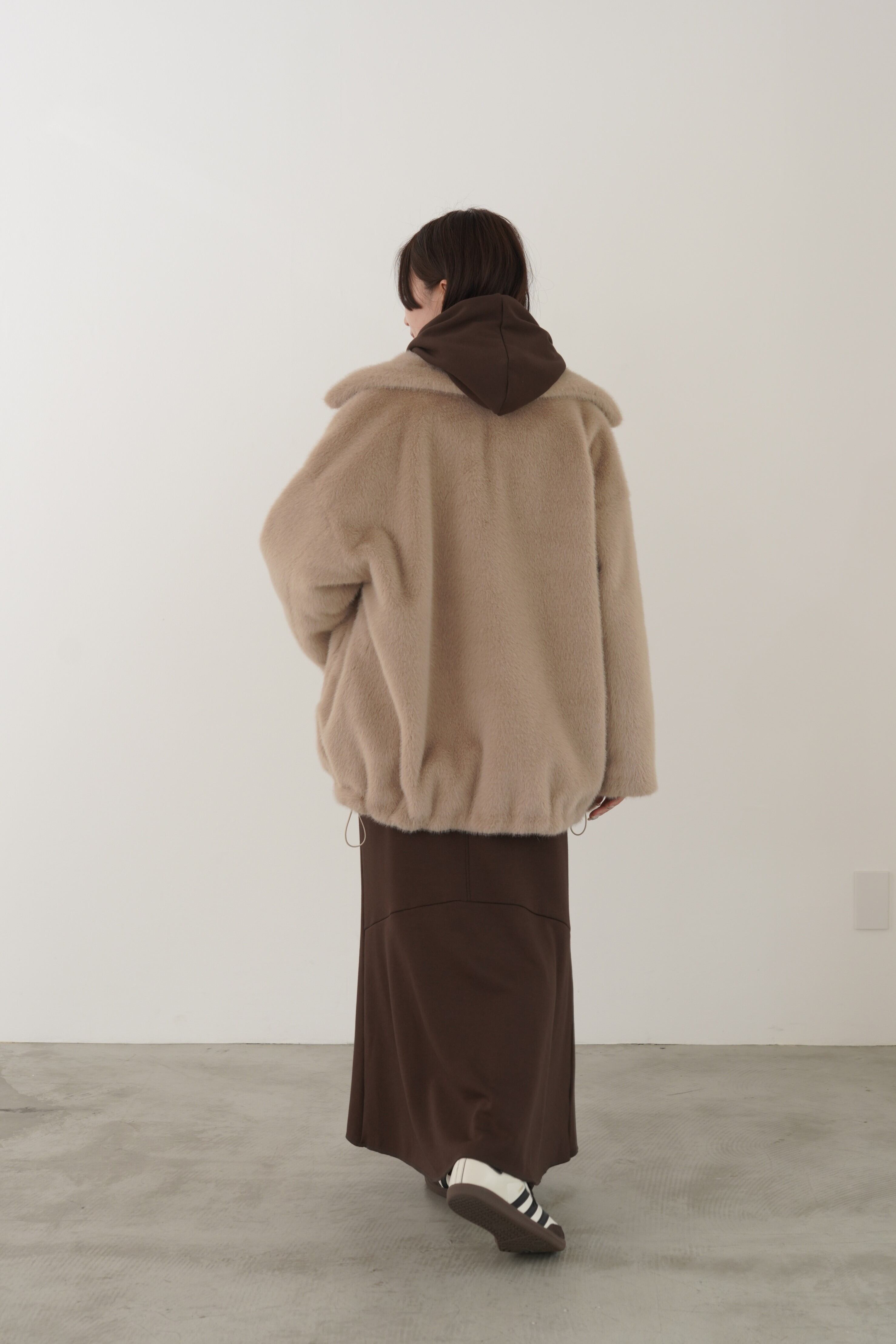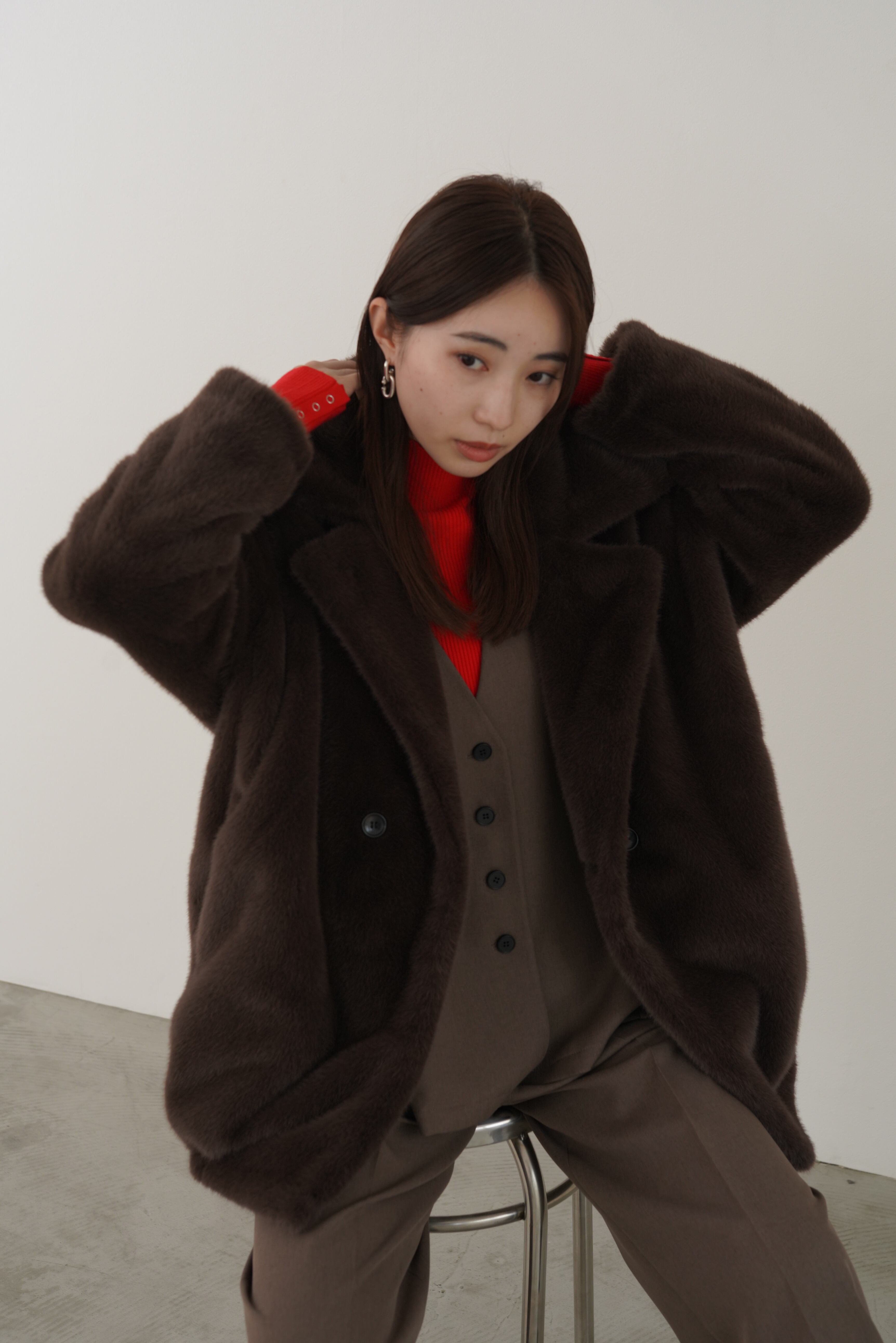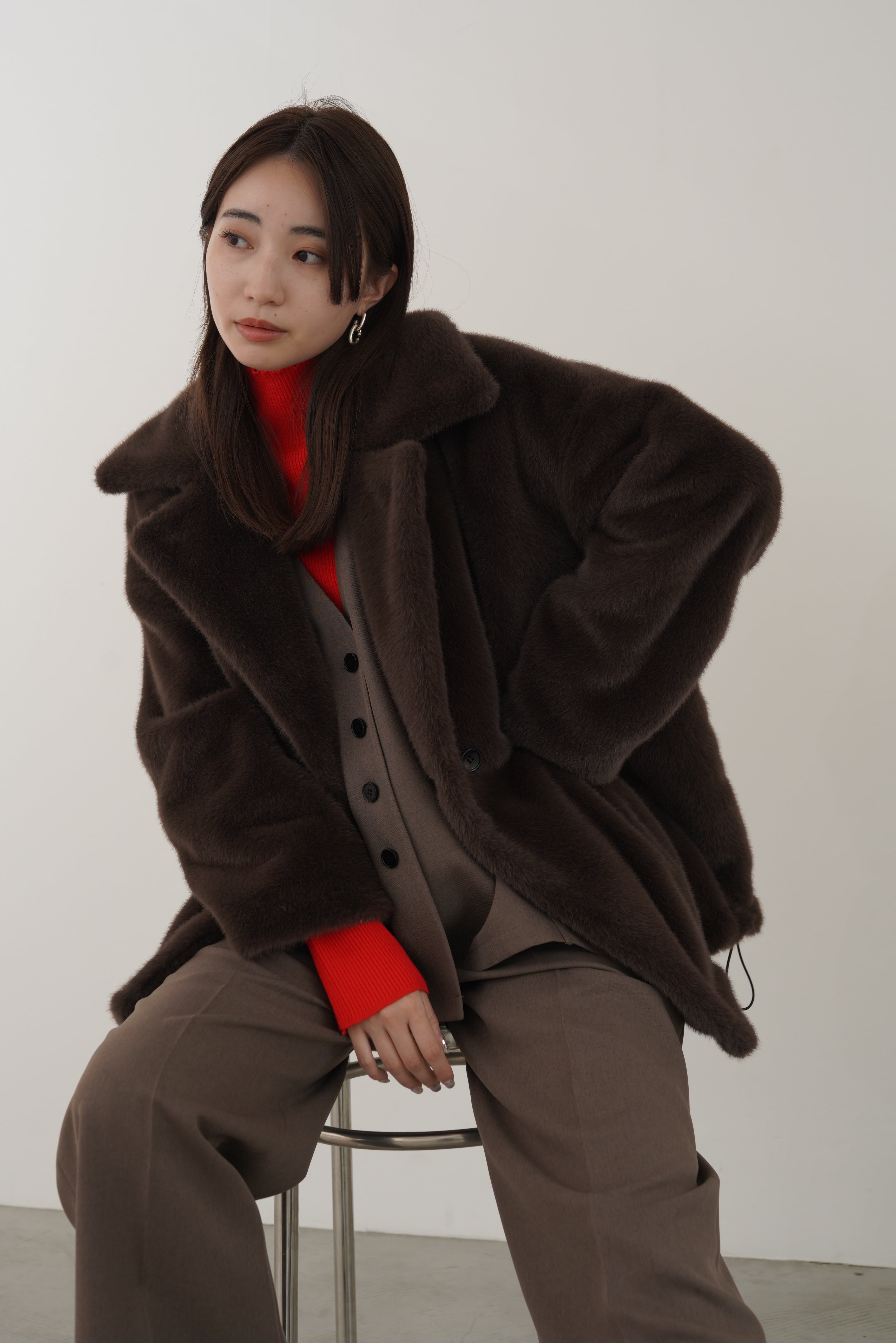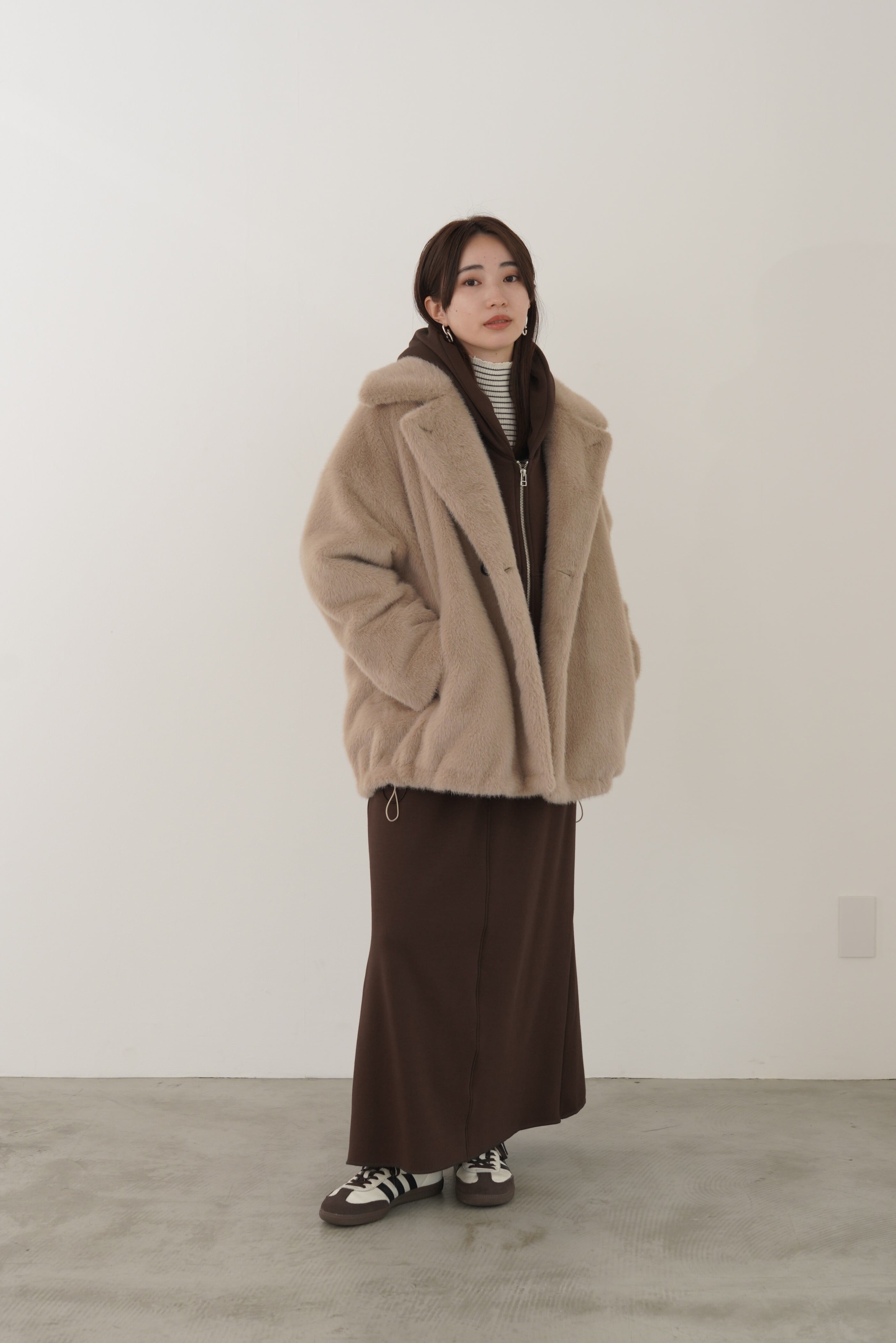 柔らかい肌触りで上質なエコファーを使用した、大きめの襟が印象的なジャケット。総裏付きですが、見た目の反して軽い仕上がりで、程よくゆとりのあるサイズ、ボトムとのバランスが取りやすいミドルレングス。デイリーに活躍するジャケットです。