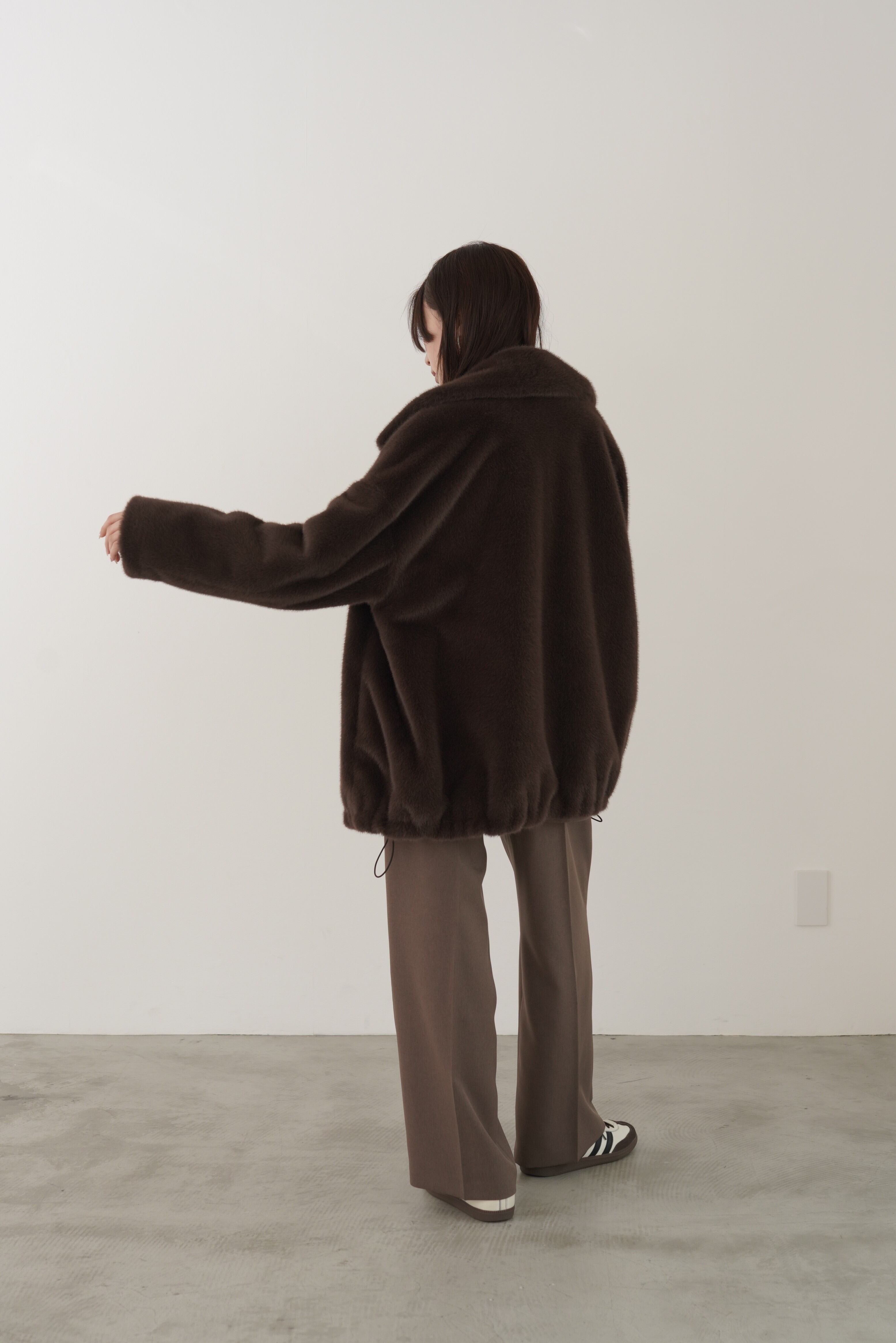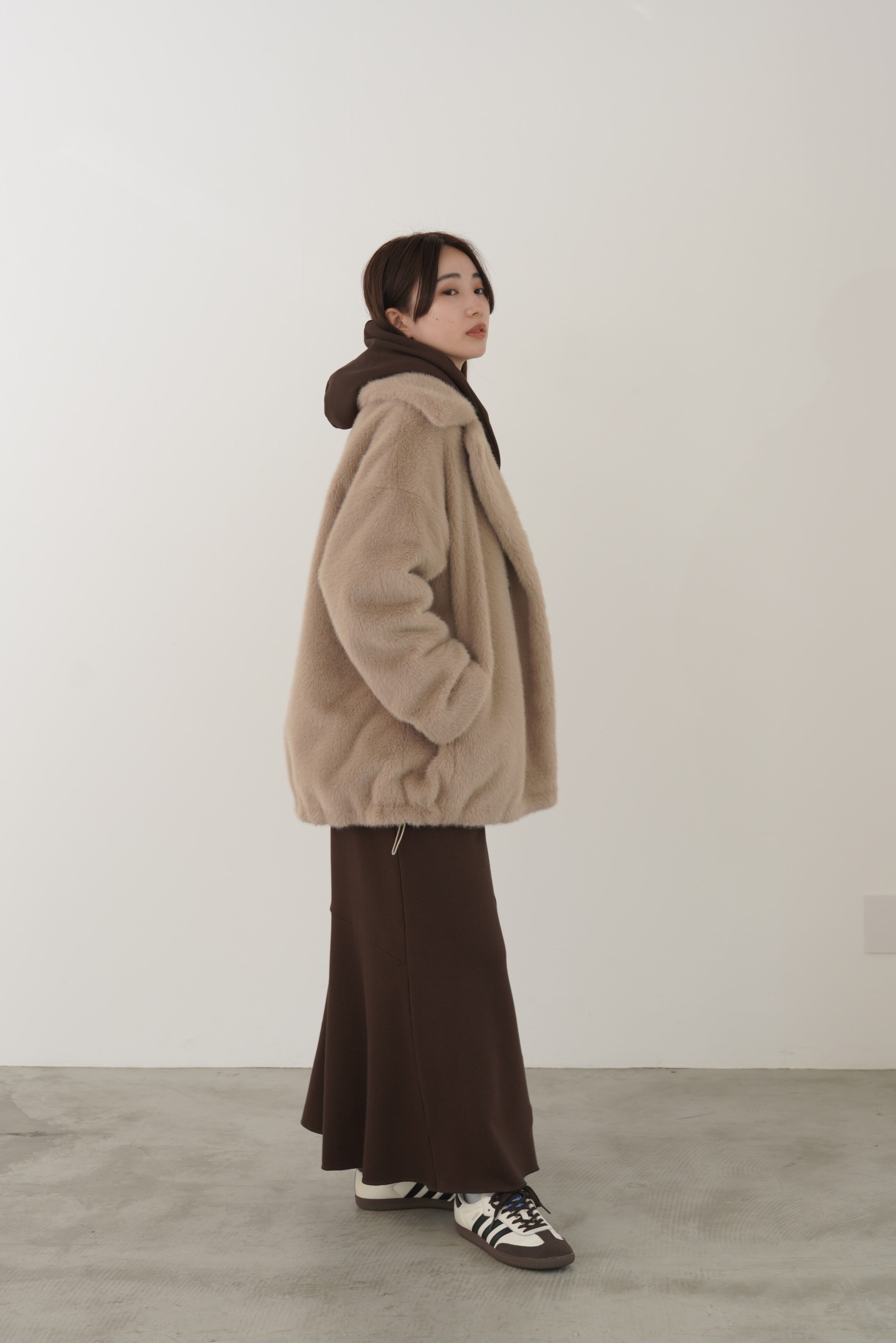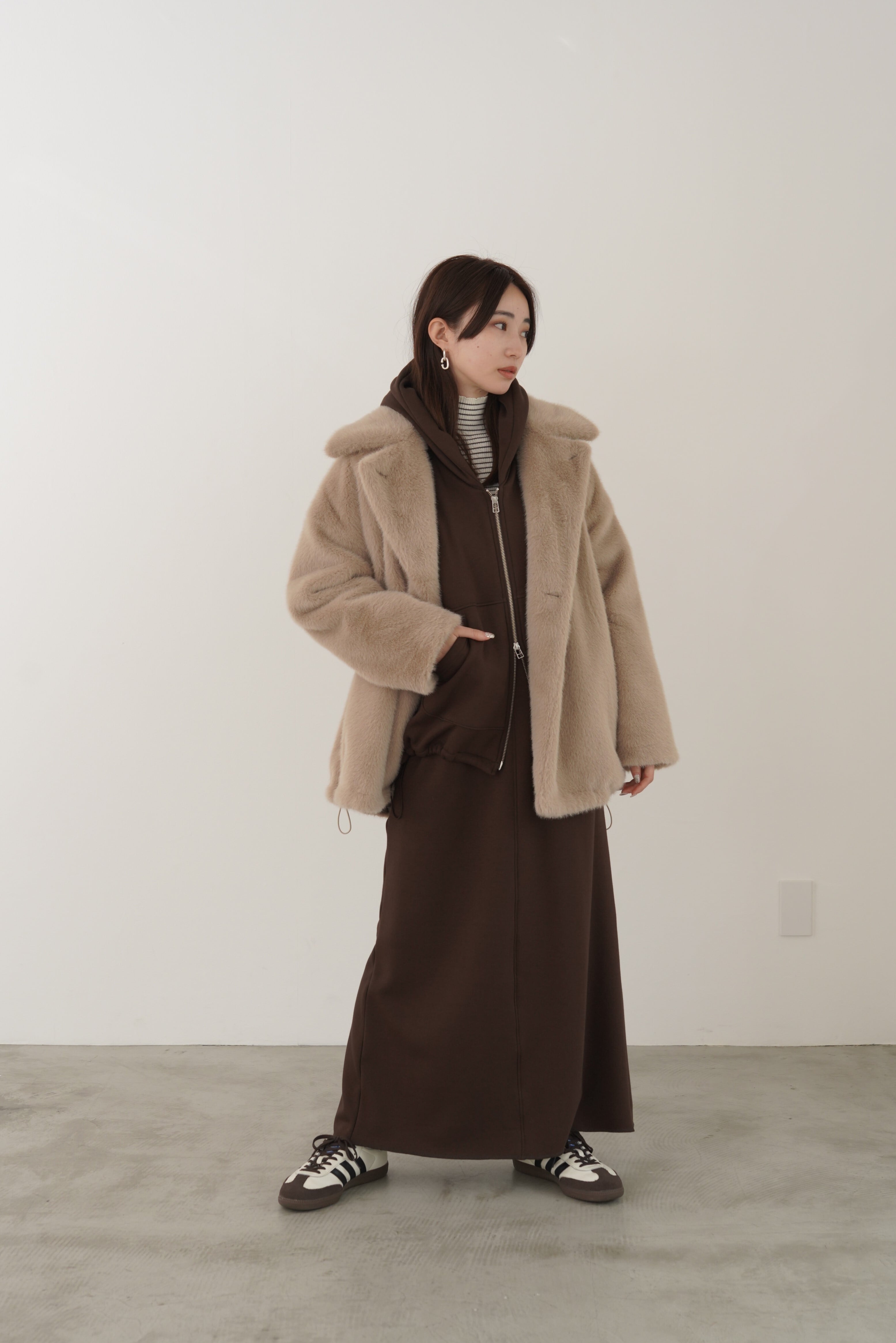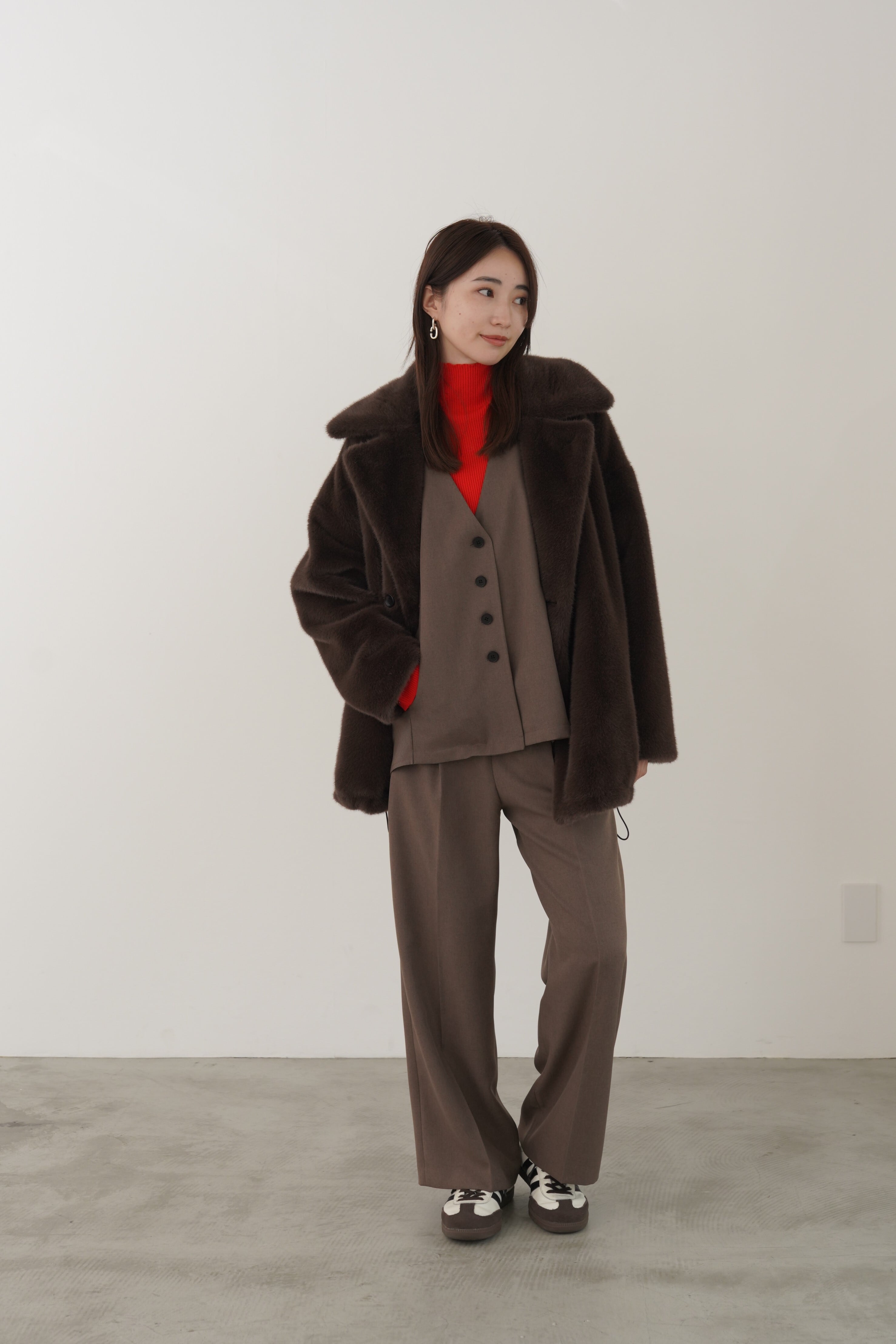 柔らかい肌触りで上質なエコファーを使用した、大きめの襟が印象的なジャケット。総裏付きですが、見た目の反して軽い仕上がりで、程よくゆとりのあるサイズ、ボトムとのバランスが取りやすいミドルレングス。デイリーに活躍するジャケットです。