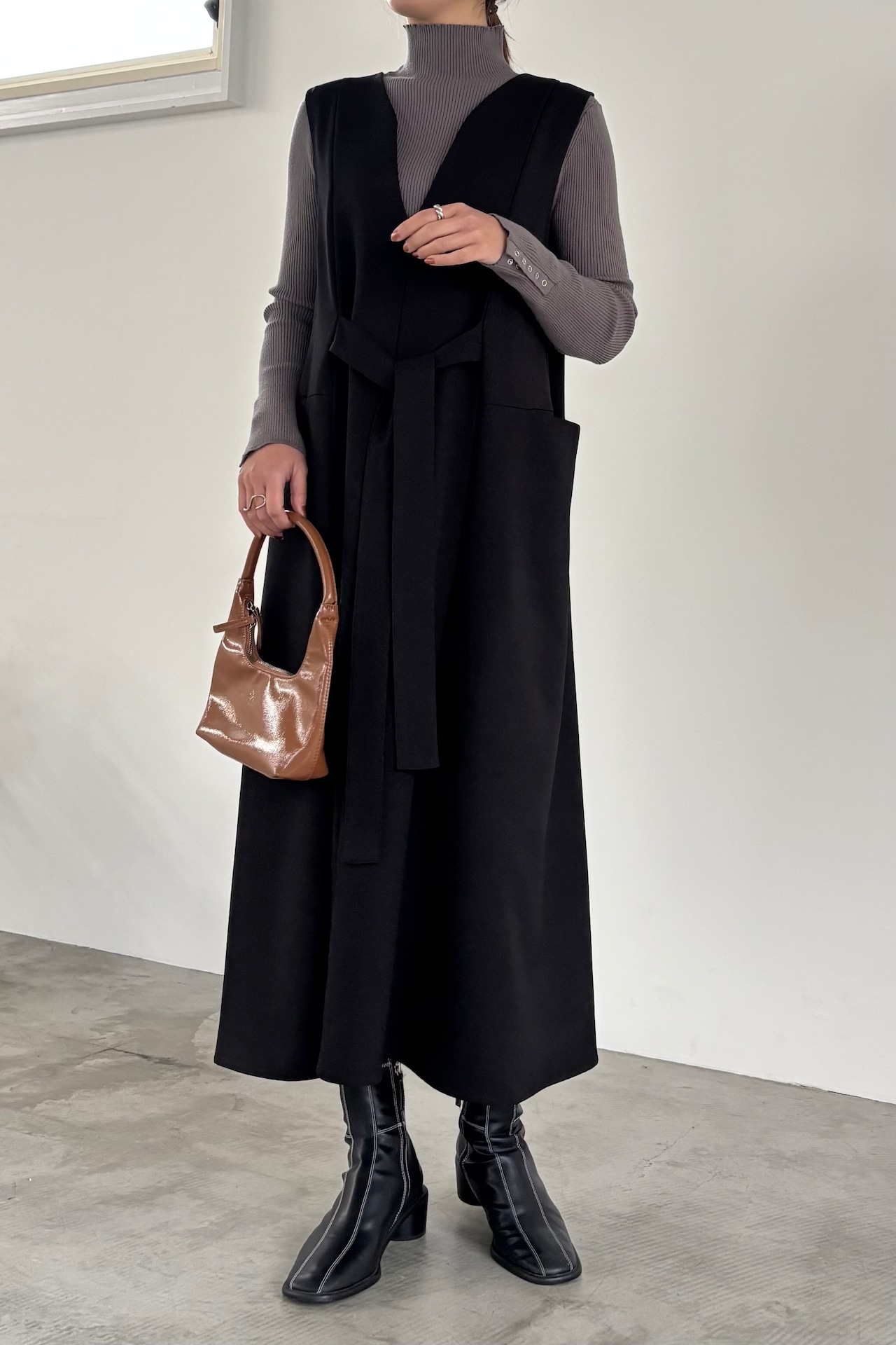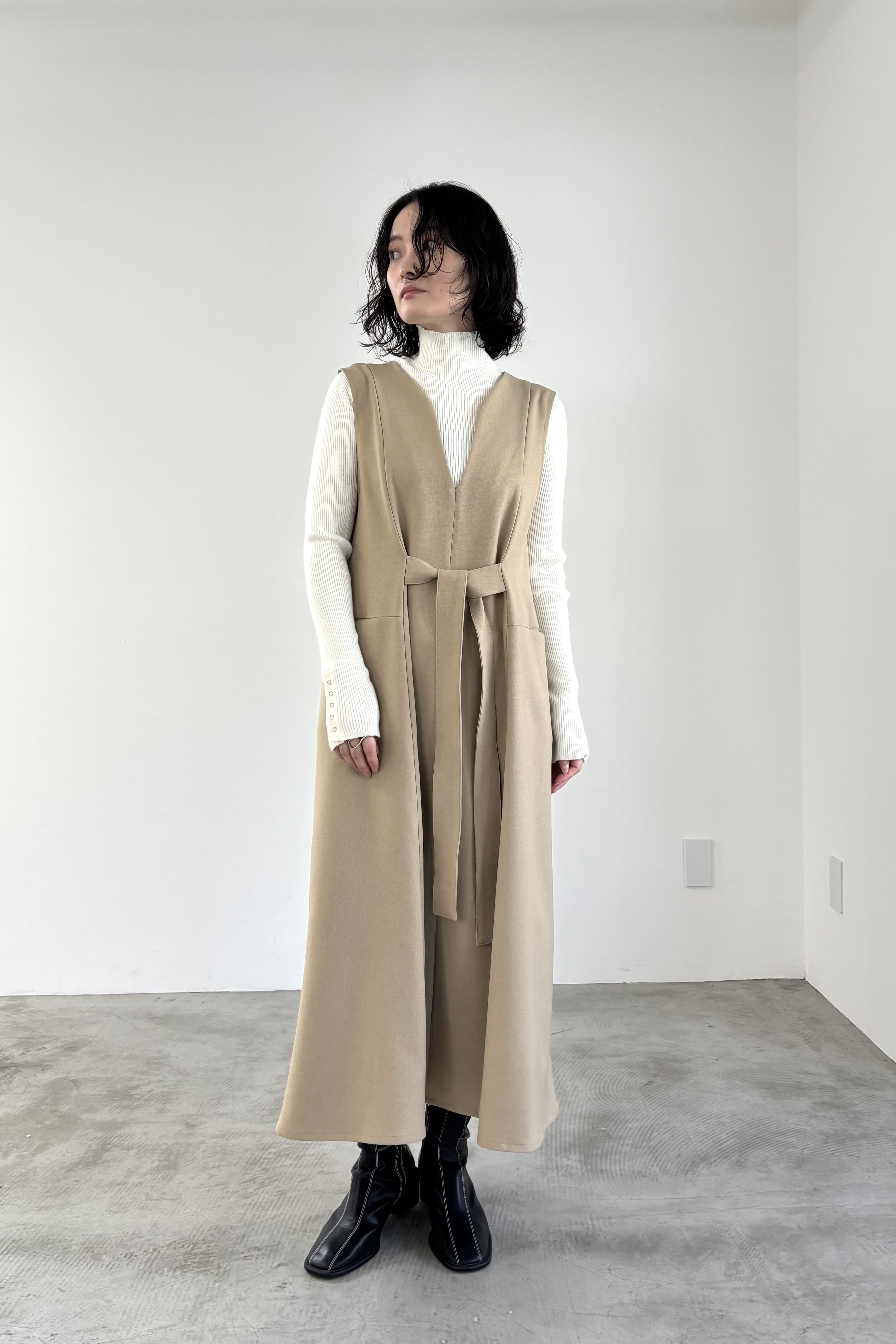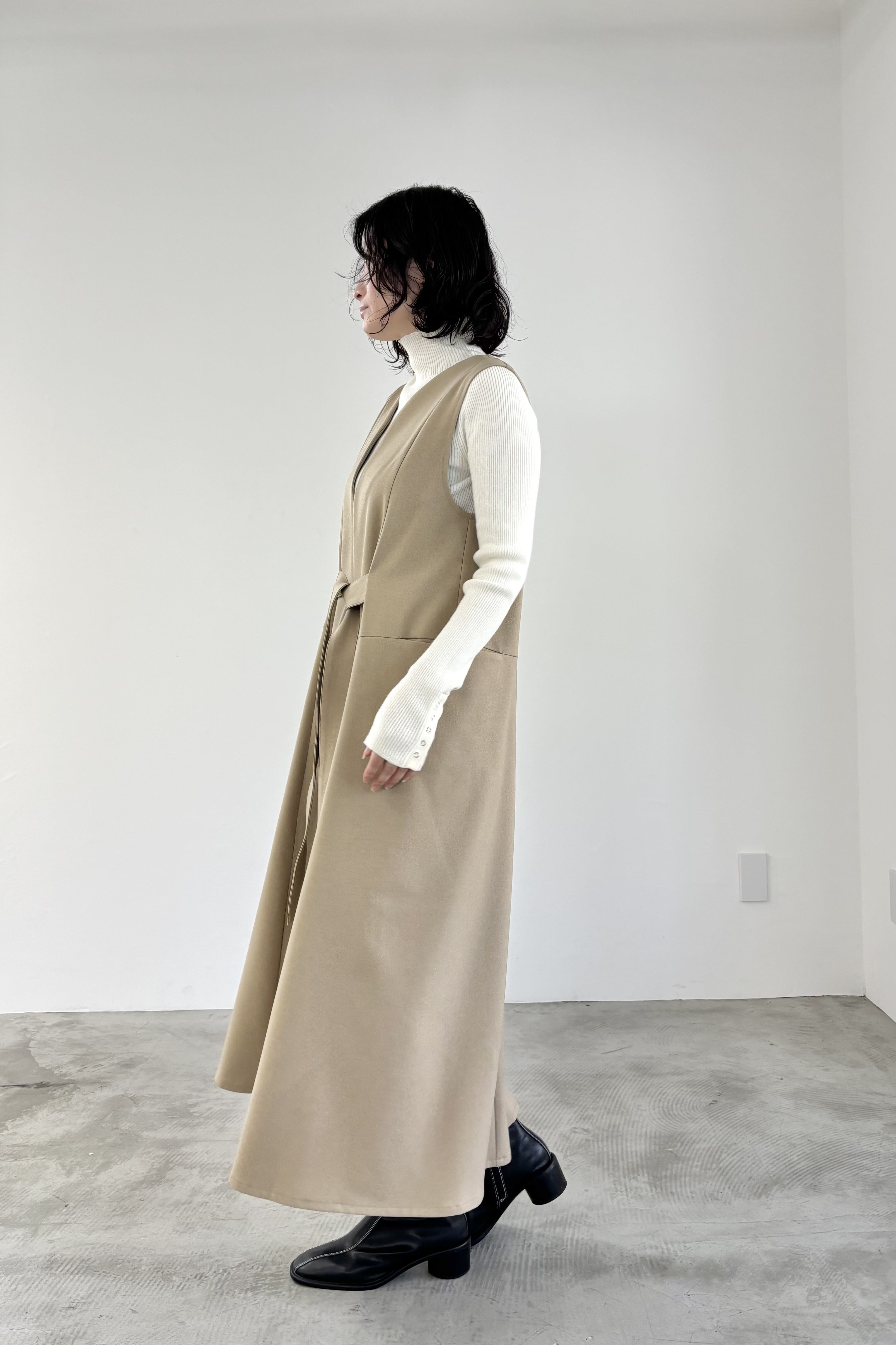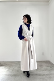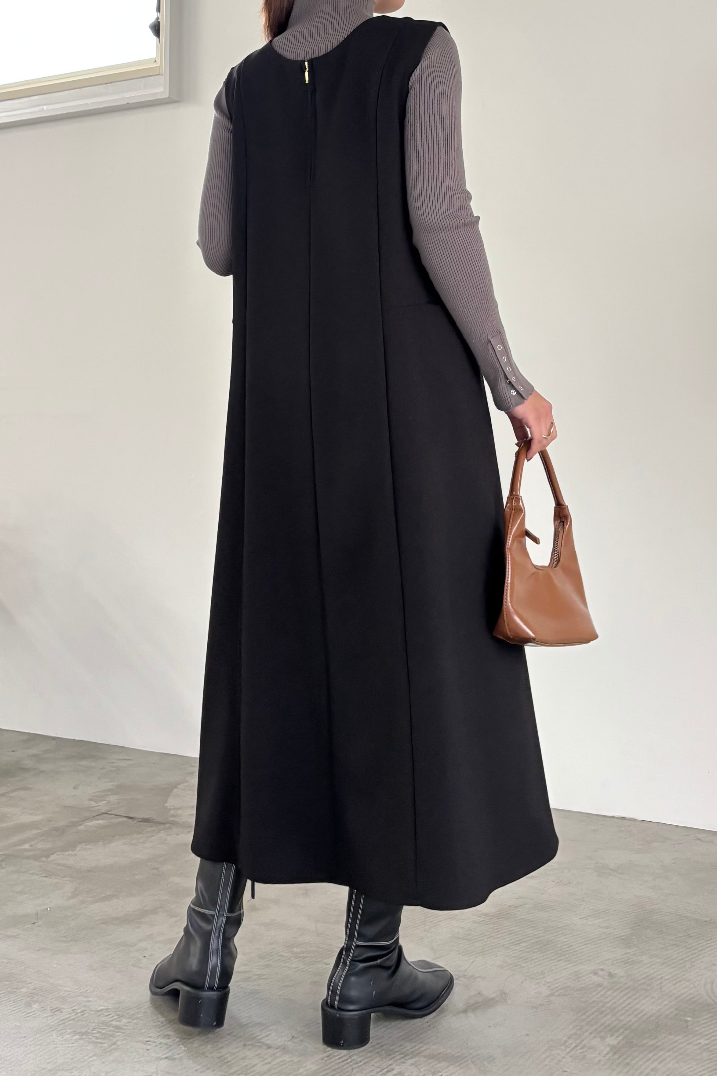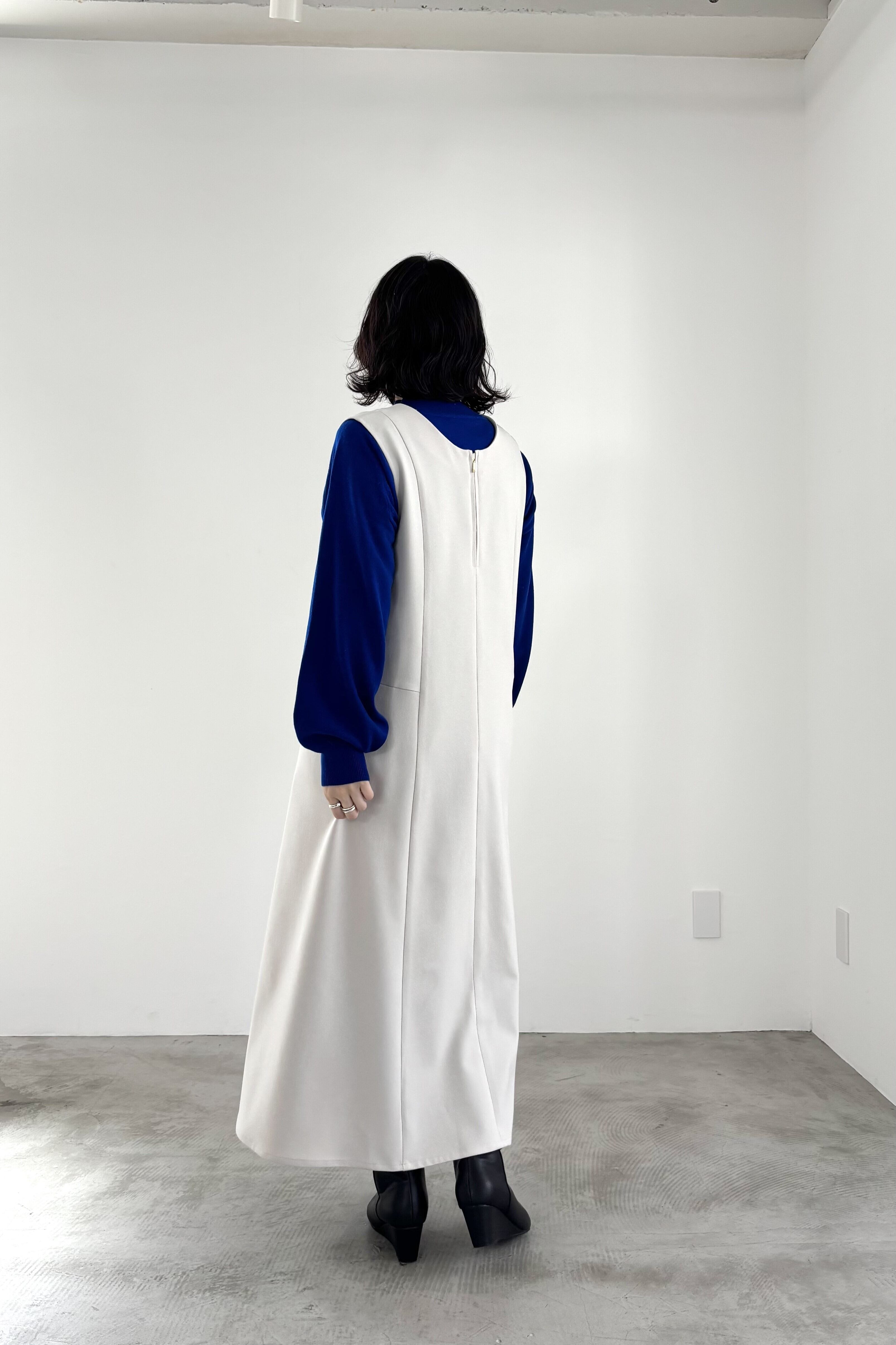 前後着用が楽しめるジャンパースカート。ウエストから広がるフレアシルエットですが襟元を変形のゆるいカーブネックにすることによりすっきり見せてくれます。ポケット付きで、デイリーにもオケージョンニーズにも使える優秀アイテムです。