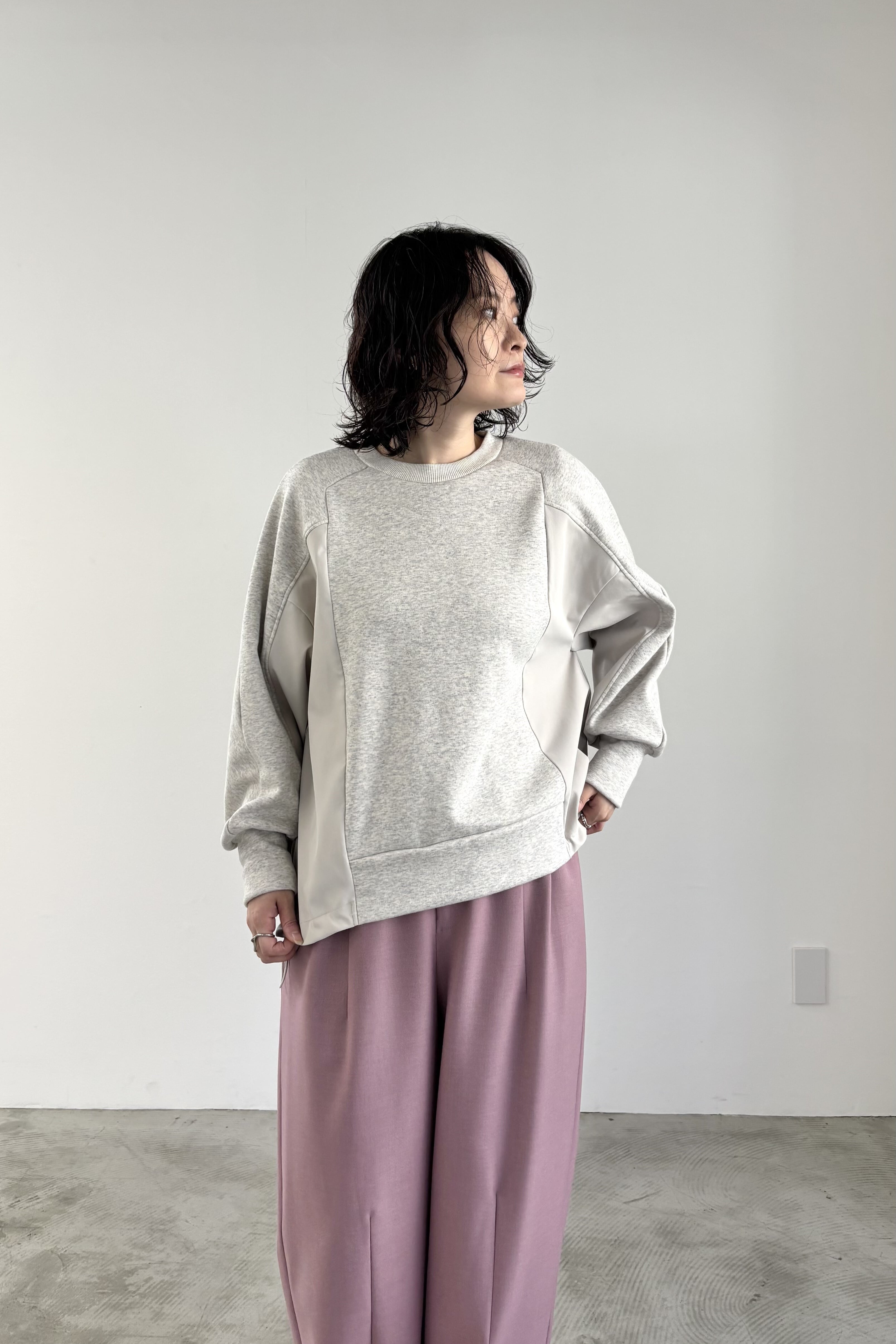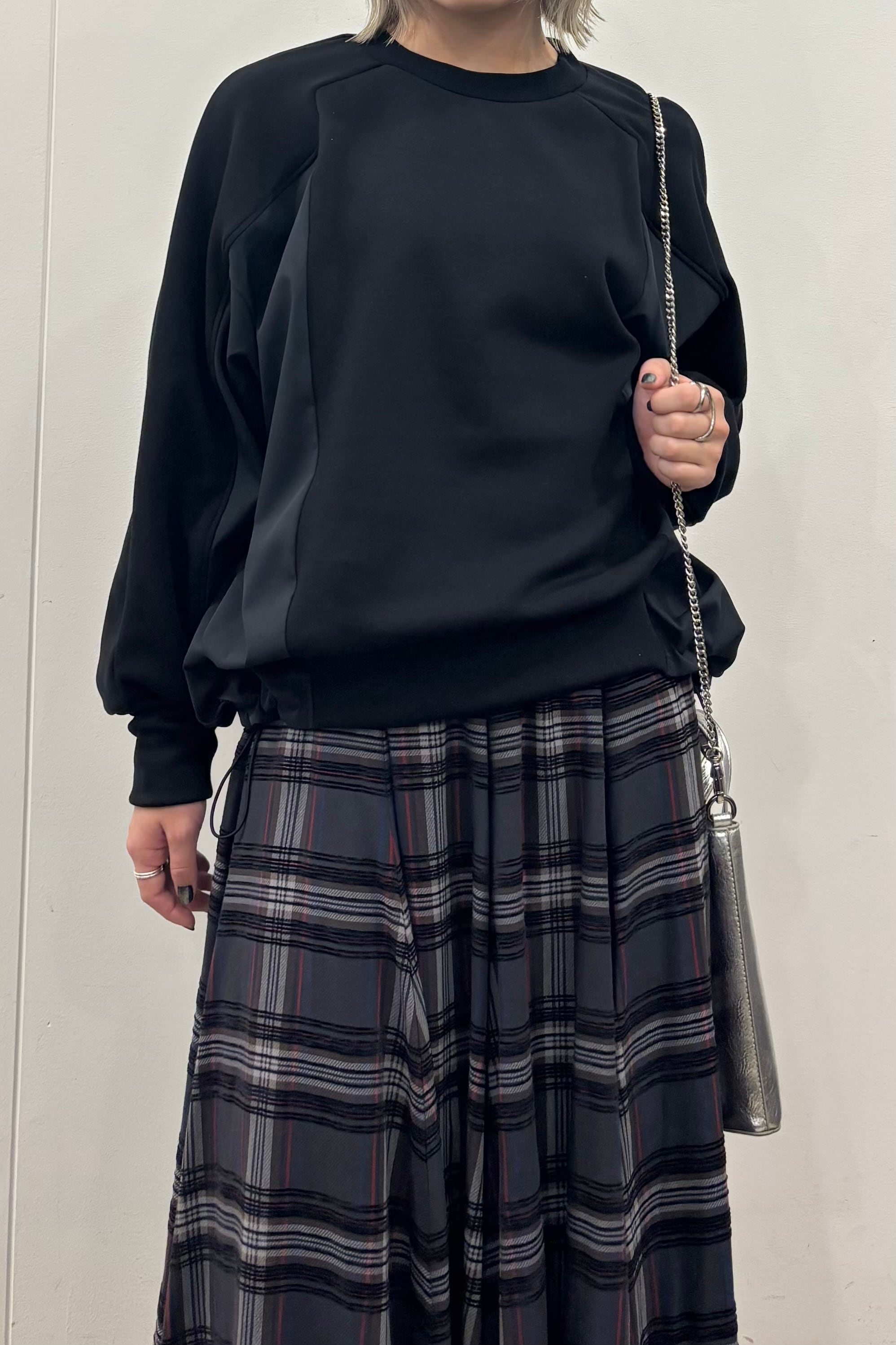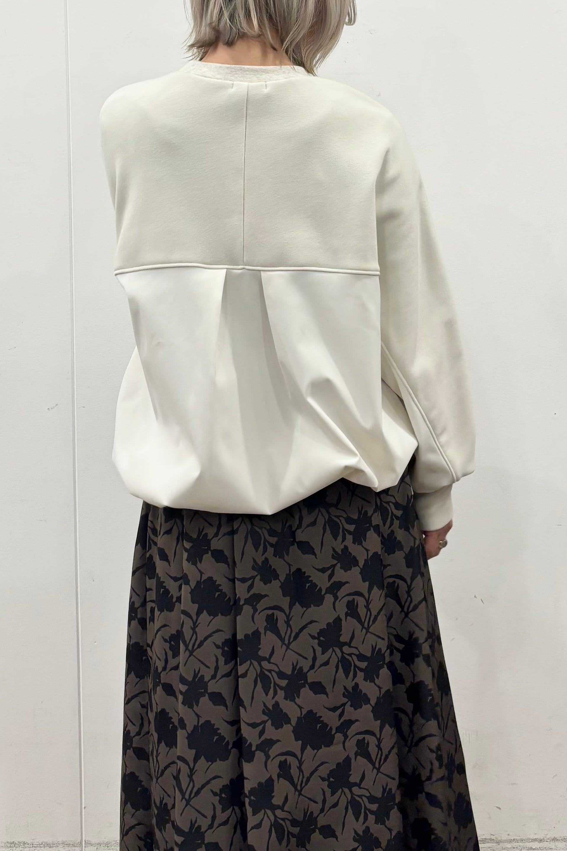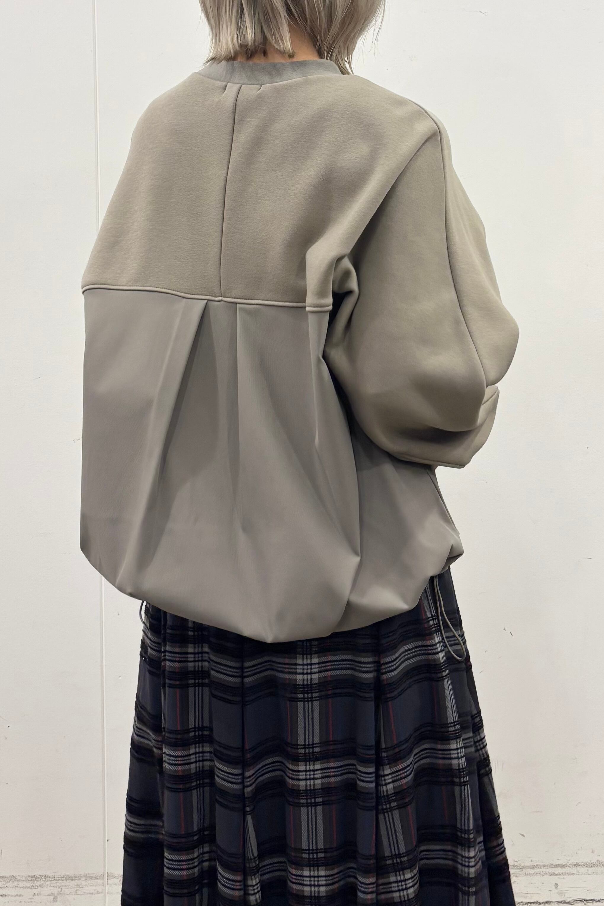 柔らかな裏起毛のボンバーヒート素材とストレッチツイルを組み合わせたトップス。ツイル生地にはシワになりにくいものを使用しています。ストレッチの効いた着心地と暖かさ、イージーケアを兼ね備えた素材でデイリーに着回しやすいトップスです。