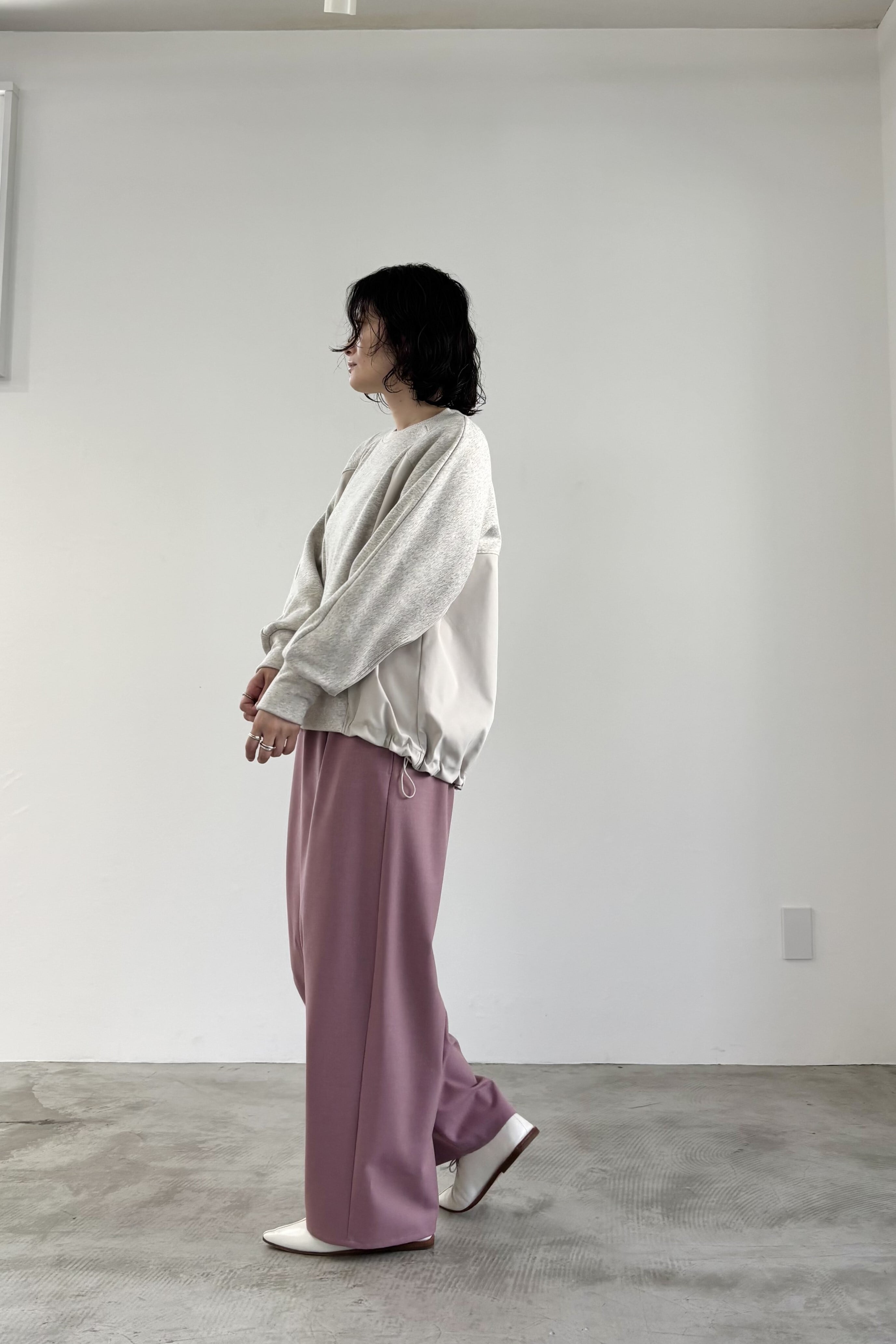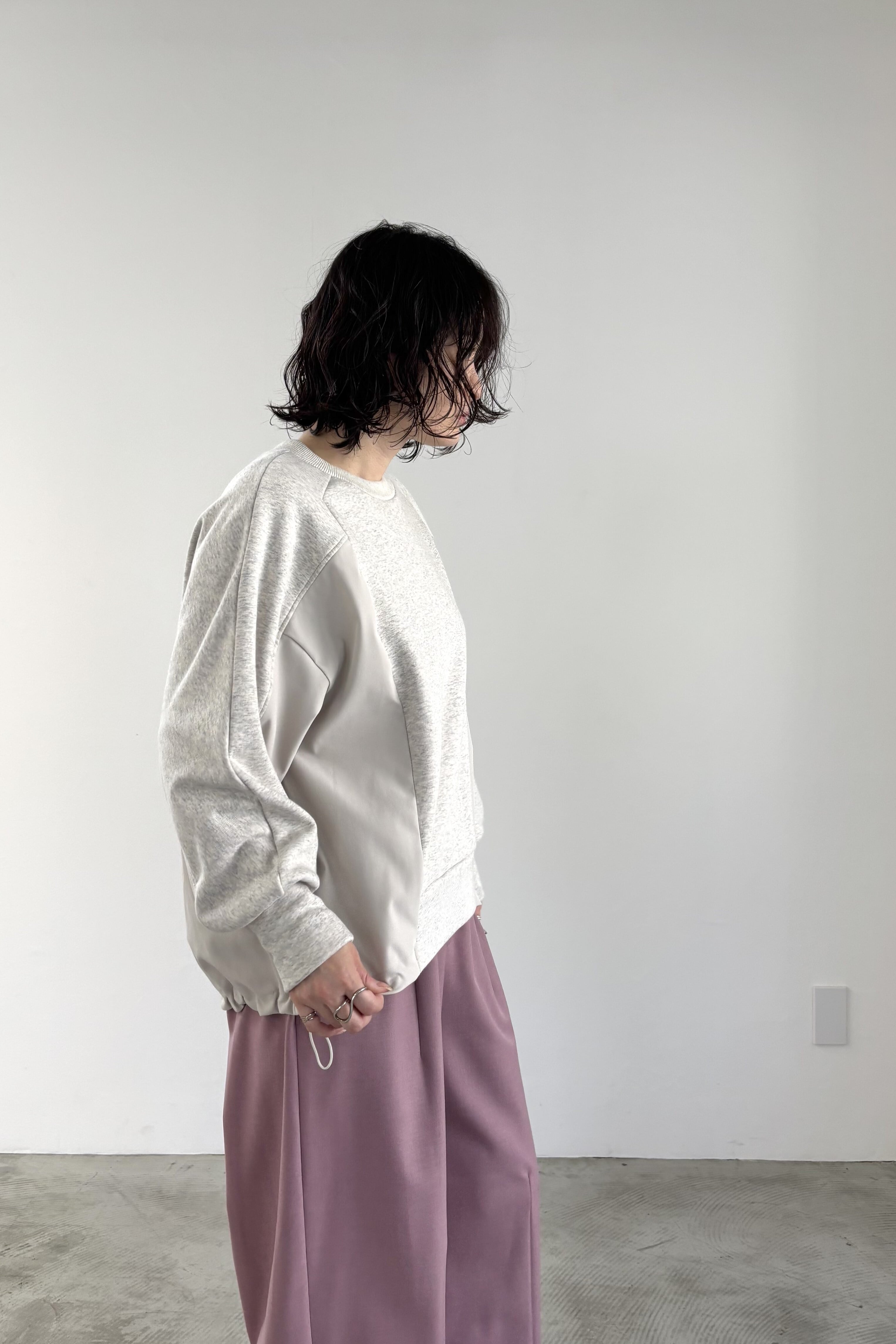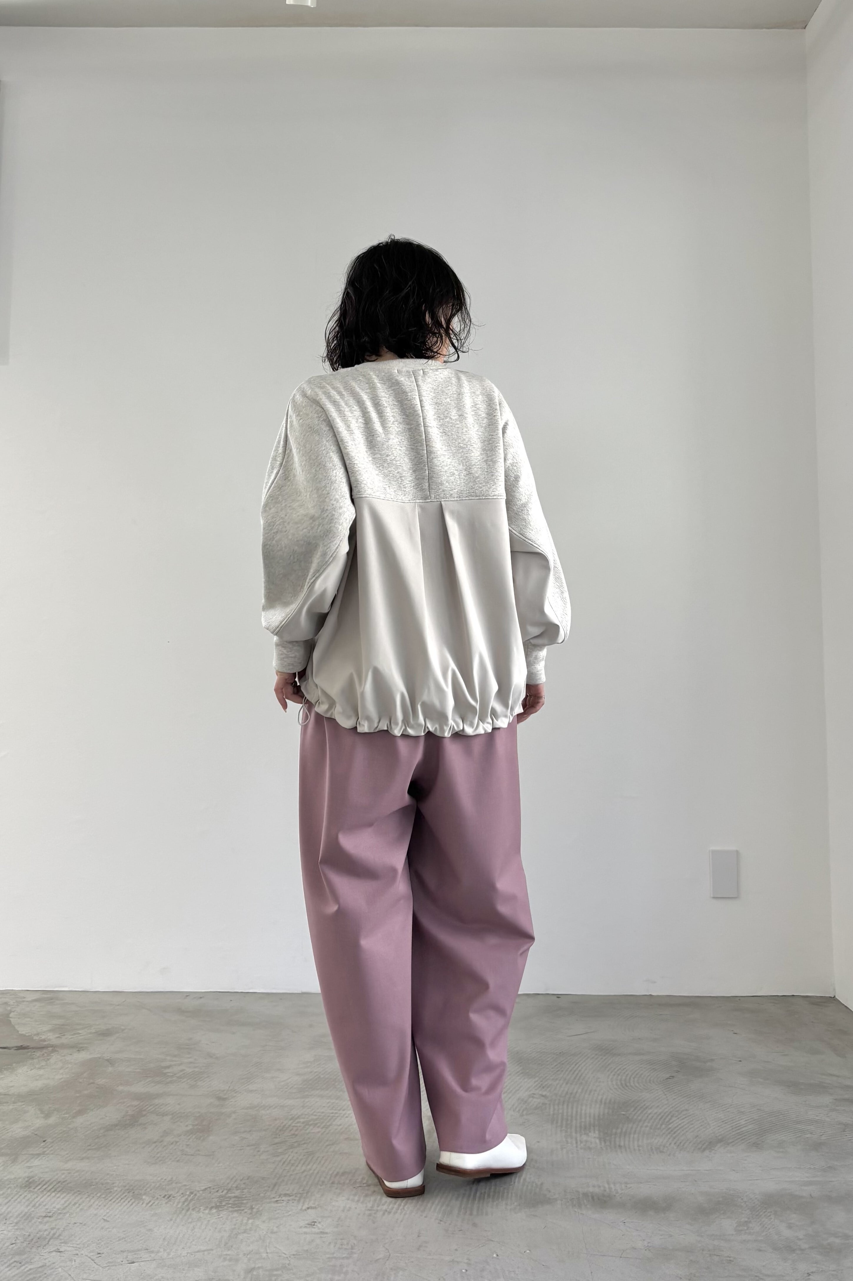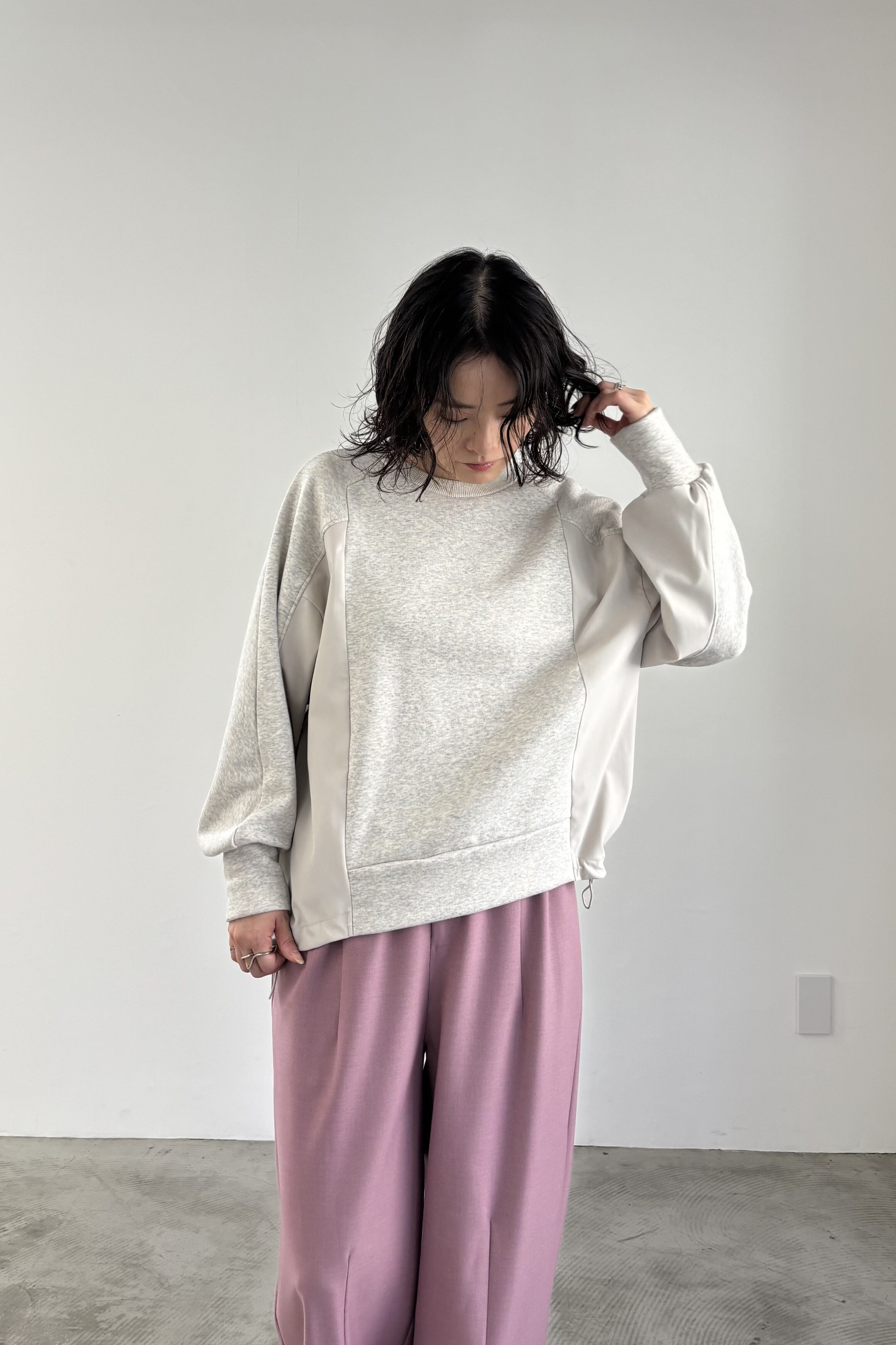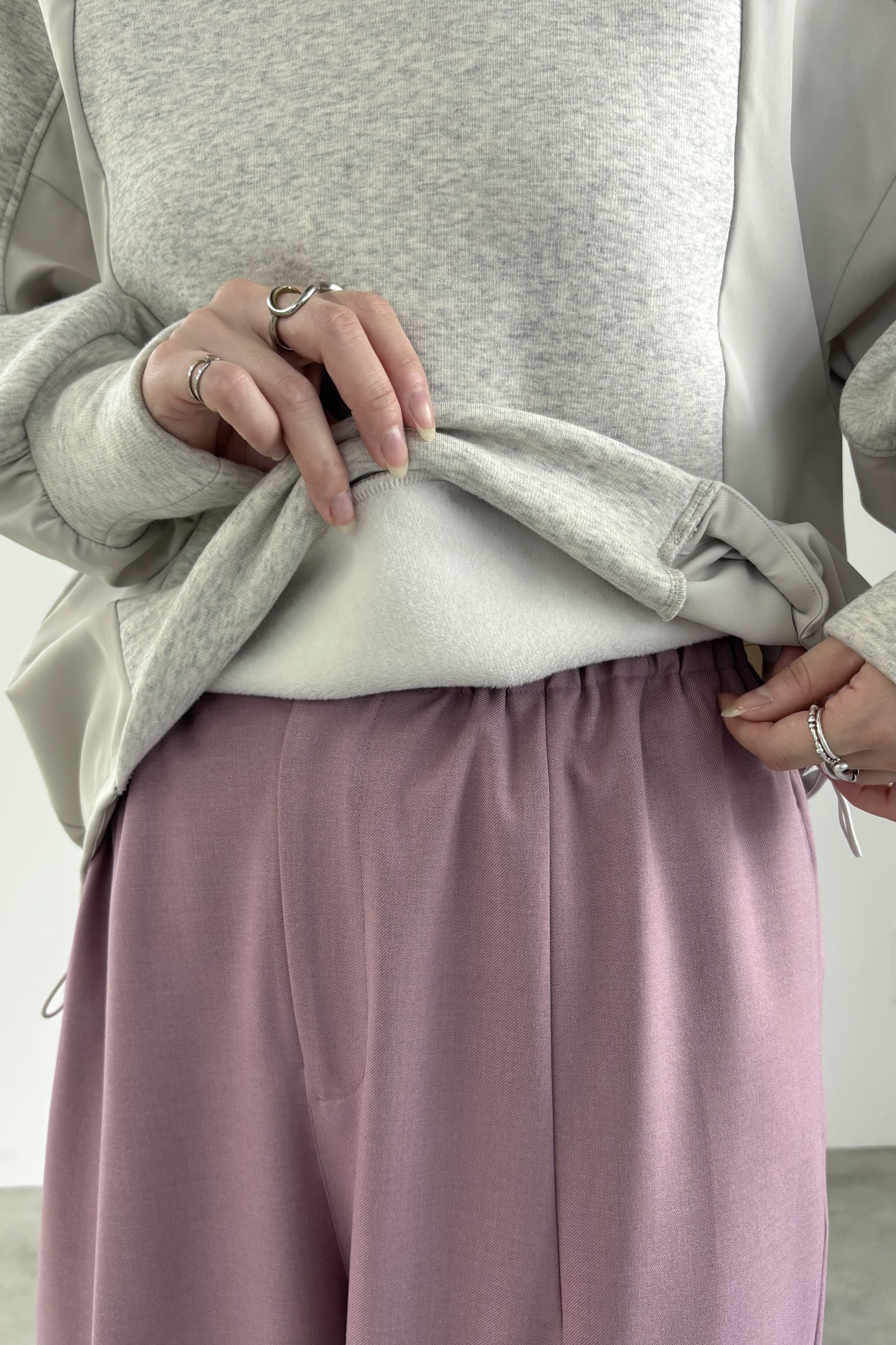柔らかな裏起毛のボンバーヒート素材とストレッチツイルを組み合わせたトップス。ツイル生地にはシワになりにくいものを使用しています。ストレッチの効いた着心地と暖かさ、イージーケアを兼ね備えた素材でデイリーに着回しやすいトップスです。