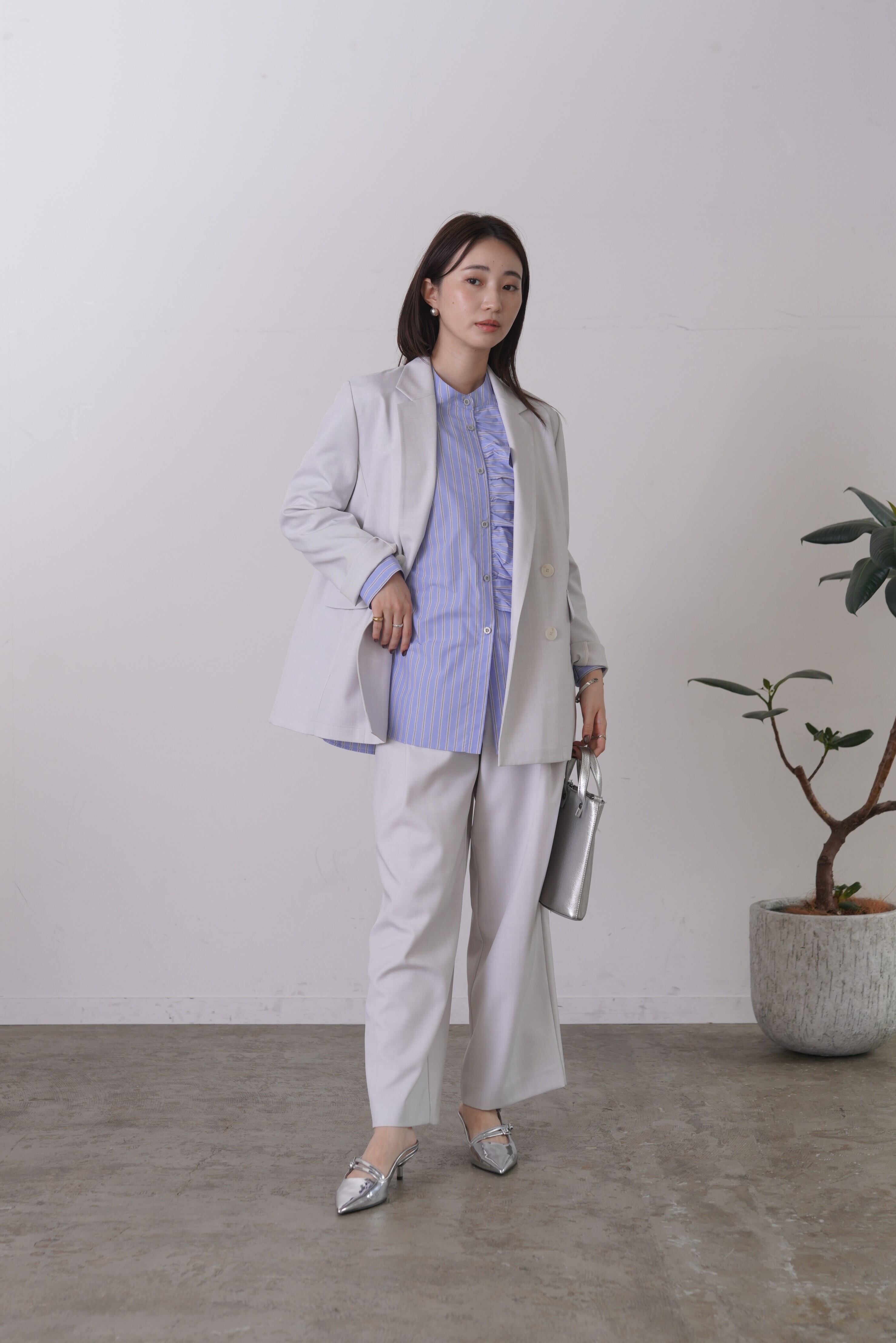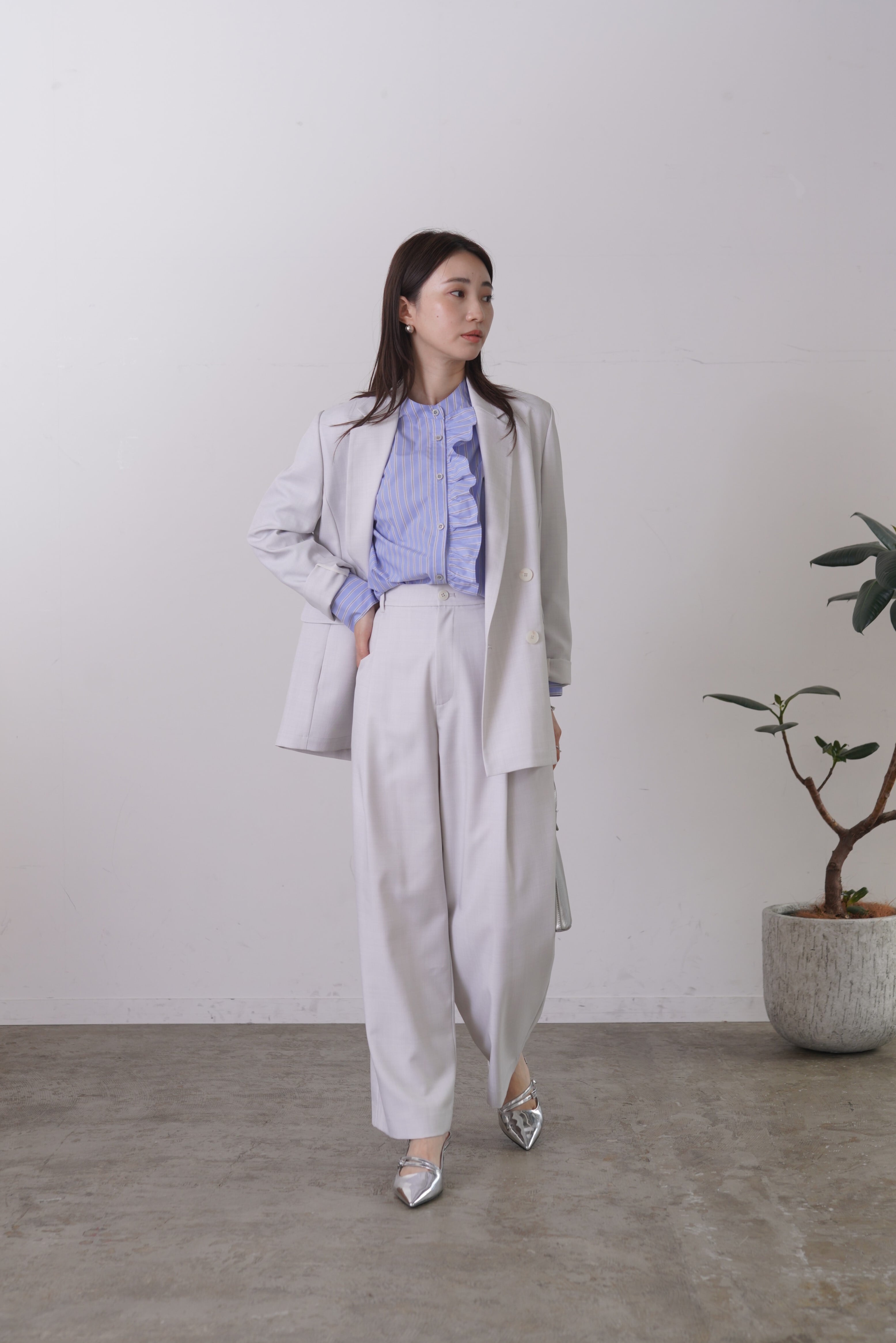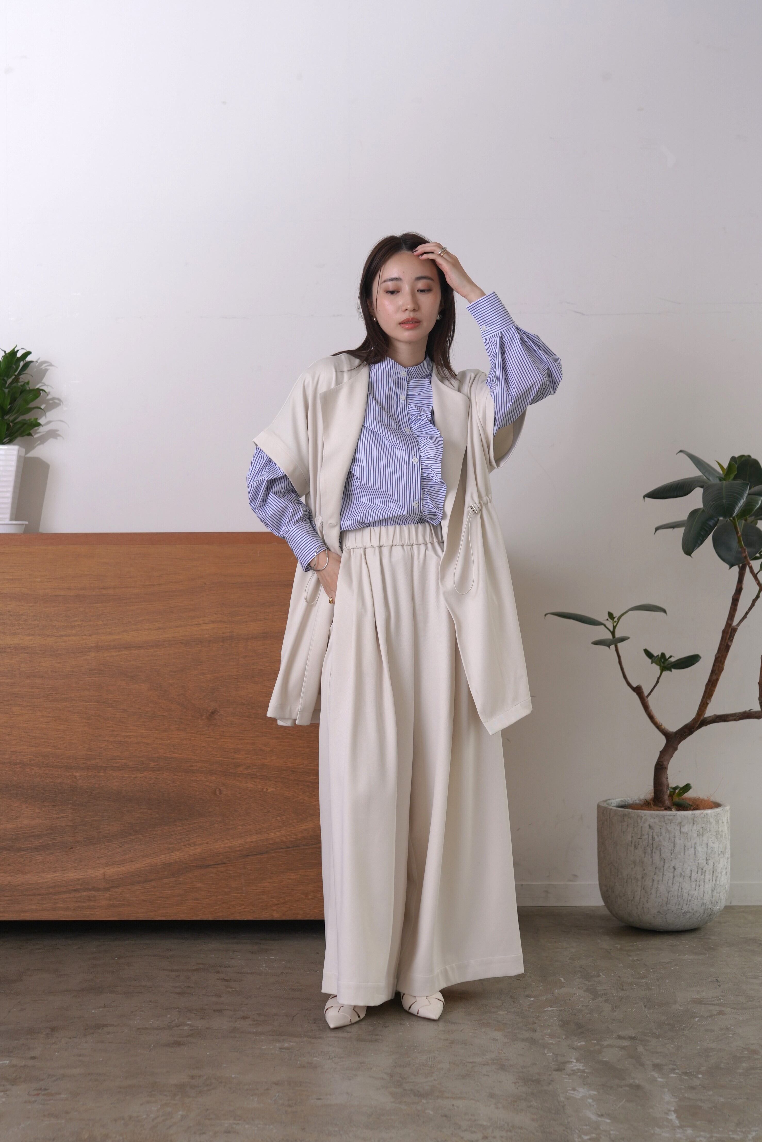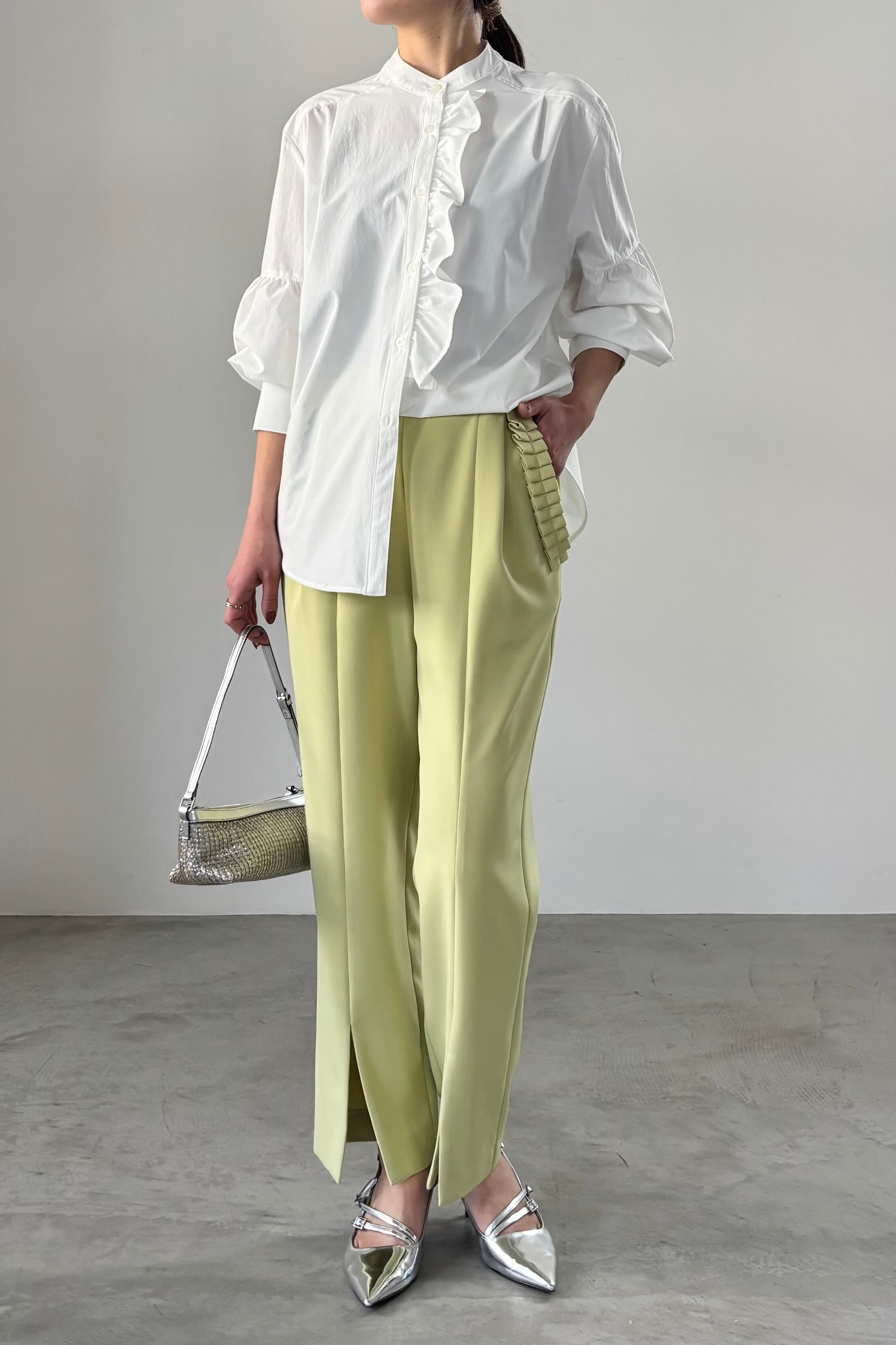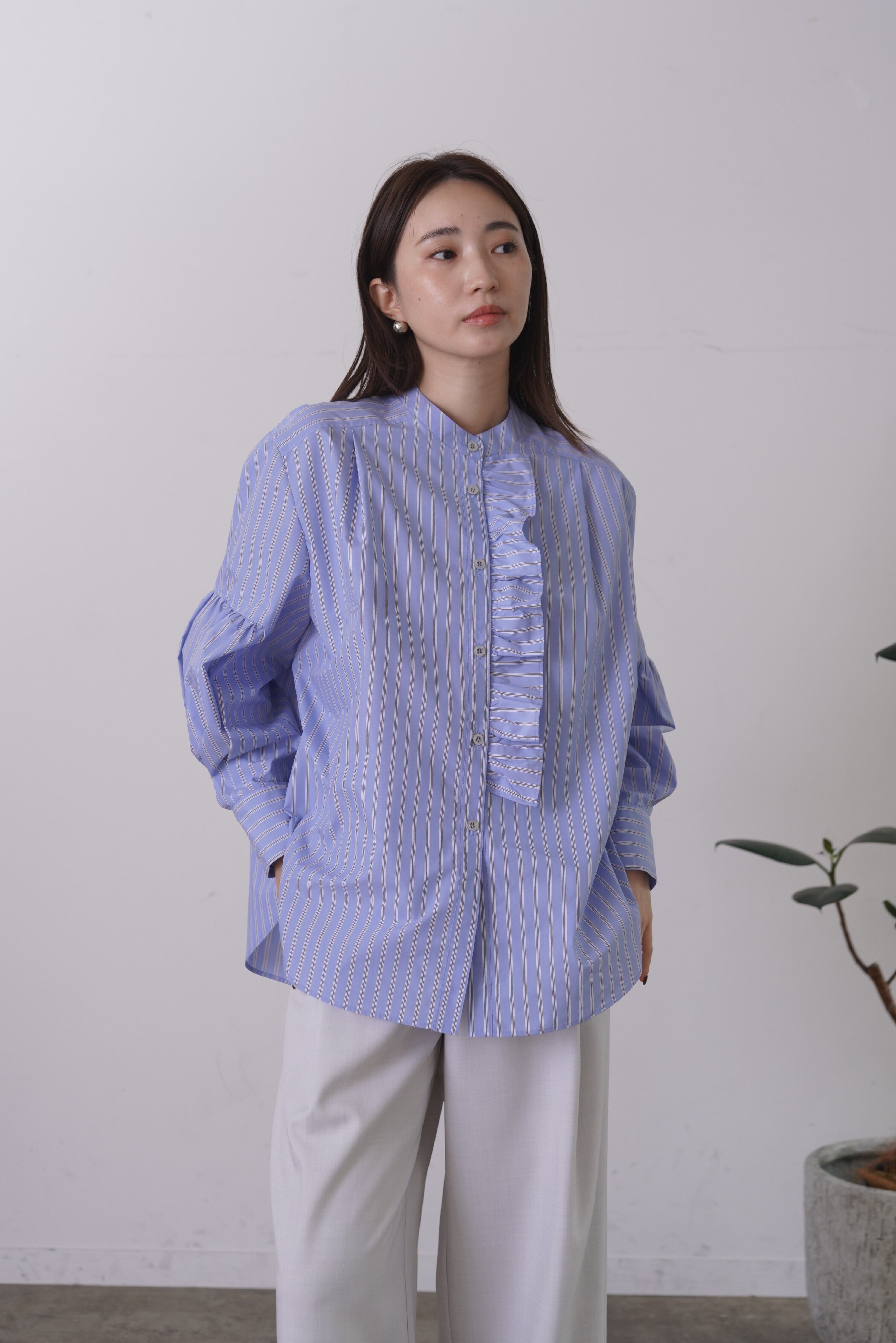 フリルと袖のギャザーで、クリーンな中に程よい甘さのあるバンドカラーブラウス。合繊素材ながらコットンライクのルックスでしなやかなハリがあり、シワになりにくい特性があります。