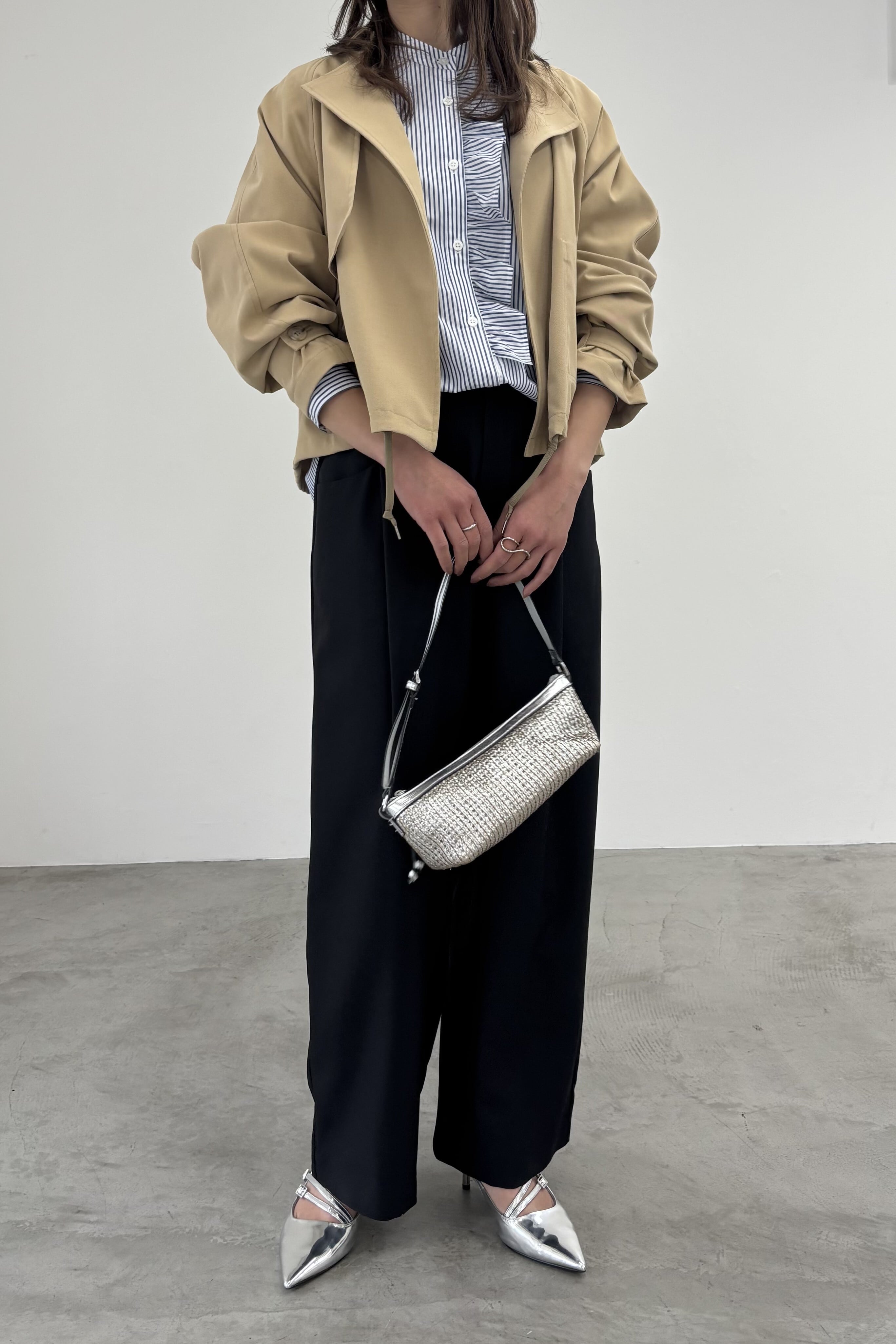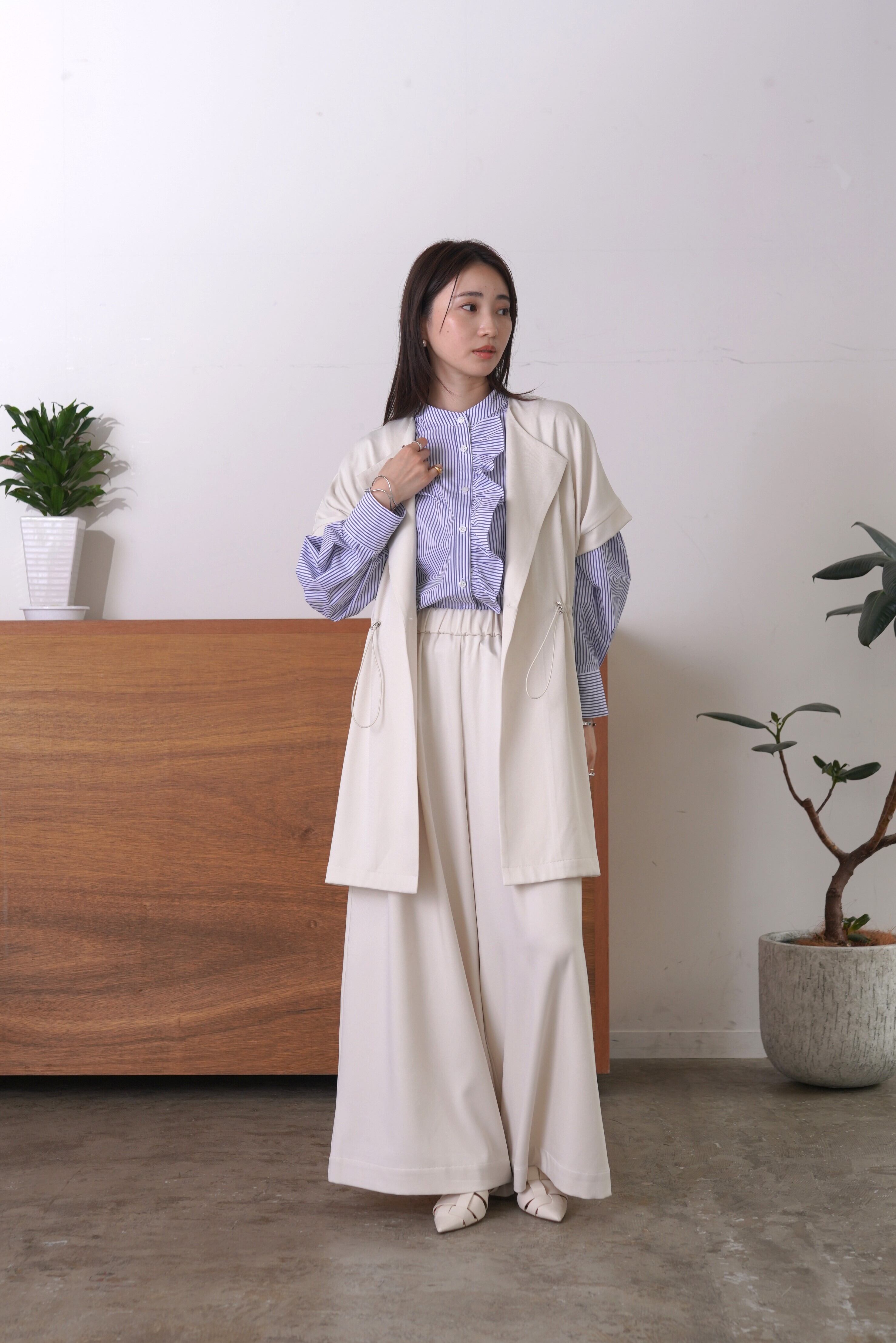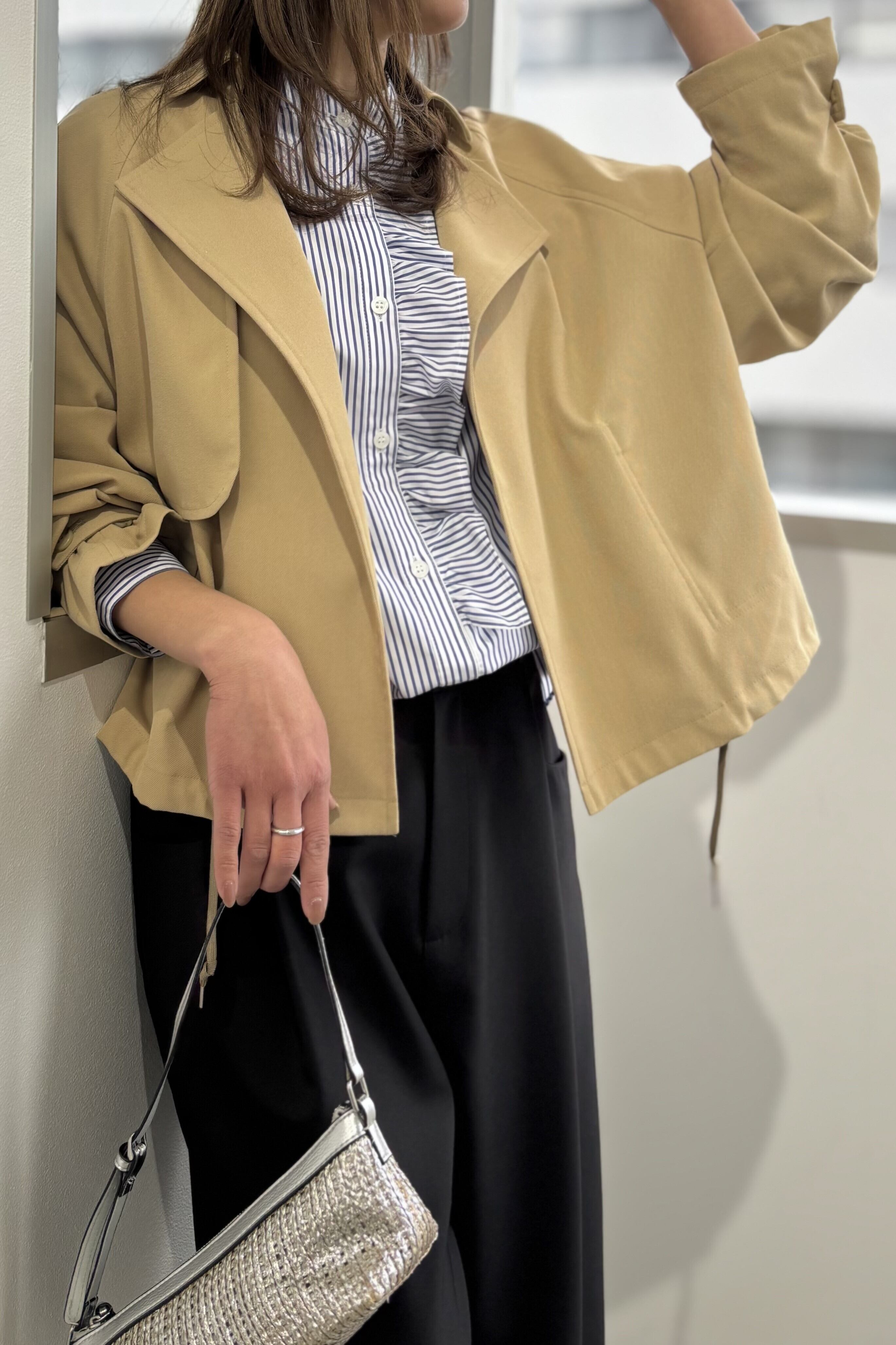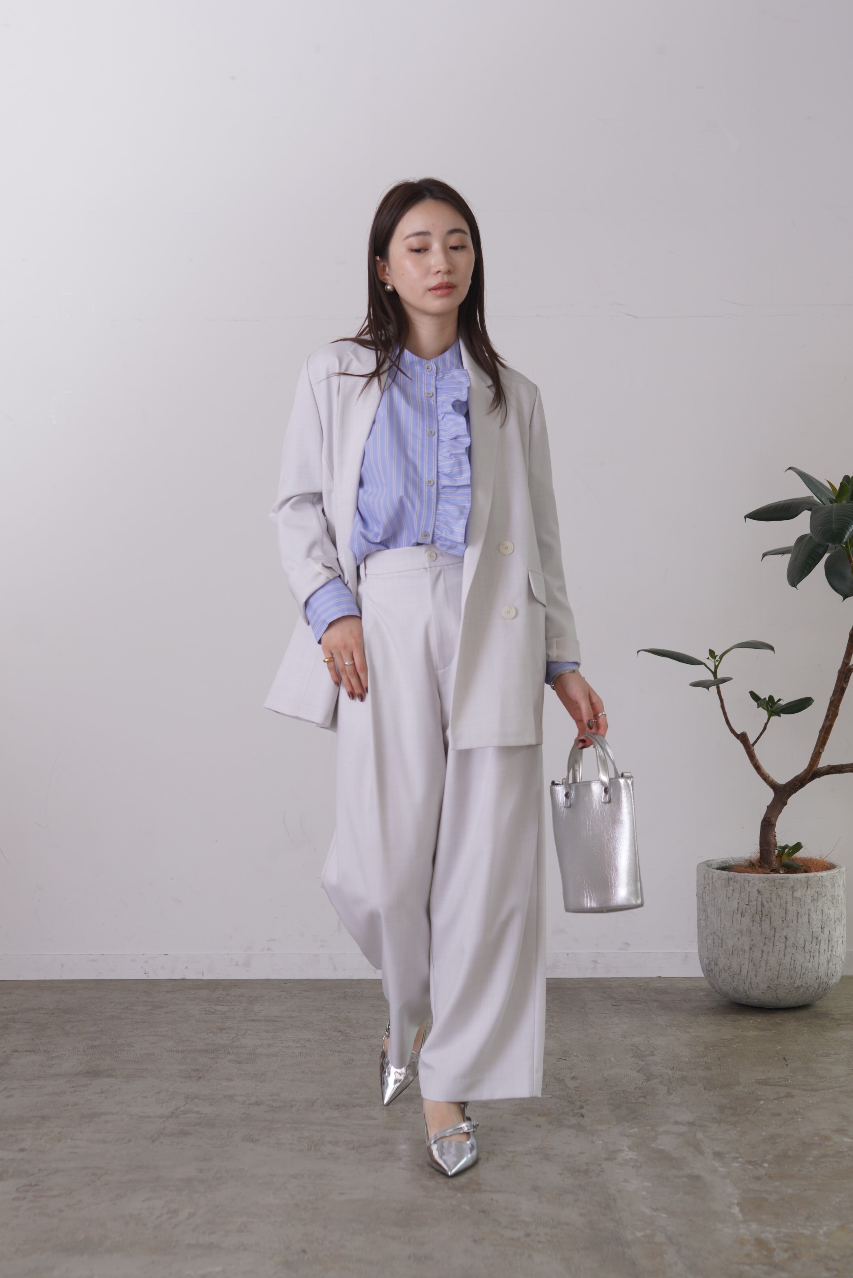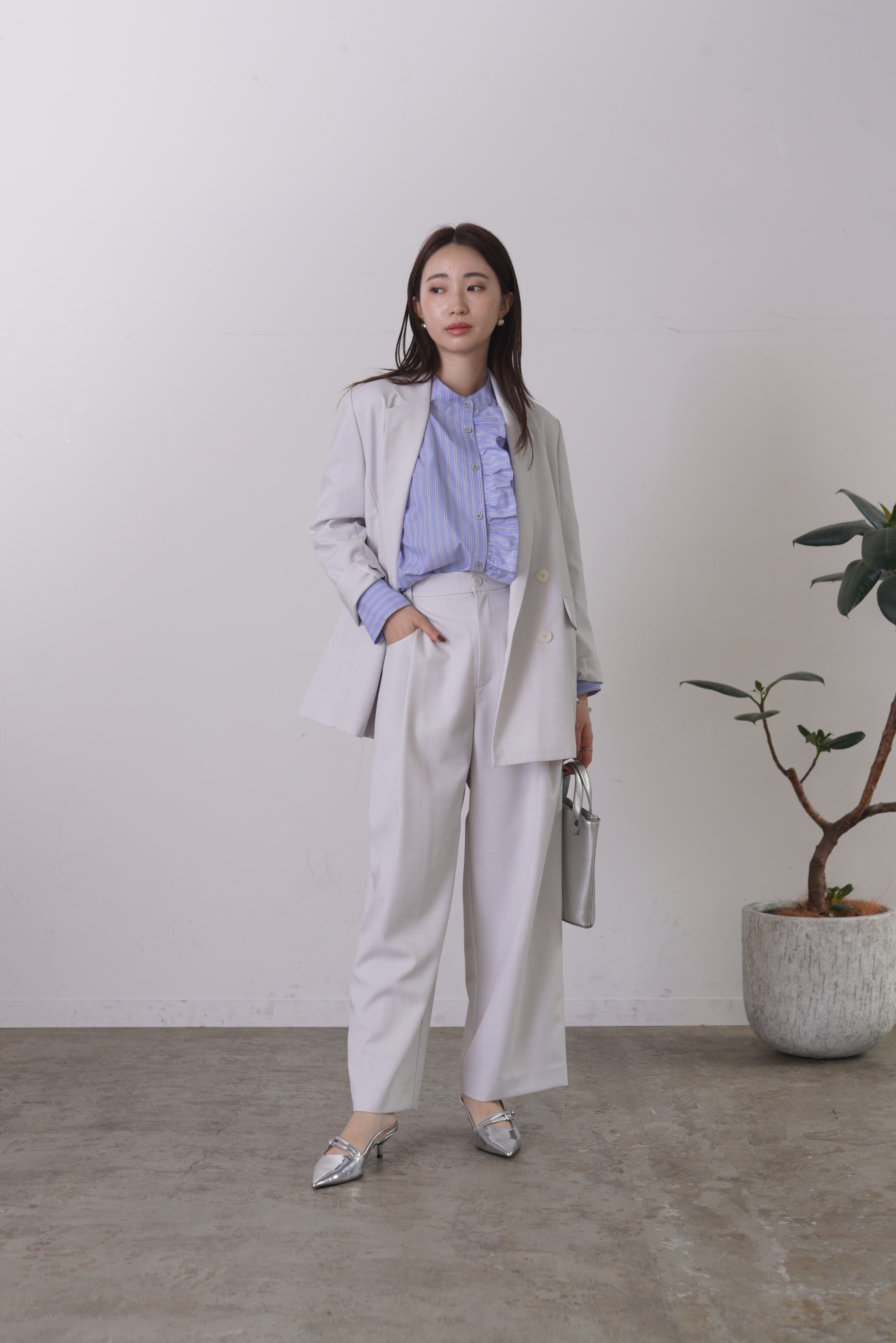 フリルと袖のギャザーで、クリーンな中に程よい甘さのあるバンドカラーブラウス。合繊素材ながらコットンライクのルックスでしなやかなハリがあり、シワになりにくい特性があります。