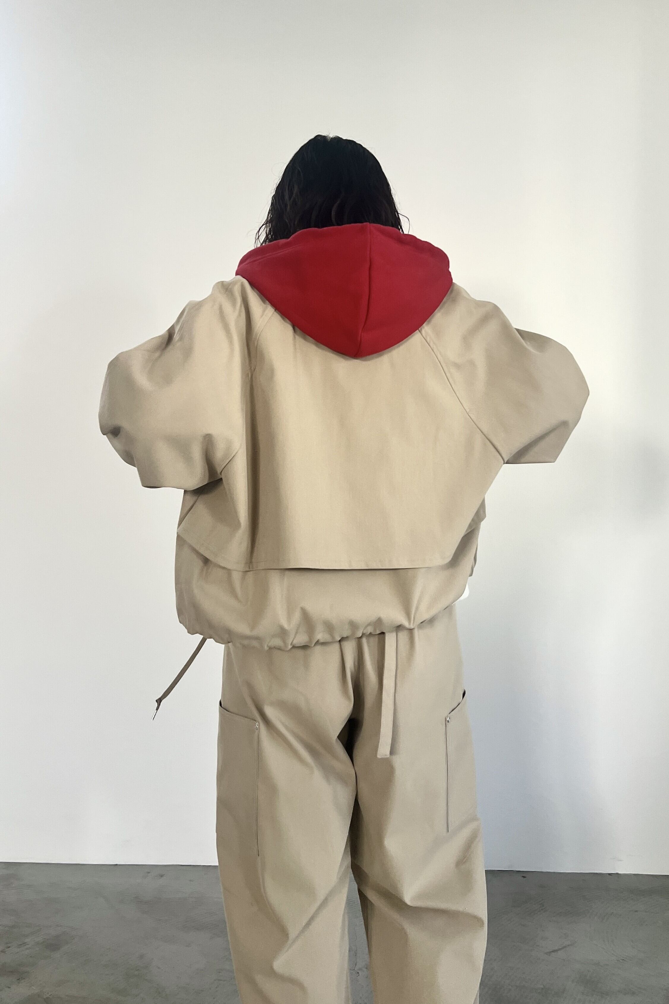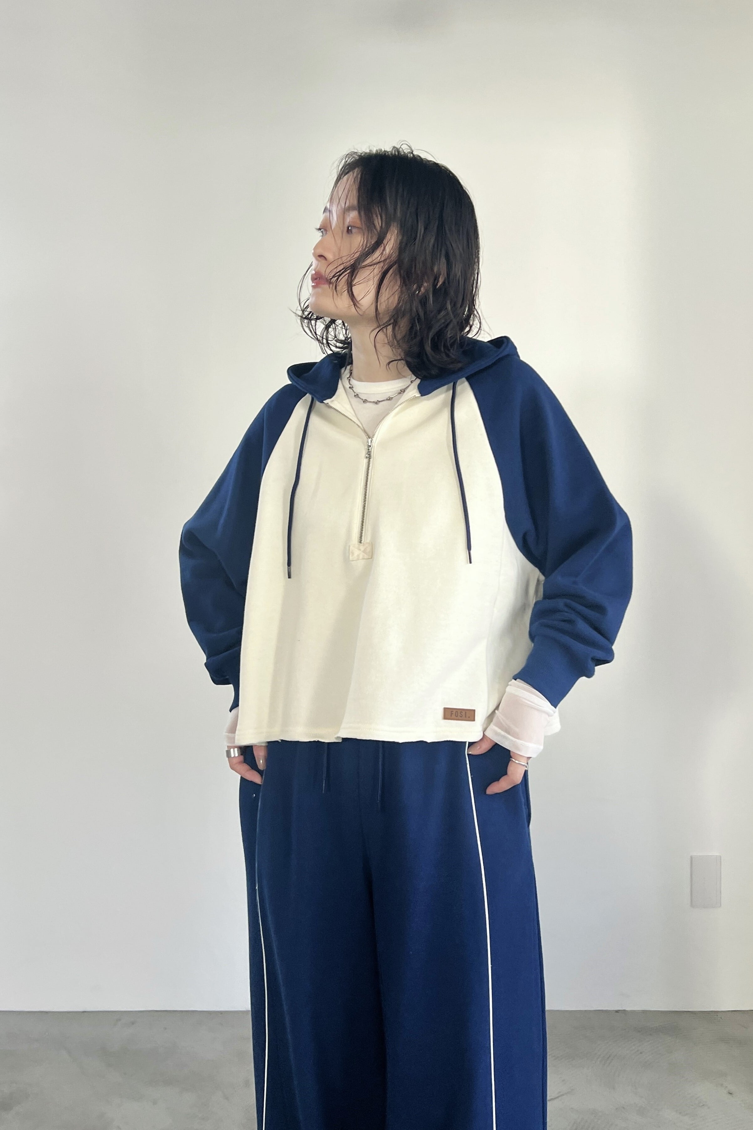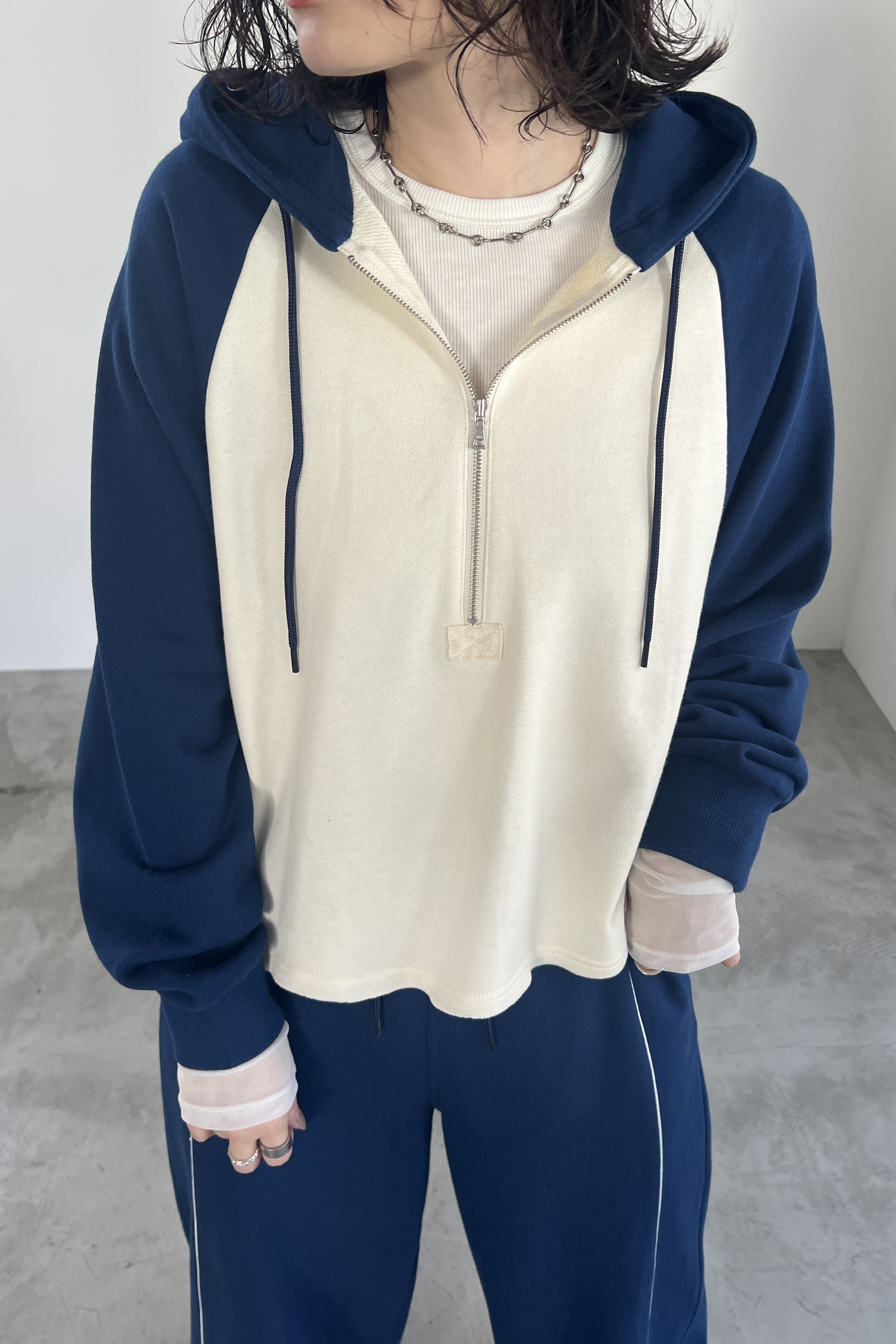 膨らみのあるベーシックな国産裏毛を使用したハーフジップフーディー。切りっぱなしの裾始末や、大胆なバイカラーの配色でカジュアルに仕上げました。ゆったりめのサイズ感ですが、短めの着丈なのでボリュームのあるボトムとの相性も◎
