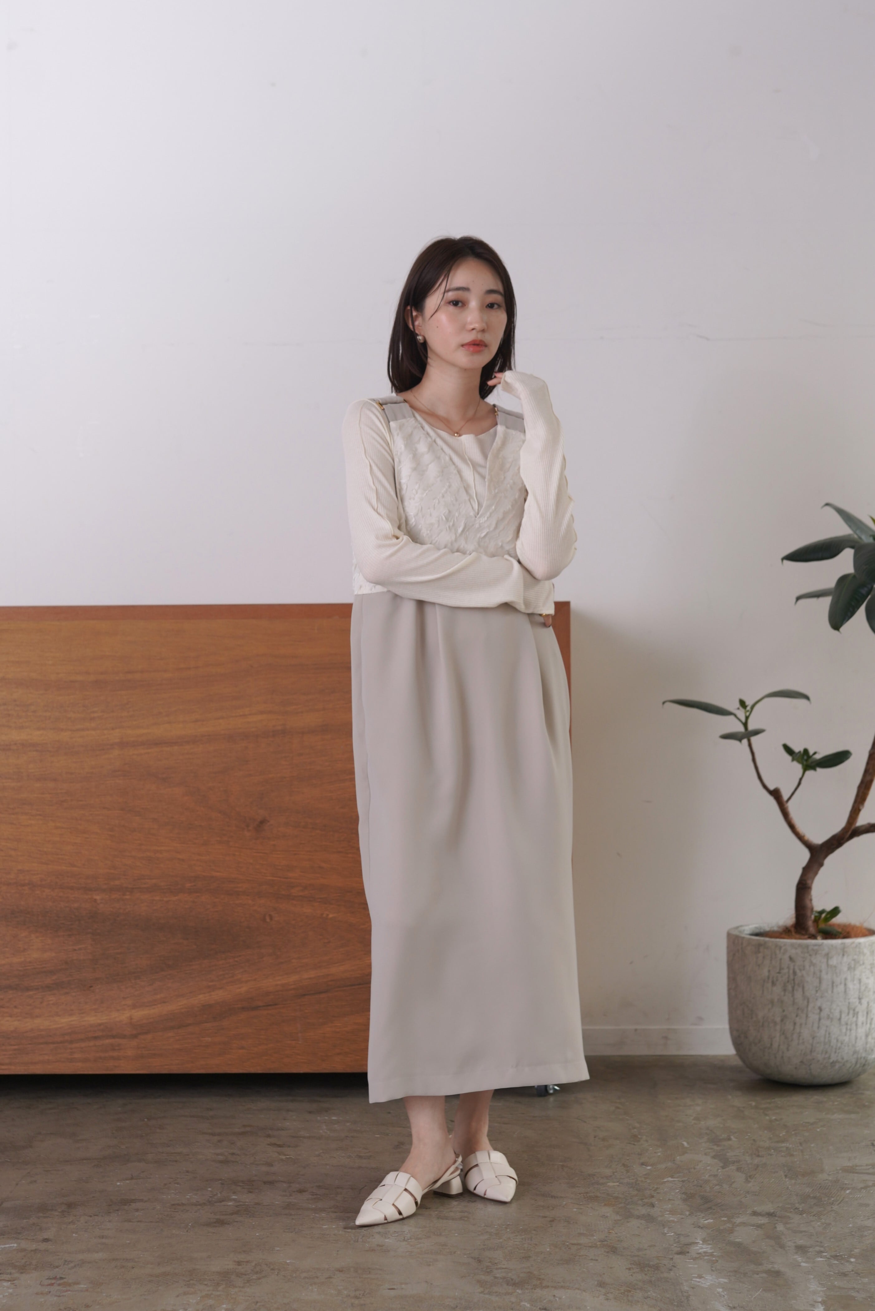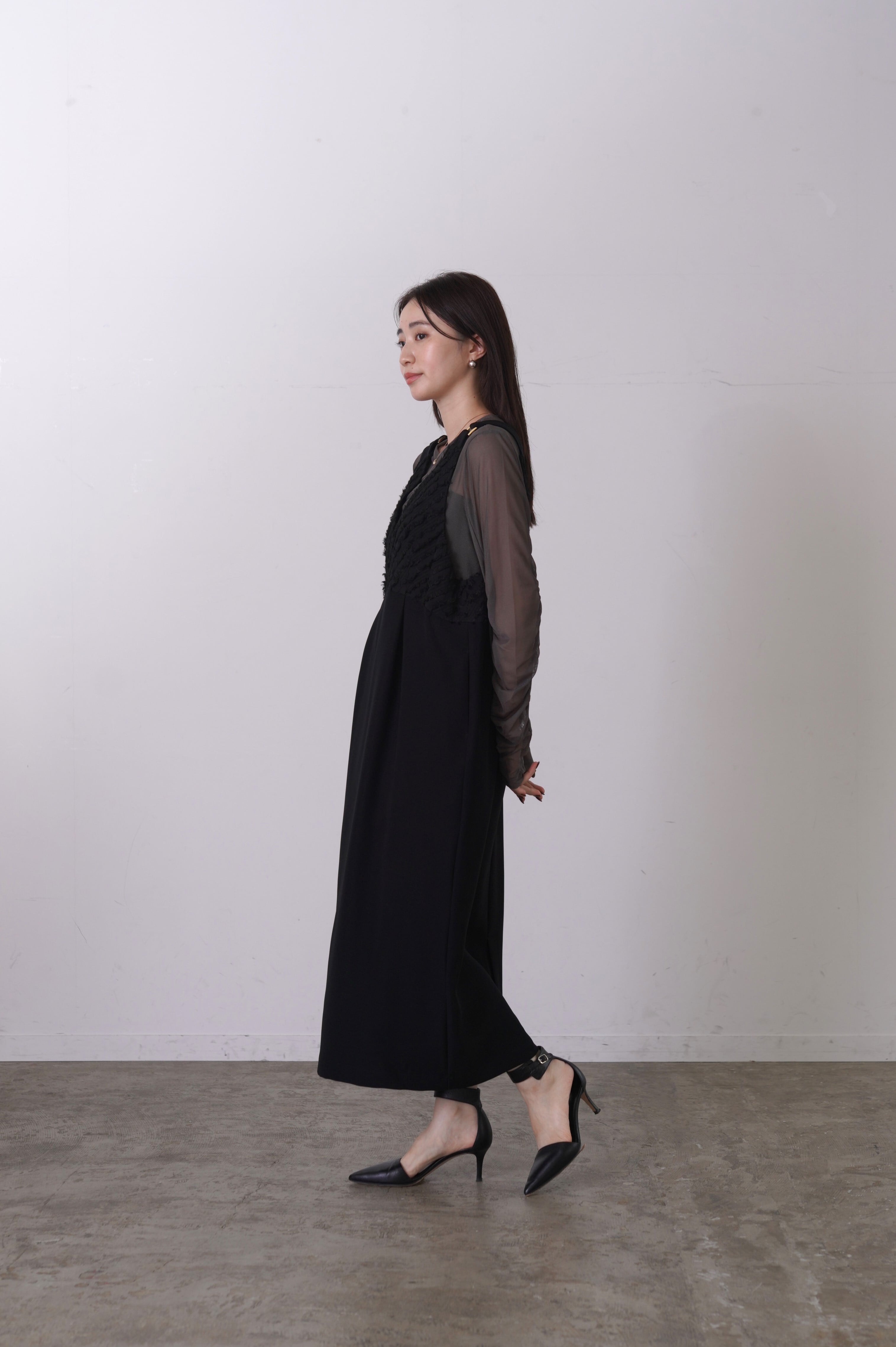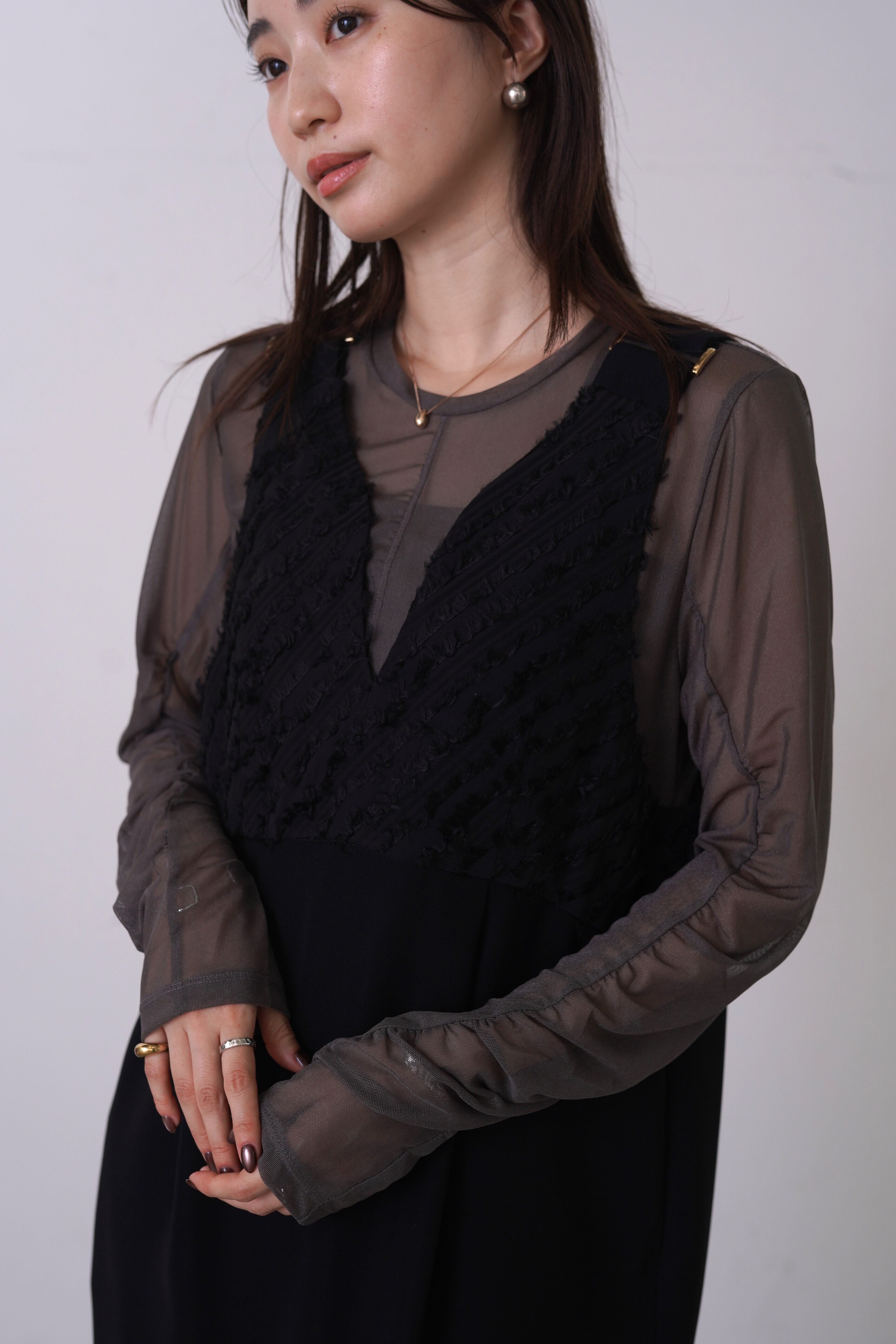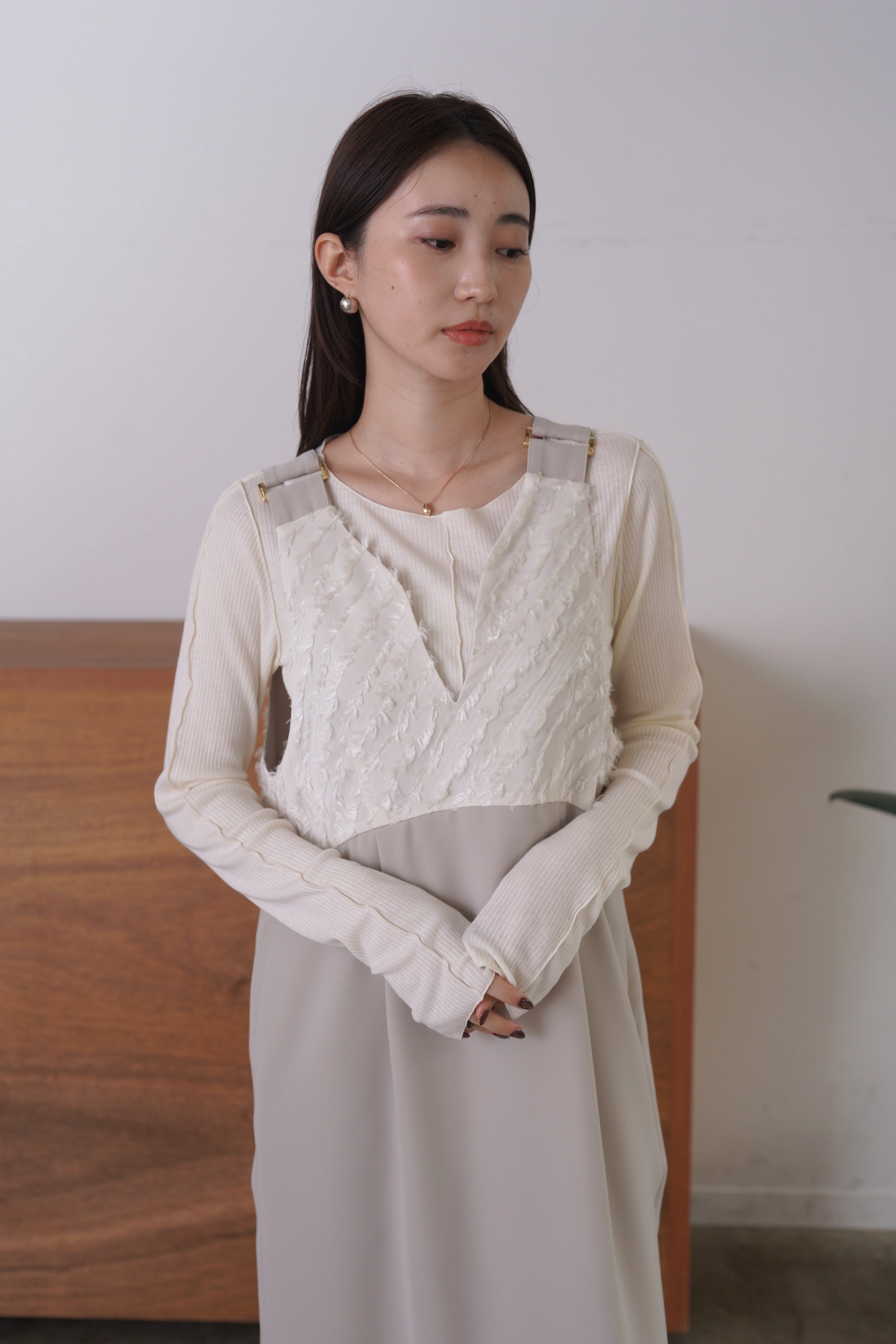 バイアスのフェザージャガードと、ドライタッチなダブルクロスを組み合わせたワンピース。変形のゆるいVネックがすっきりした印象を与えてくれます。シックなスタイリングはもちろん、合わせるインナーでカジュアルにも使える優秀ワンピースです。