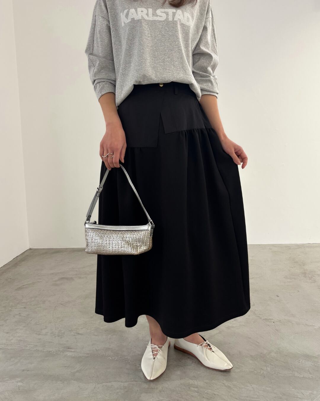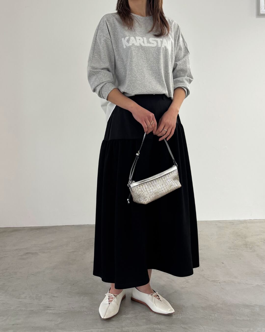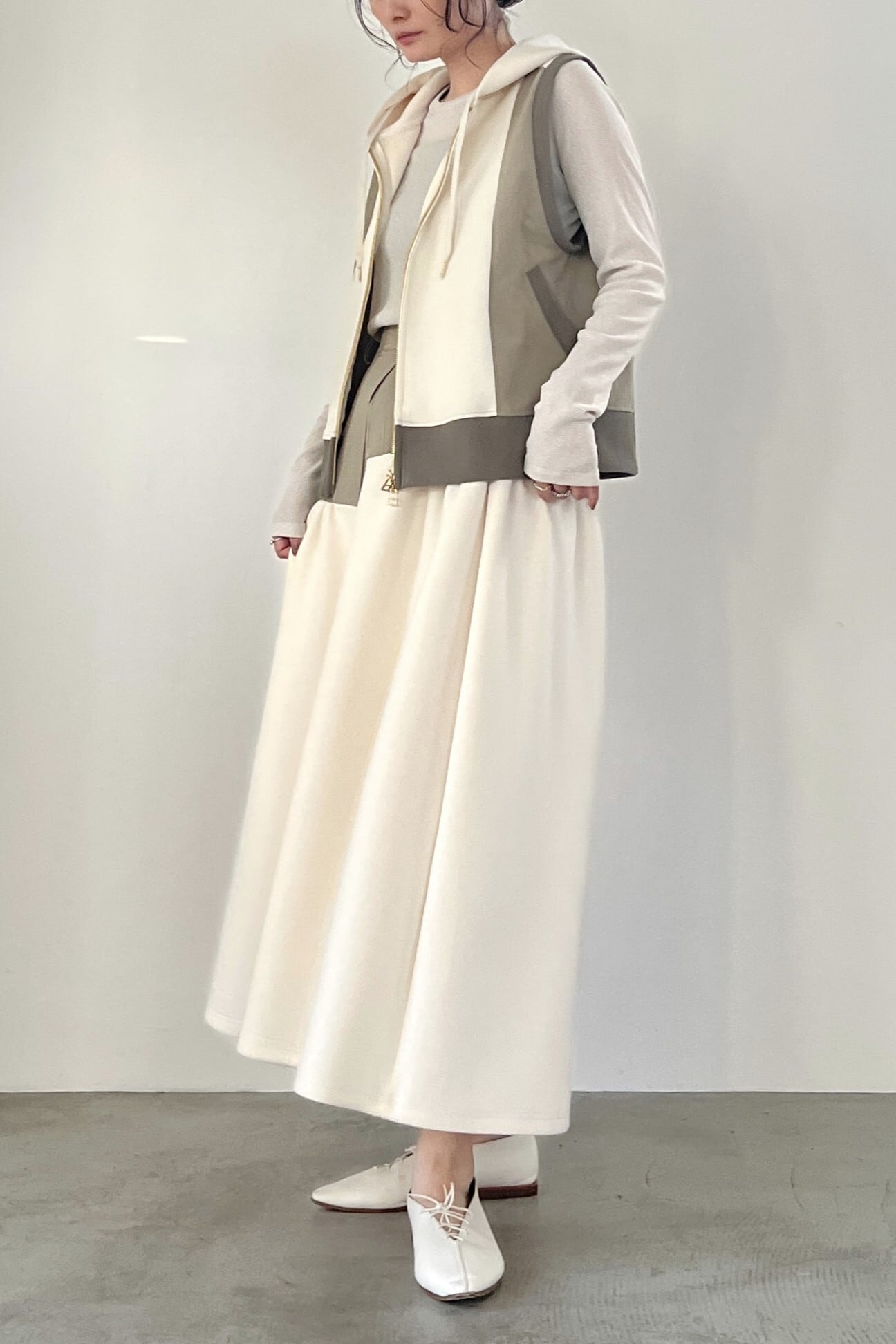 柔らかく軽いダンボールニットに、ハリ感のあるT/Cタフタをドッキングさせたフレアスカート。アシンメトリーなデザインがポイントです。ベルトループがついているので、お手持ちのベルトでウエストマークもしていただけます。同素材のベストも展開しております。