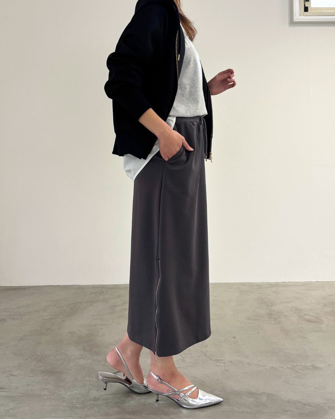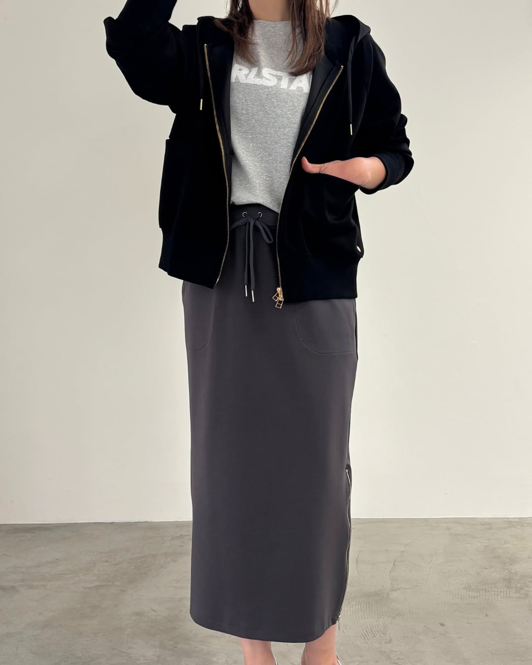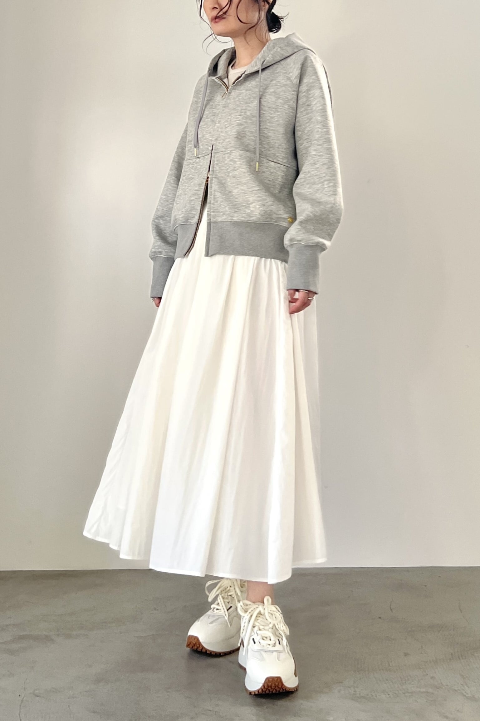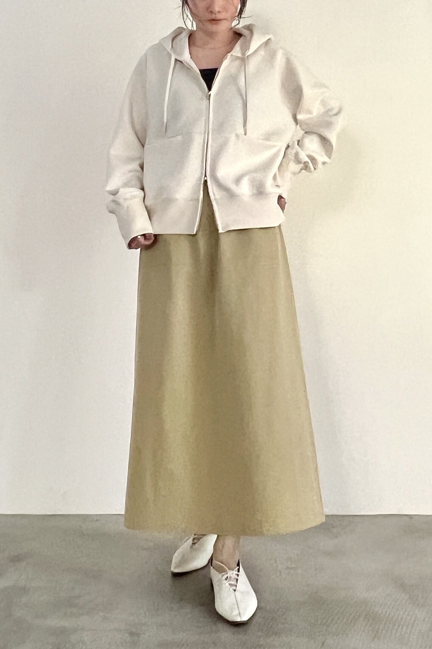 柔らかく軽いダンボールニットを使用したジップパーカー。ダブルジップを使用しており、お好みの位置で止めて着用していただけます。ファスナーや左裾のプレートなど、金属パーツは全てゴールドで揃えており、上品に着用できるジップパーカーです。