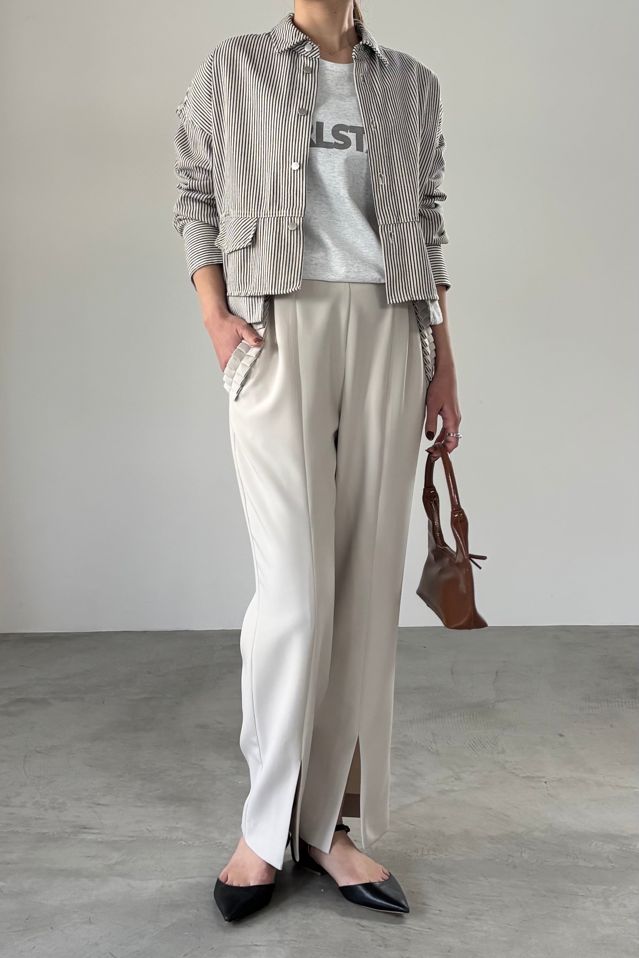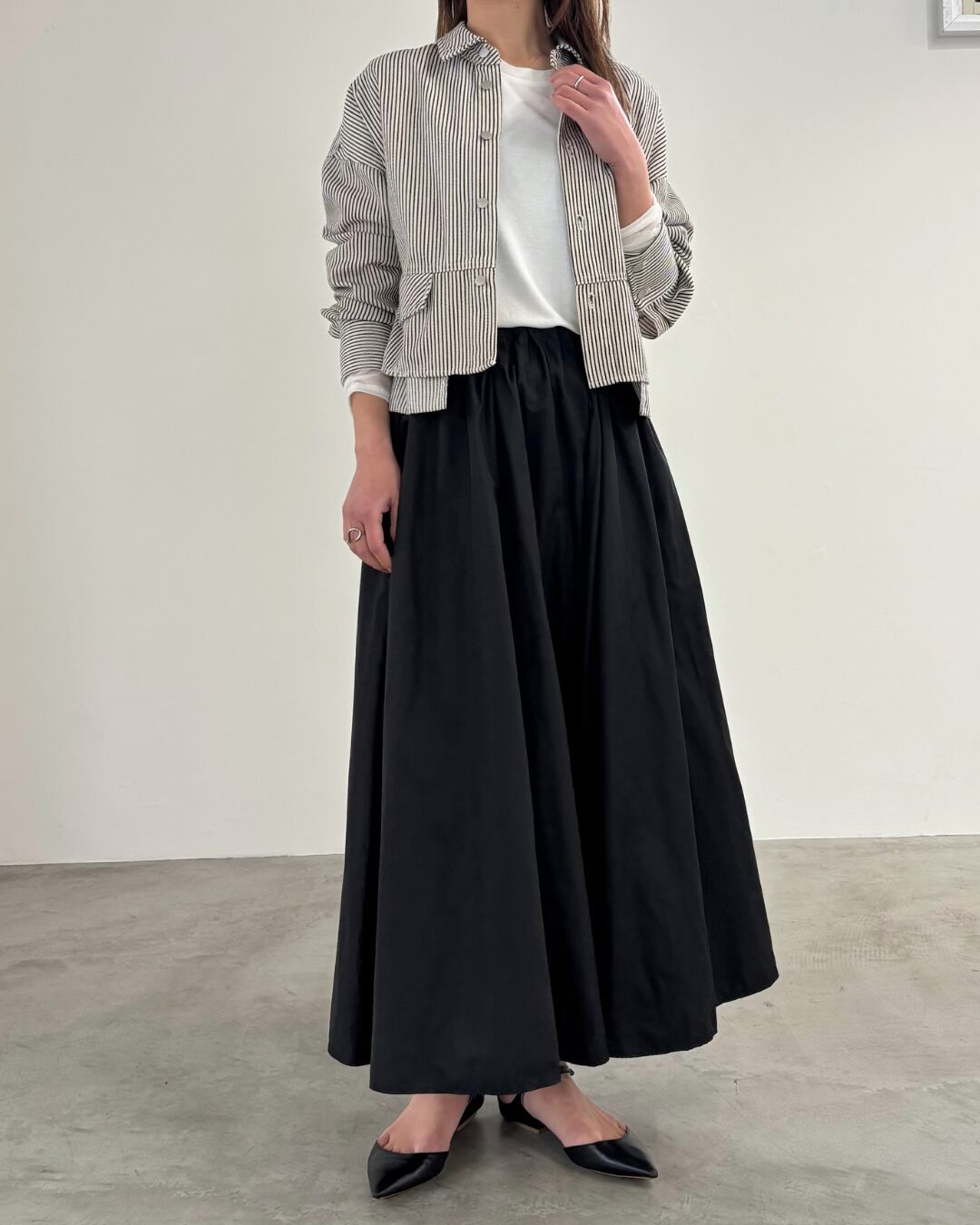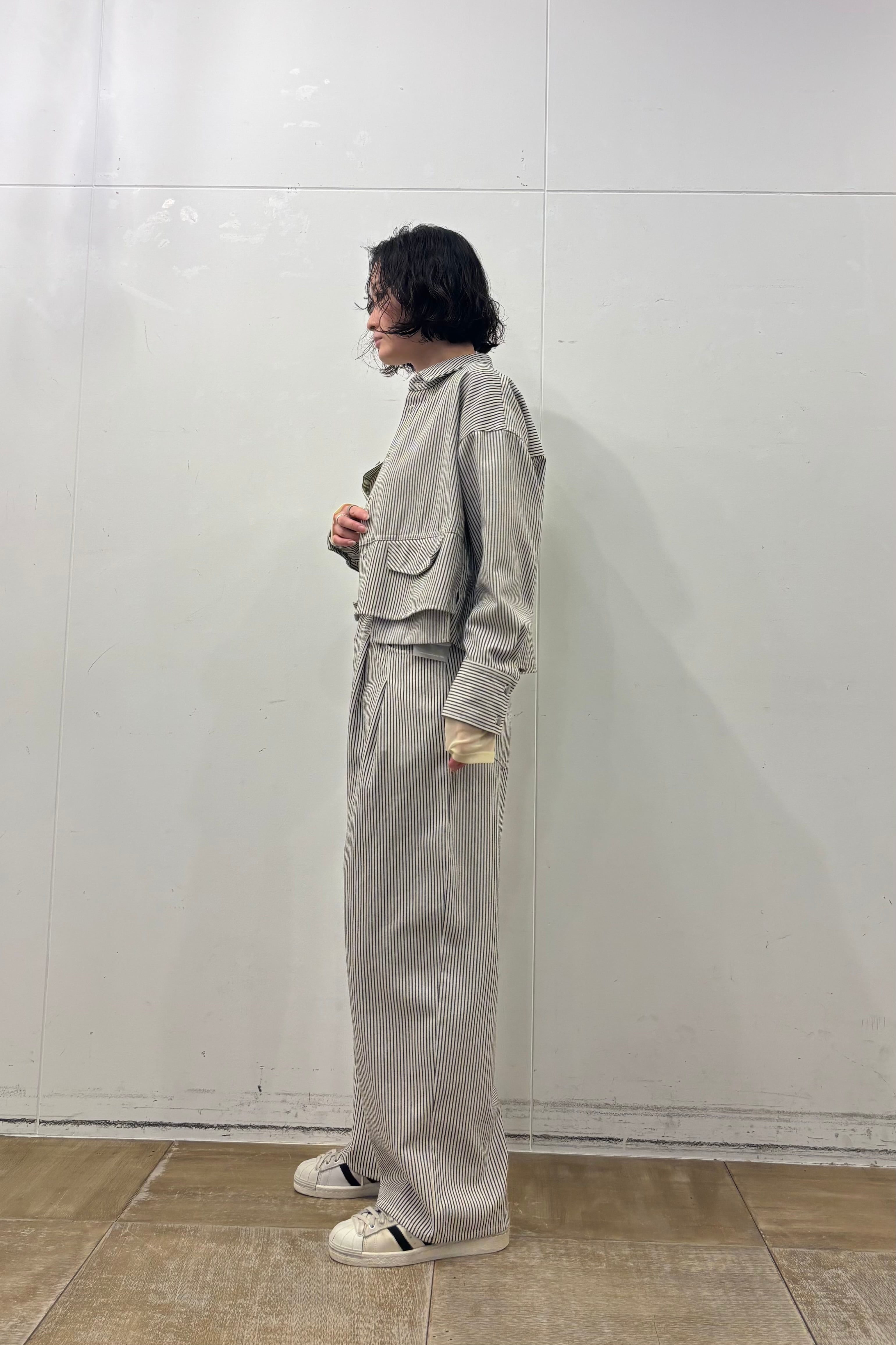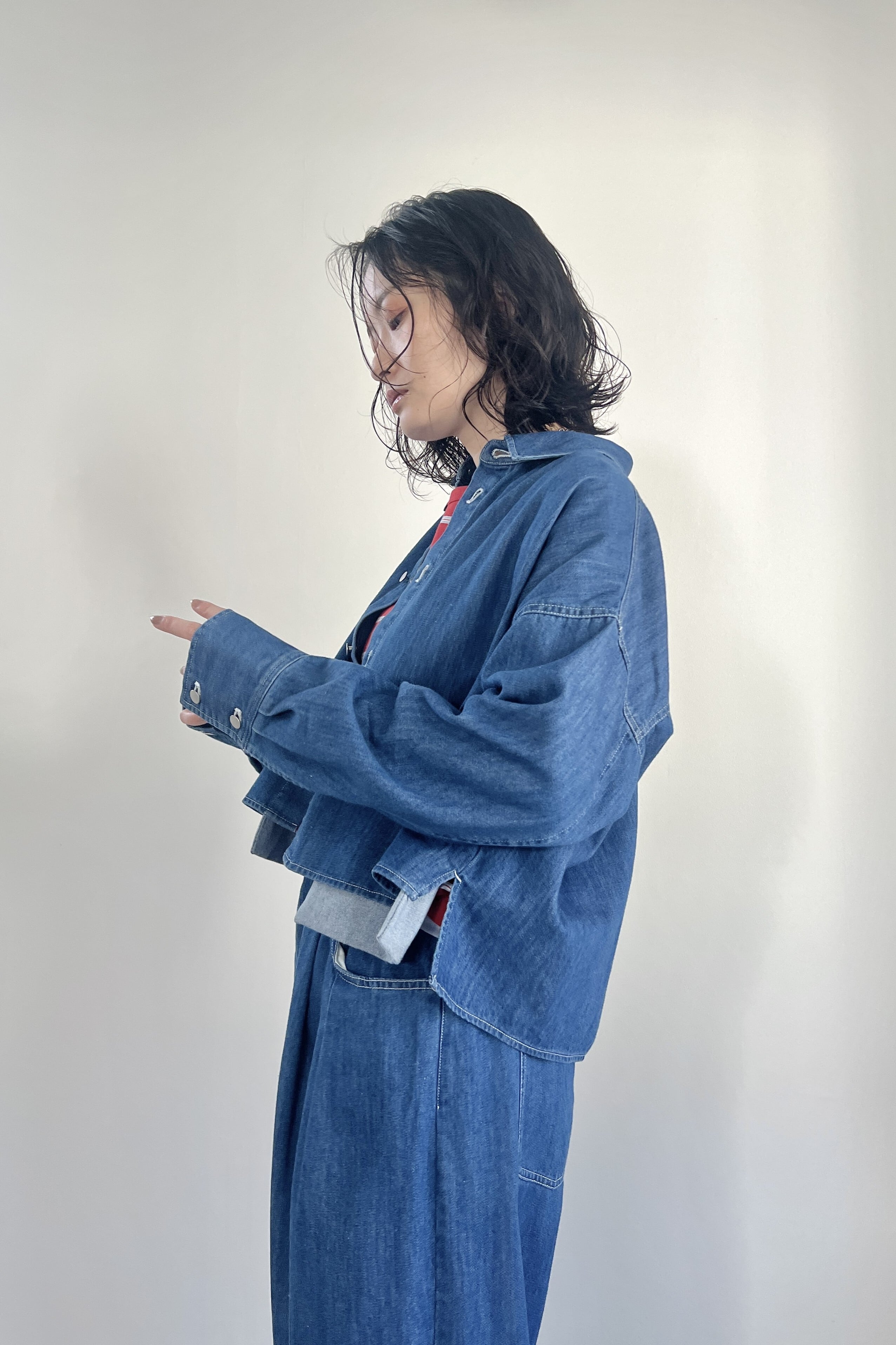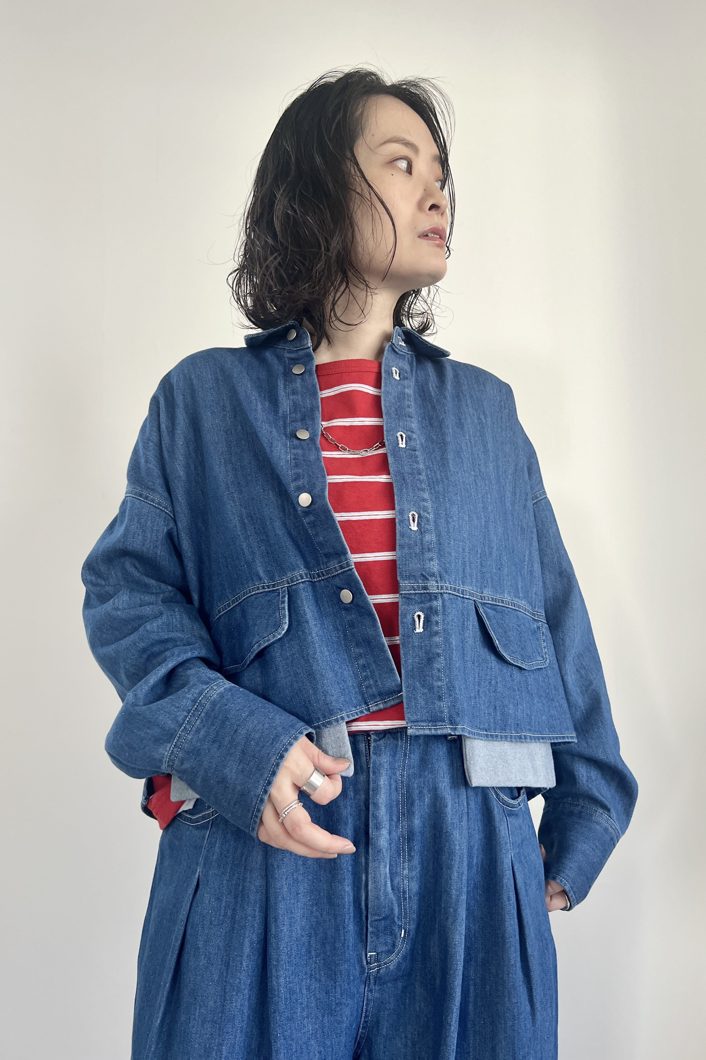 ポケットのデザインが特徴のクロップドシャツ。綿のデニムとヒッコリーに洗い加工を施し、カジュアルに仕上げました。シャツより厚く、ジャケットより薄い肉感なのでライトアウターとしてもロングシーズン重宝します。同素材のパンツとのセットアップもおすすめです。