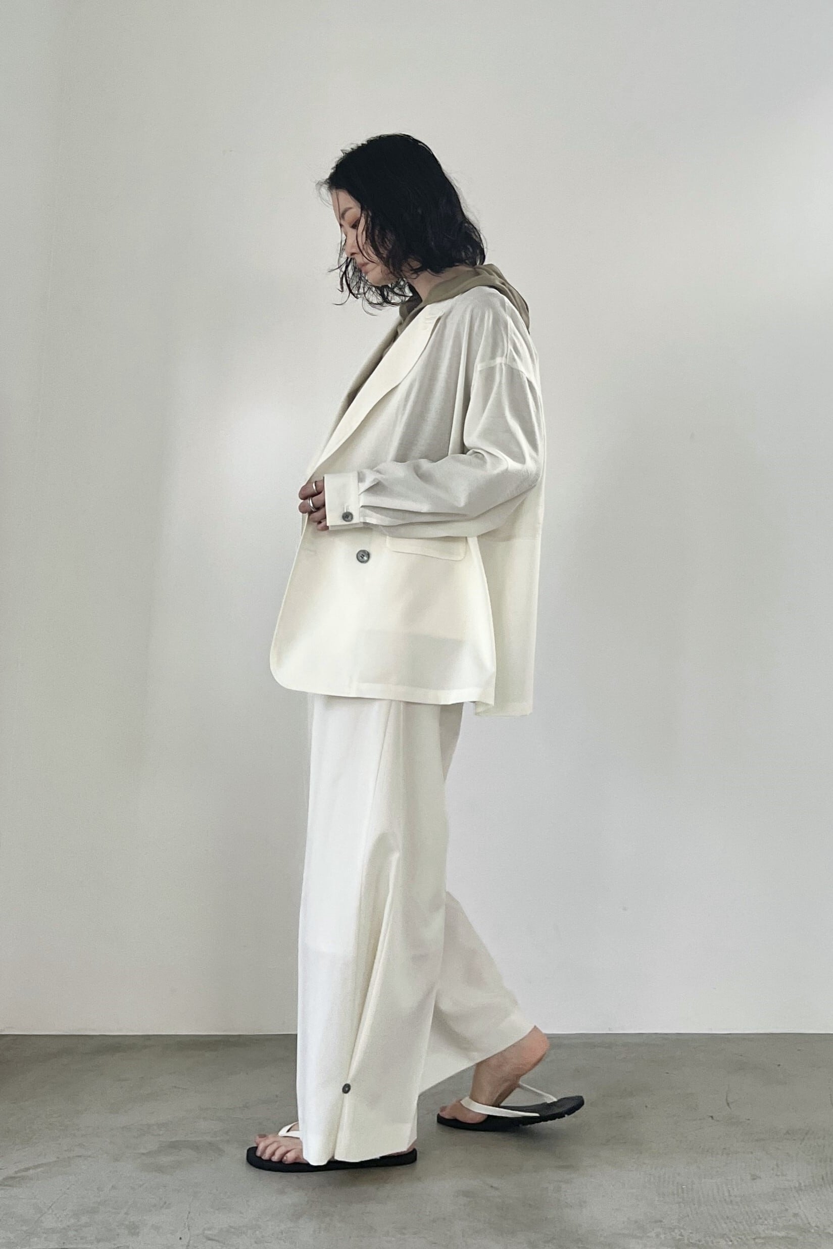 サマーウールのようなポリエステルのトロ素材を使用したスラックスパンツ。両サイドにマチ切り替えを作り、釦で留め外しすることで2通りのシルエットで着用していただけます。ウエストはベルトループ付きの総ゴム仕様で、リラックス感のある履き心地です。同素材のジャケットとのセットアップもおすすめです。