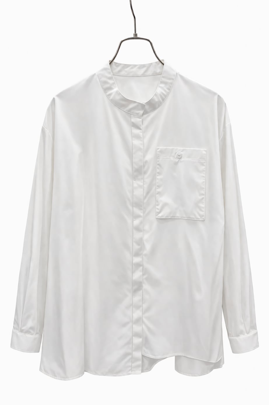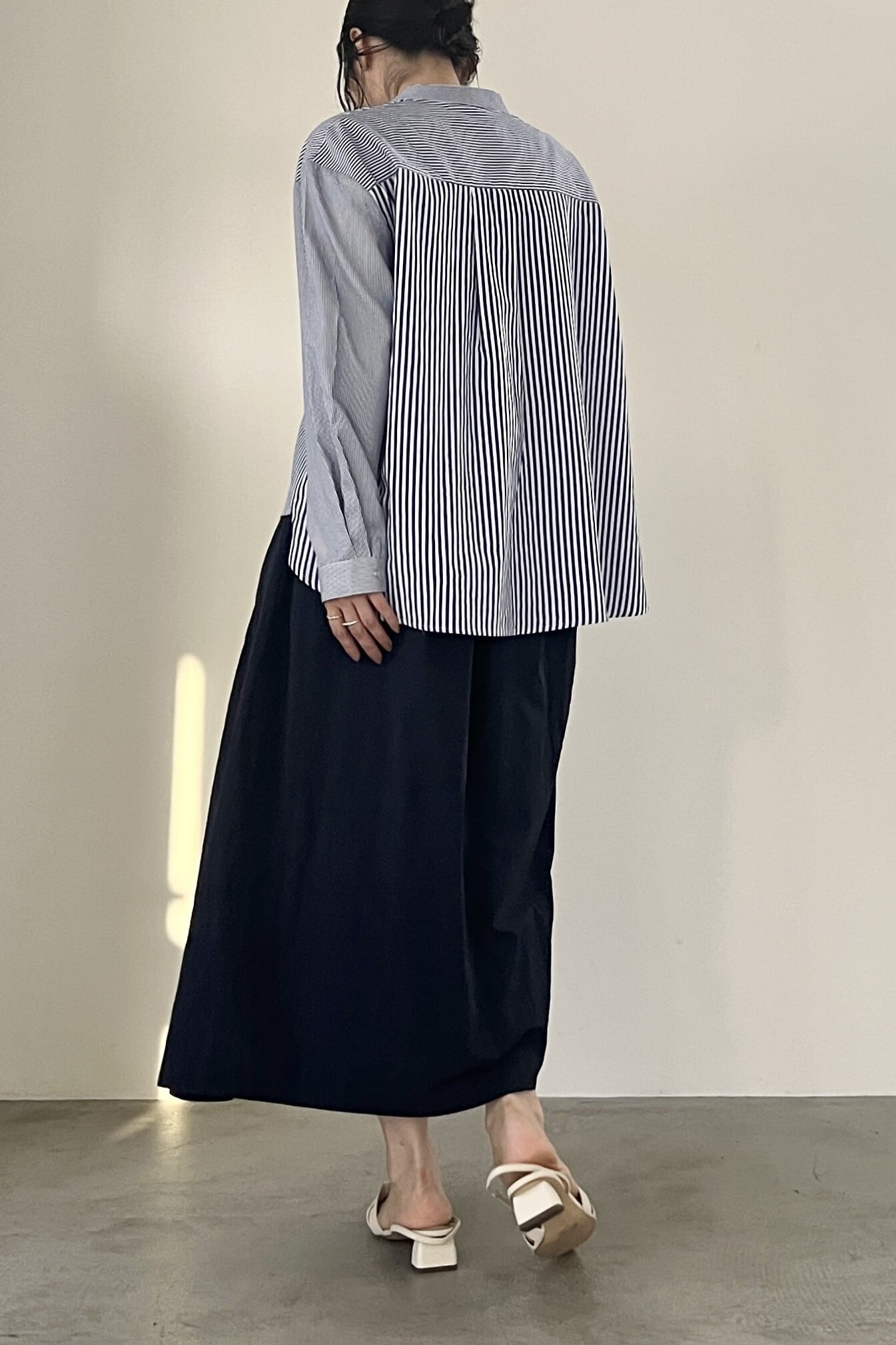 左右で丈やフレア分量の違う、アシンメトリーのノーカラーシャツ。アシンメトリーのノーカラーシャツ。シルエットはすっきりしており、綺麗めに着用していただけます。ストライプは太さの違う3種類のストライプを使用しております。
