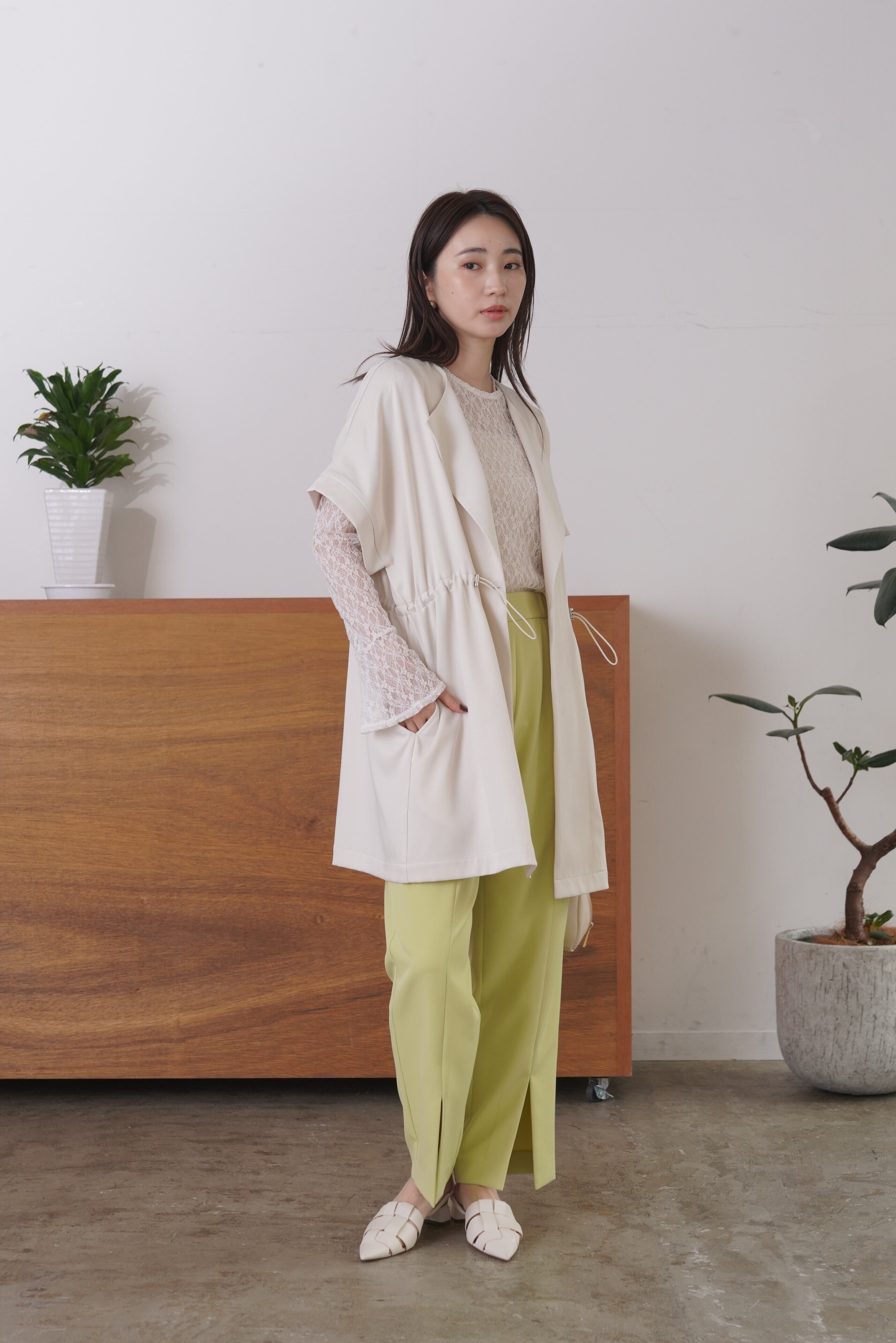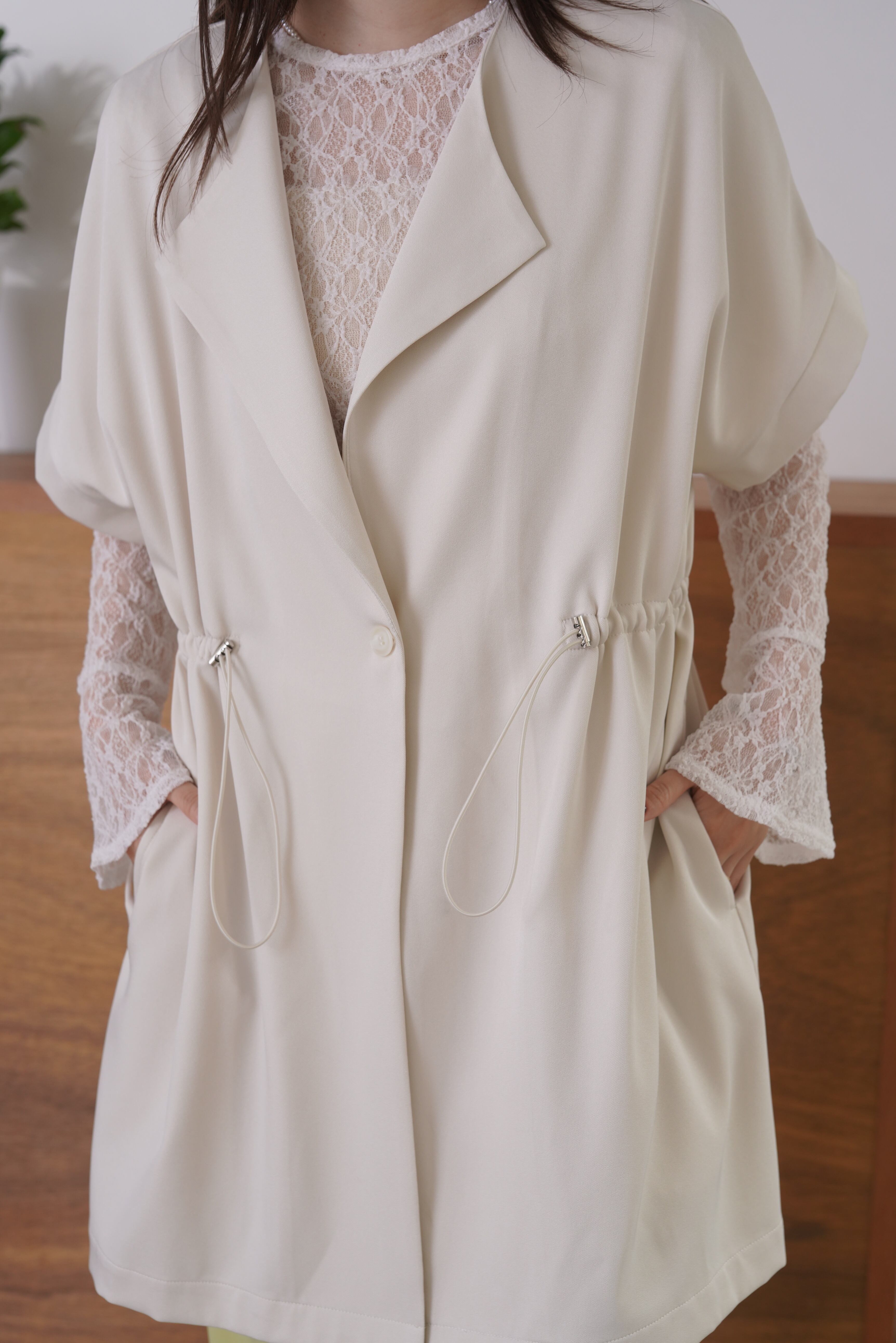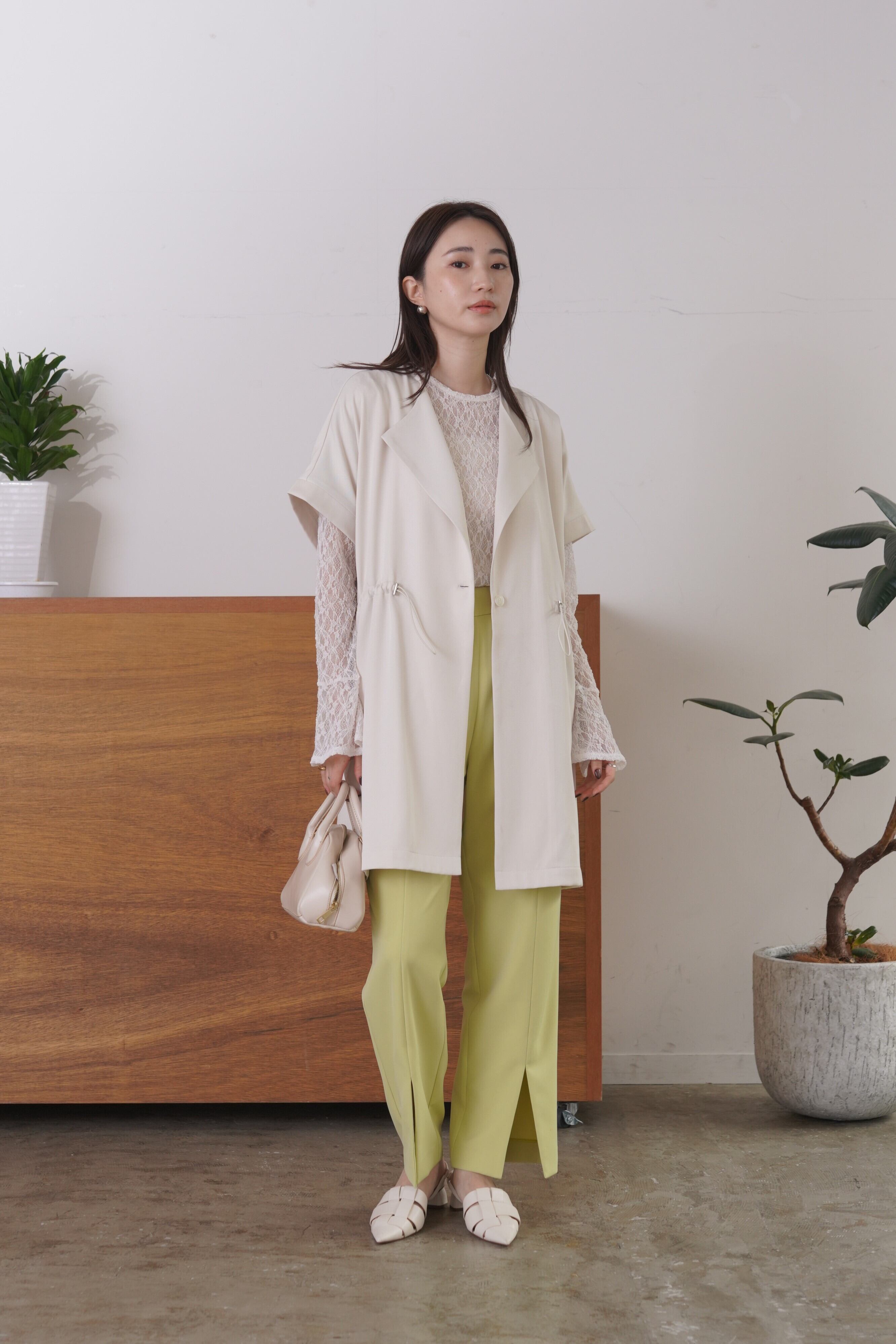 楽に羽織れて上品に見せてくれる、リラクシーシルエットのジレ。ウエストのドローコードギャザーが活きる落ち感のきれいなツイル素材を使用。オケージョンシーンはもちろん、カジュアルダウンにもぴったりなアイテムです。