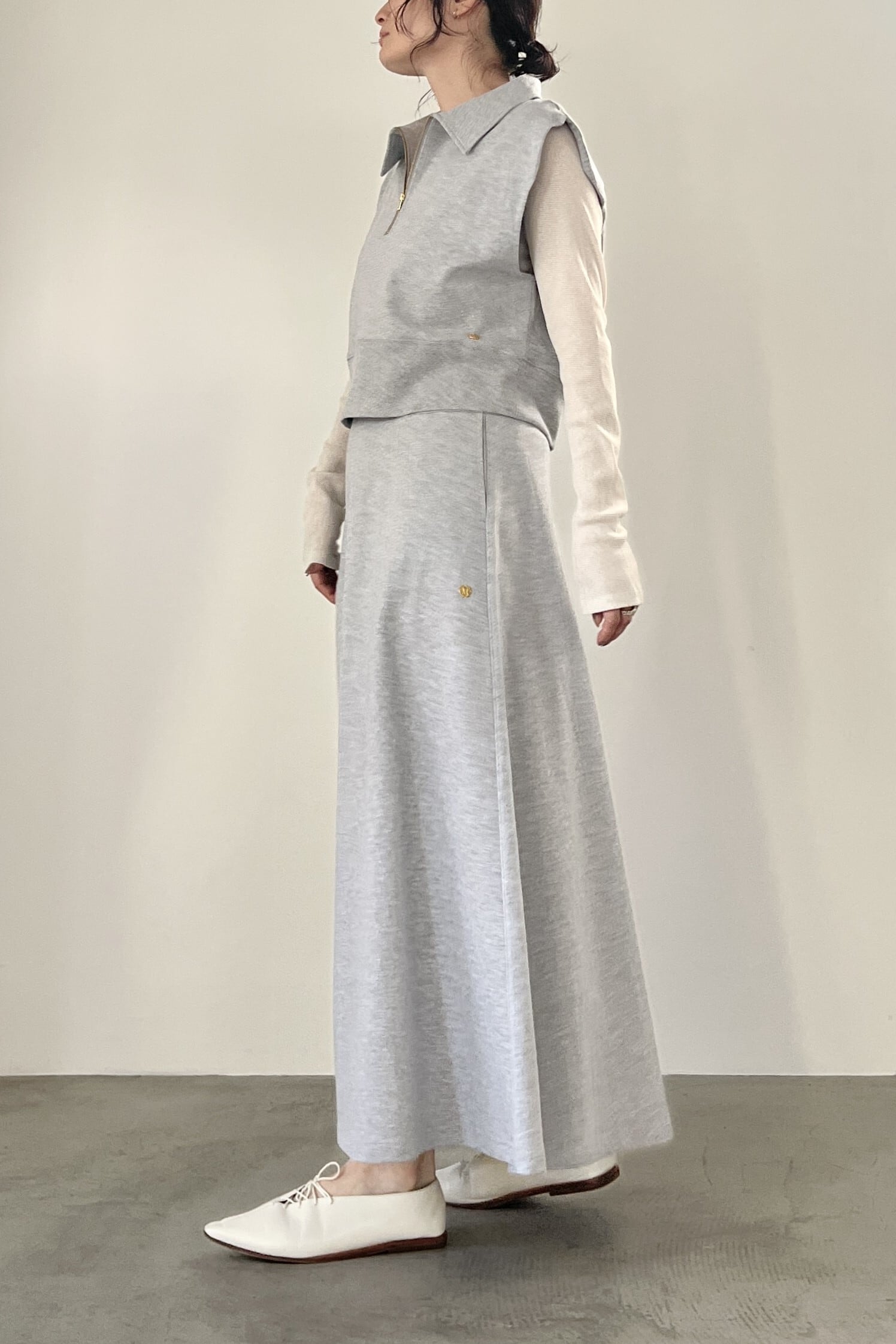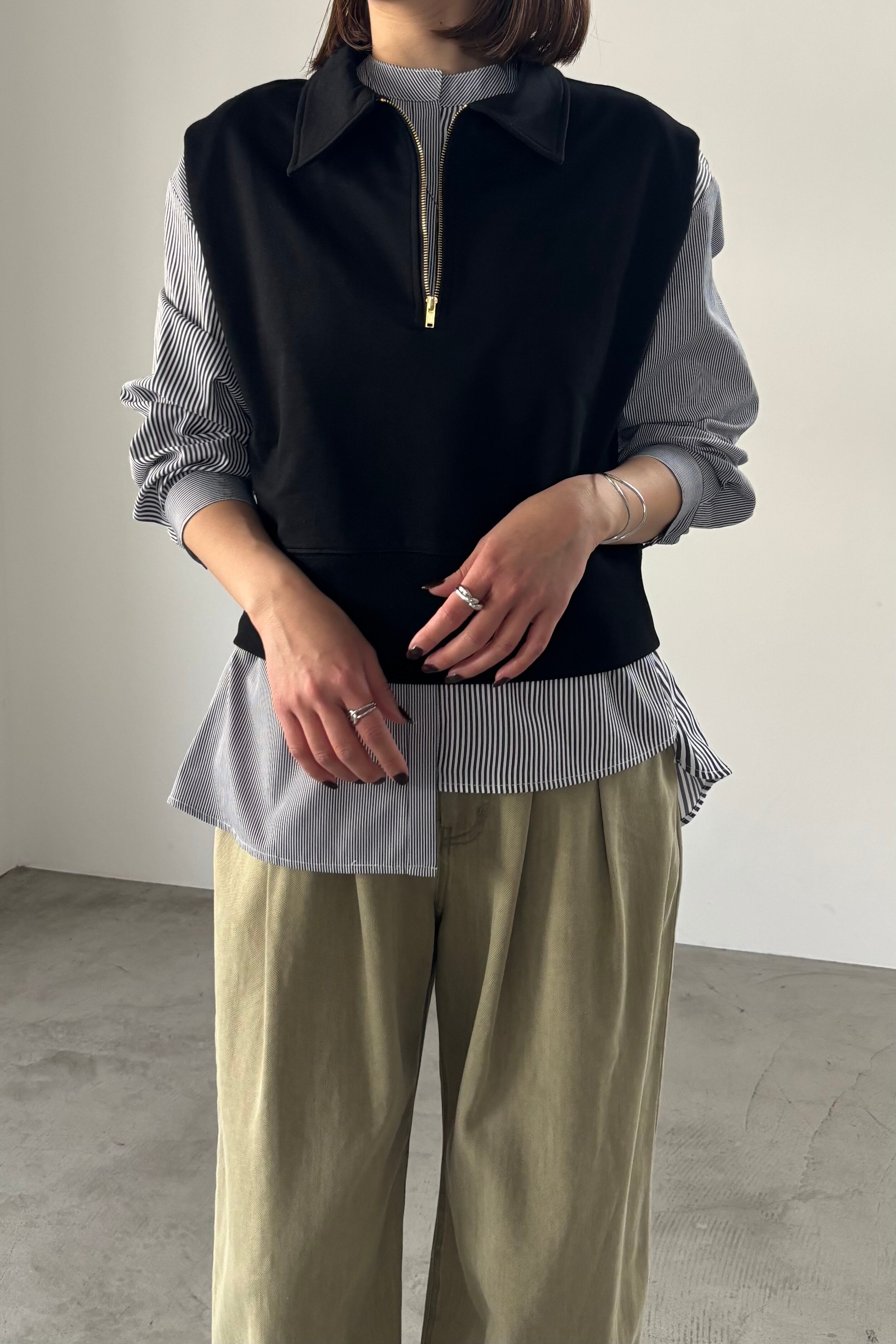 軽くて薄いミニ裏毛素材のハーフジップベスト。ショート丈で脚長効果も抜群です。シンプルなデザインと絶妙なサイズ感で、シャツやインナーでレイヤードスタイルを楽しめます。同素材のスカートとのセットアップ使いもおすすめです。
