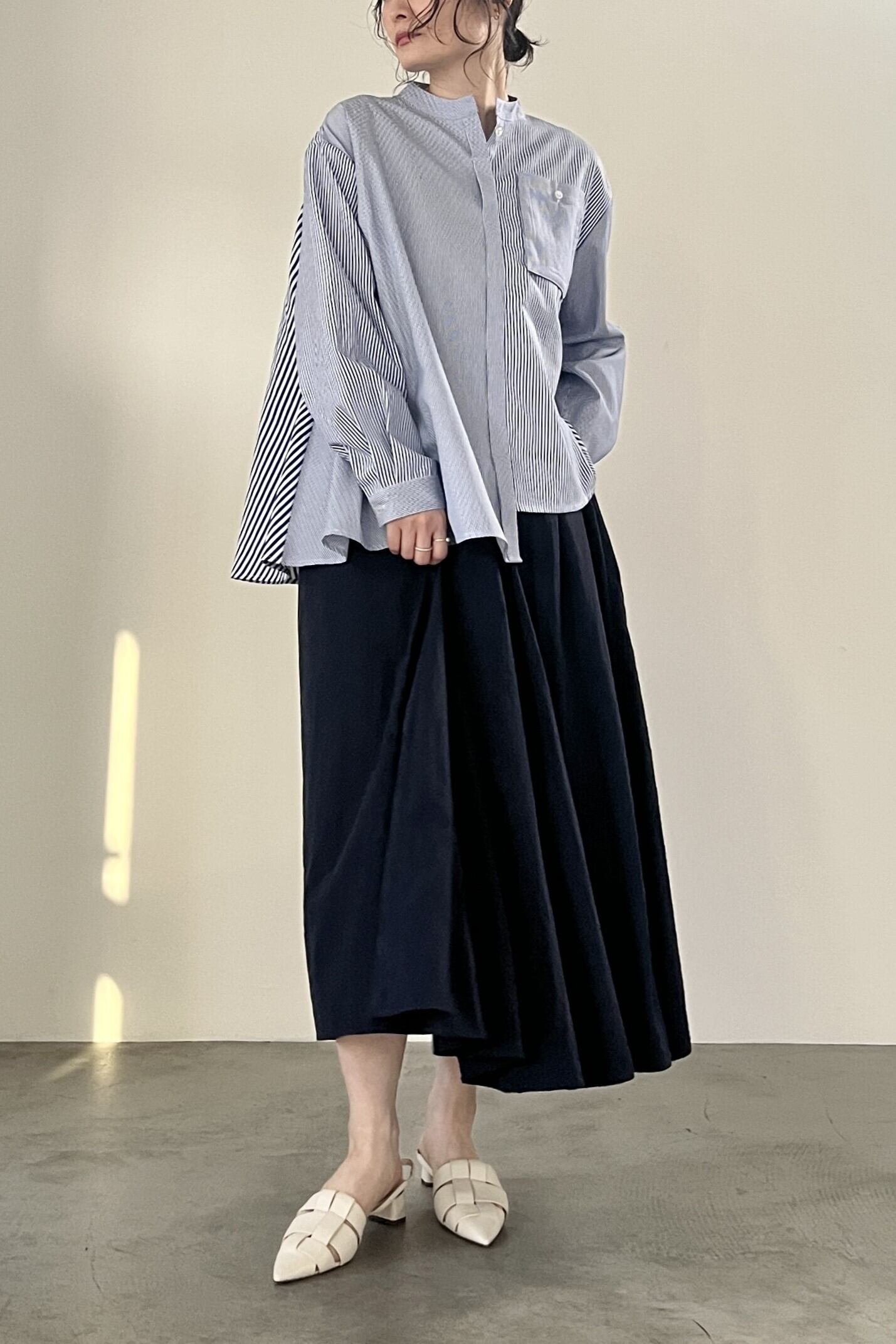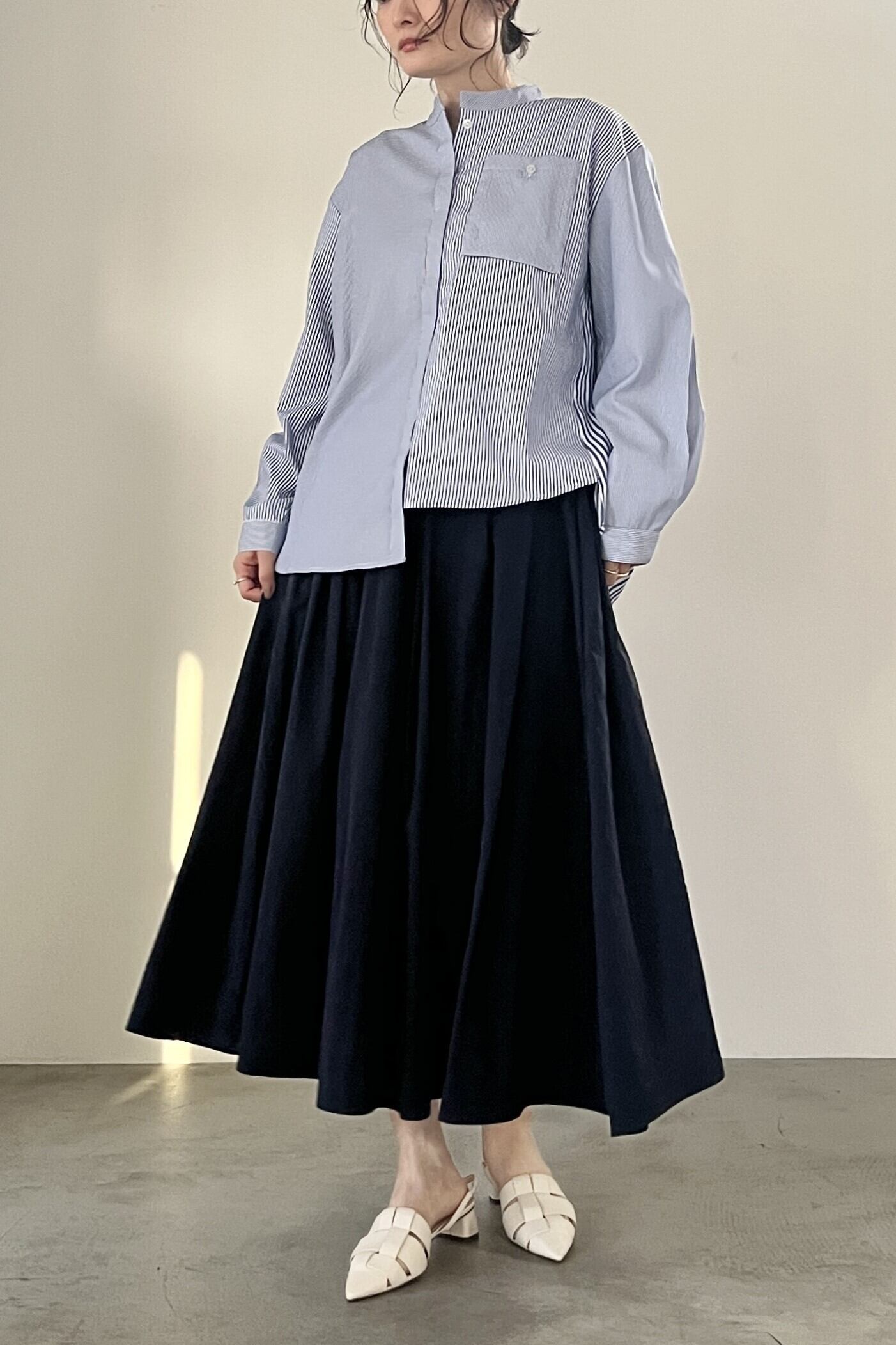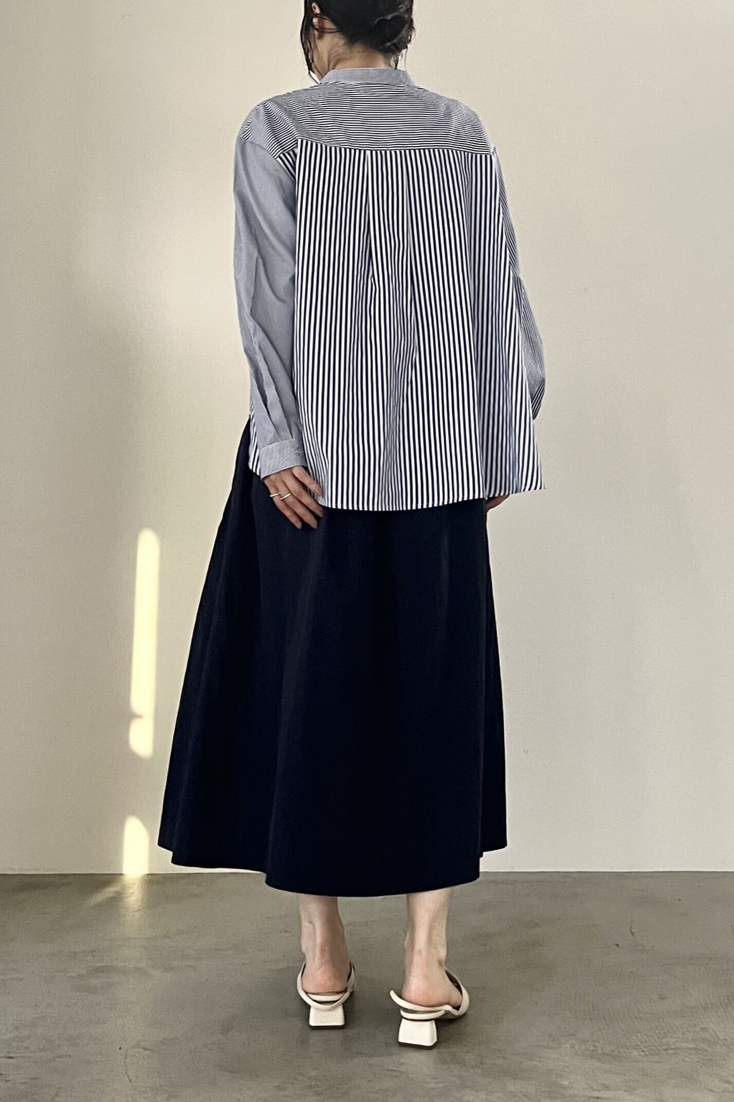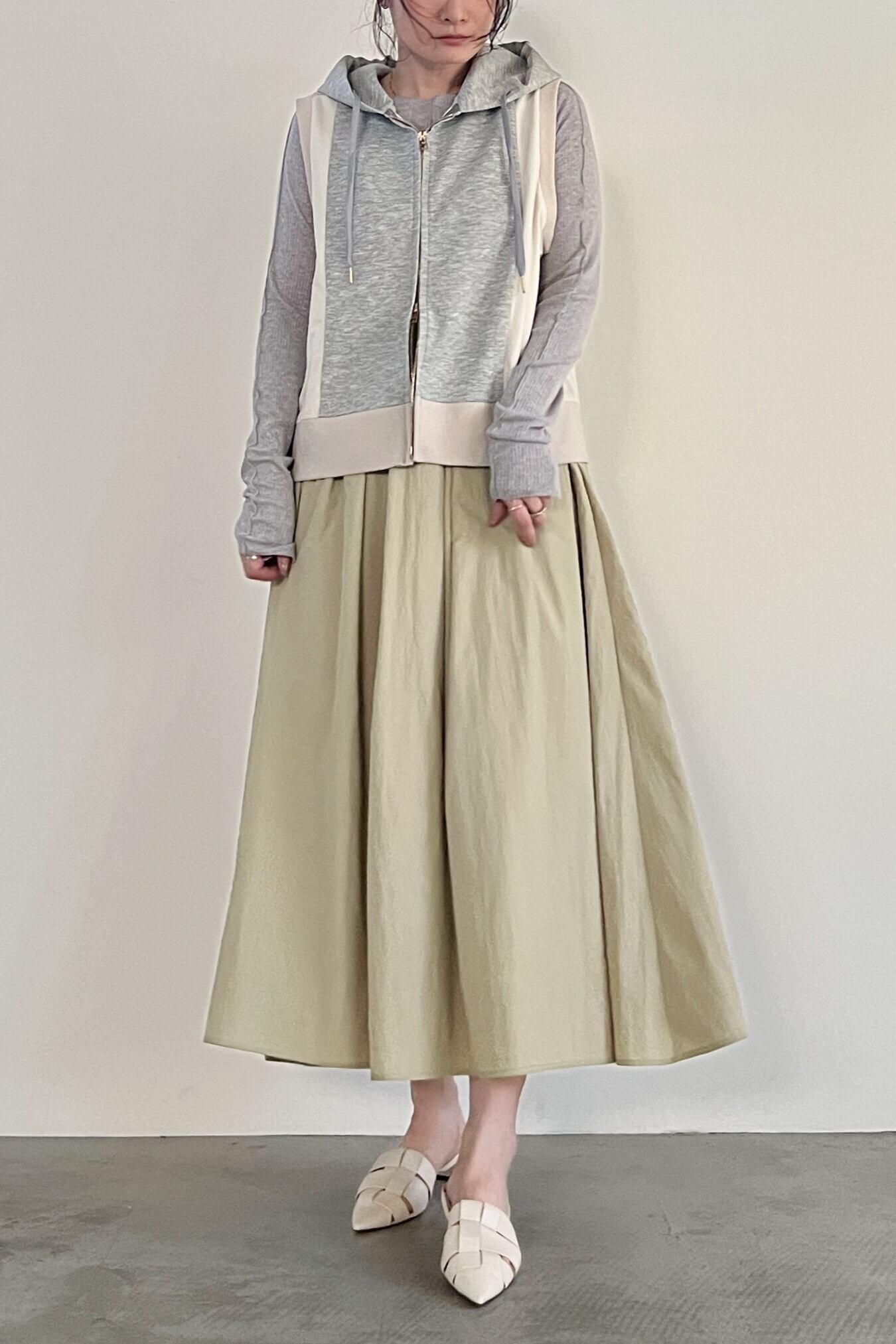 軽やかでエアリー感のあるナイロンタフタのフレアスカート。前ウエスト部分に不規則に散りばめられたタックがデザインのポイントです。後ろにもたっぷりとギャザーが入っており、カジュアルにも綺麗めにも着用していただけるスカートです。