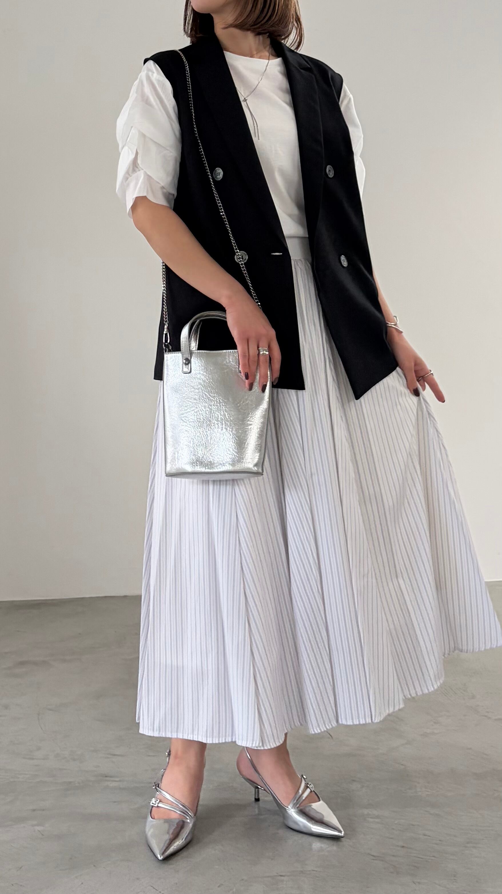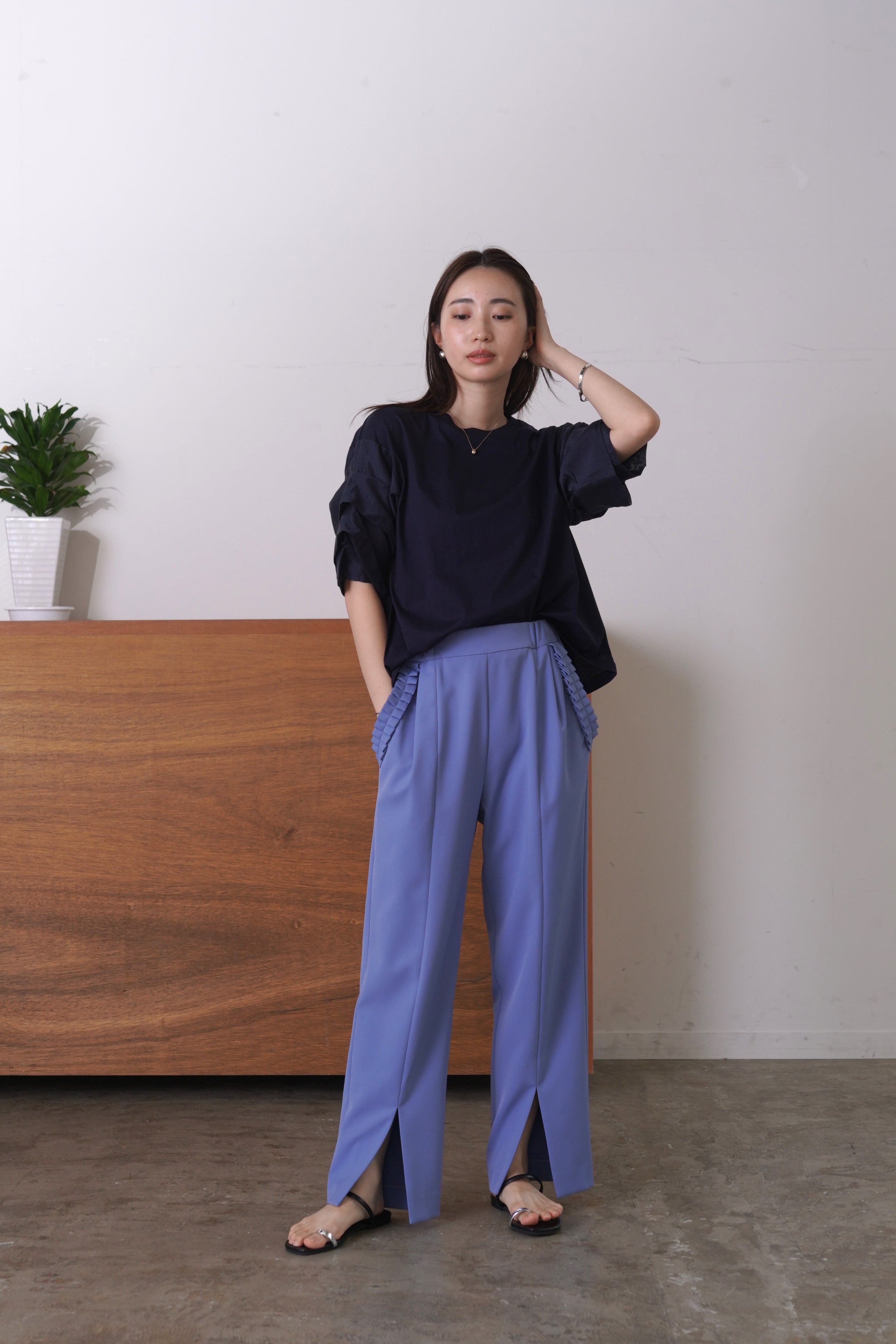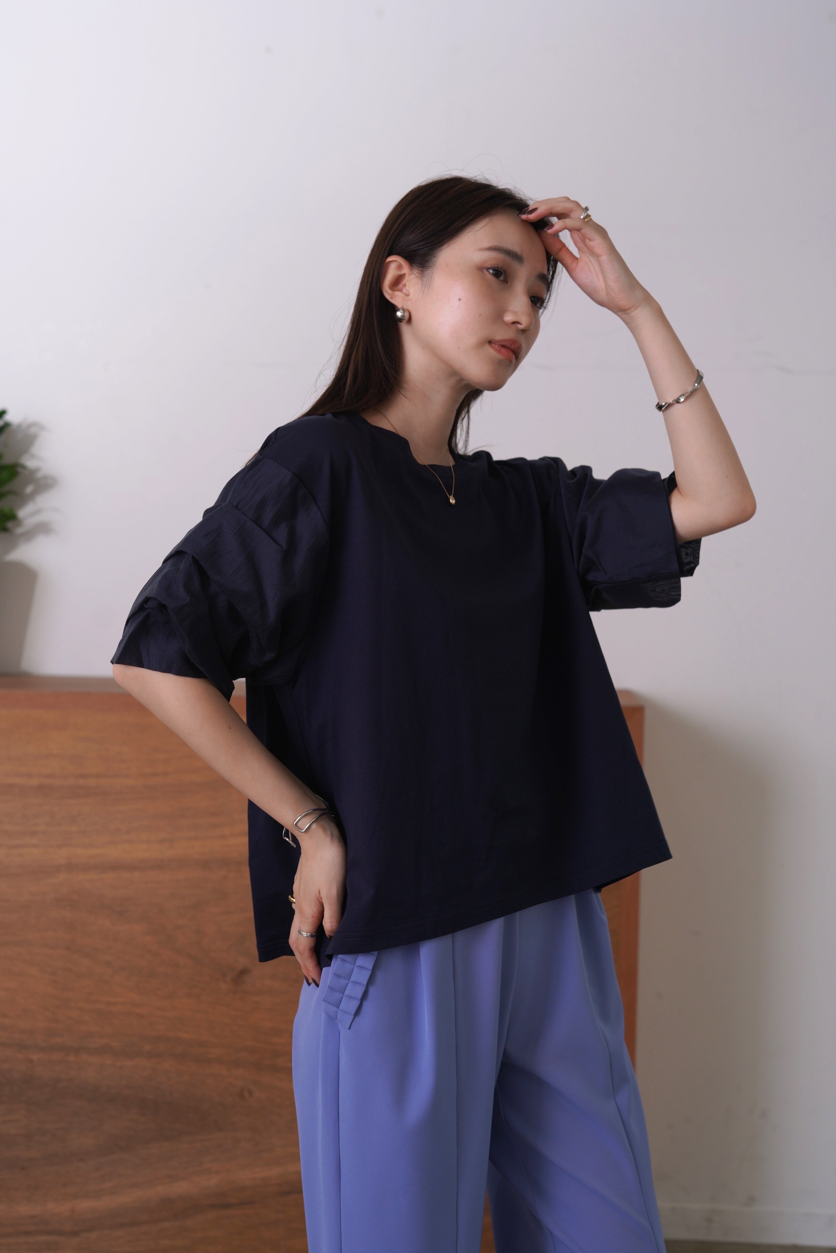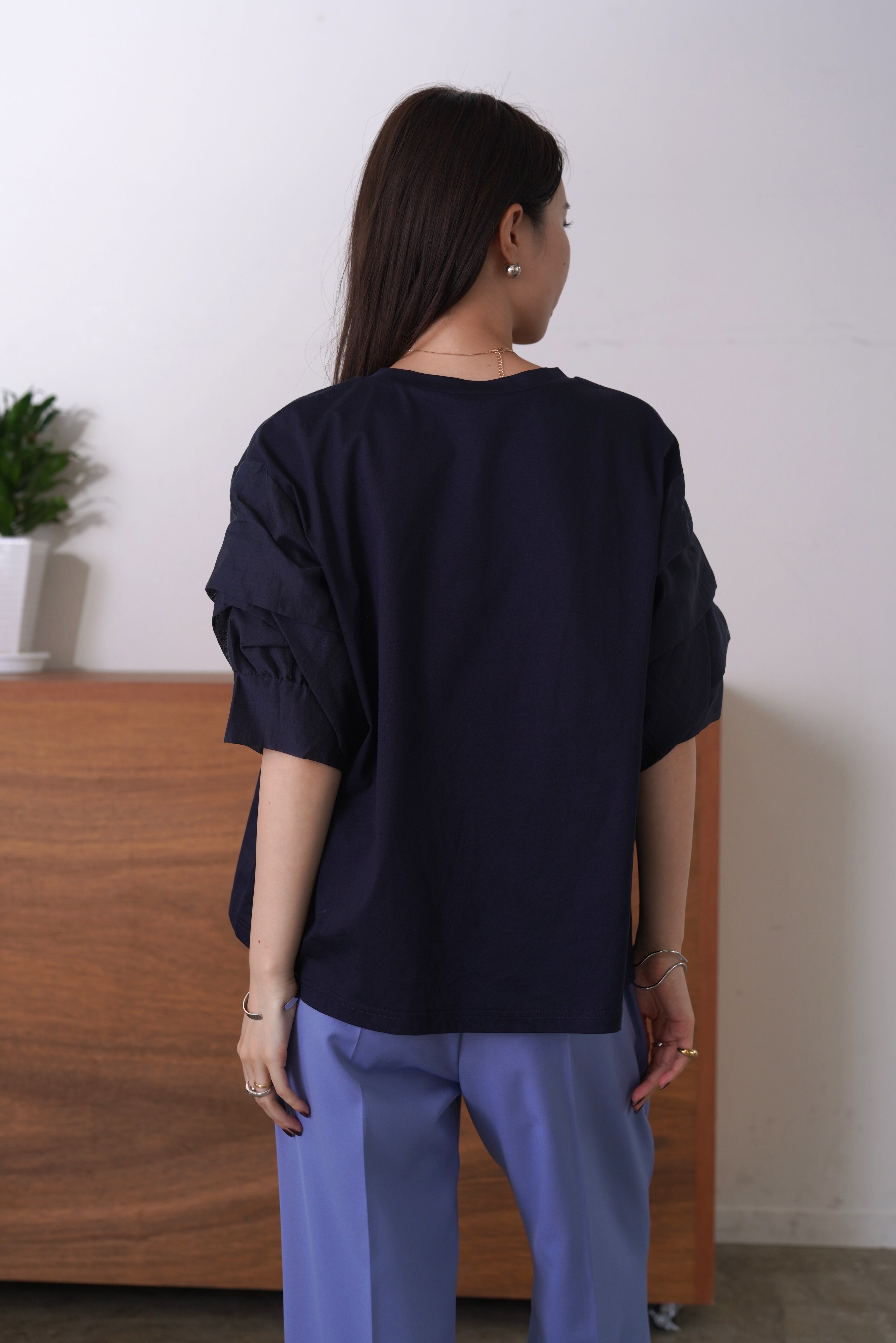 袖に微光沢のあるシャイニーローンを組み合わせ、タックで立体感を出したカットソー。1枚としてはもちろん、サロペットやジャンパースカート、ジレのインナーとしてもスタイリングを華やかにしてくれます。