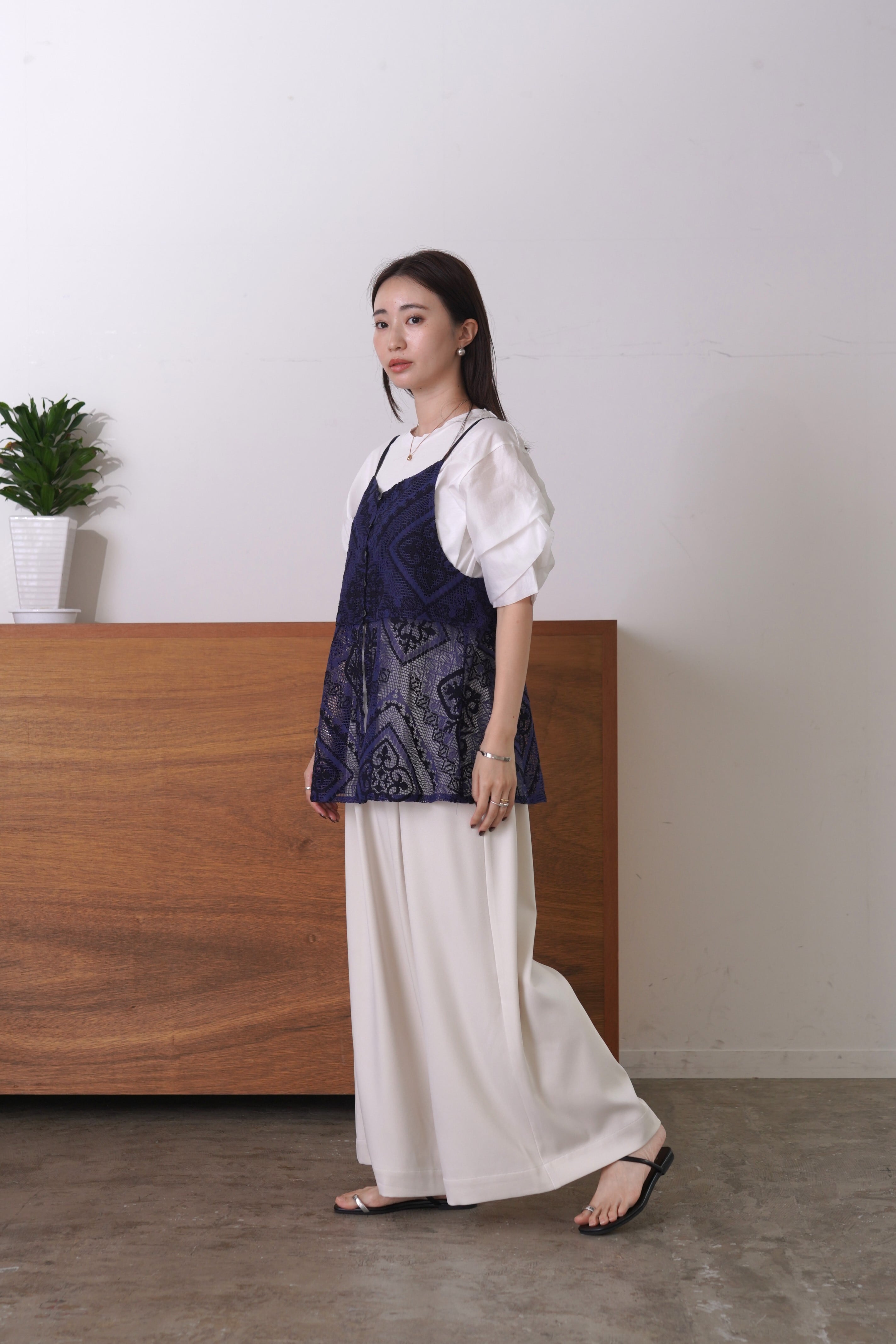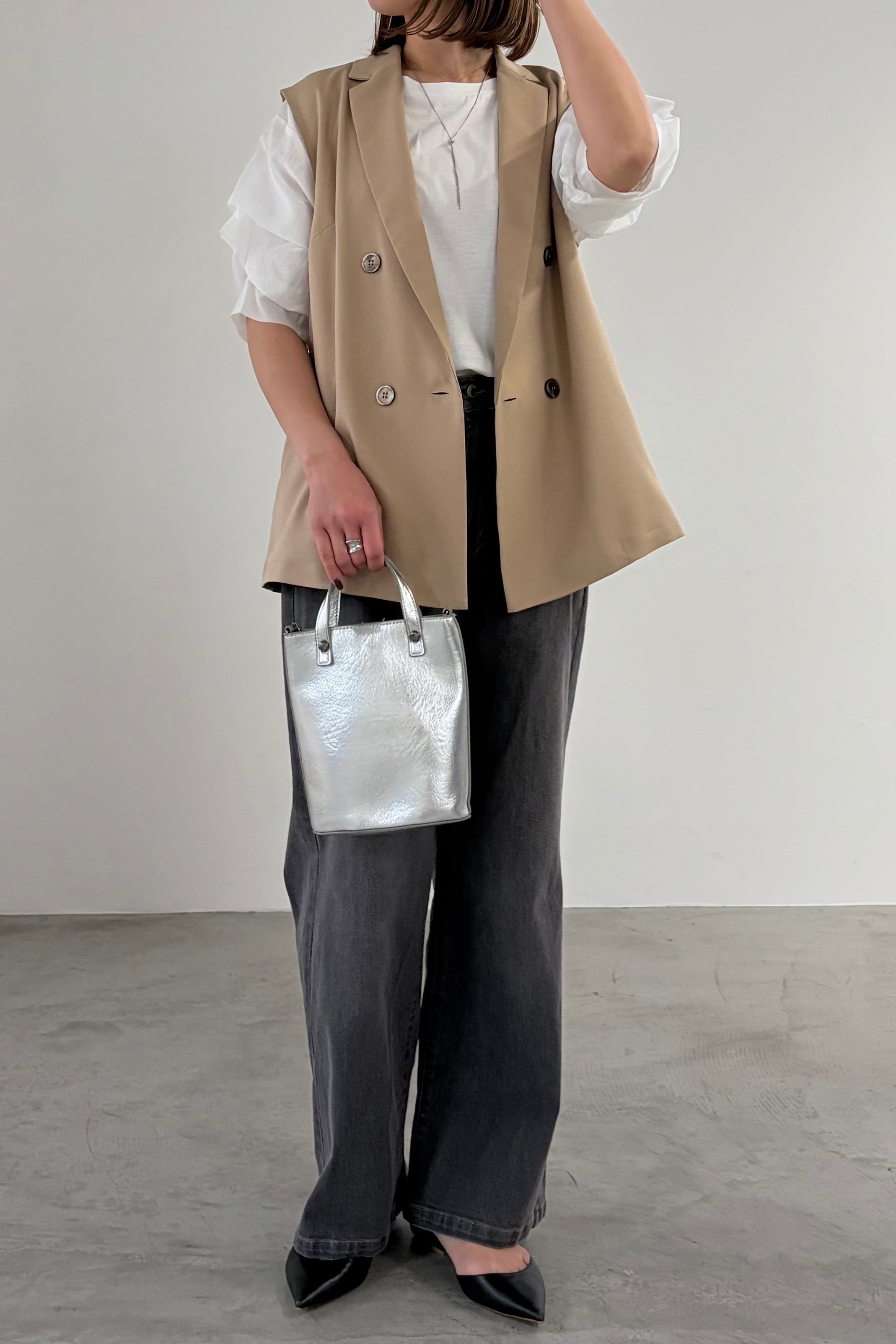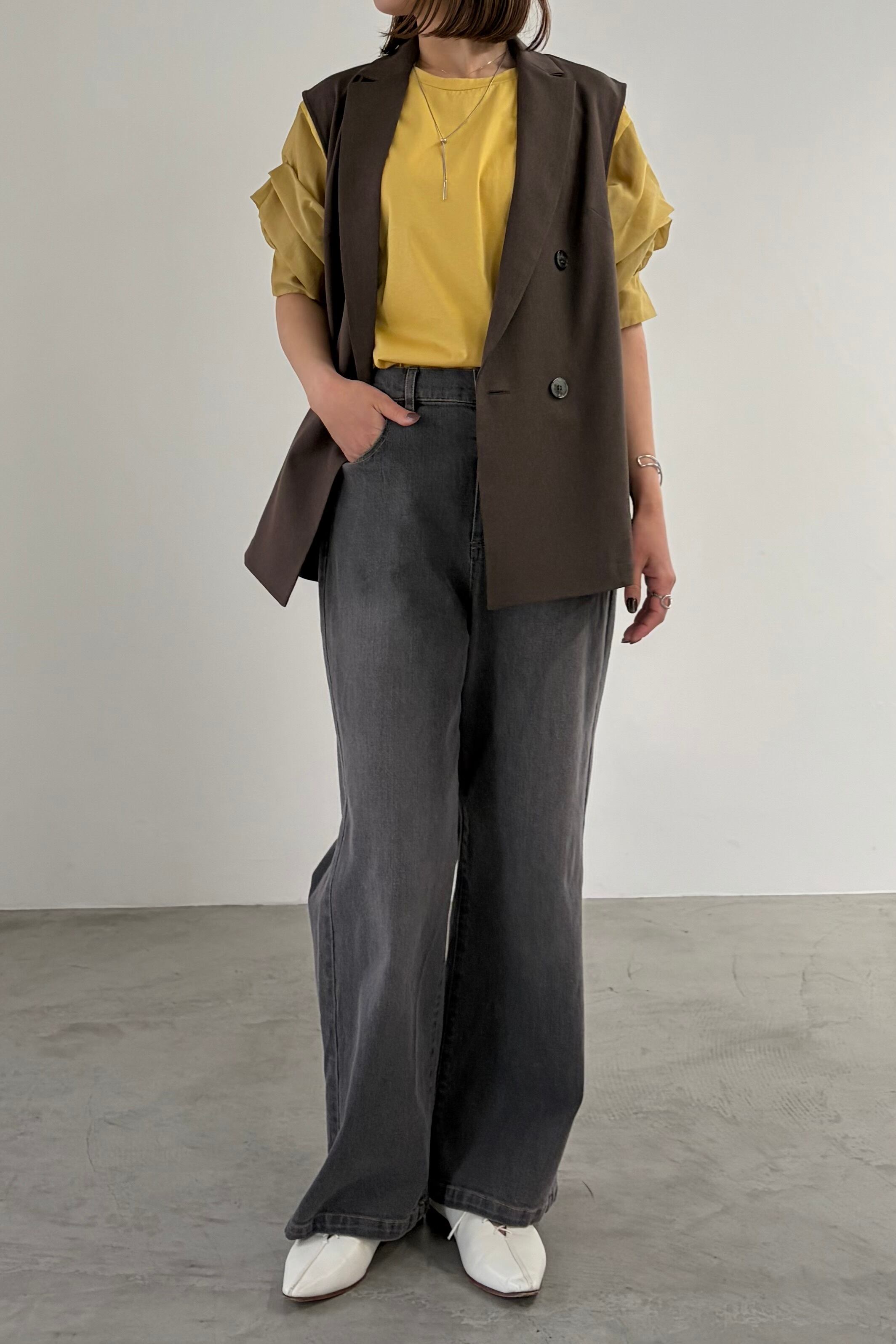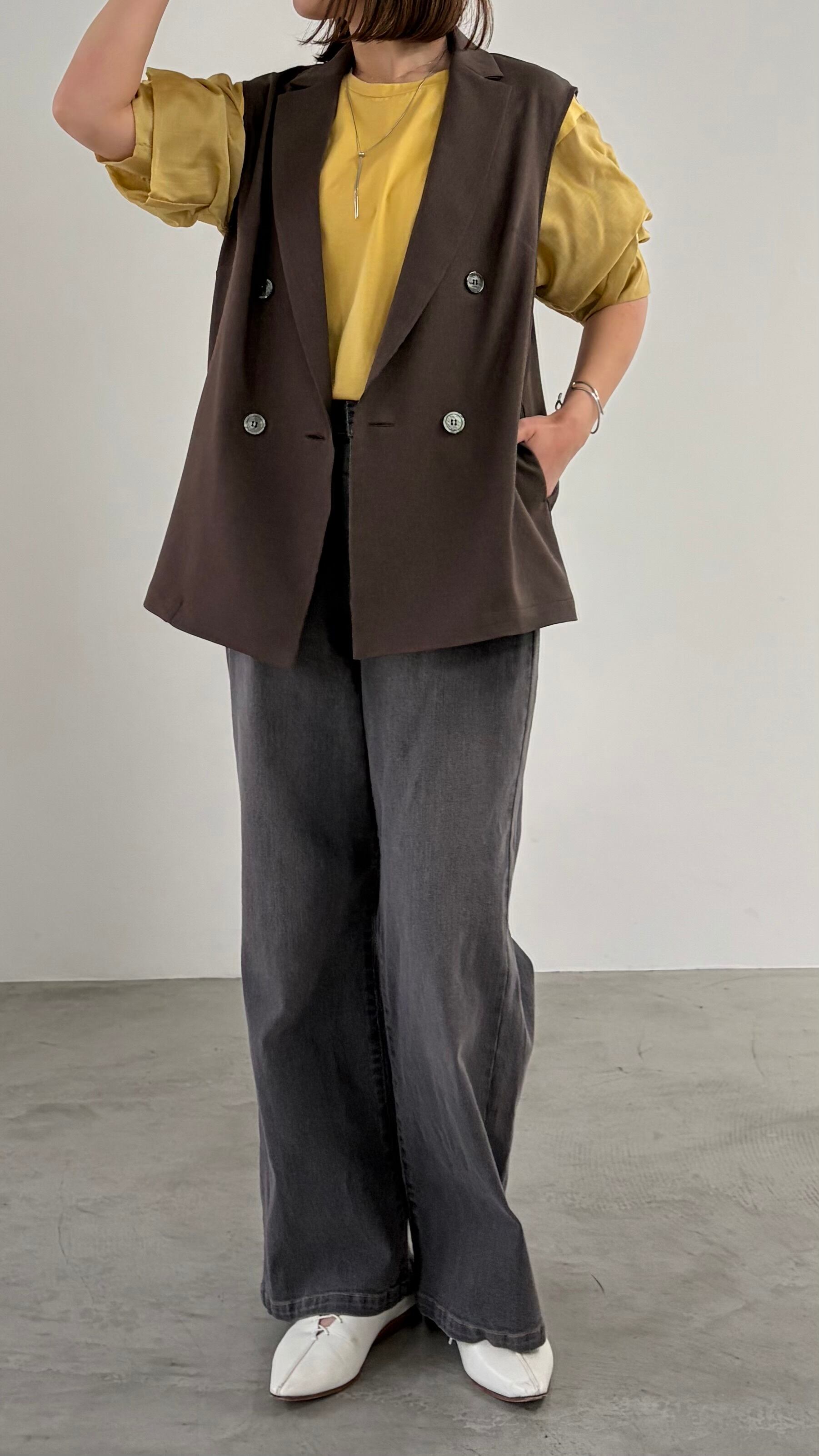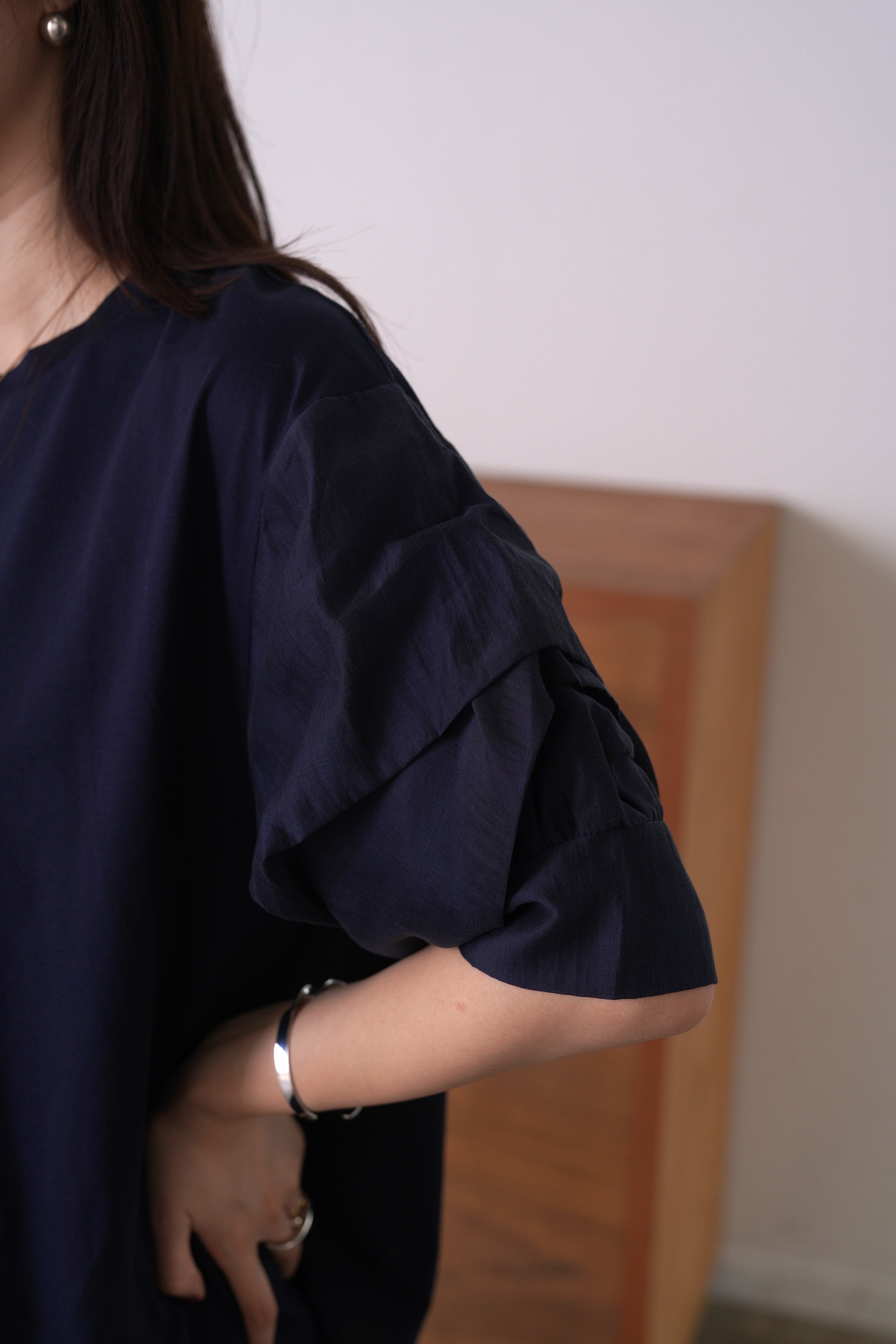 袖に微光沢のあるシャイニーローンを組み合わせ、タックで立体感を出したカットソー。1枚としてはもちろん、サロペットやジャンパースカート、ジレのインナーとしてもスタイリングを華やかにしてくれます。