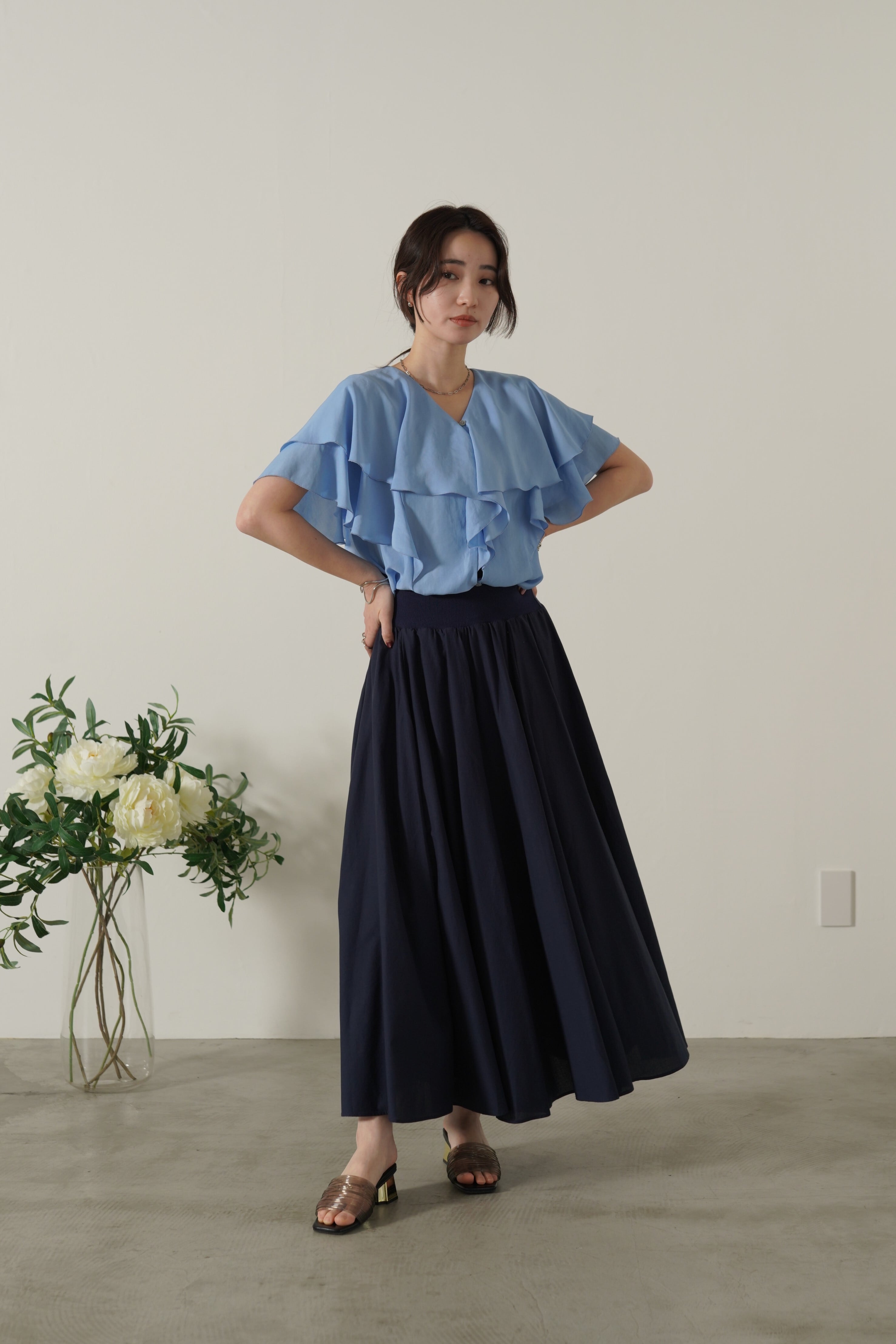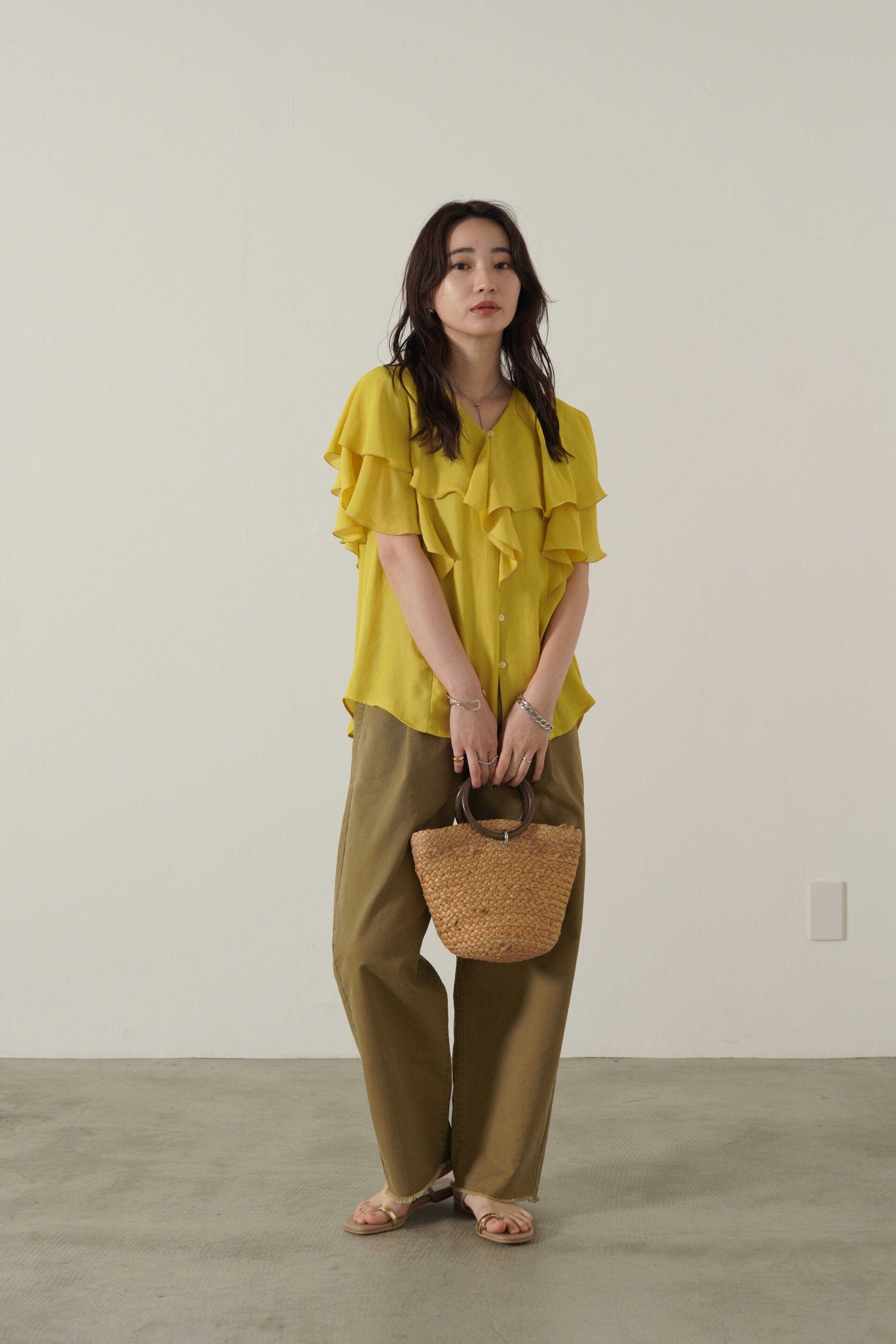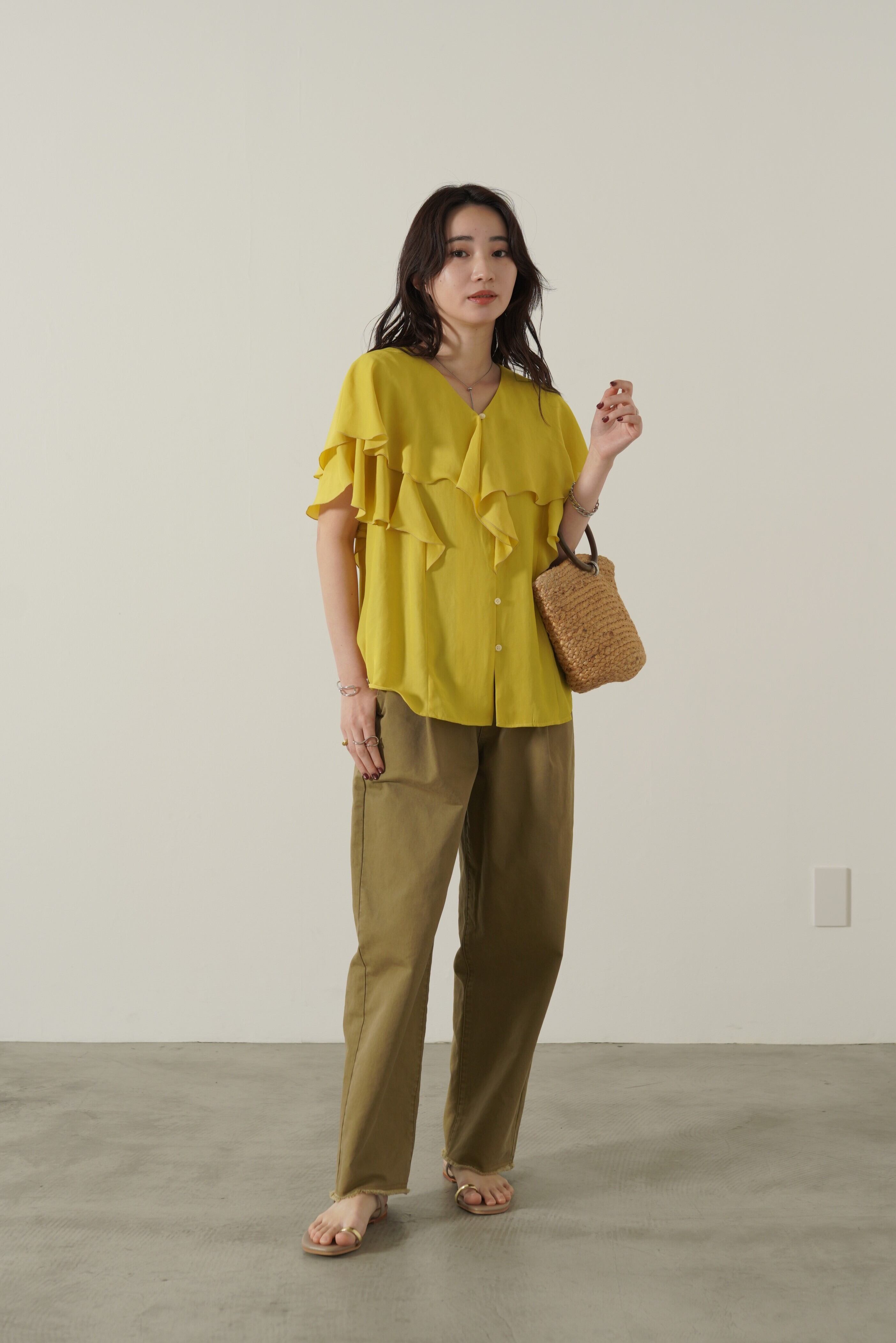 顔まわりを華やかにしてくれるフェミニンブラウス。ボリュームのあるラッフルですが、軽やかでドレープのある生地感で甘くなりすぎず、上品な印象に。ヒップと二の腕を自然にカバーしてくれるシルエットでシワが目立ちにくいイージーケア性も優秀なポイント。