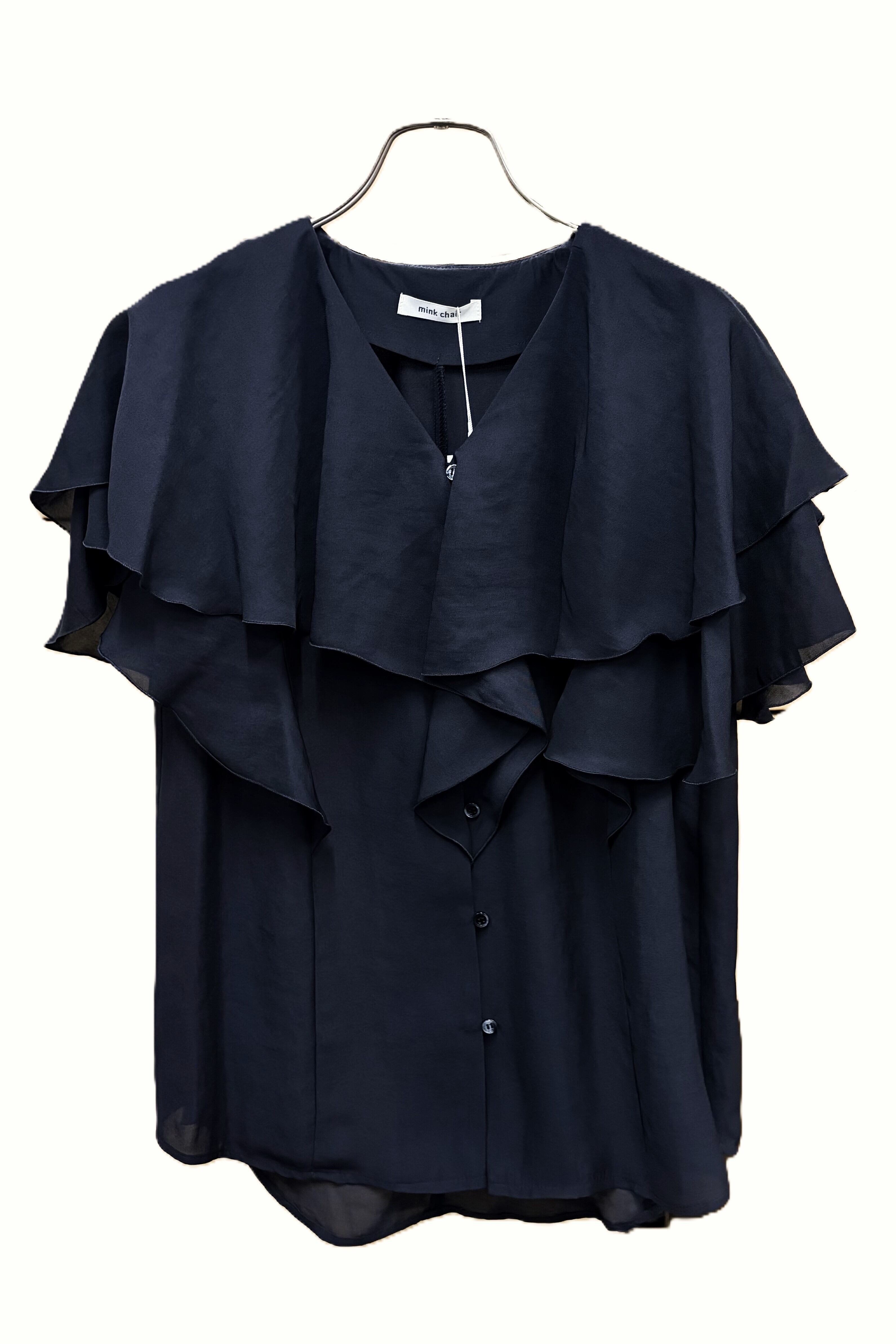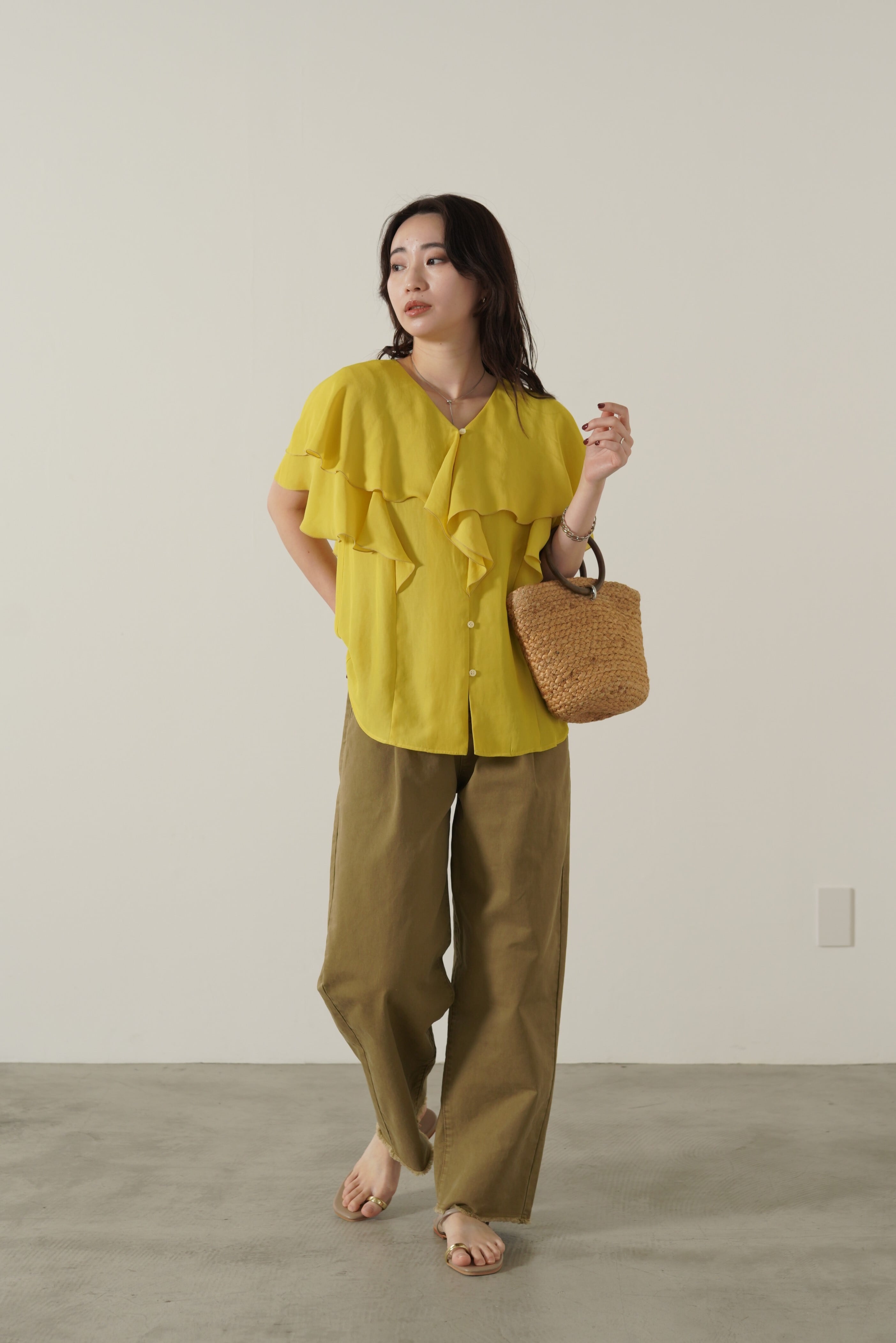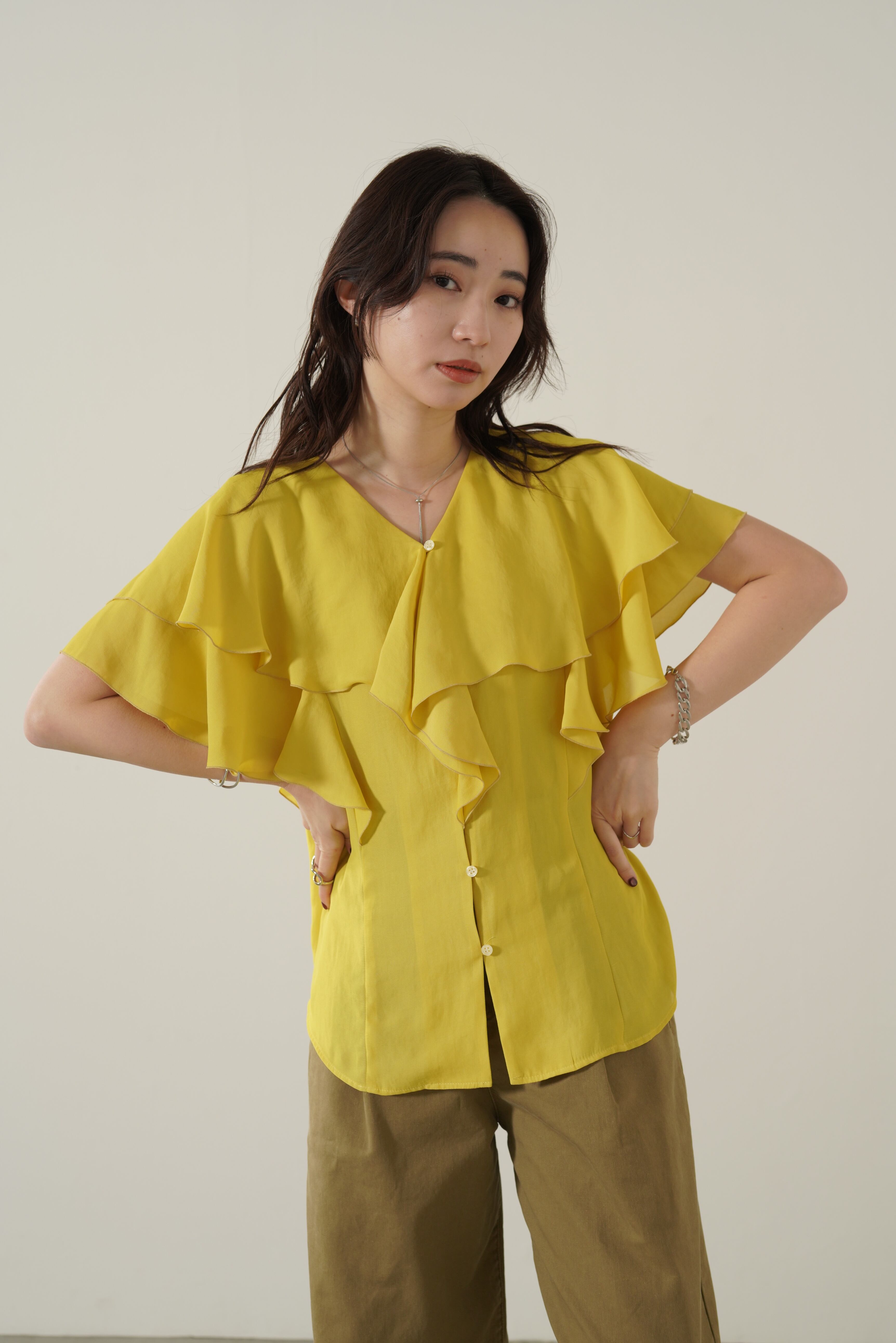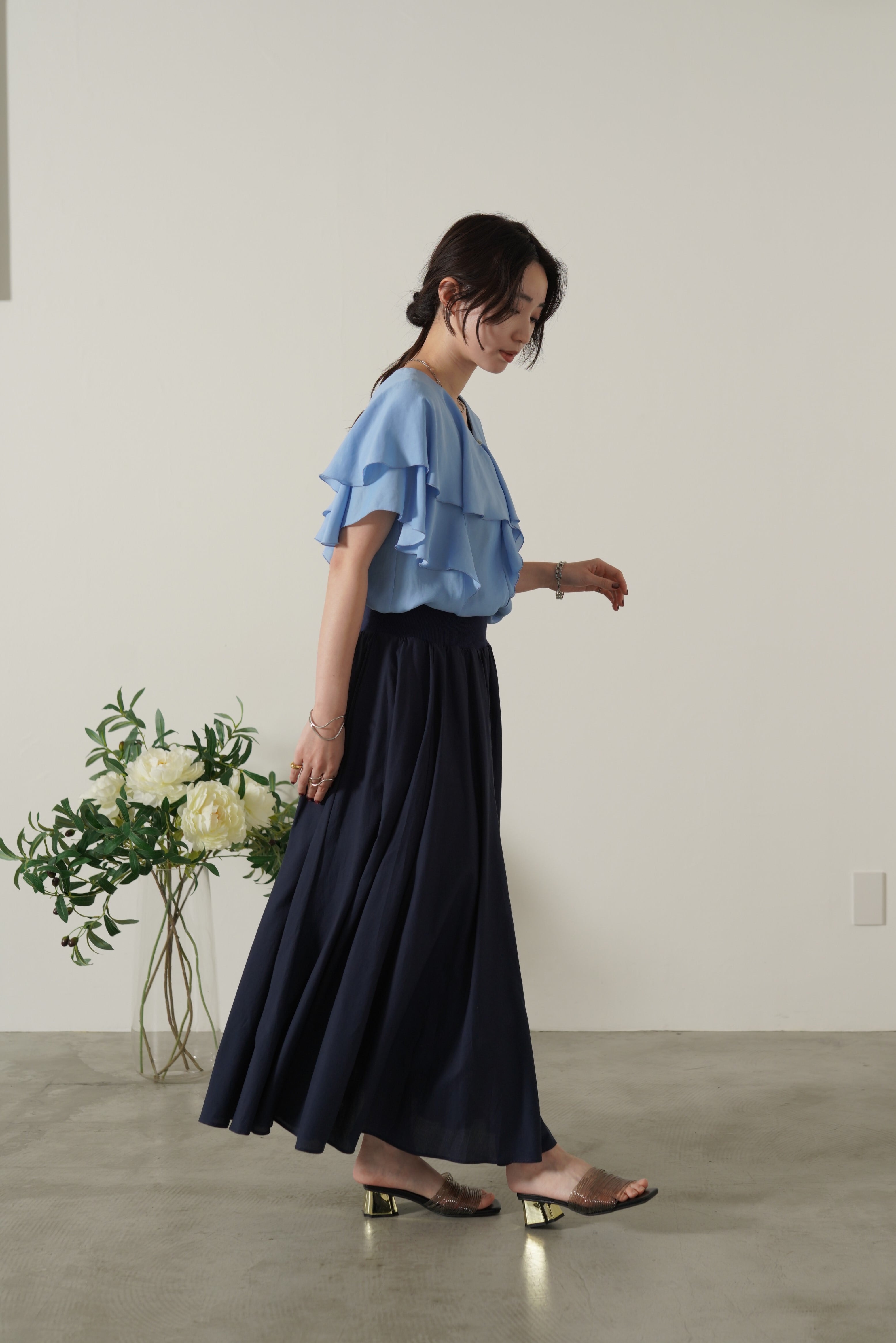 顔まわりを華やかにしてくれるフェミニンブラウス。ボリュームのあるラッフルですが、軽やかでドレープのある生地感で甘くなりすぎず、上品な印象に。ヒップと二の腕を自然にカバーしてくれるシルエットでシワが目立ちにくいイージーケア性も優秀なポイント。