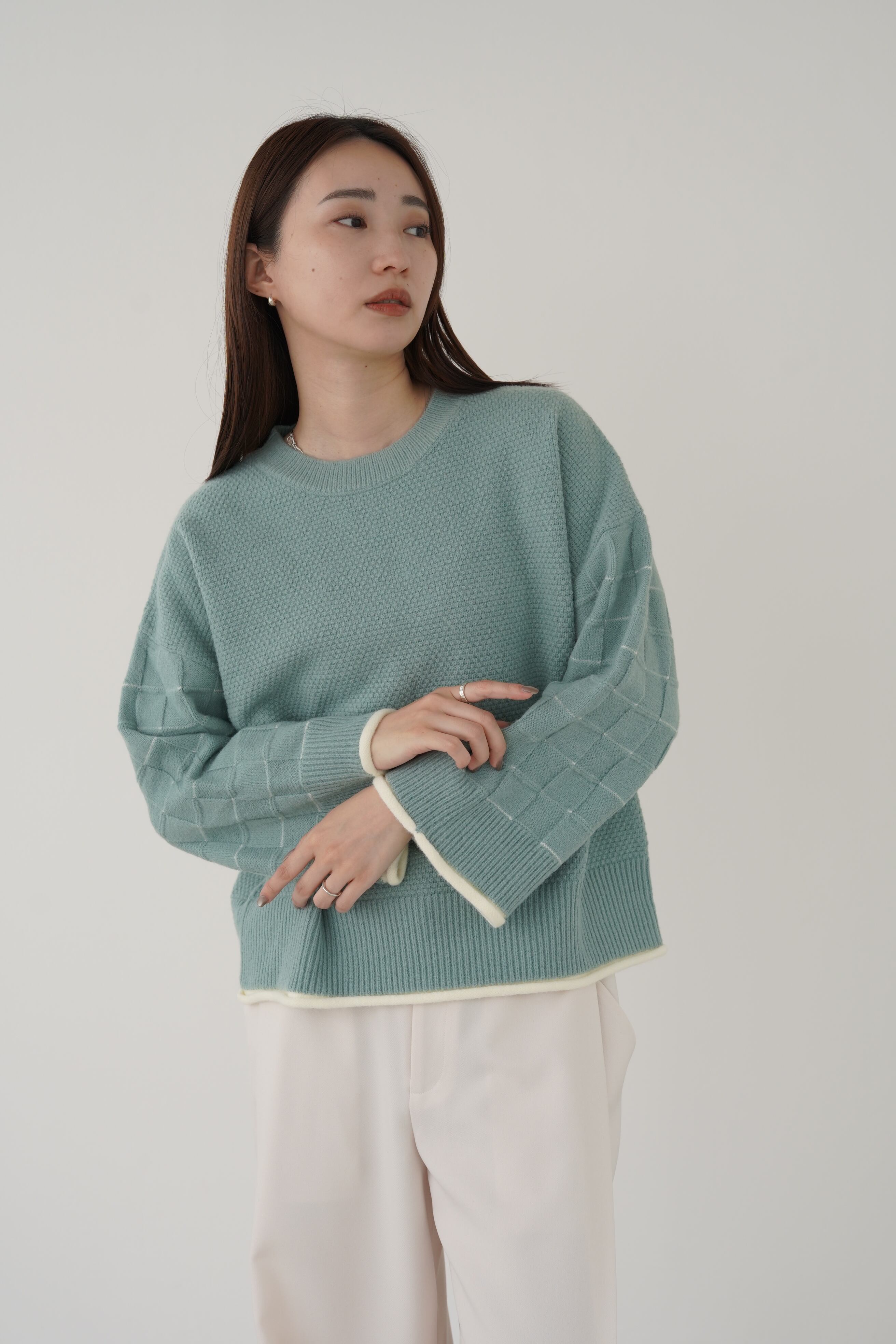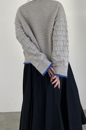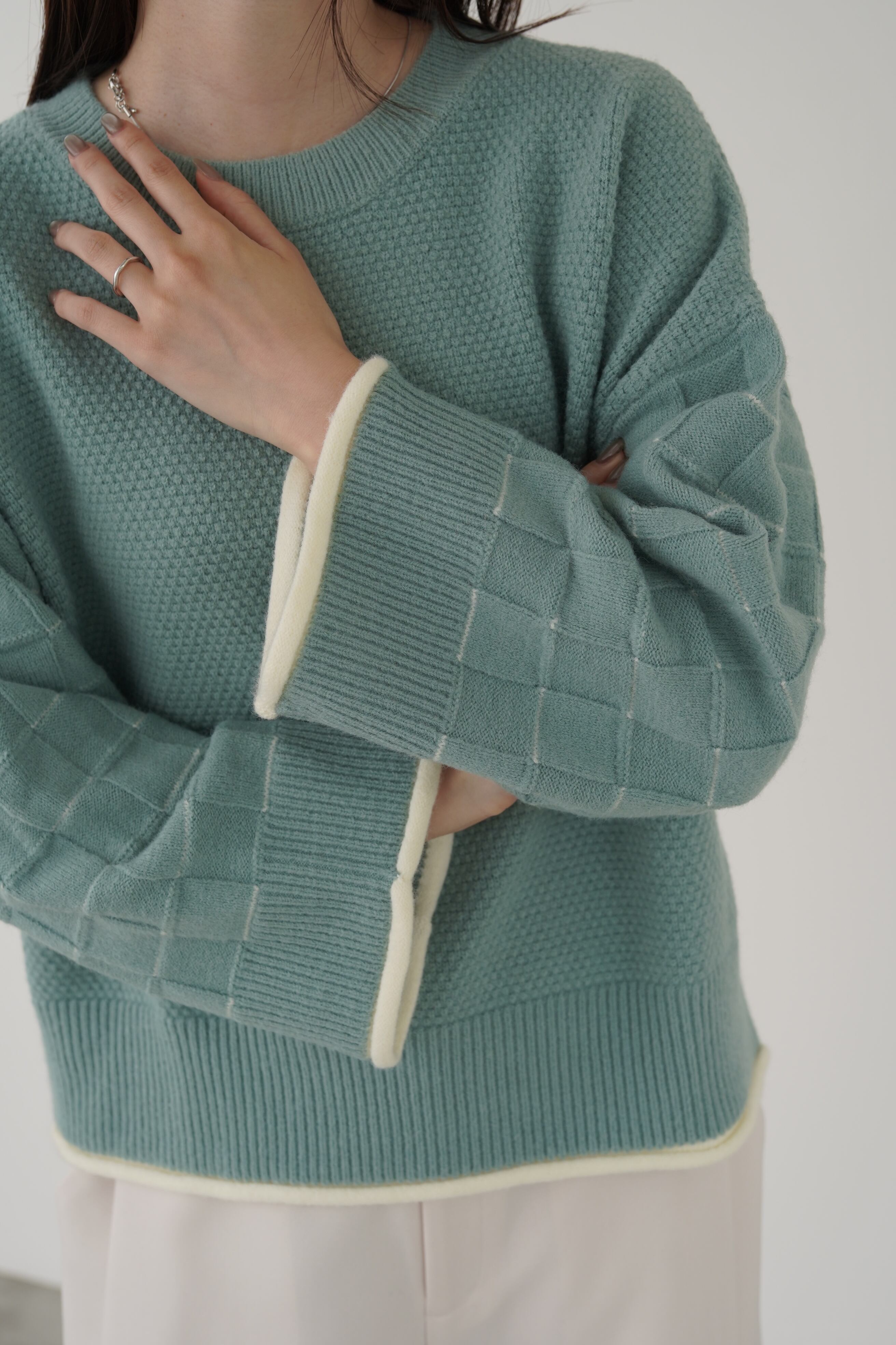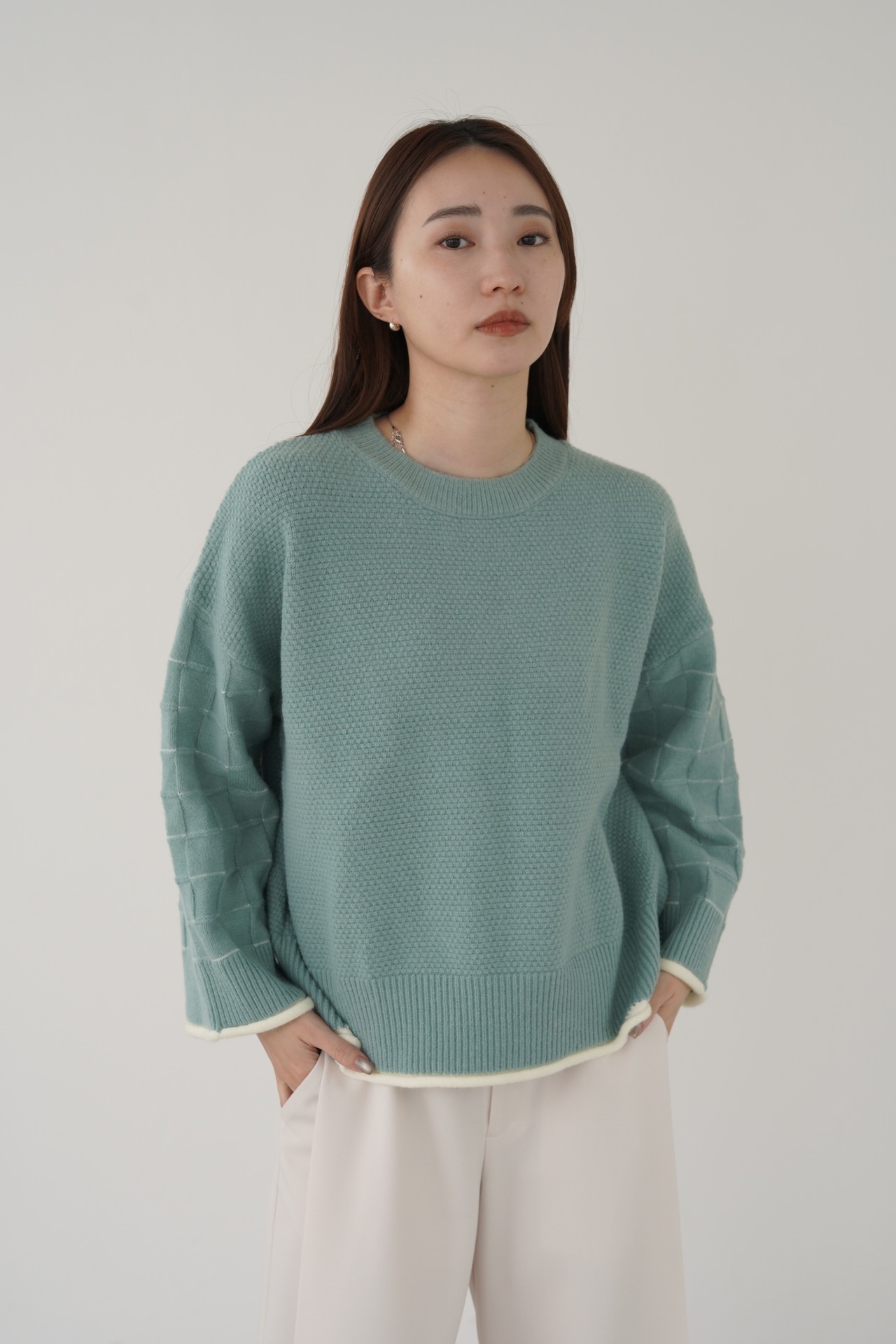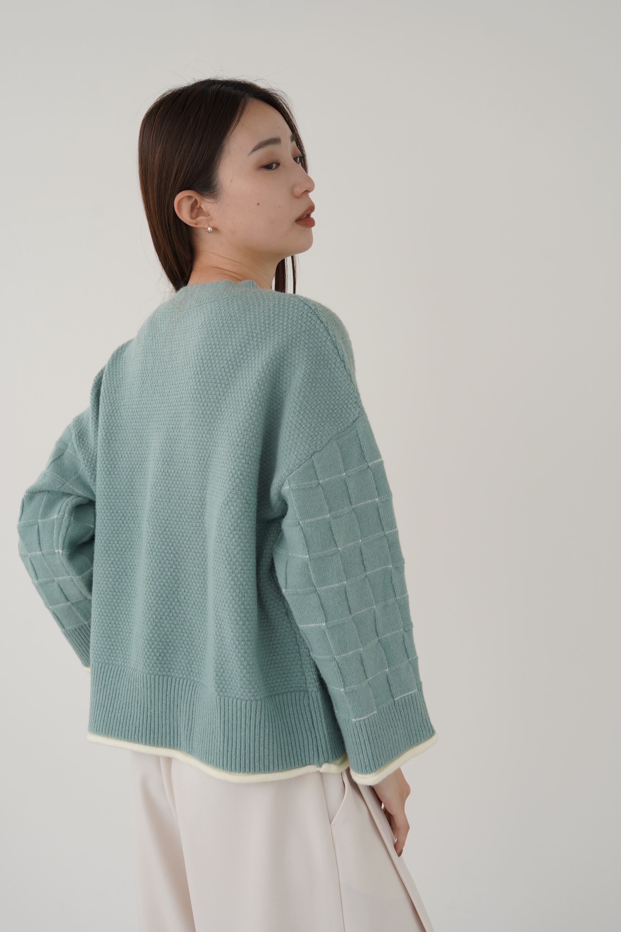 身頃はつぶつぶ柄、袖はブロックチェック柄で編み立てたクルーネックのニットプルオーバー。トレンド感のあるショート丈で、どんなボトムともバランスよく着用して頂けます。こなれ感のあるワイドスリーブ、リブ端のロール始末がアクセントになっています。