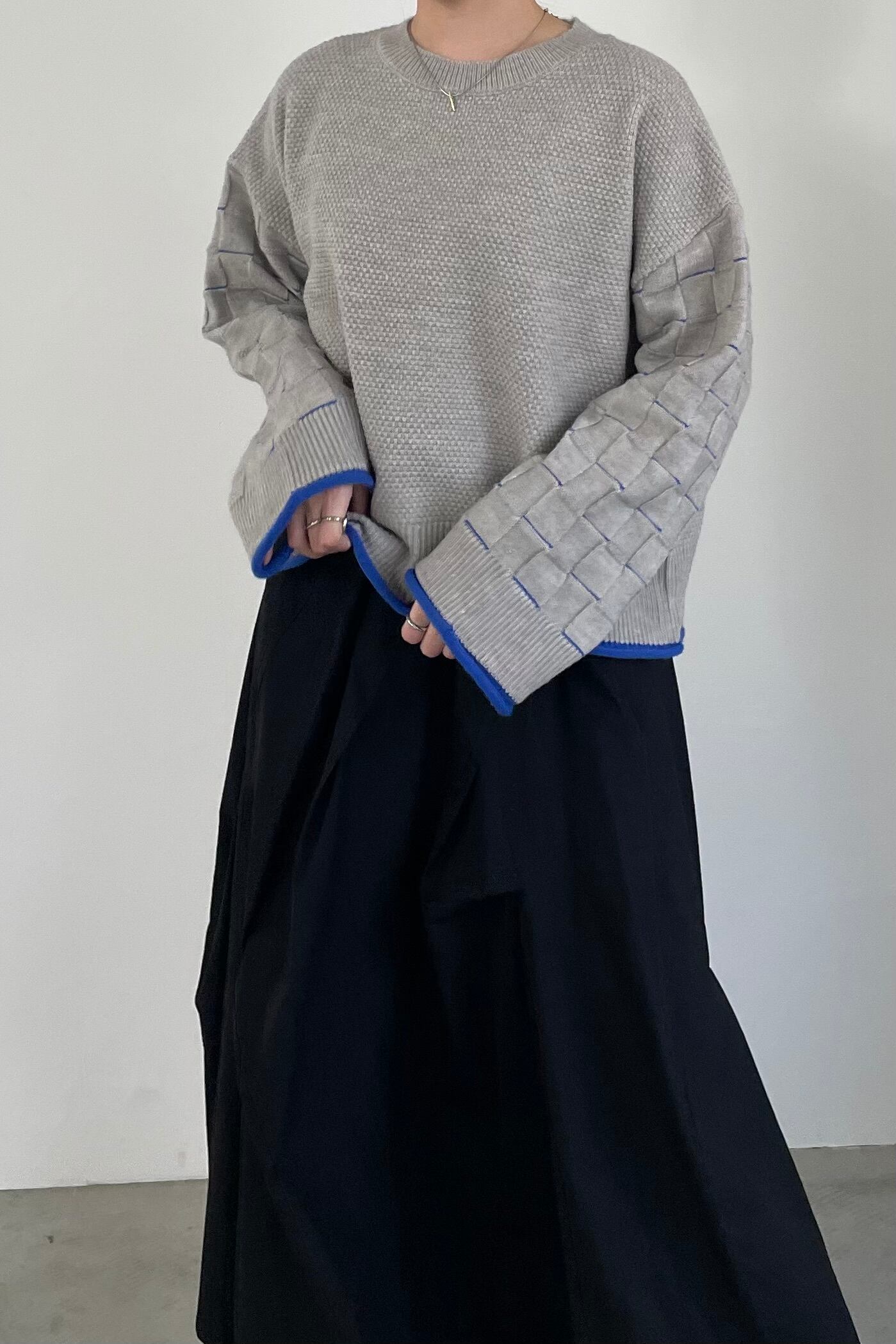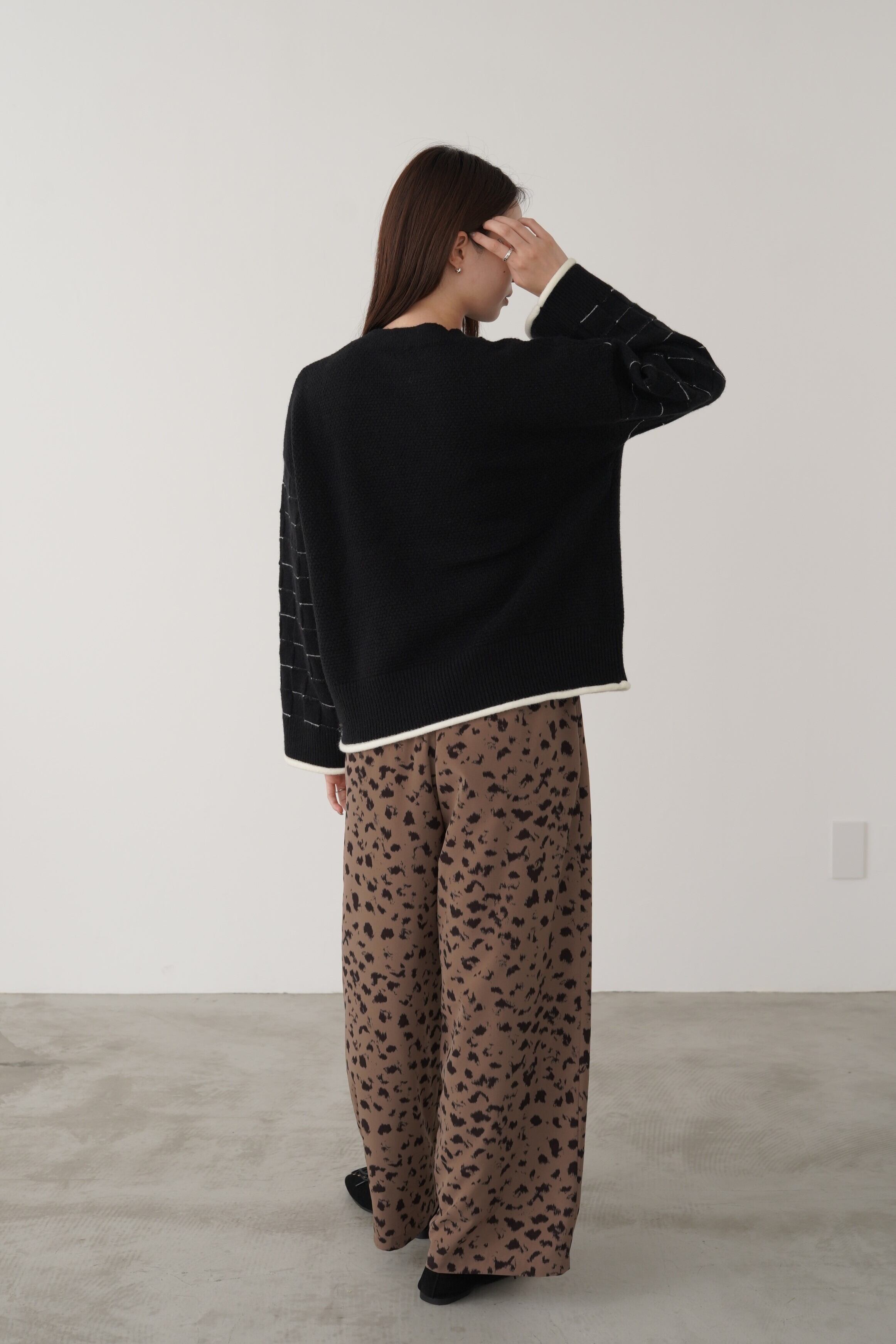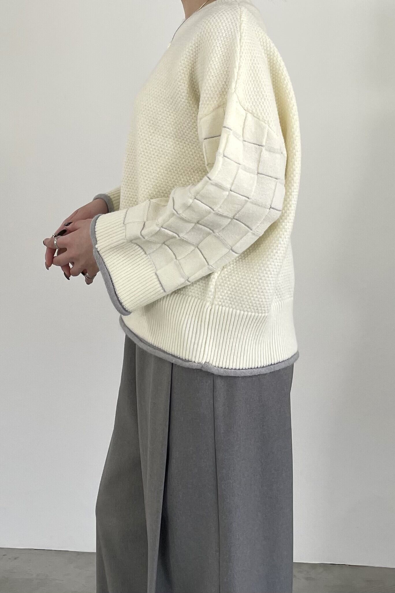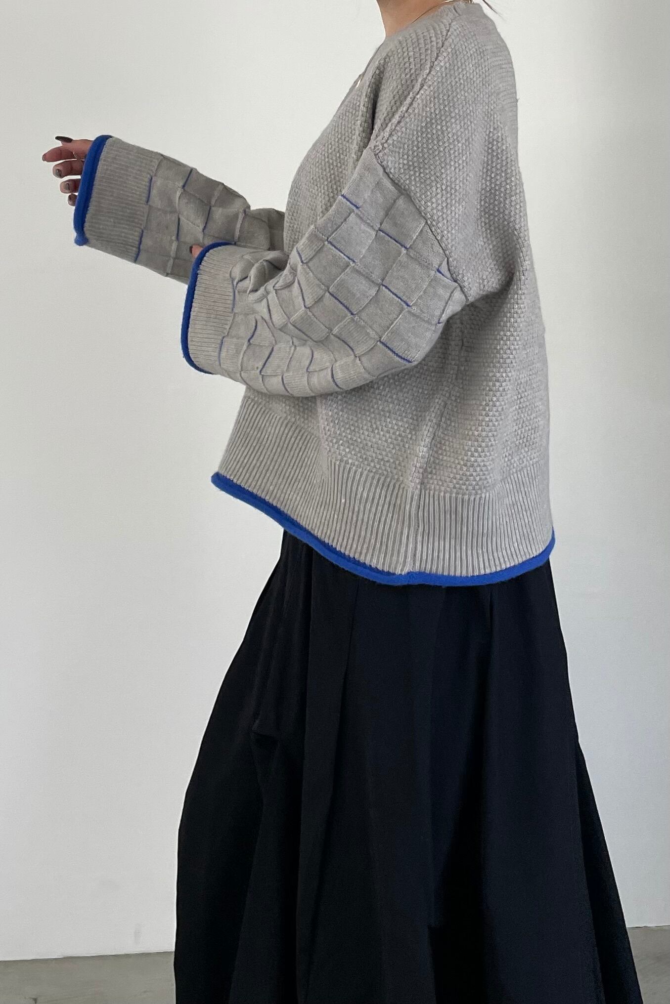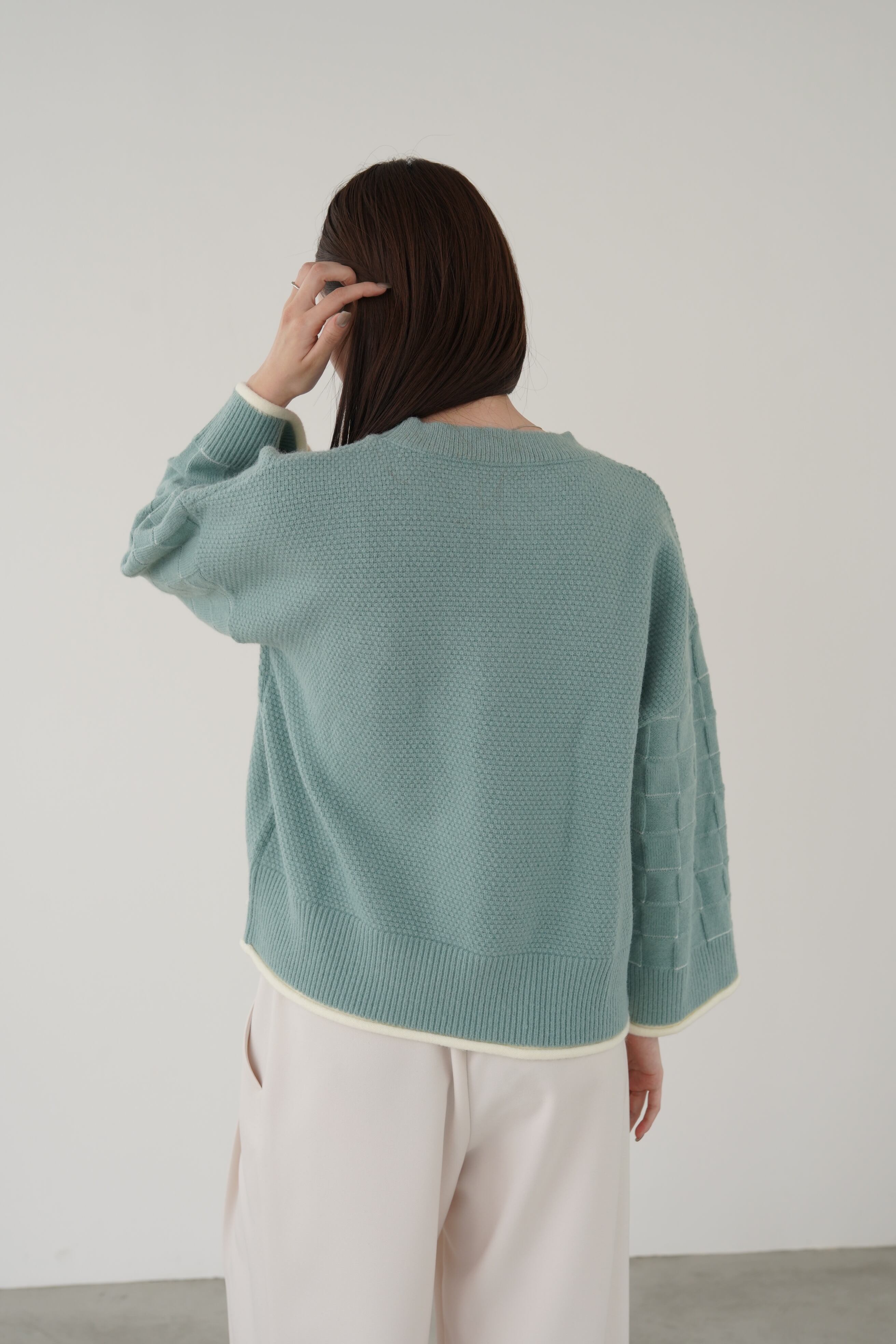 身頃はつぶつぶ柄、袖はブロックチェック柄で編み立てたクルーネックのニットプルオーバー。トレンド感のあるショート丈で、どんなボトムともバランスよく着用して頂けます。こなれ感のあるワイドスリーブ、リブ端のロール始末がアクセントになっています。