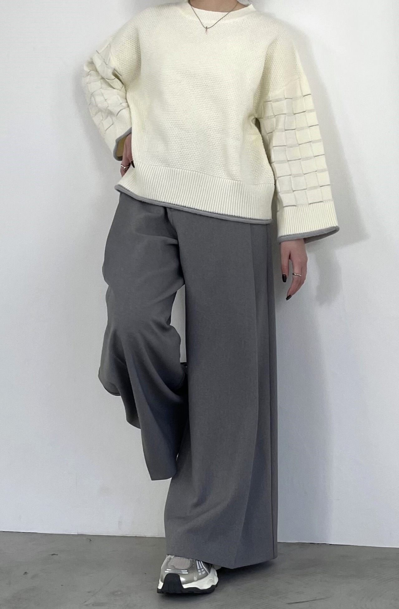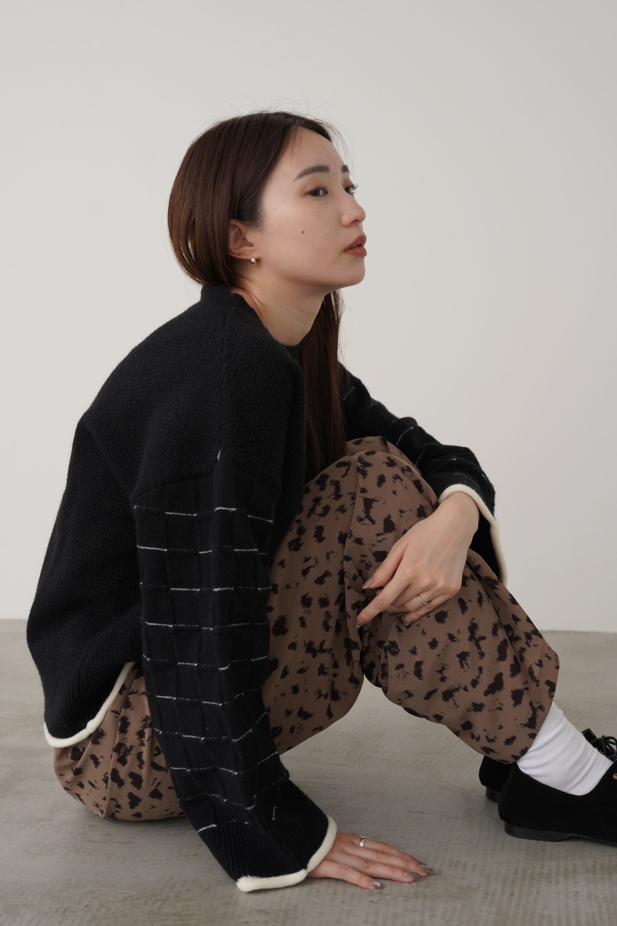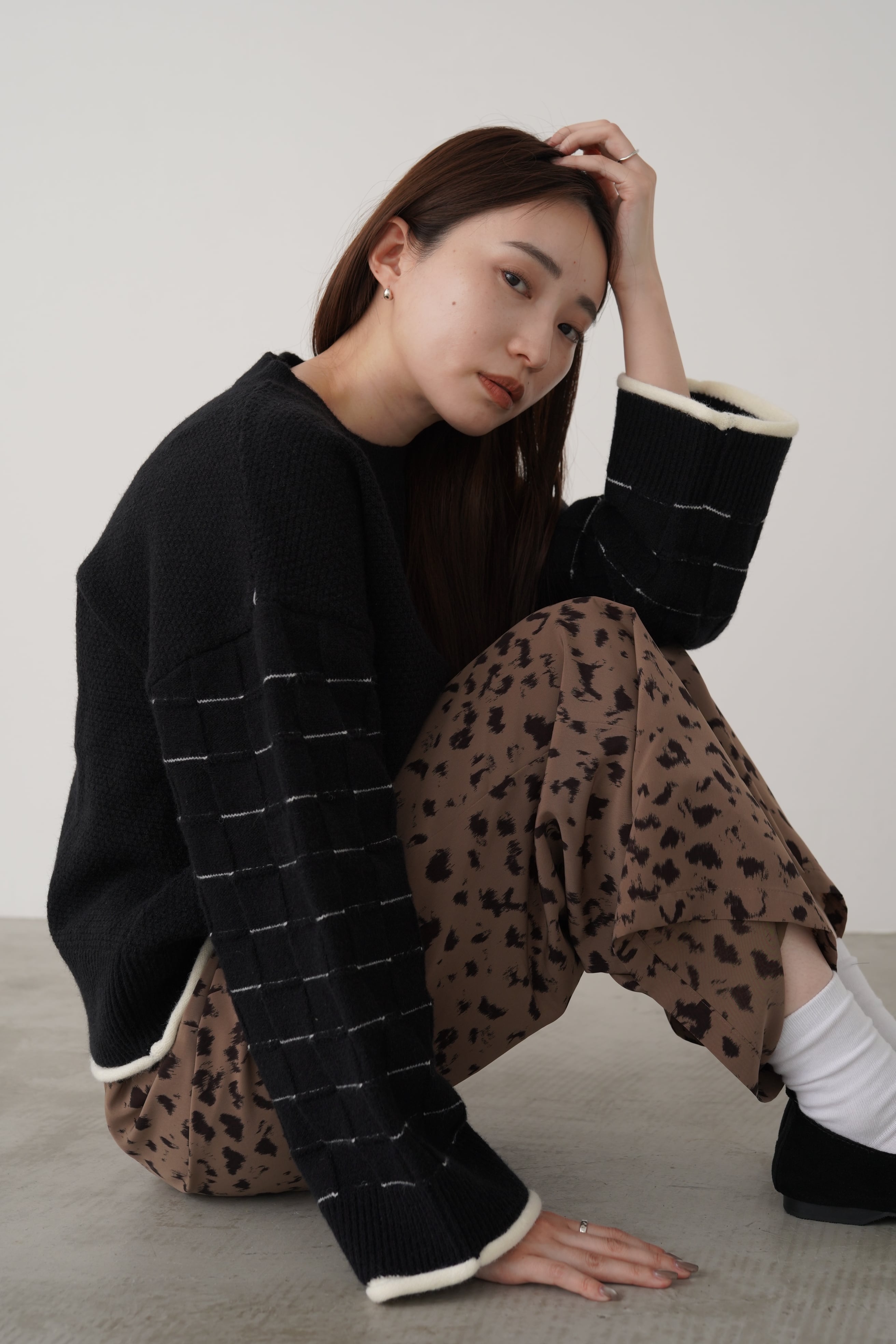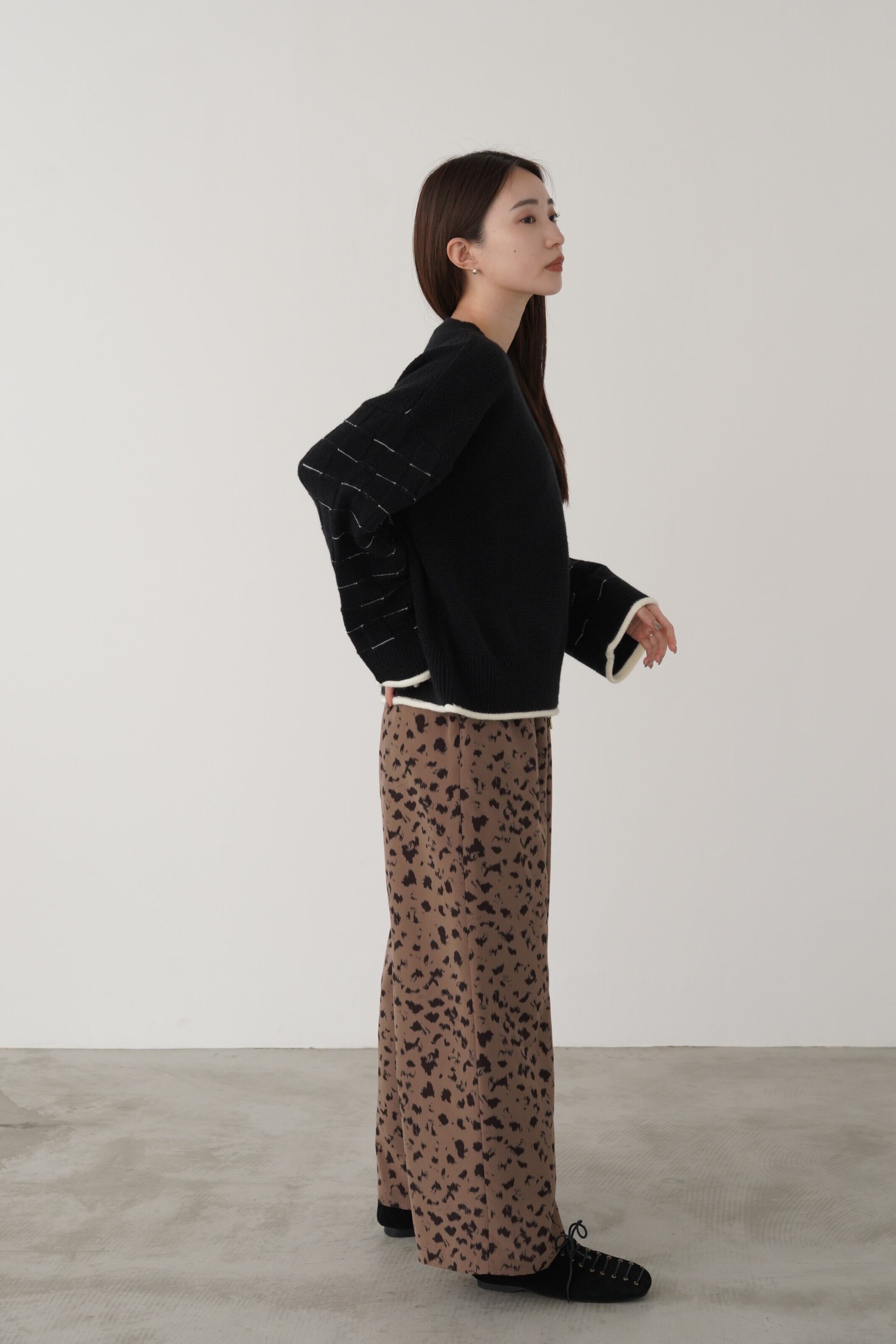 身頃はつぶつぶ柄、袖はブロックチェック柄で編み立てたクルーネックのニットプルオーバー。トレンド感のあるショート丈で、どんなボトムともバランスよく着用して頂けます。こなれ感のあるワイドスリーブ、リブ端のロール始末がアクセントになっています。